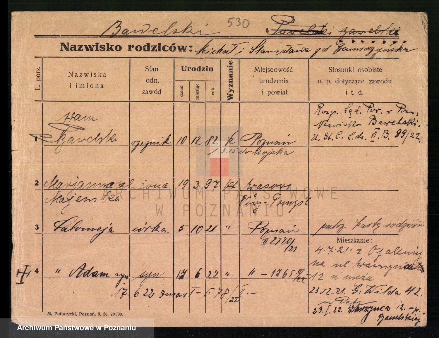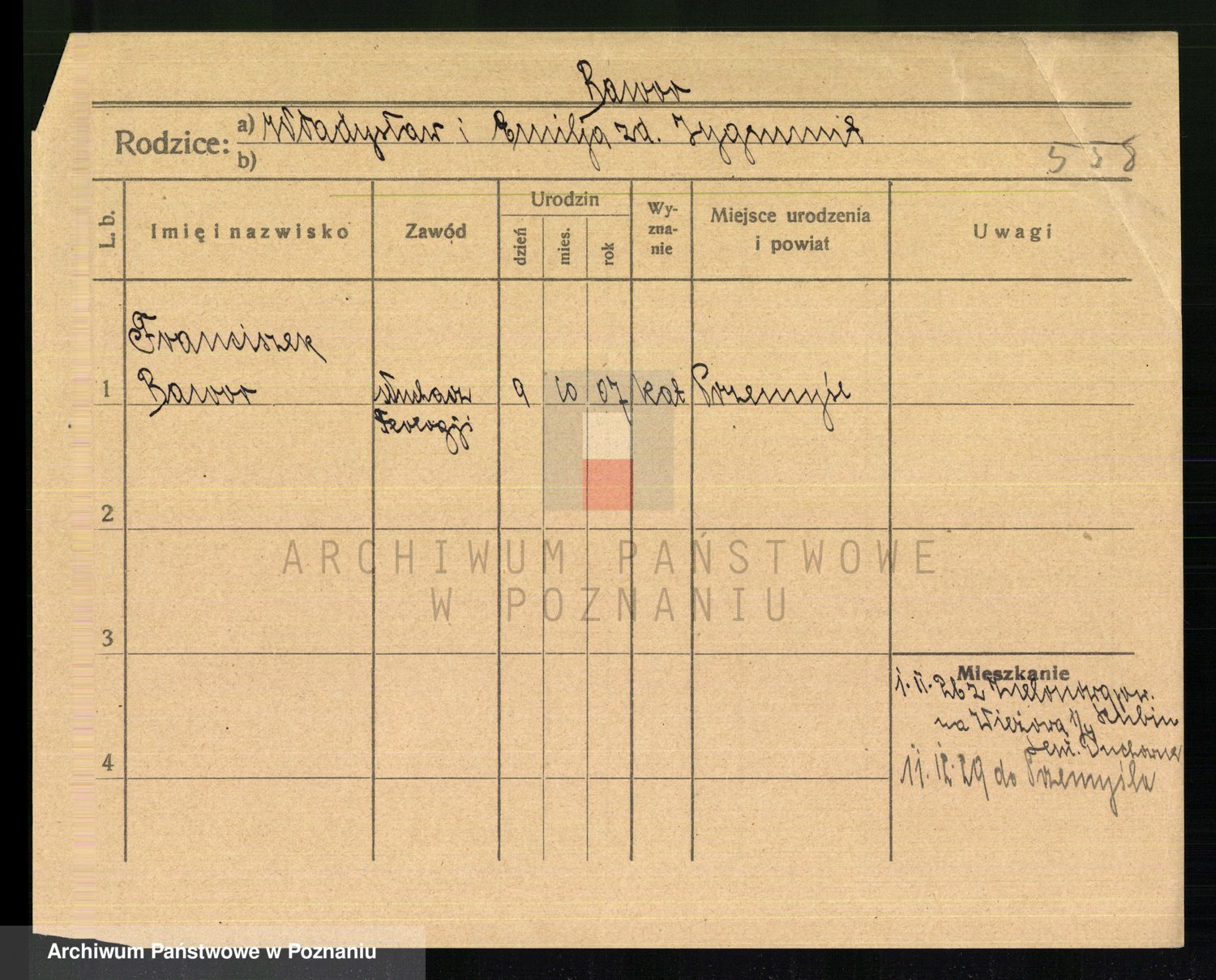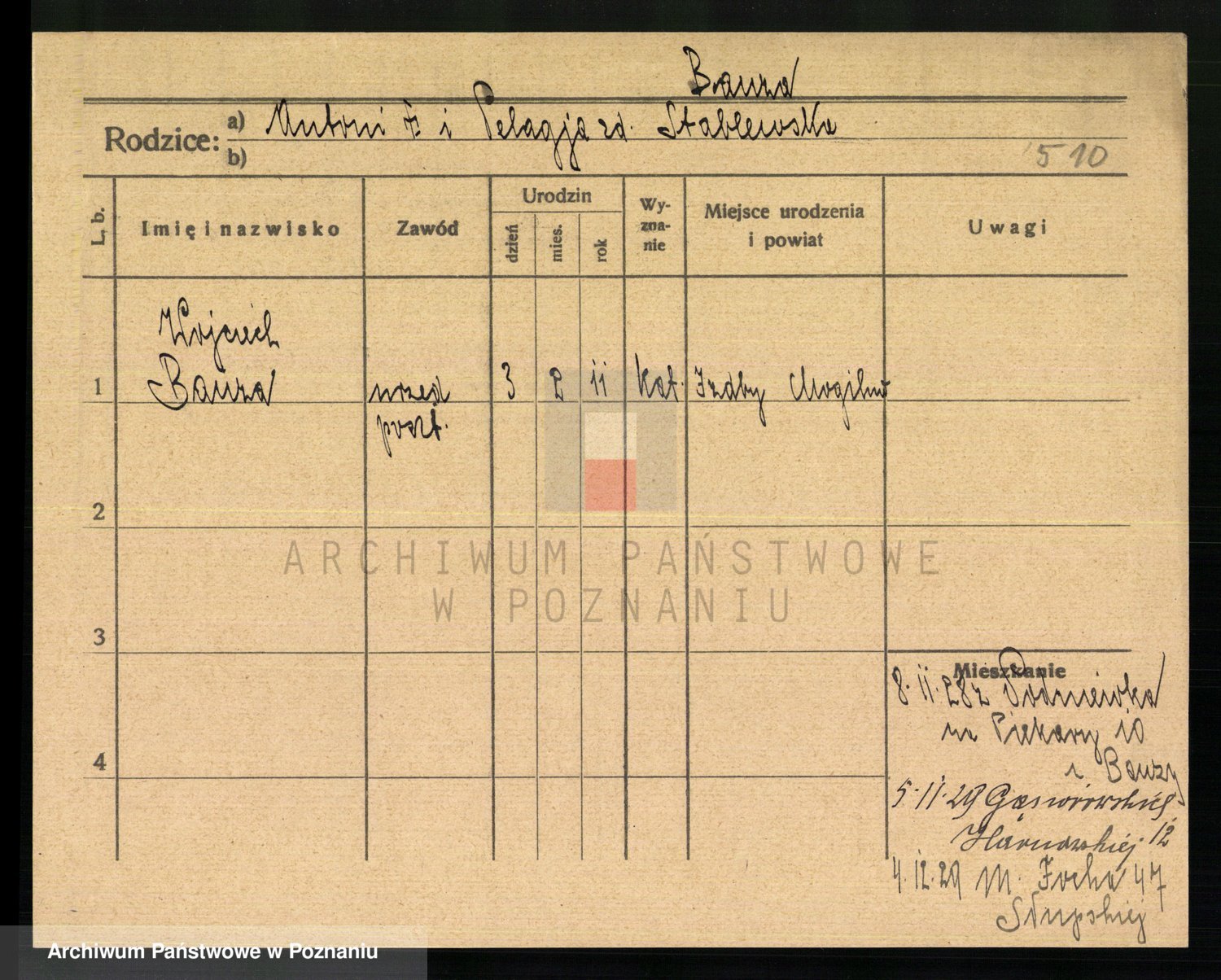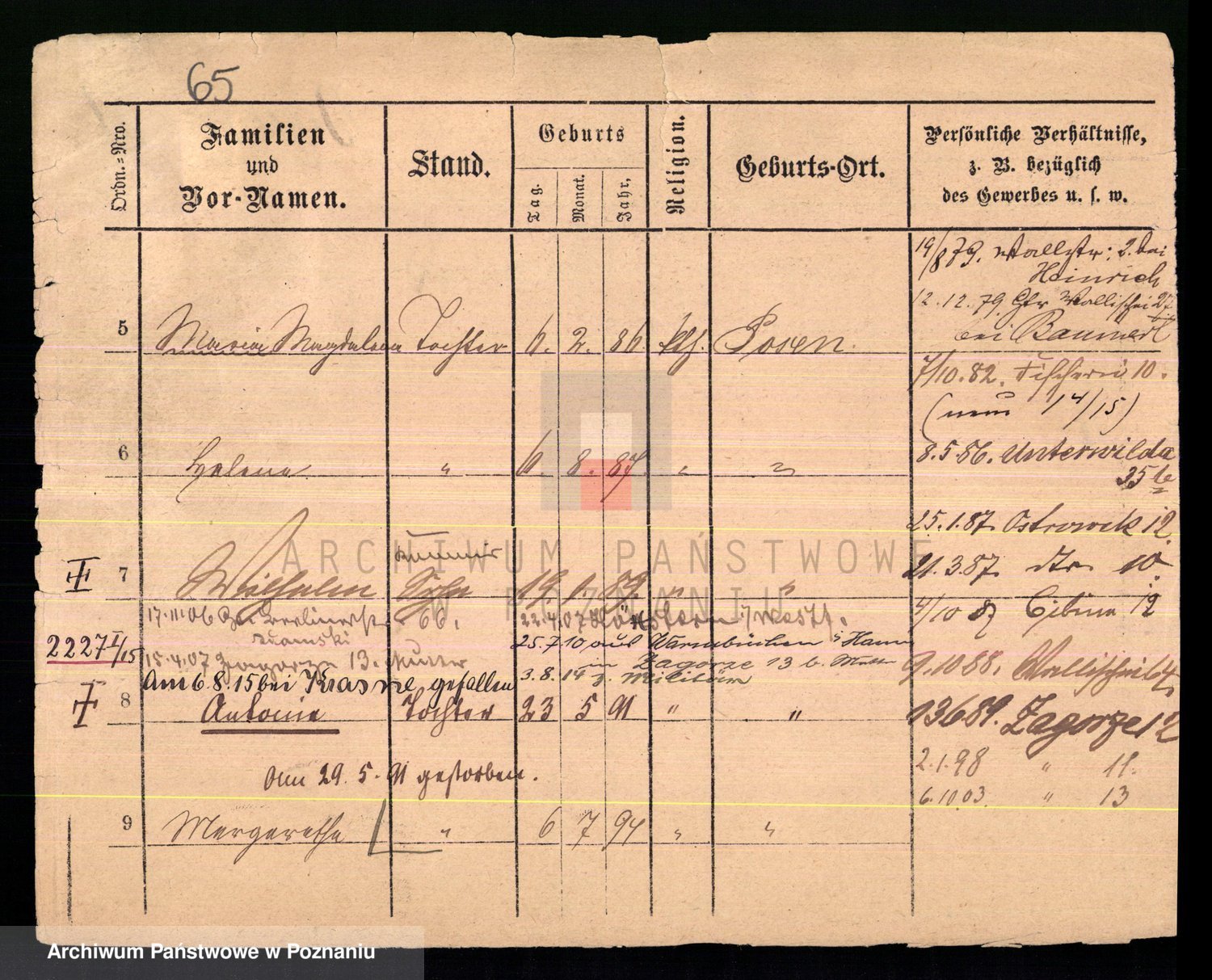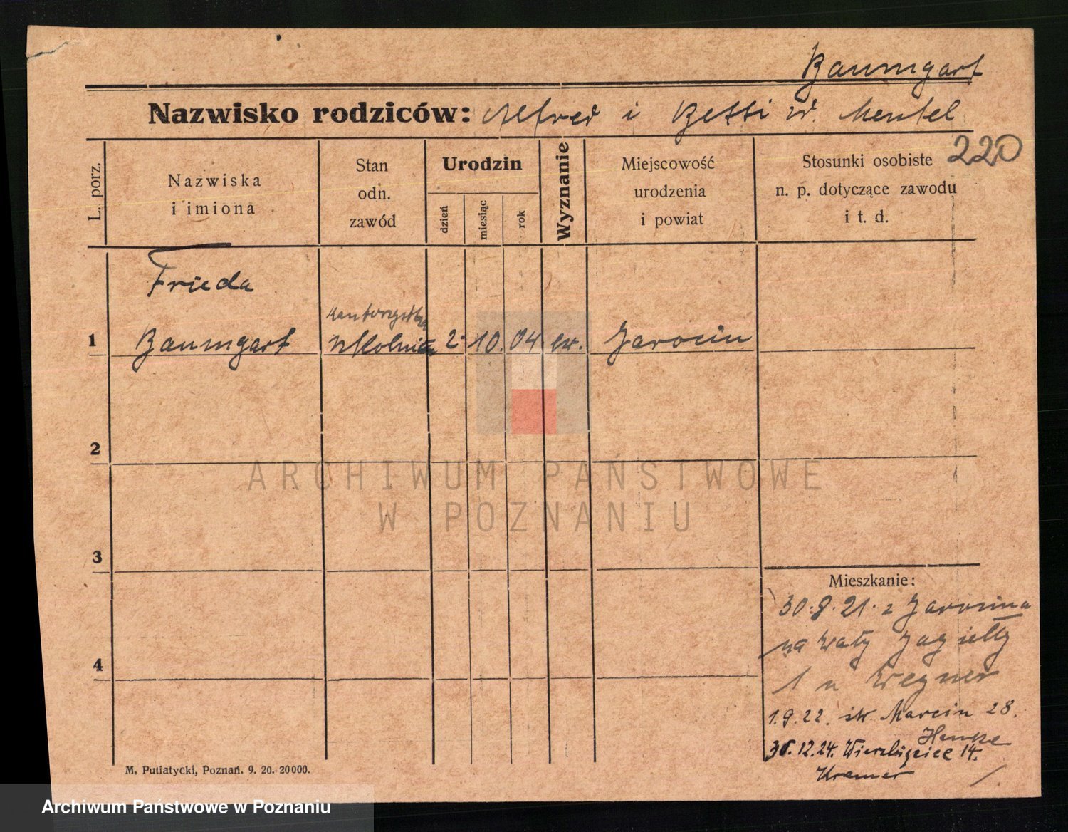 Podgląd karty osobowej dostępny jest po kliknięciu na nazwisko lub ikonkę karty. Można dokonywać powiększenia (ikony na górze) lub przechodzić między kolejnymi skanami (strzałki po bokach).