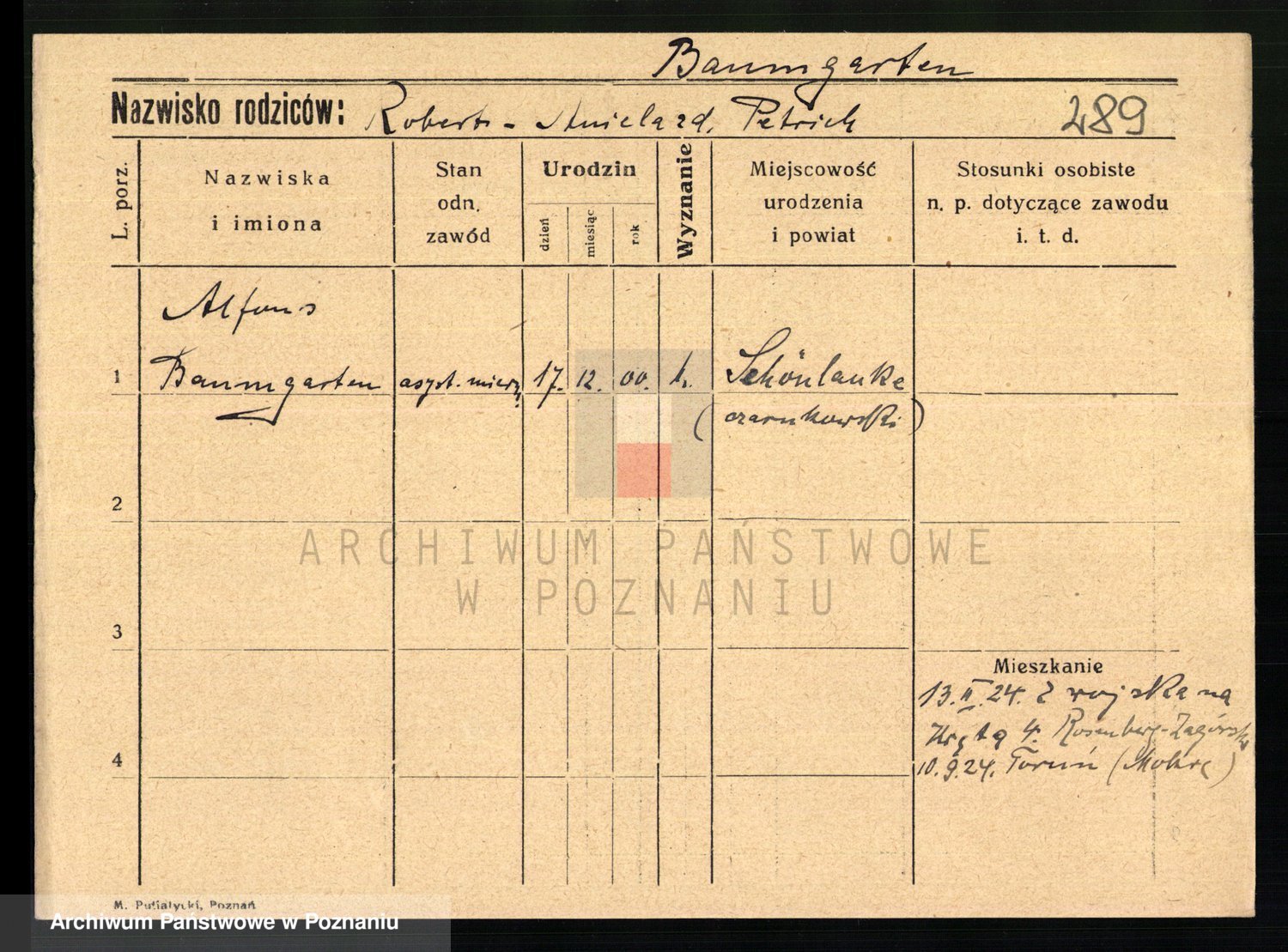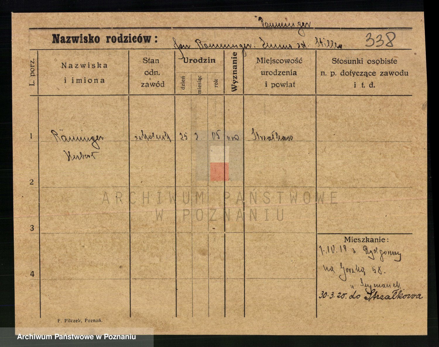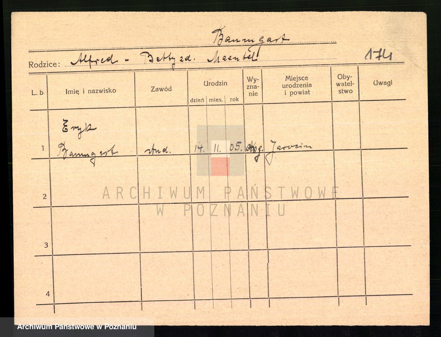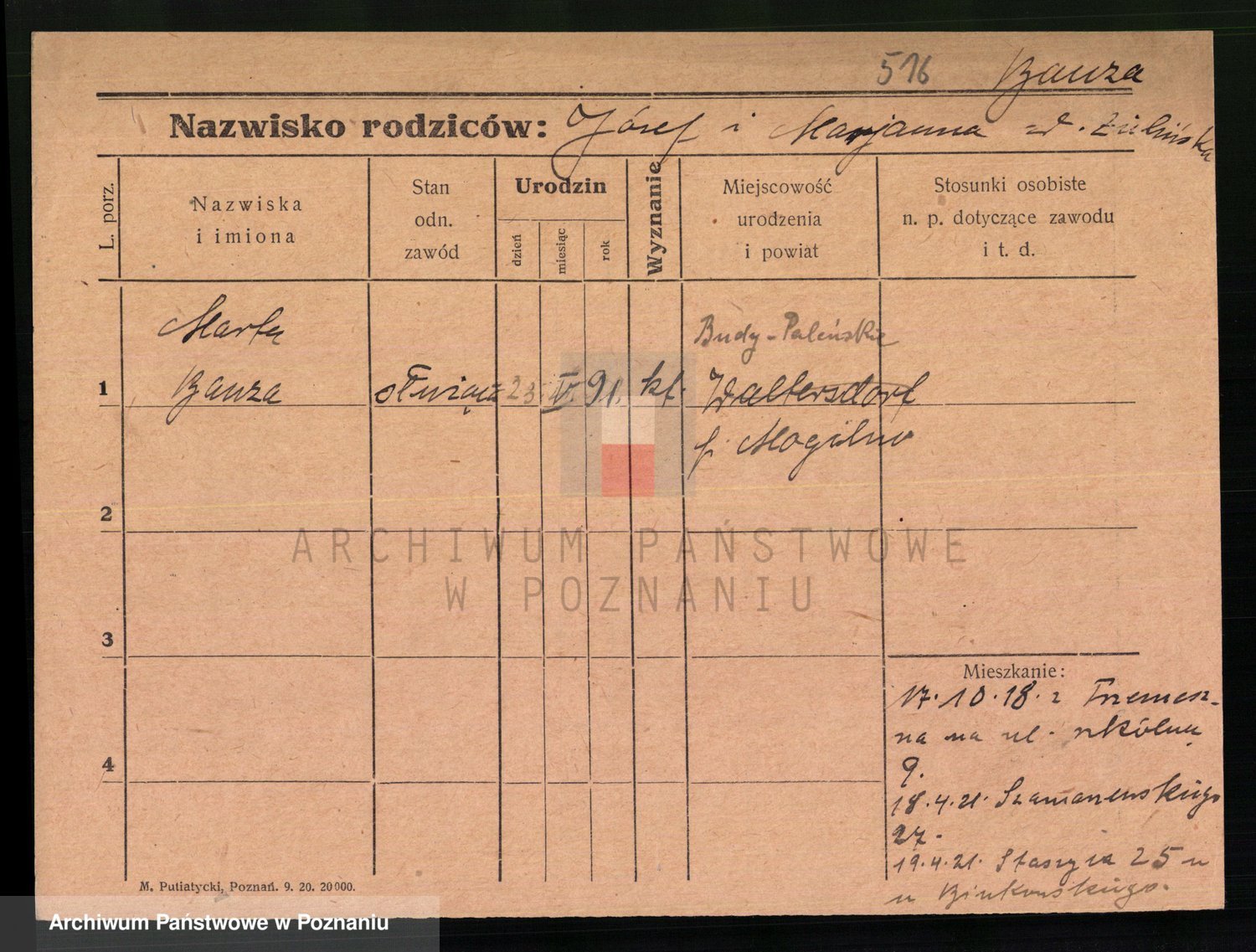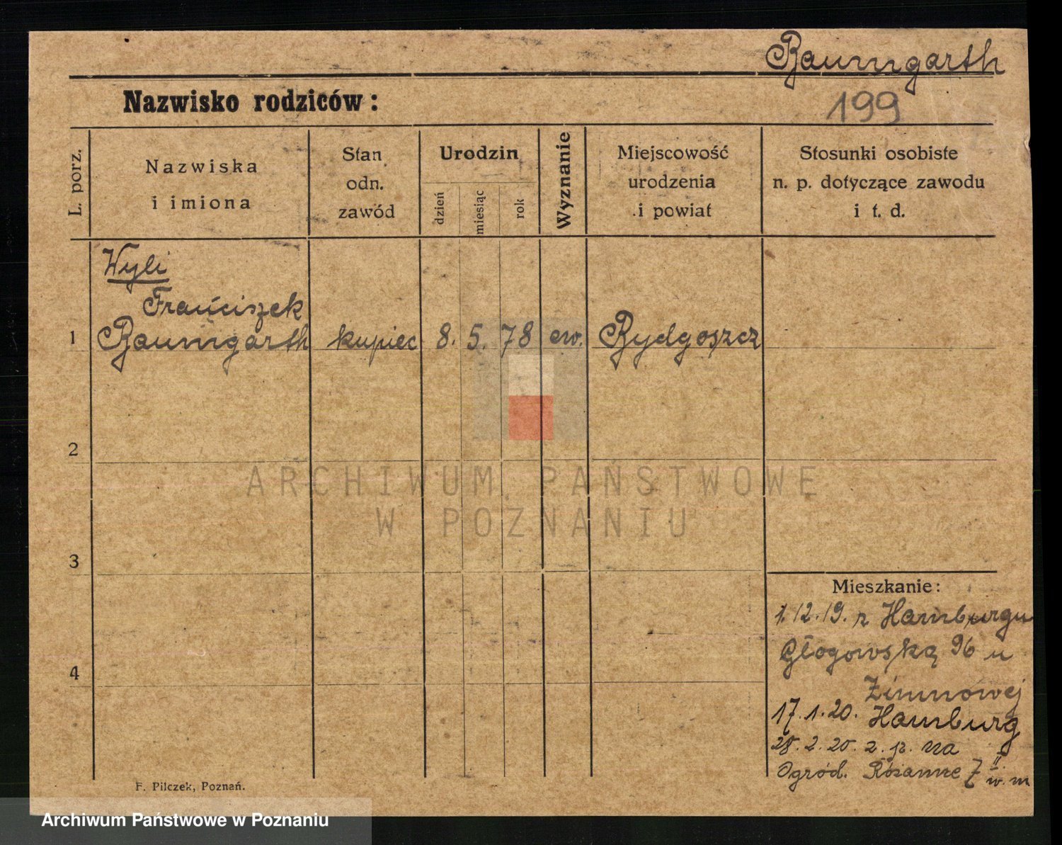 Podgląd karty osobowej dostępny jest po kliknięciu na nazwisko lub ikonkę karty. Można dokonywać powiększenia (ikony na górze) lub przechodzić między kolejnymi skanami (strzałki po bokach).