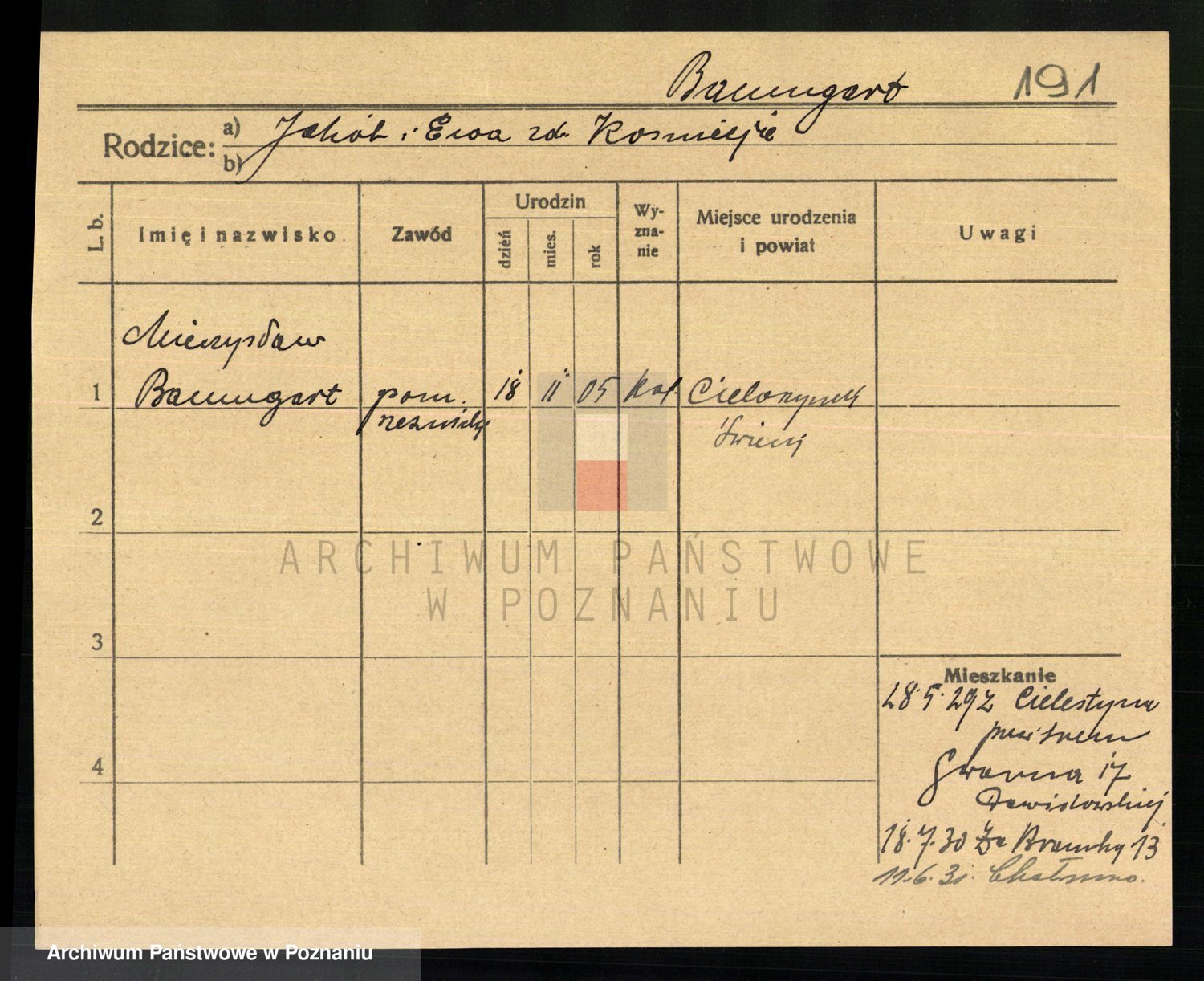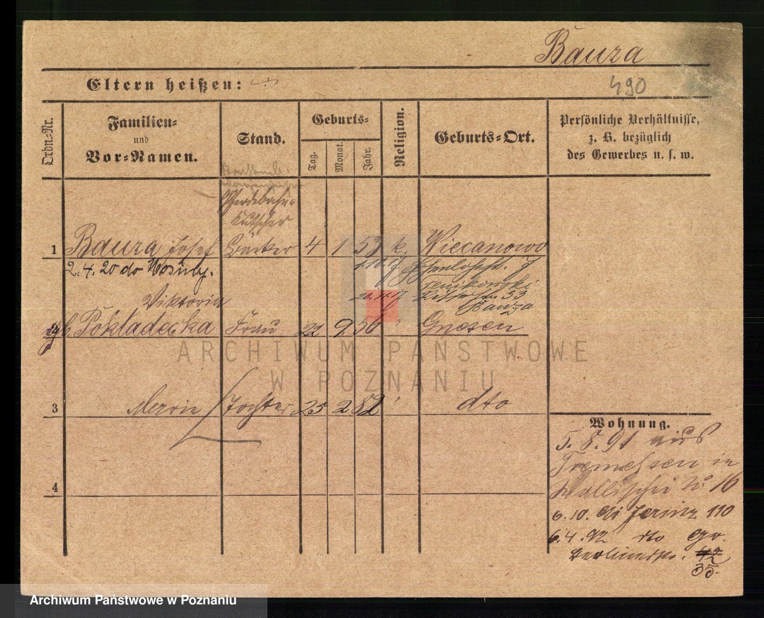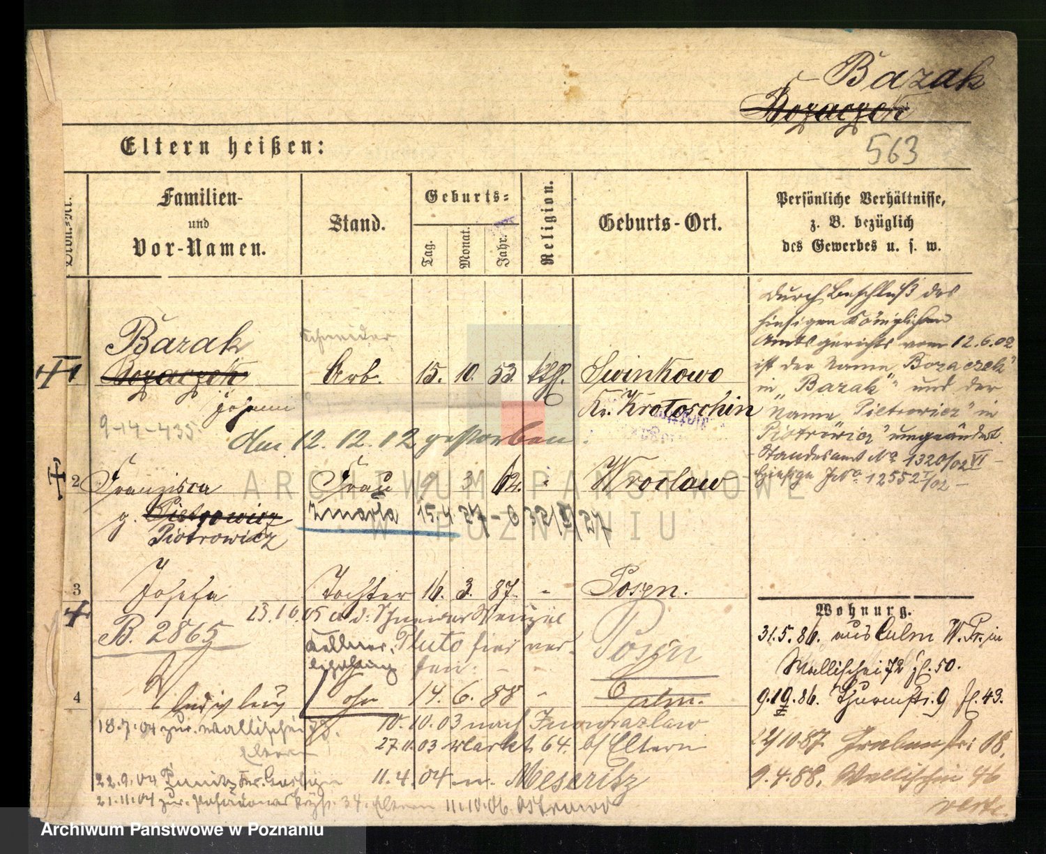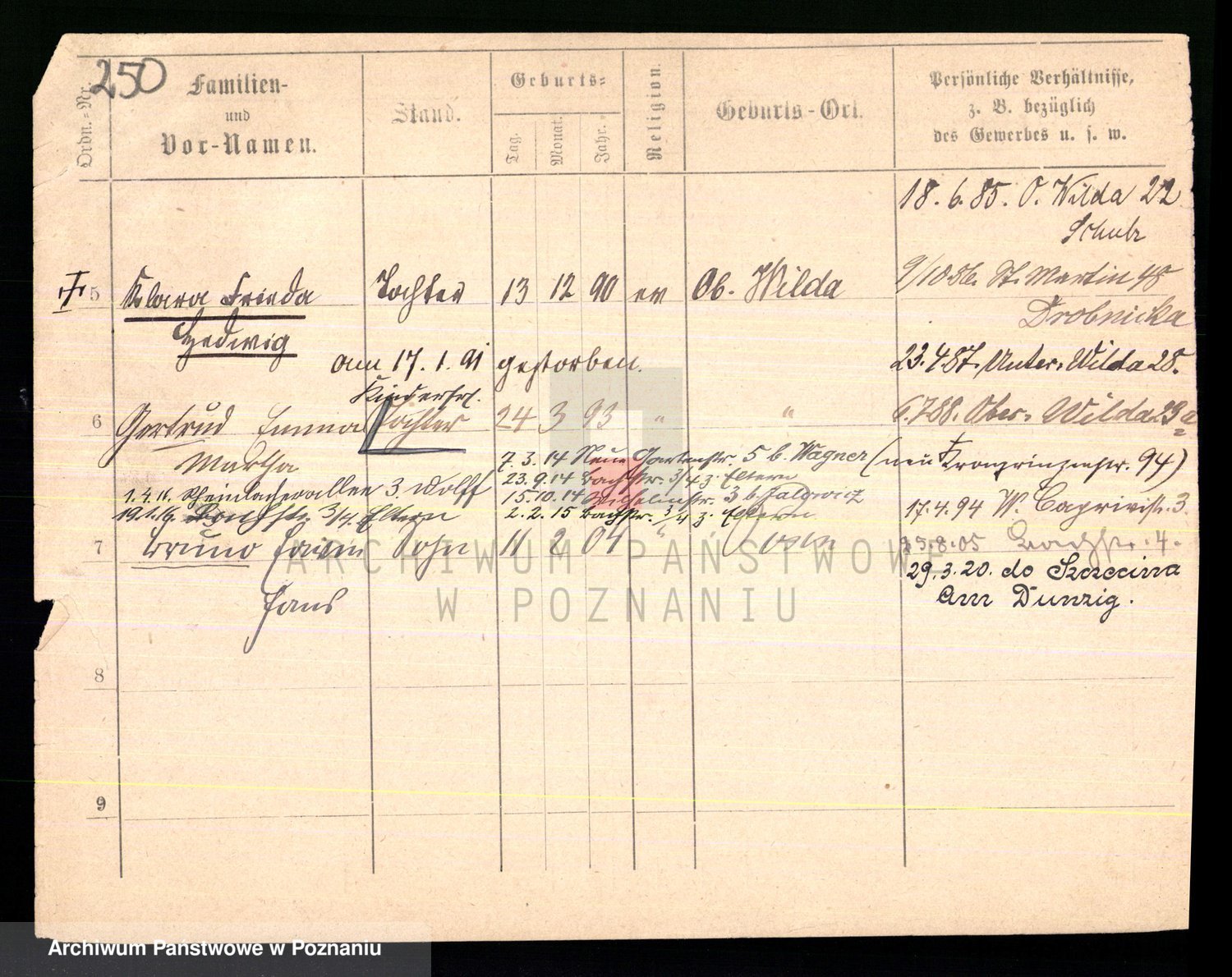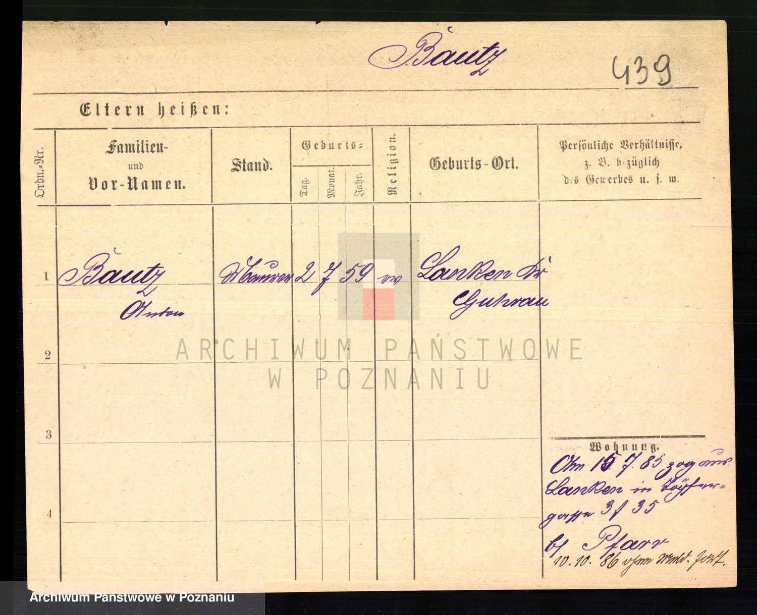 Podgląd karty osobowej dostępny jest po kliknięciu na nazwisko lub ikonkę karty. Można dokonywać powiększenia (ikony na górze) lub przechodzić między kolejnymi skanami (strzałki po bokach).