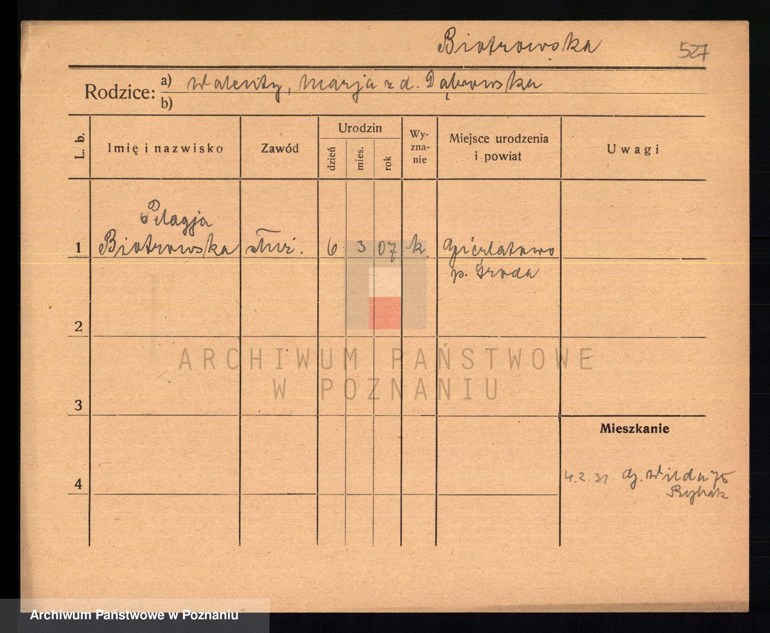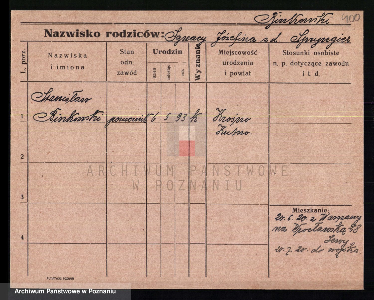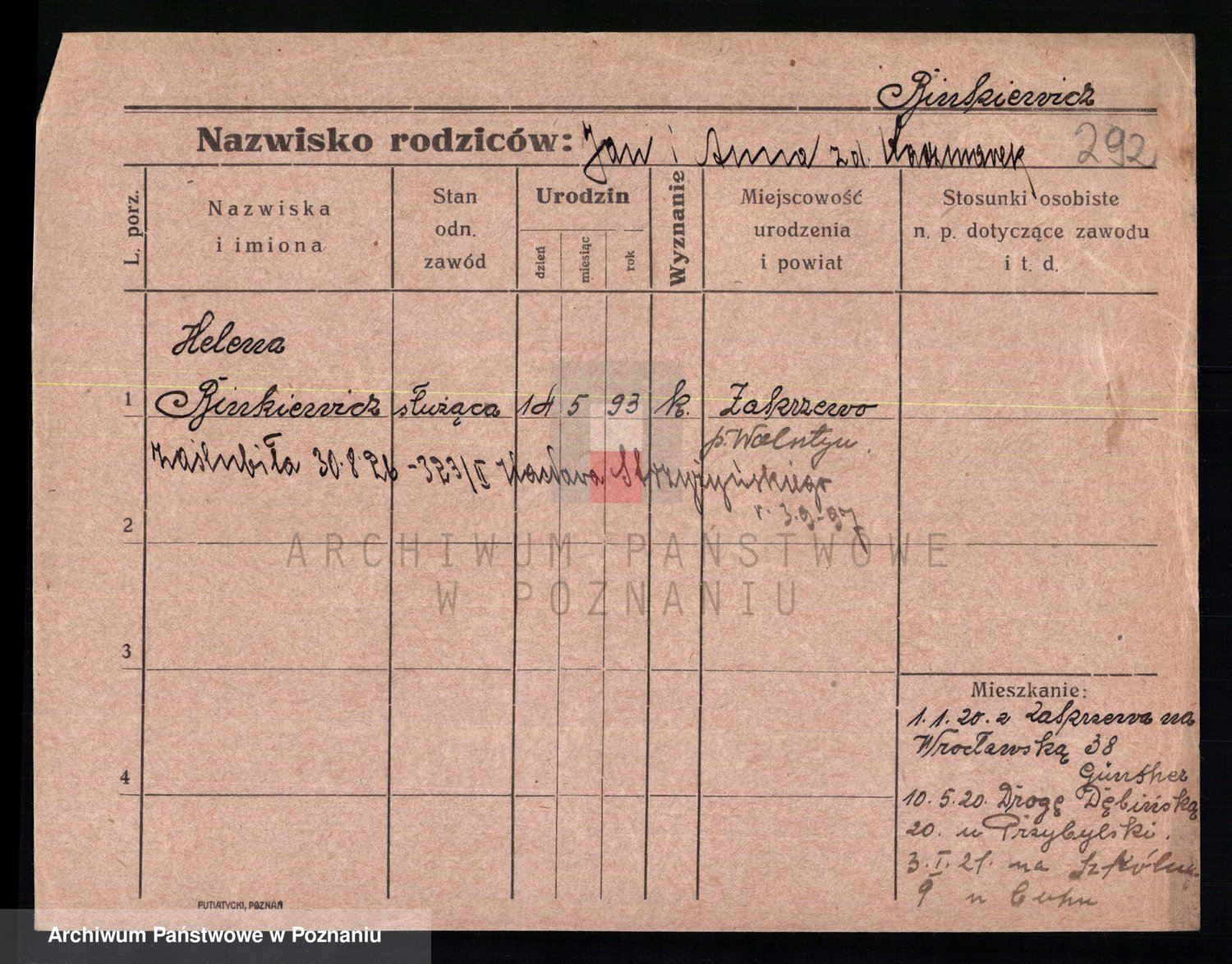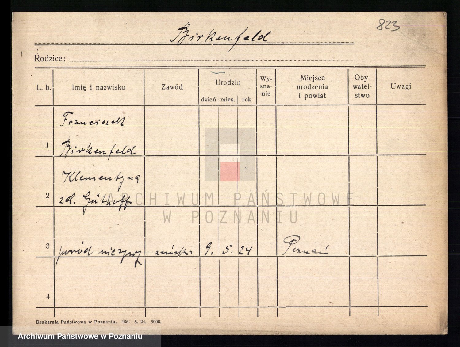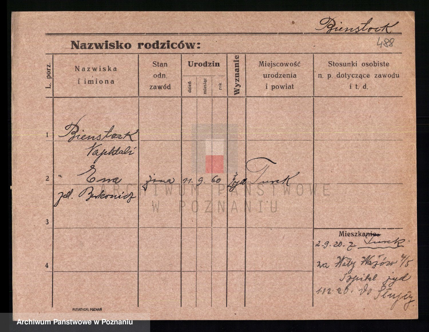 Podgląd karty osobowej dostępny jest po kliknięciu na nazwisko lub ikonkę karty. Można dokonywać powiększenia (ikony na górze) lub przechodzić między kolejnymi skanami (strzałki po bokach).