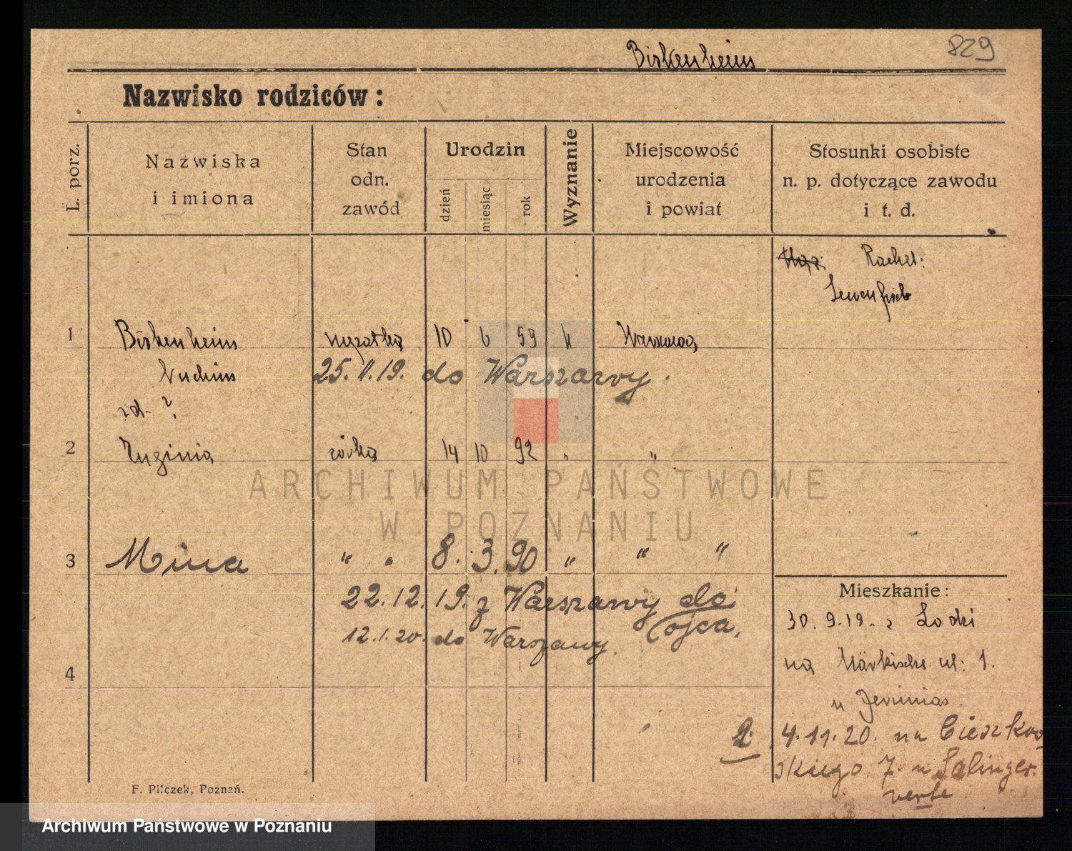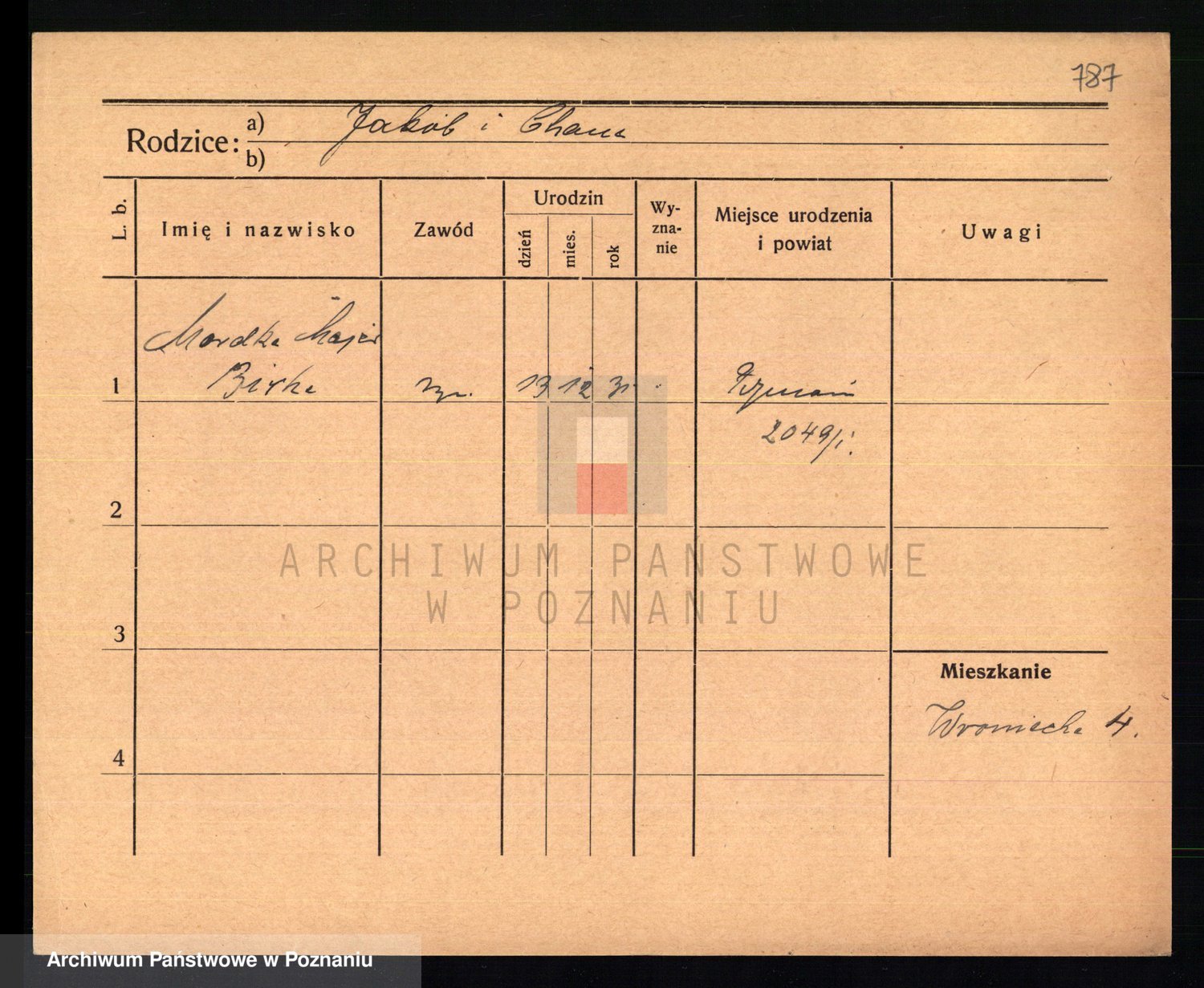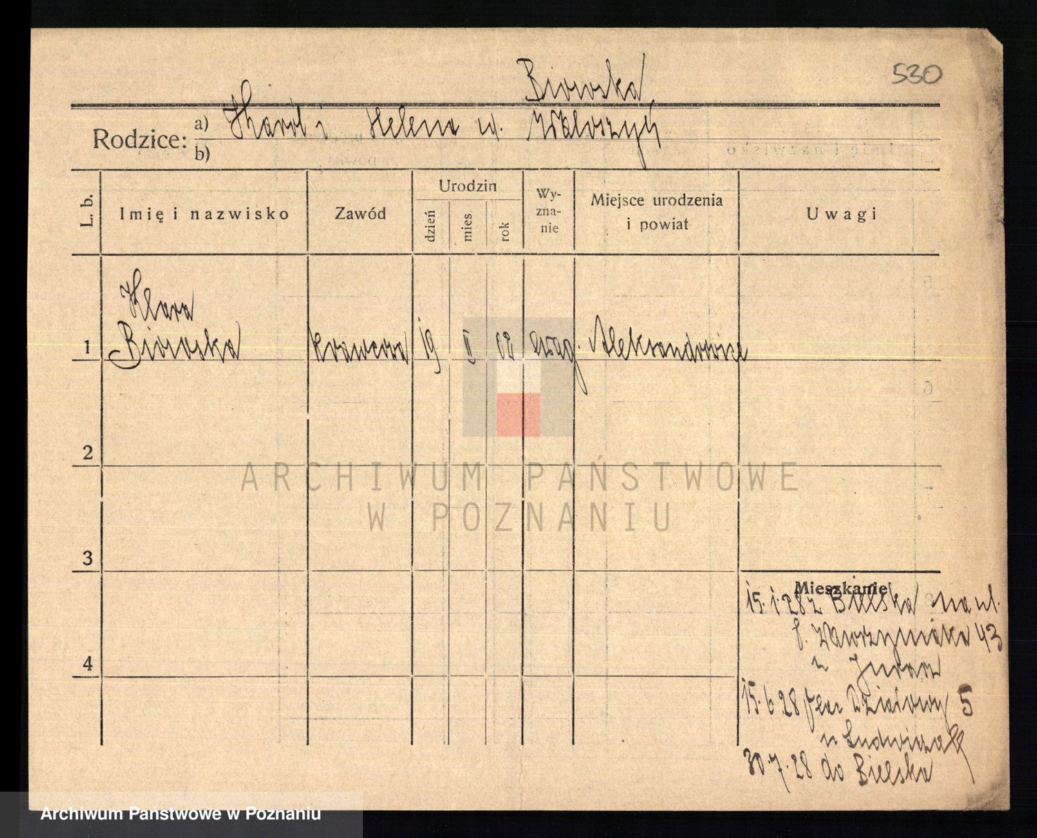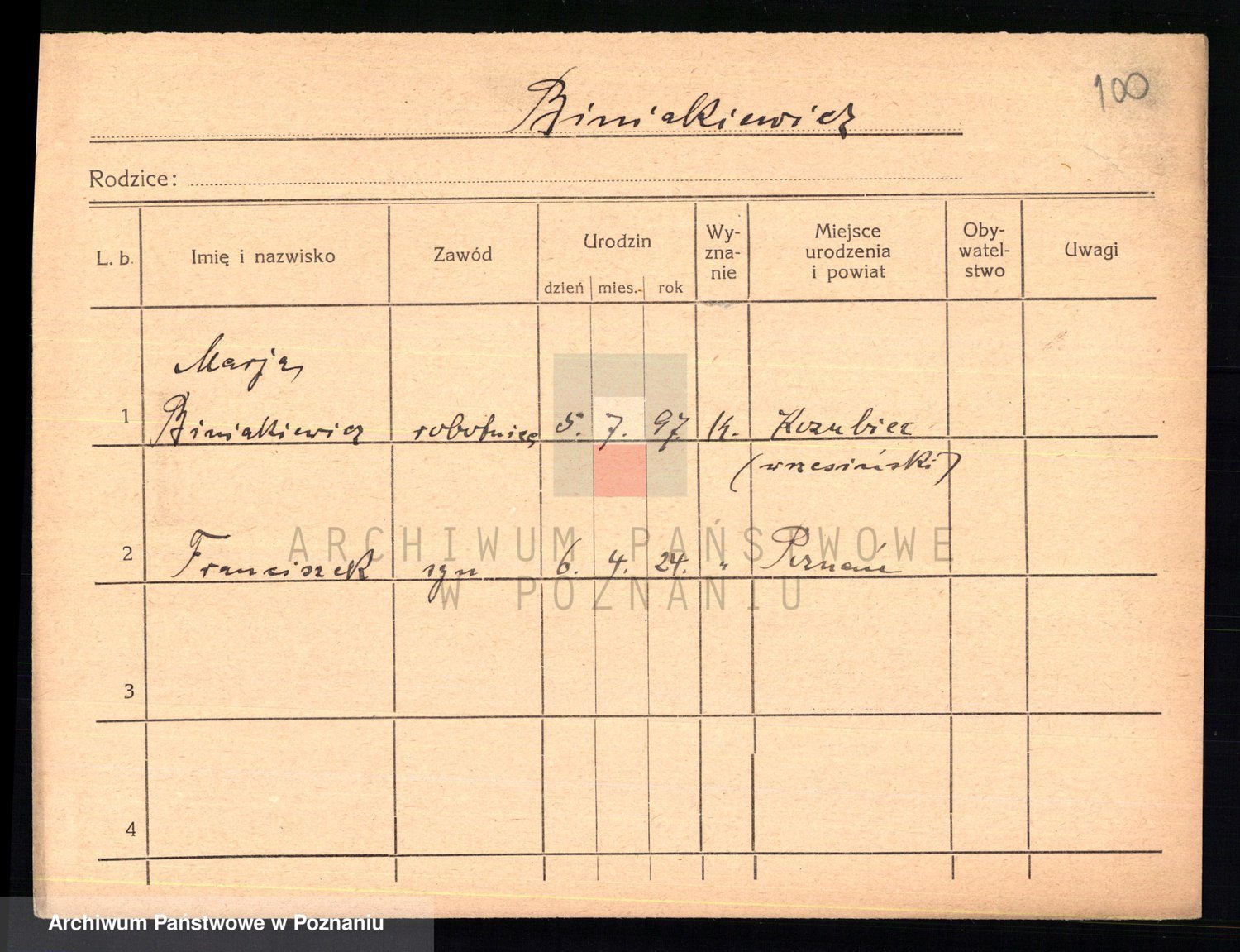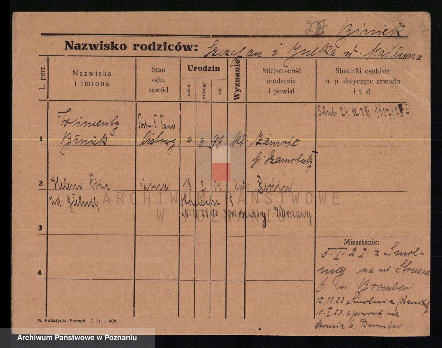 Podgląd karty osobowej dostępny jest po kliknięciu na nazwisko lub ikonkę karty. Można dokonywać powiększenia (ikony na górze) lub przechodzić między kolejnymi skanami (strzałki po bokach).