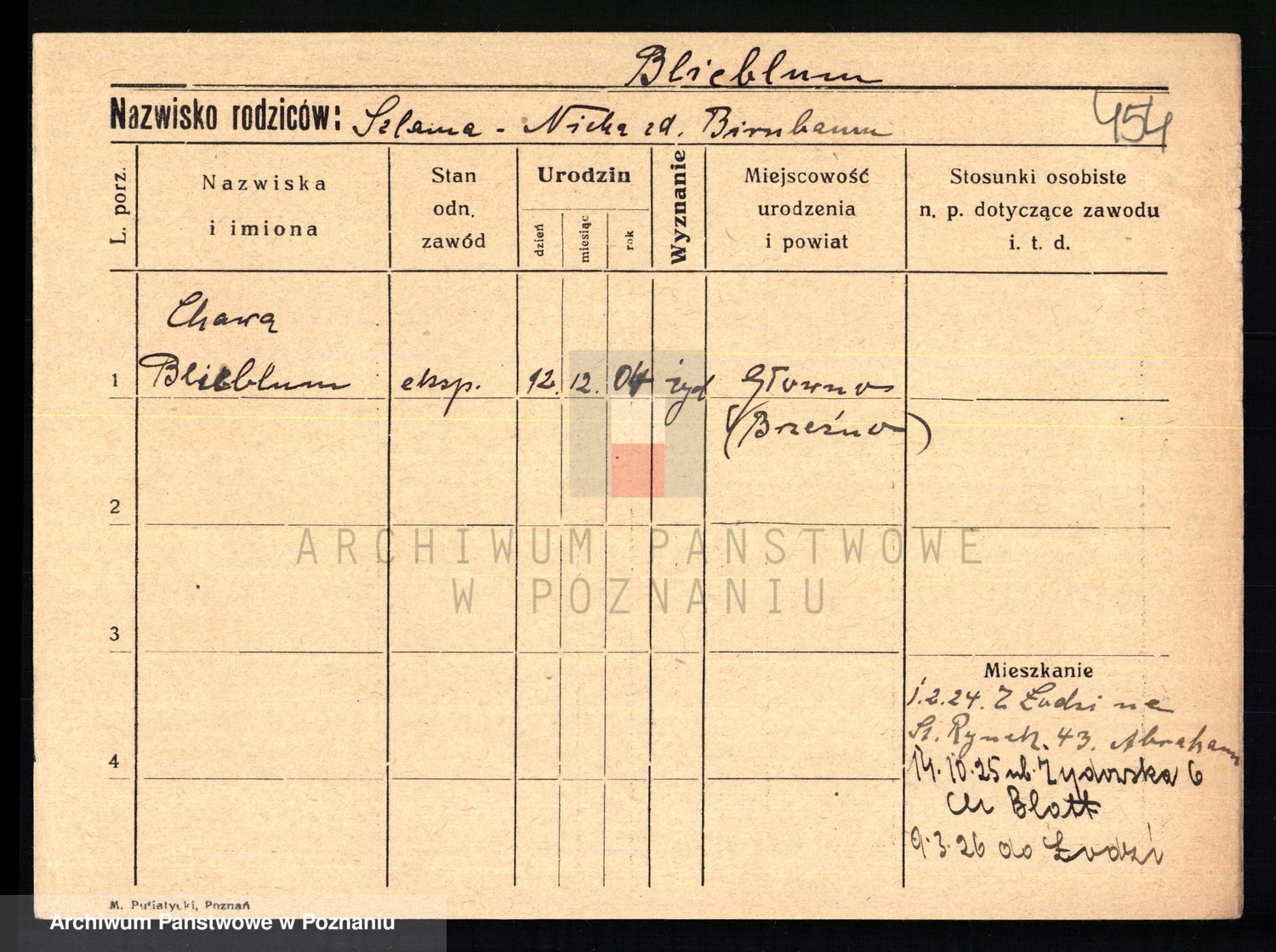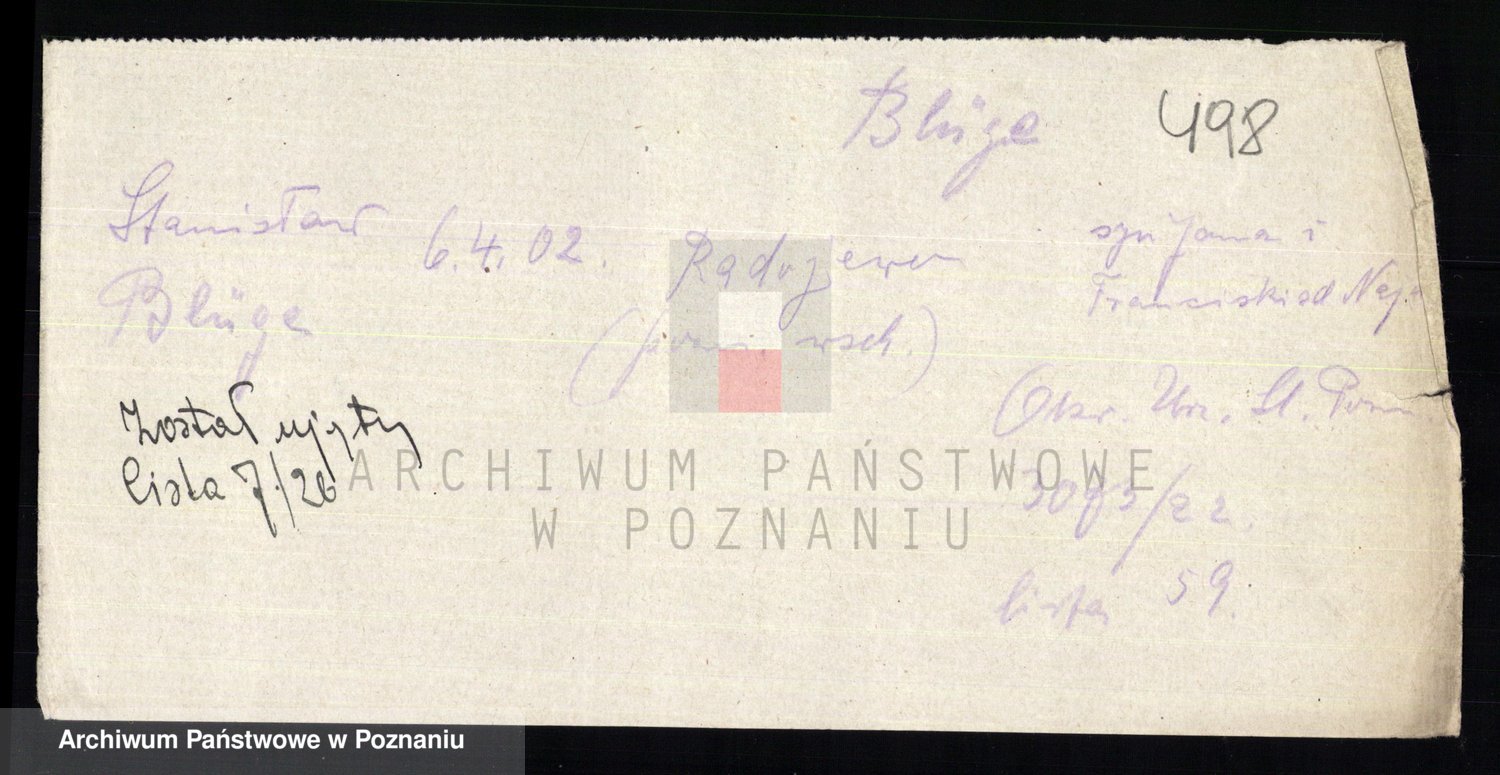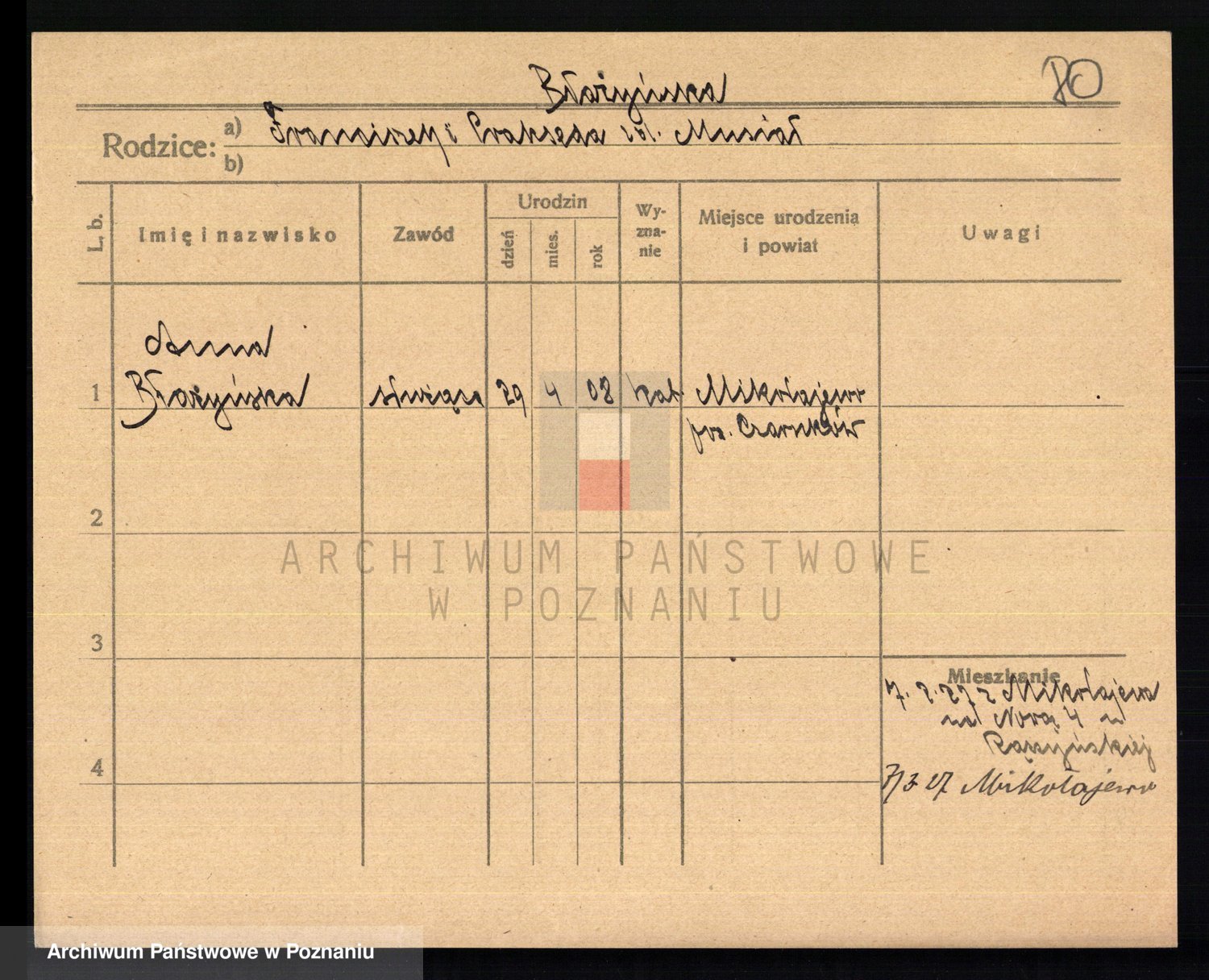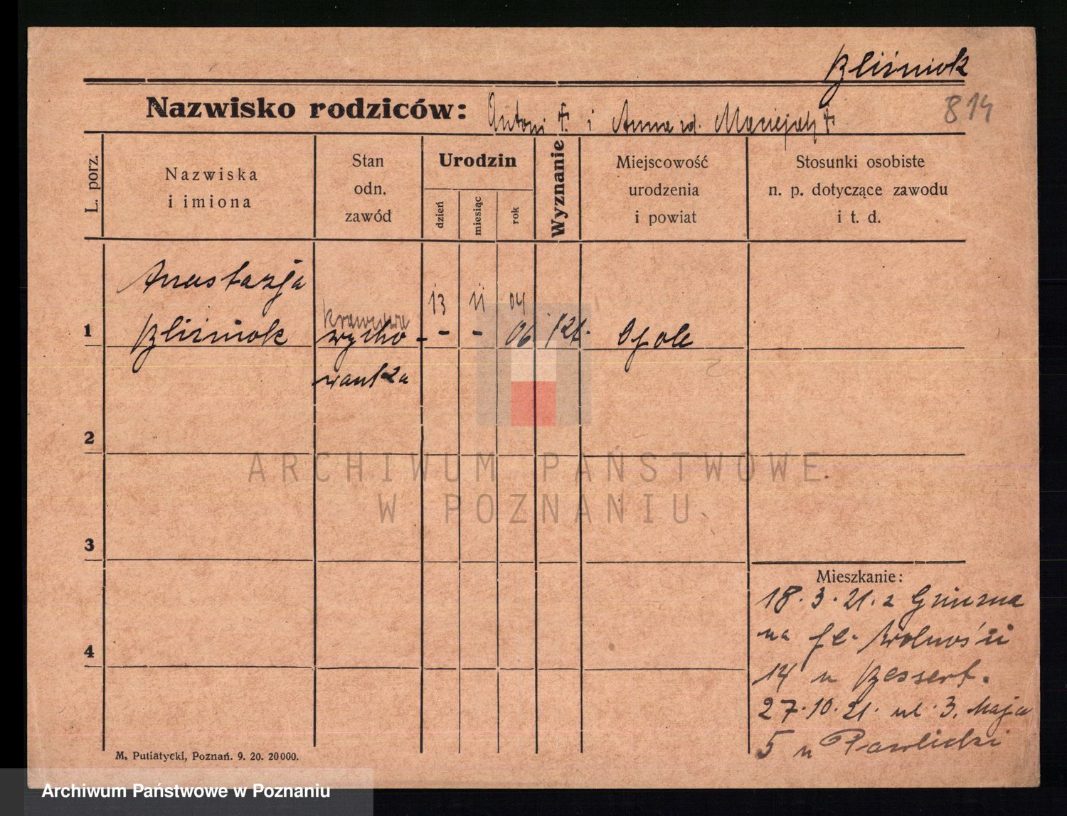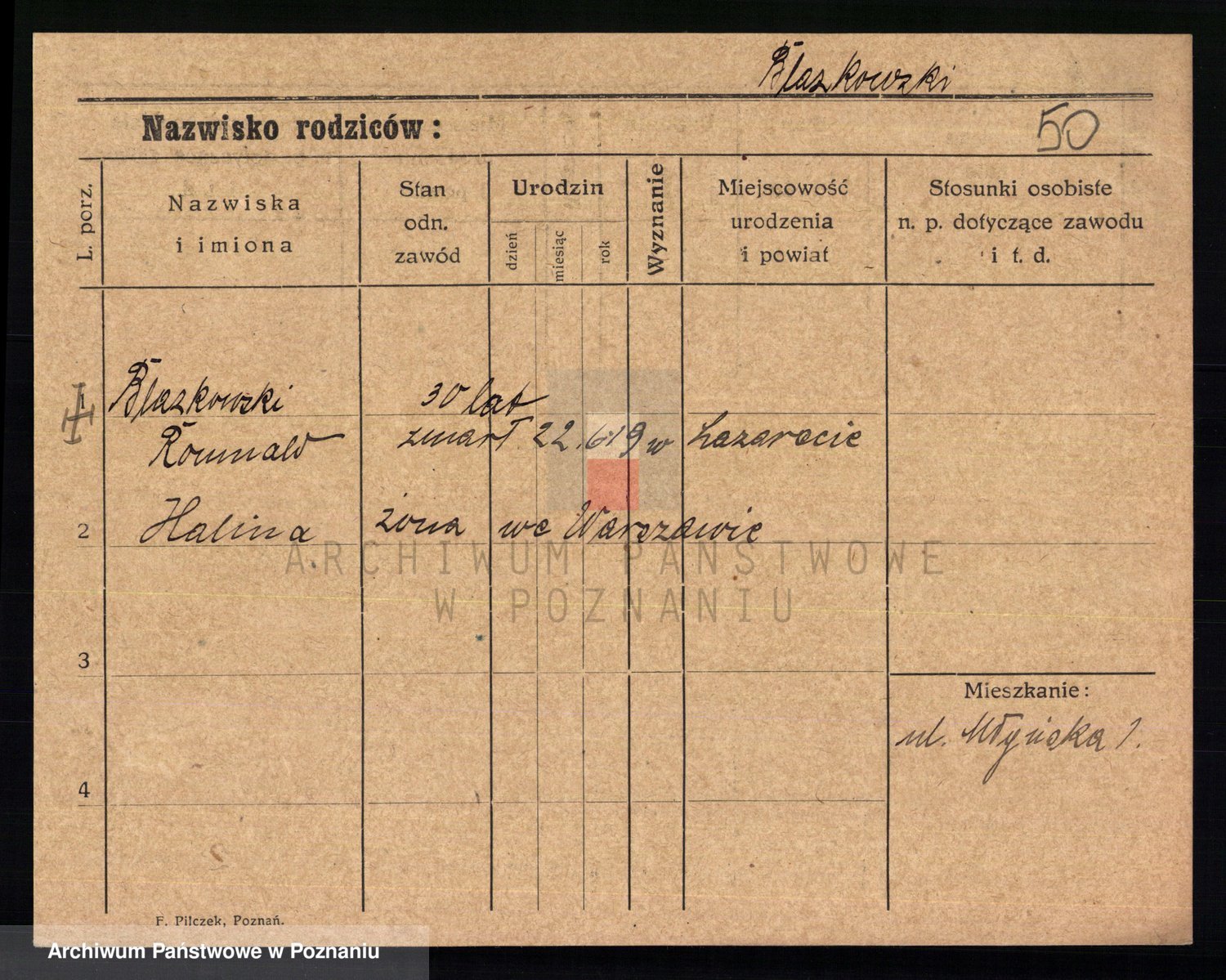 Podgląd karty osobowej dostępny jest po kliknięciu na nazwisko lub ikonkę karty. Można dokonywać powiększenia (ikony na górze) lub przechodzić między kolejnymi skanami (strzałki po bokach).