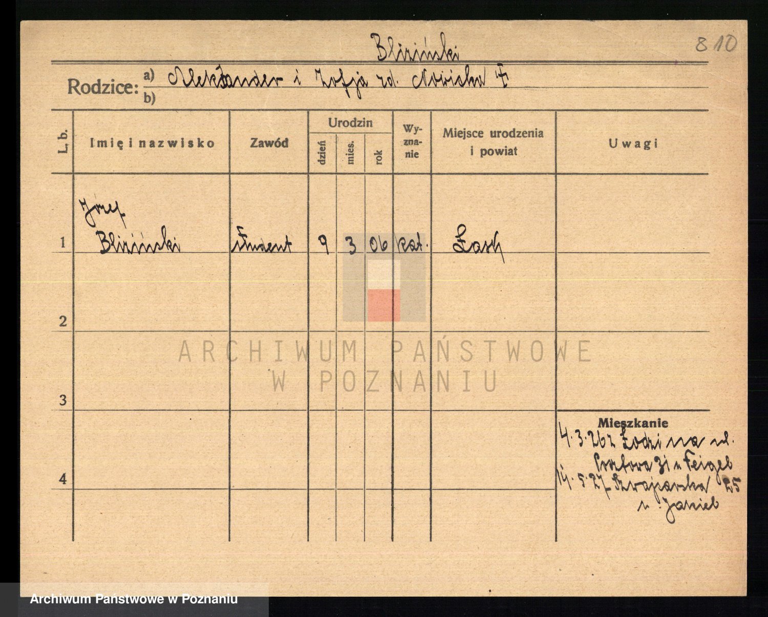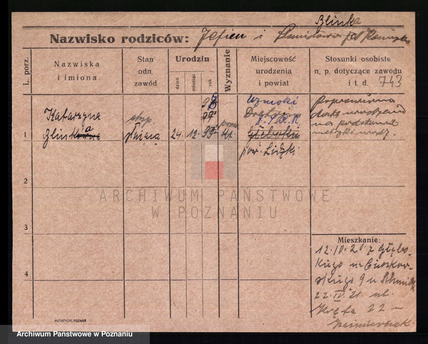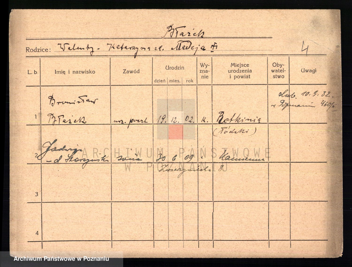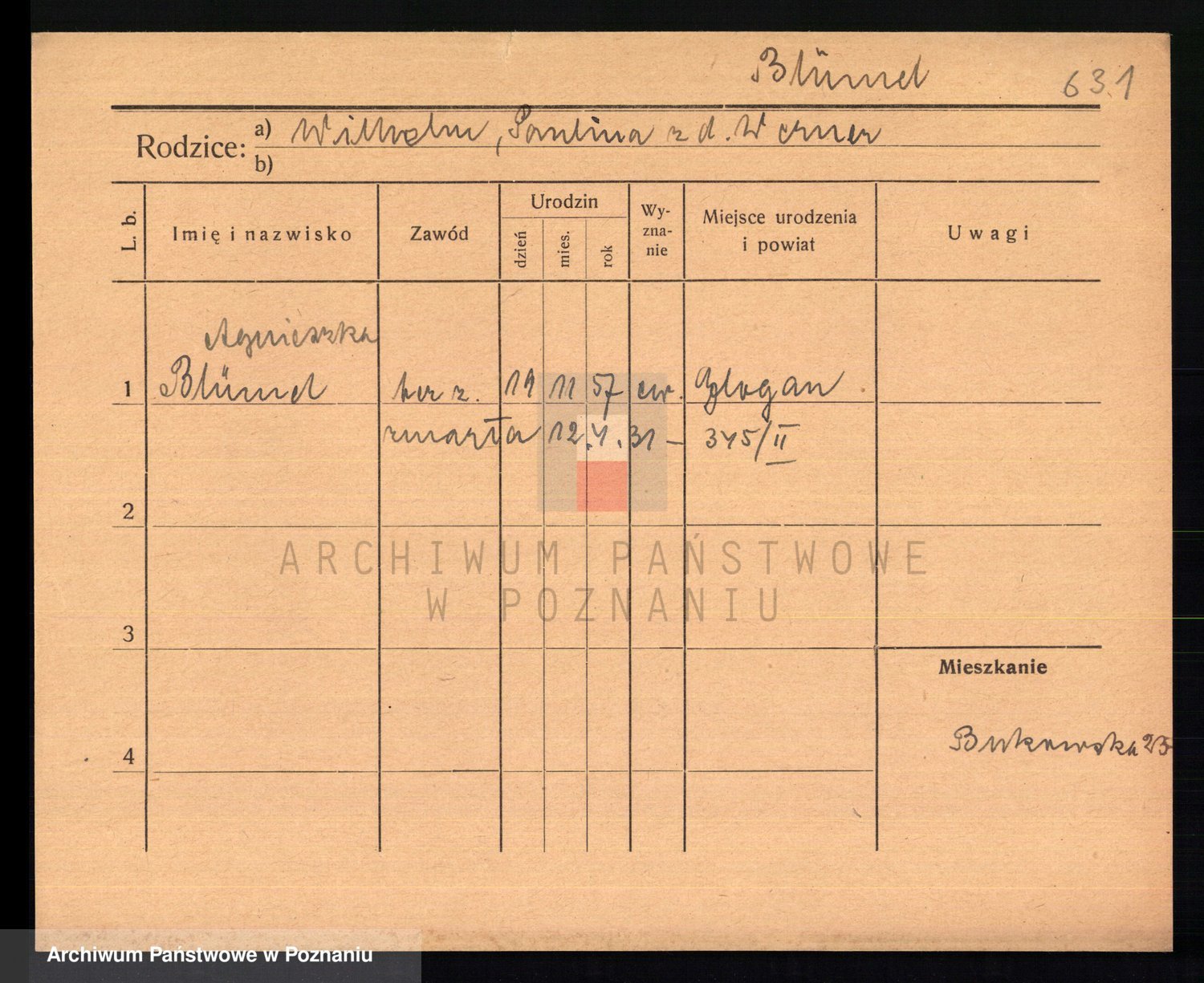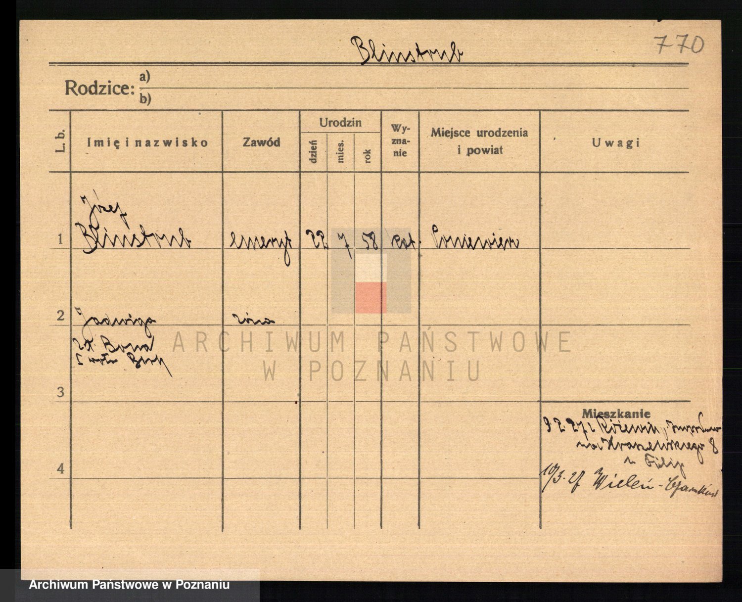 Podgląd karty osobowej dostępny jest po kliknięciu na nazwisko lub ikonkę karty. Można dokonywać powiększenia (ikony na górze) lub przechodzić między kolejnymi skanami (strzałki po bokach).