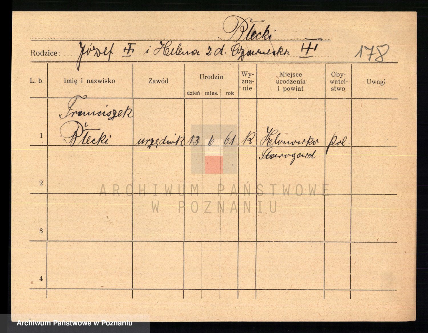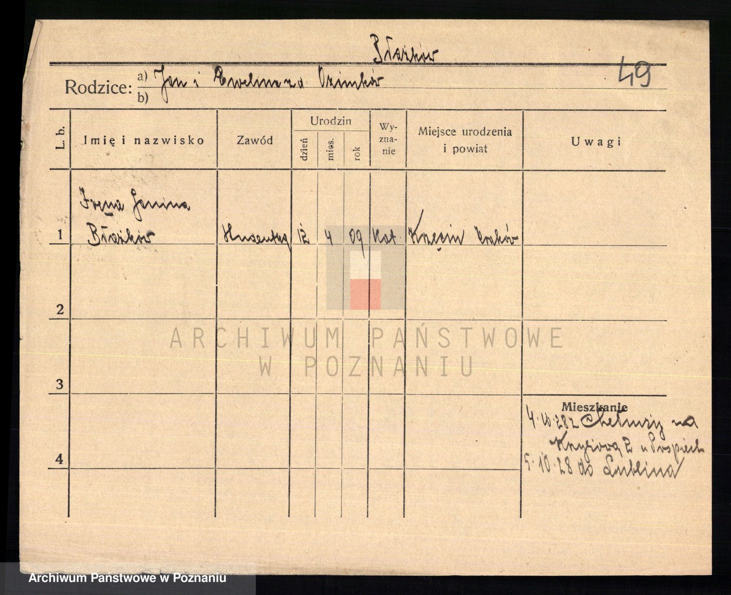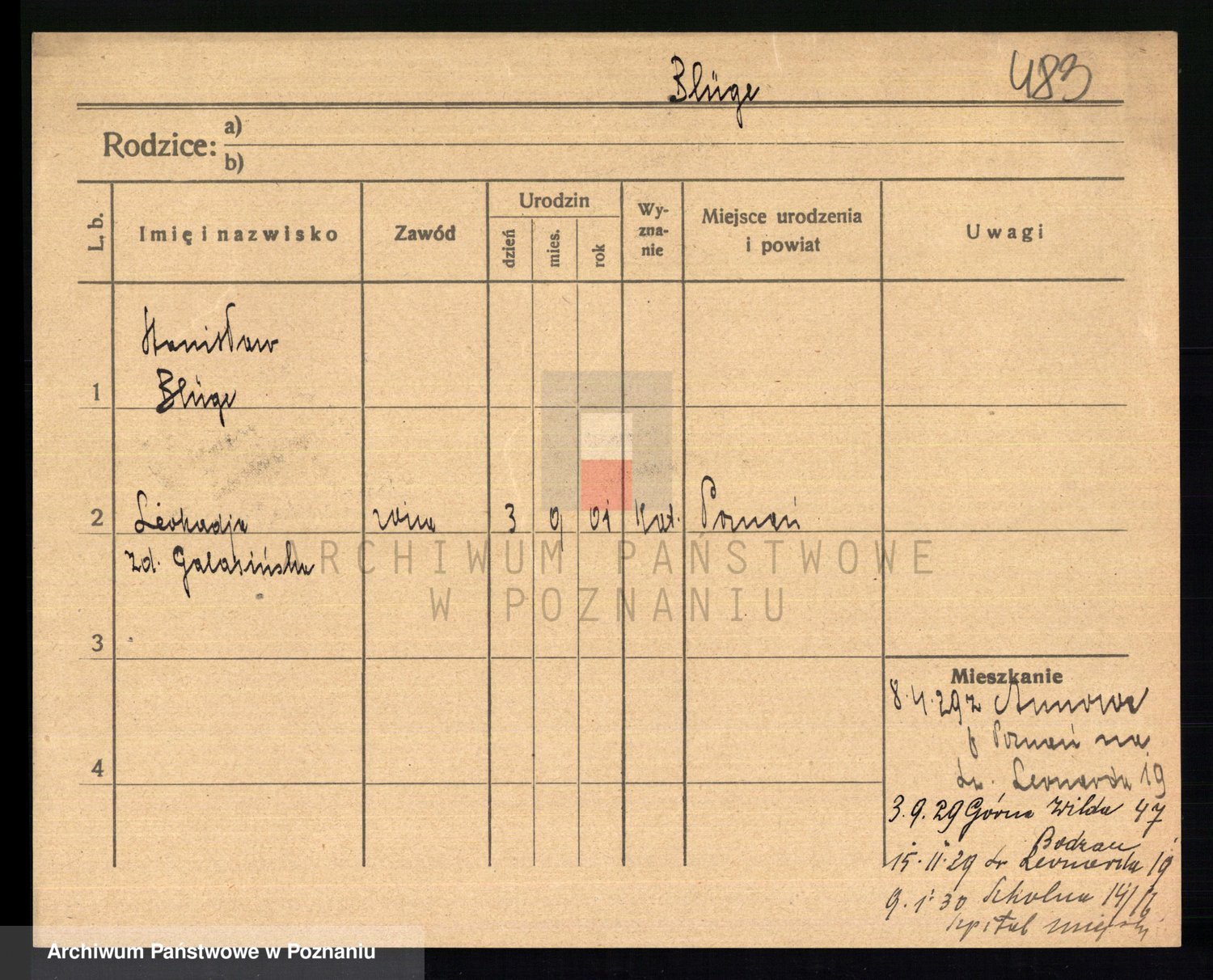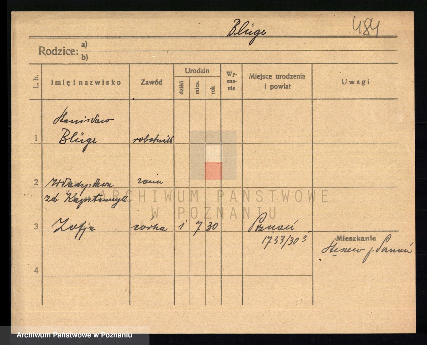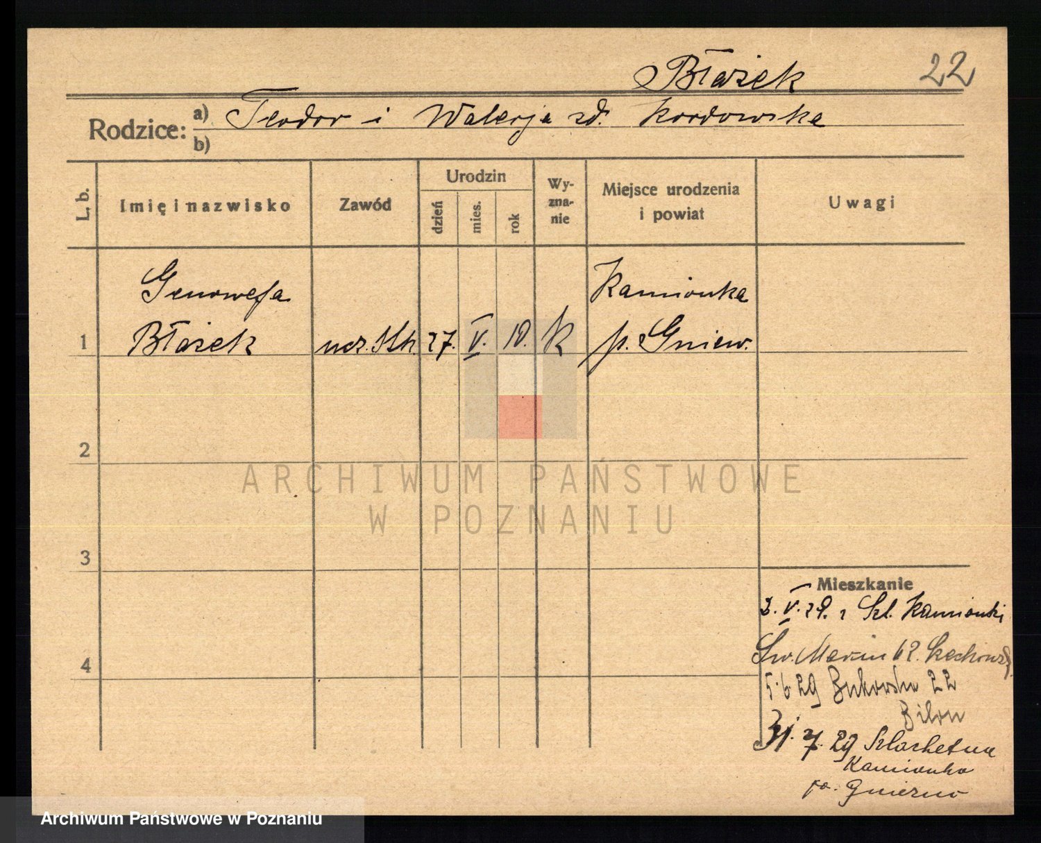 Podgląd karty osobowej dostępny jest po kliknięciu na nazwisko lub ikonkę karty. Można dokonywać powiększenia (ikony na górze) lub przechodzić między kolejnymi skanami (strzałki po bokach).