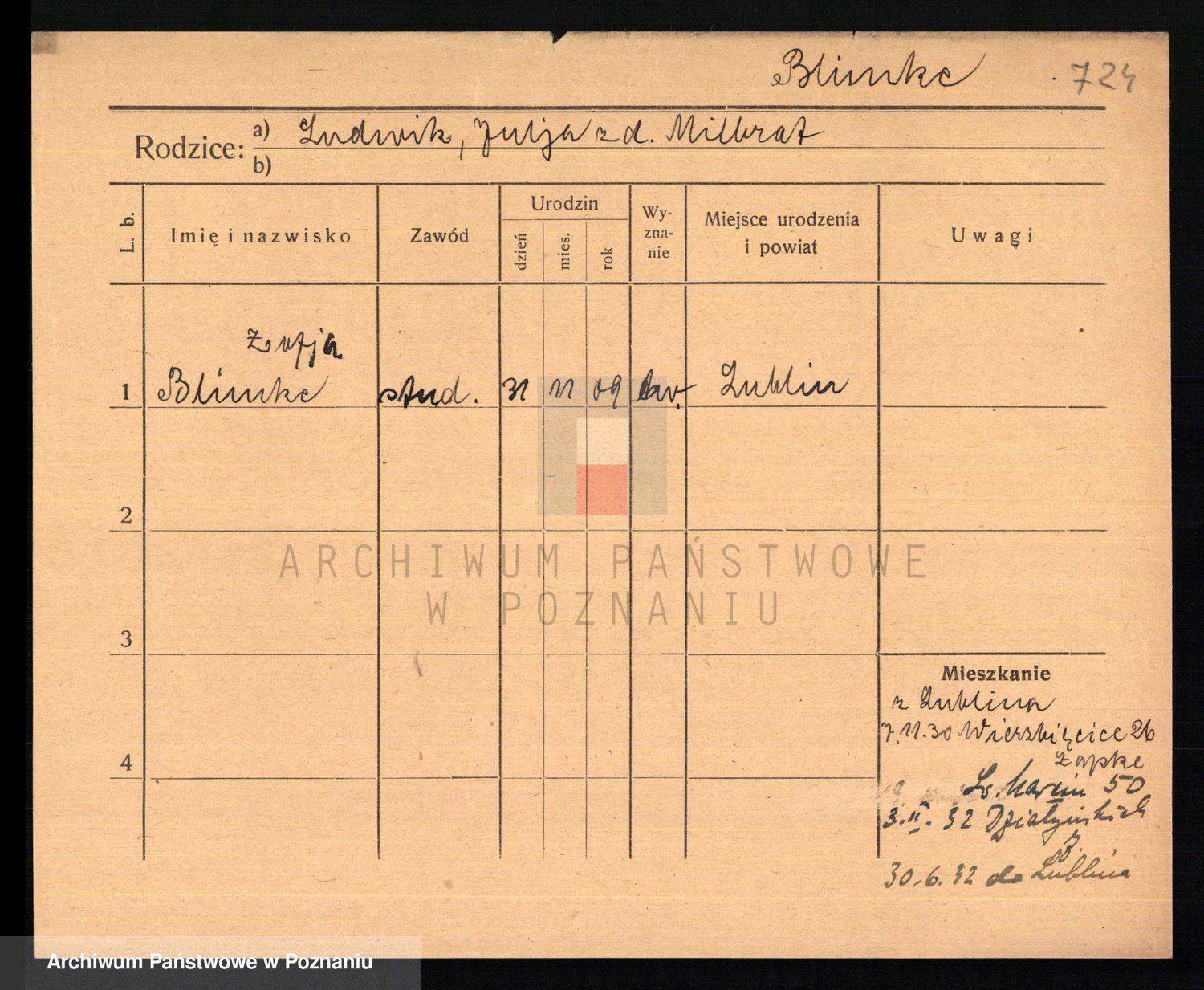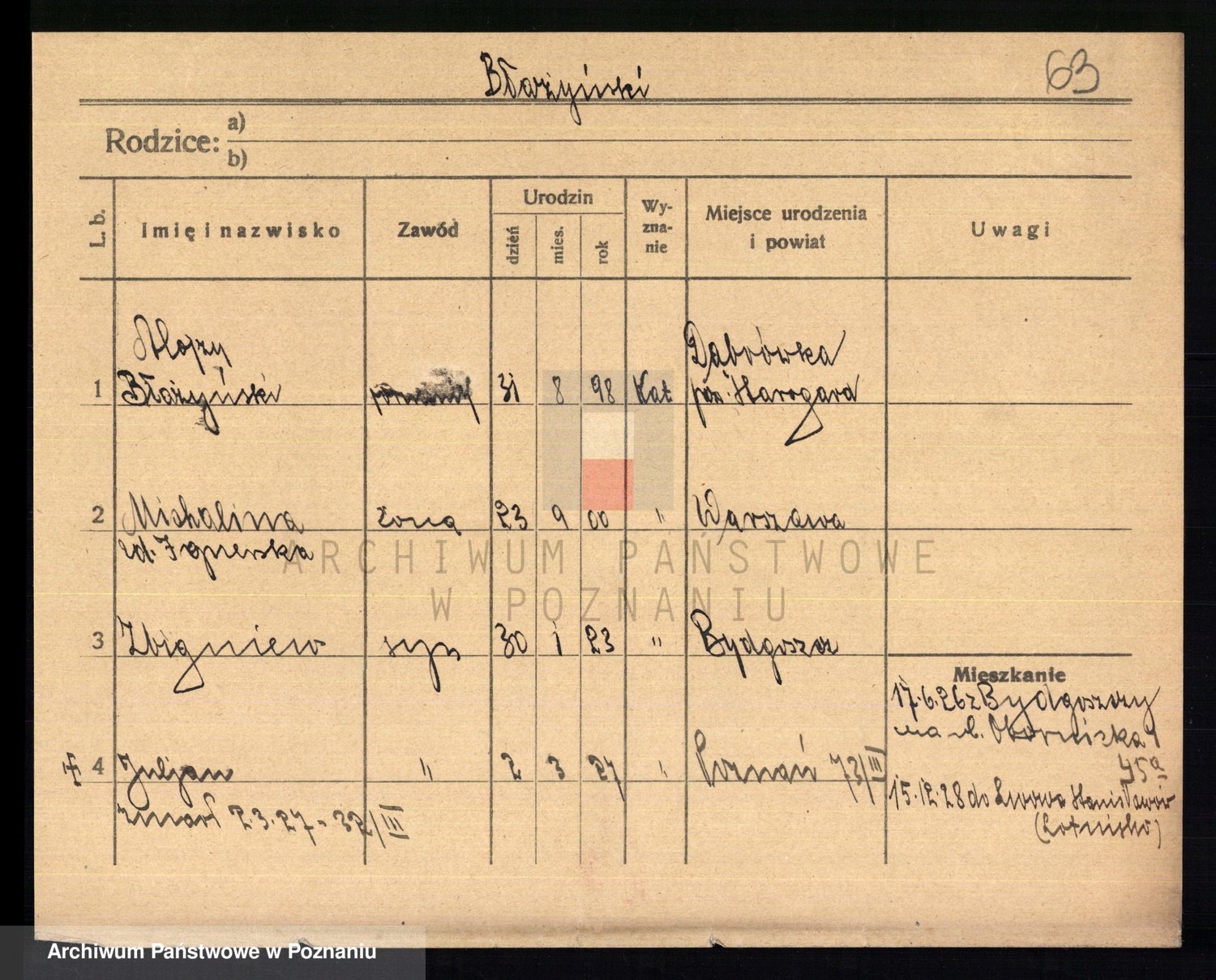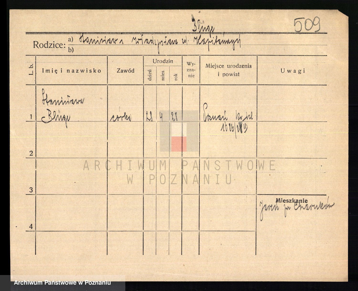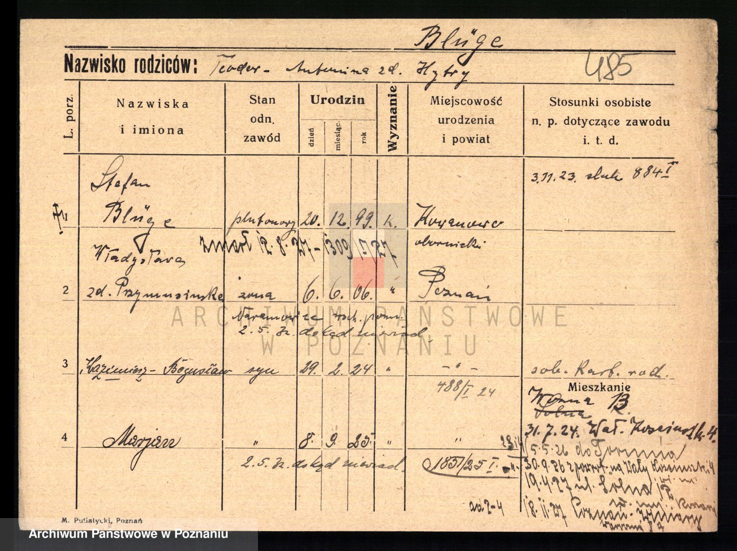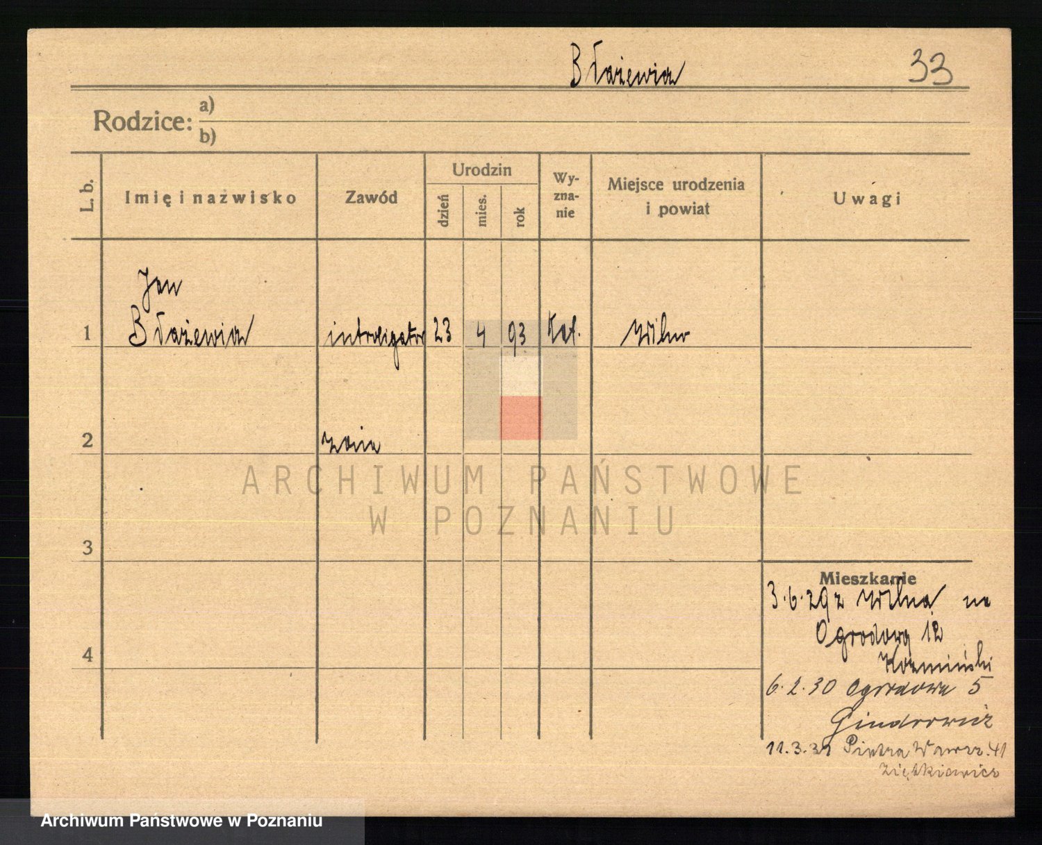 Podgląd karty osobowej dostępny jest po kliknięciu na nazwisko lub ikonkę karty. Można dokonywać powiększenia (ikony na górze) lub przechodzić między kolejnymi skanami (strzałki po bokach).