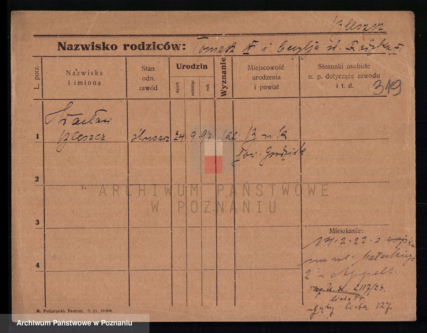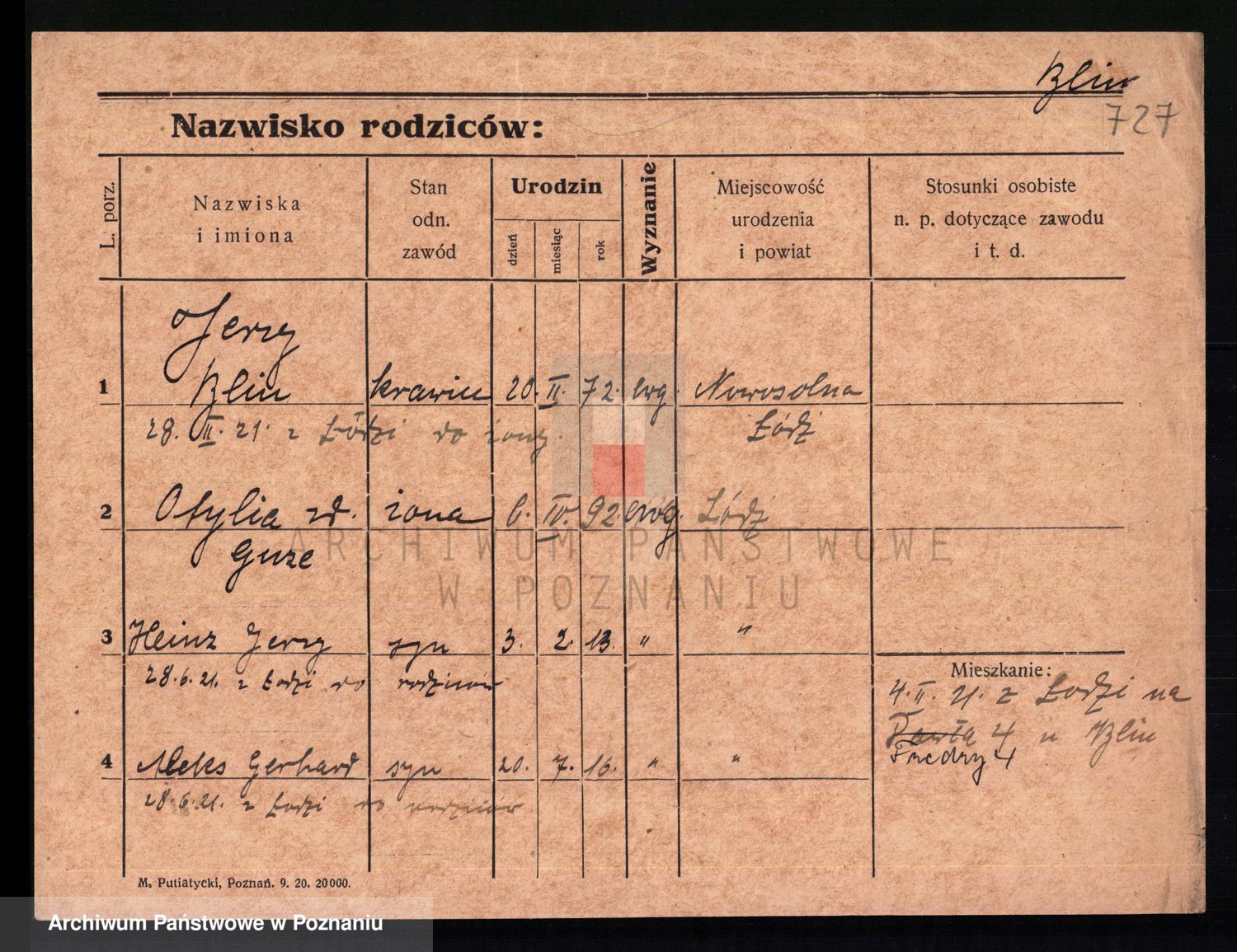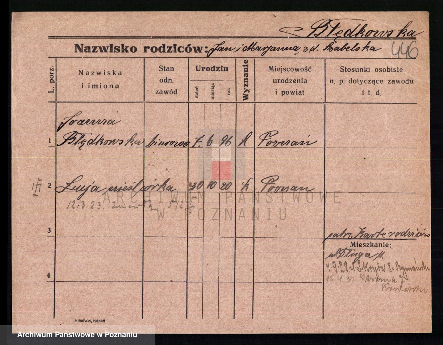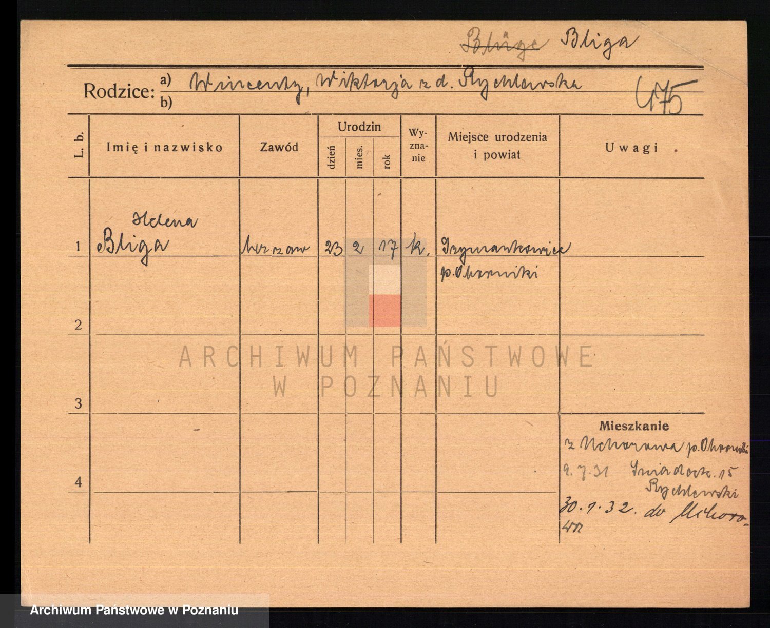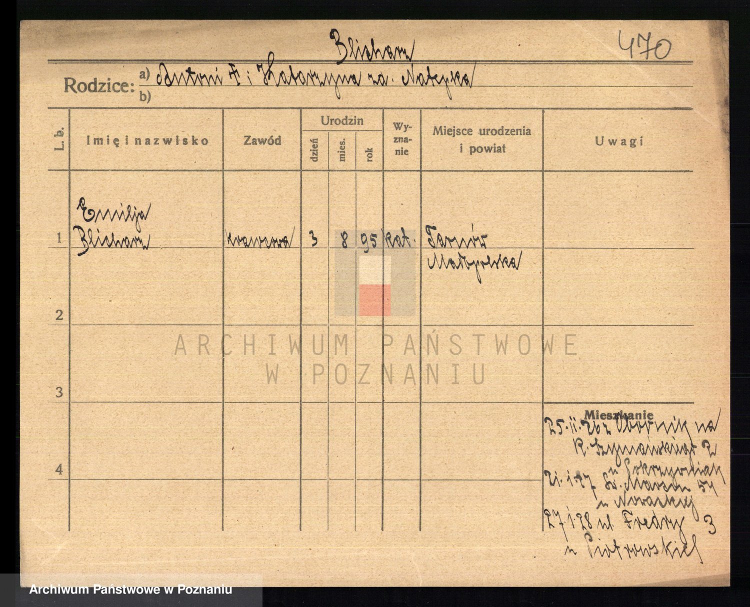 Podgląd karty osobowej dostępny jest po kliknięciu na nazwisko lub ikonkę karty. Można dokonywać powiększenia (ikony na górze) lub przechodzić między kolejnymi skanami (strzałki po bokach).