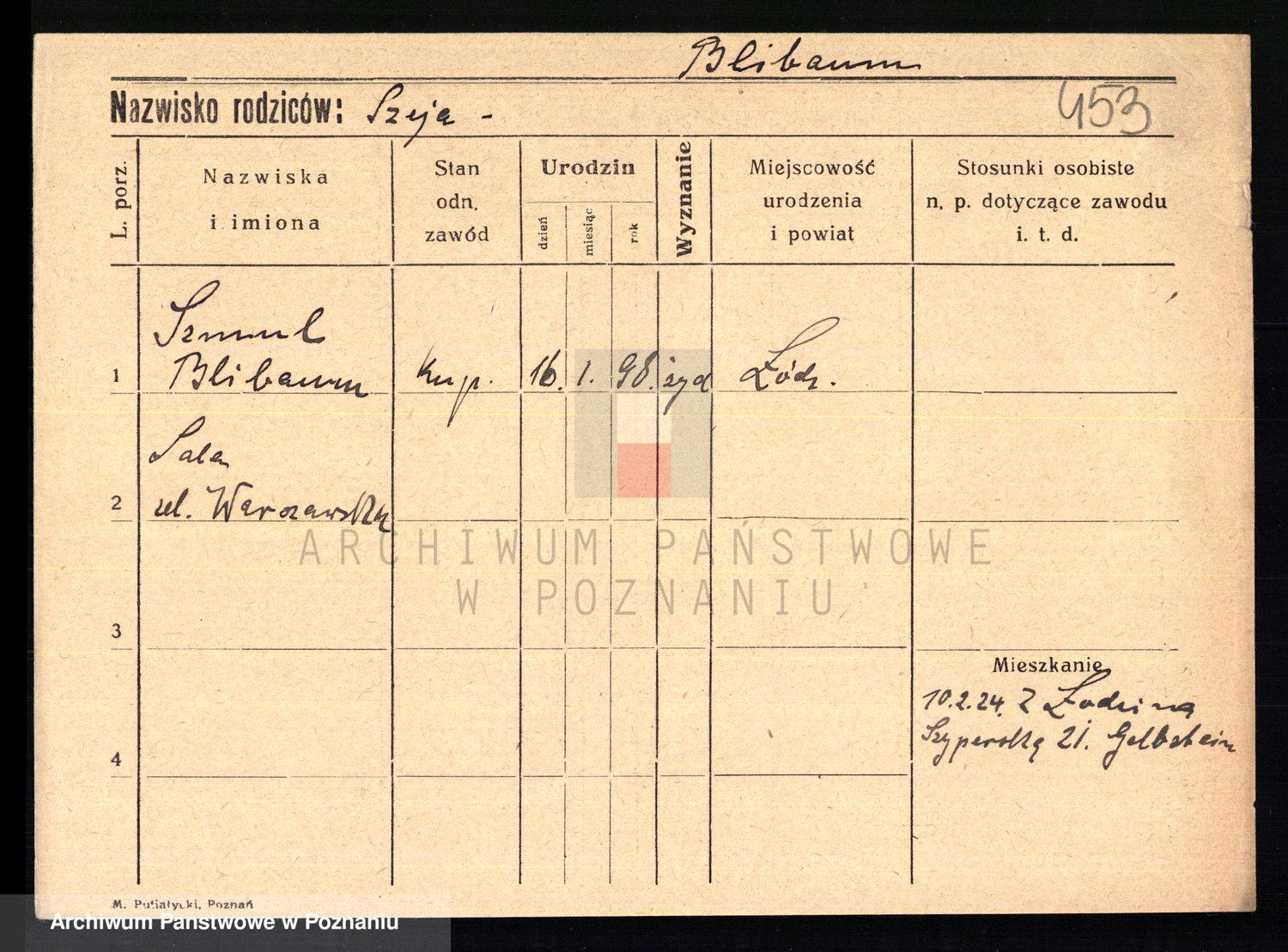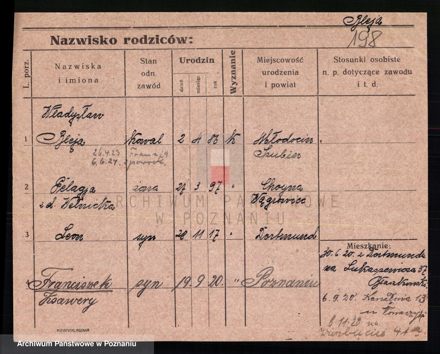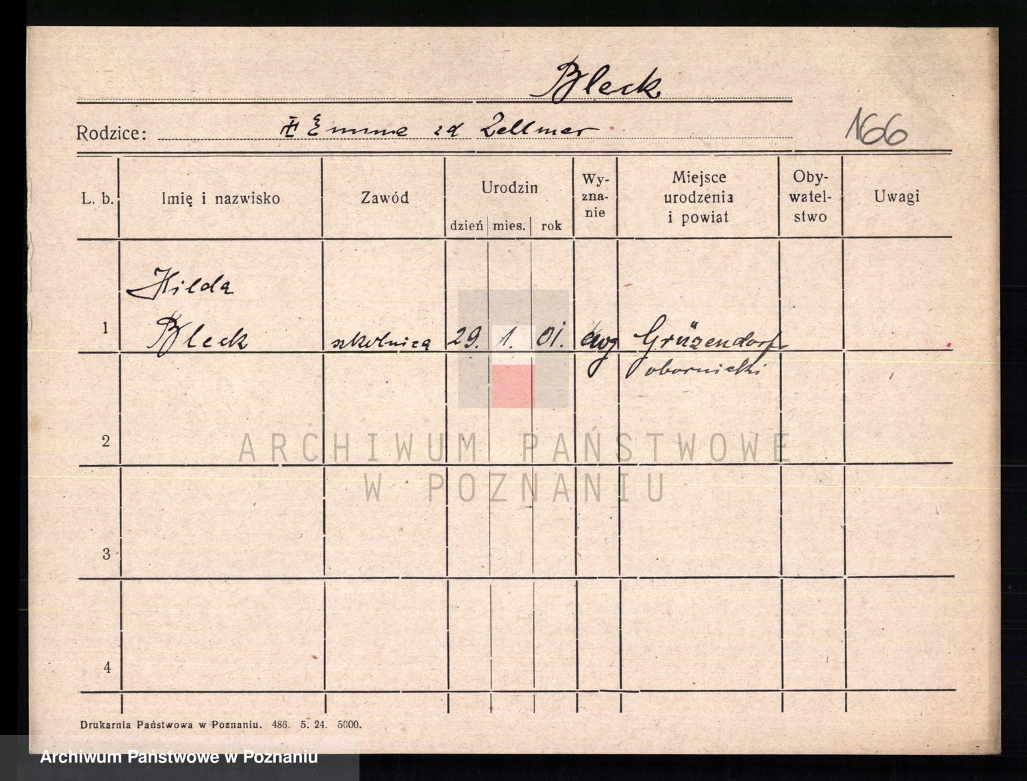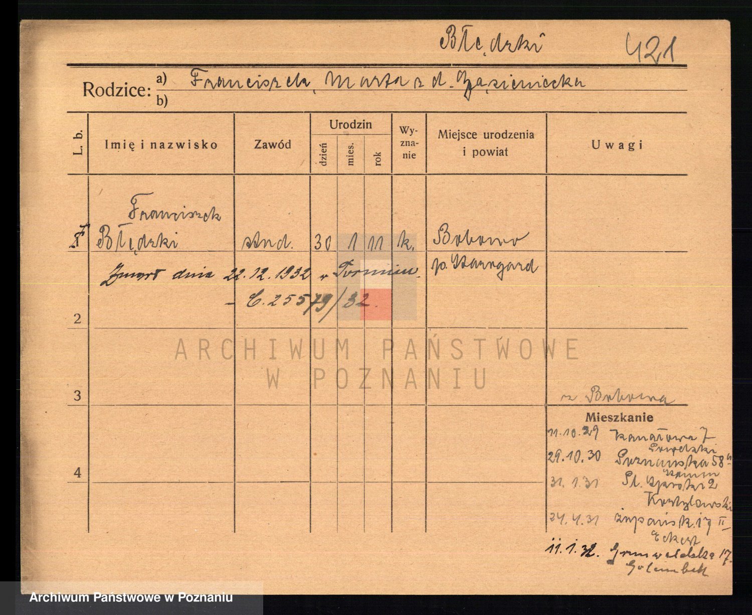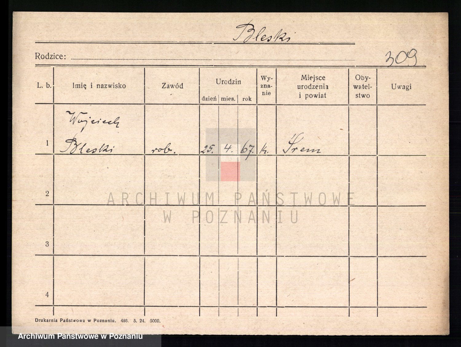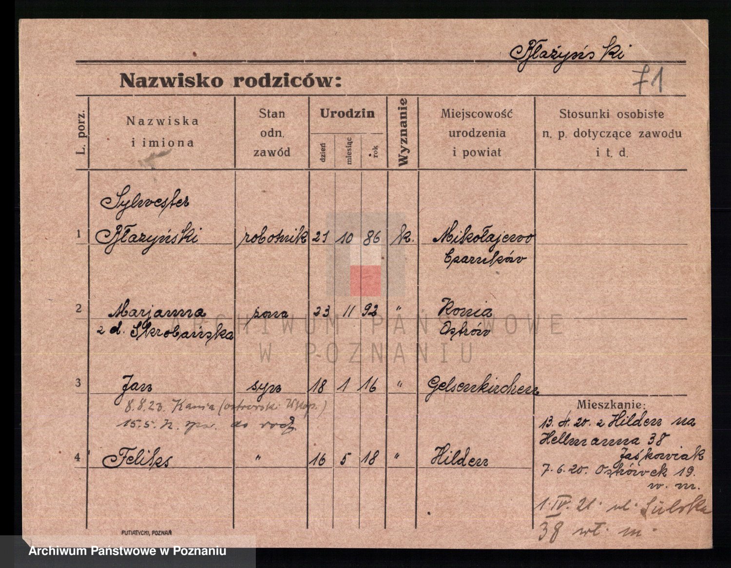 Podgląd karty osobowej dostępny jest po kliknięciu na nazwisko lub ikonkę karty. Można dokonywać powiększenia (ikony na górze) lub przechodzić między kolejnymi skanami (strzałki po bokach).