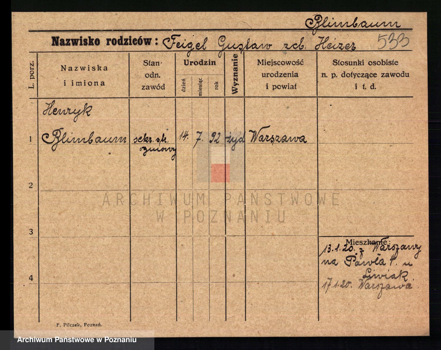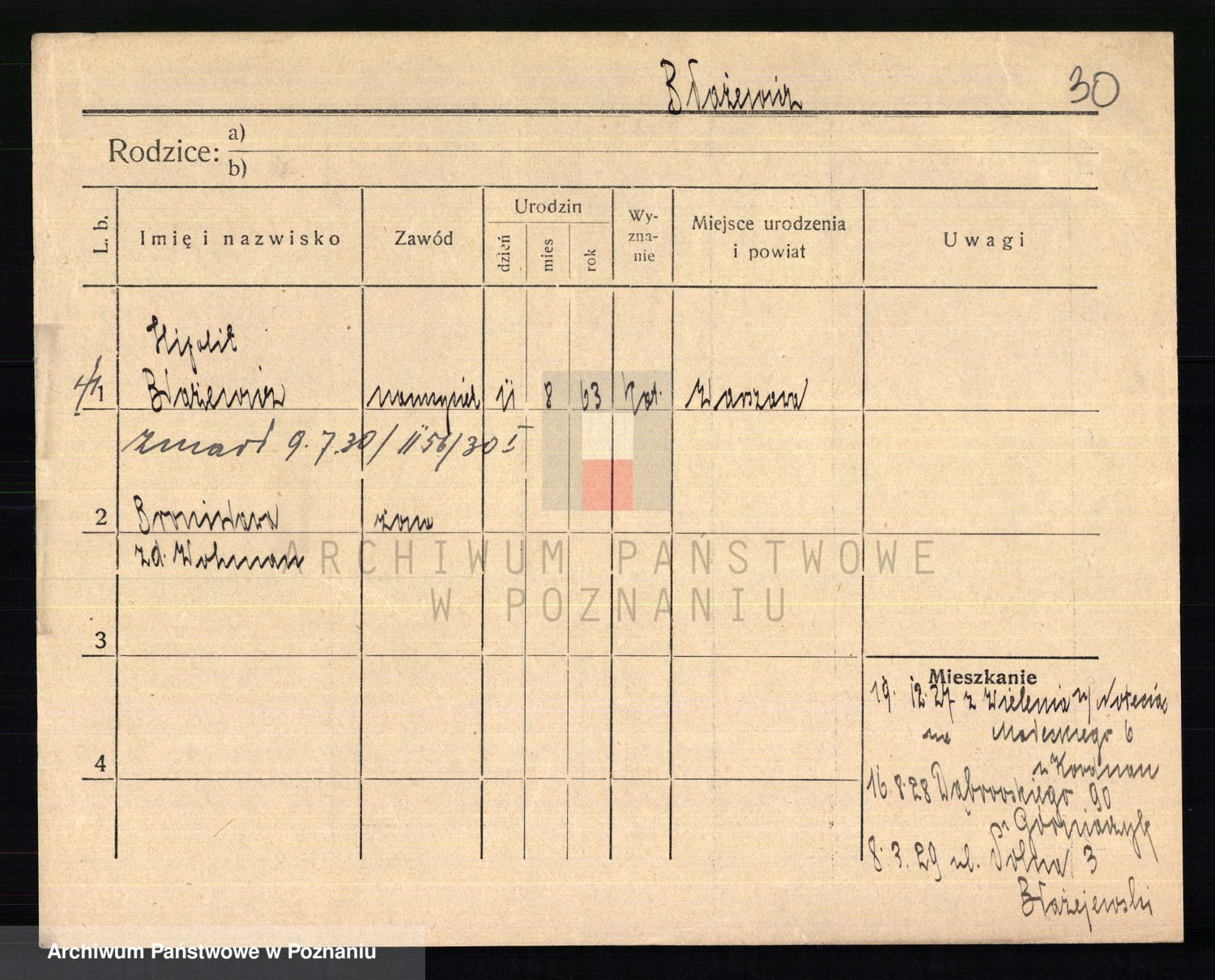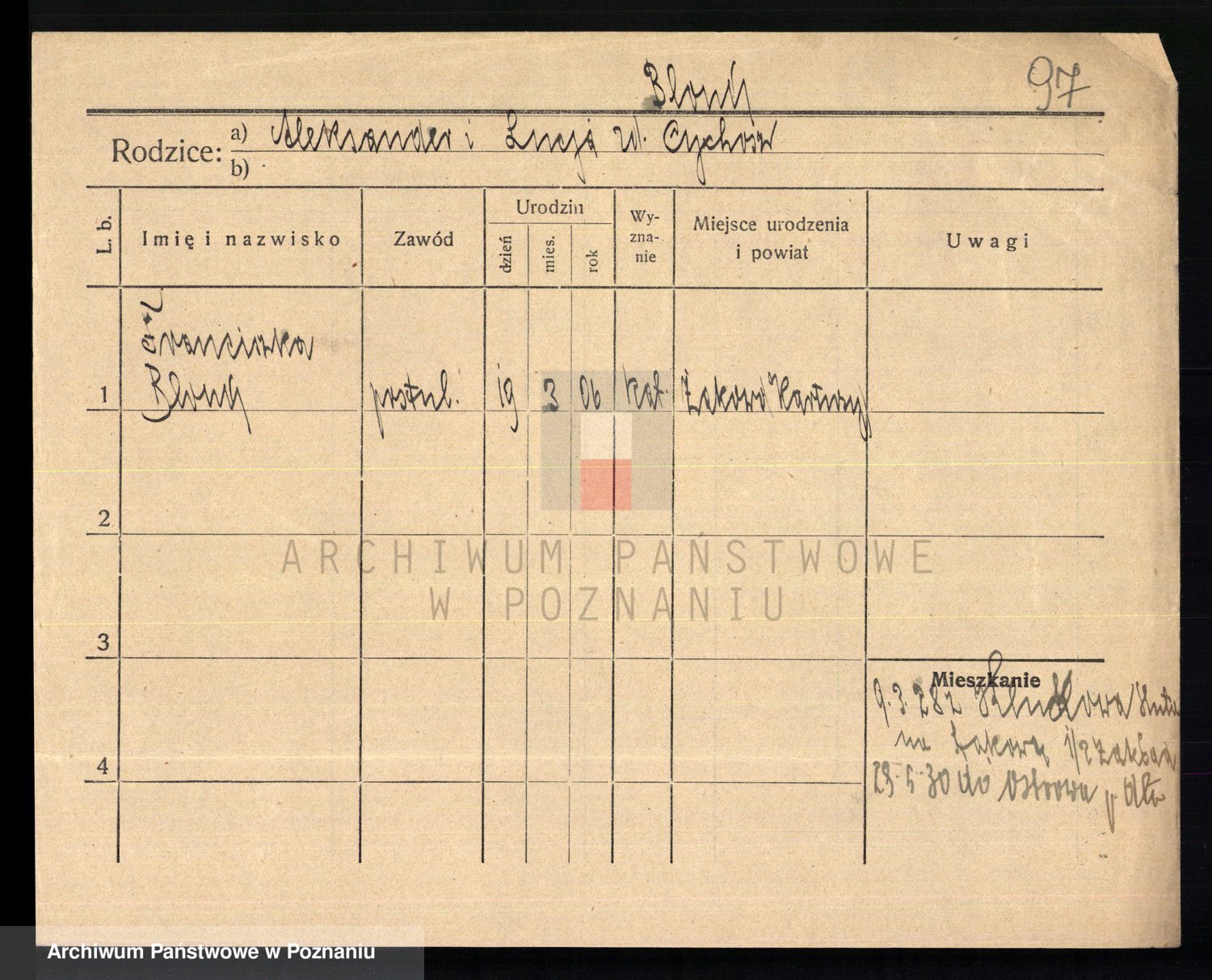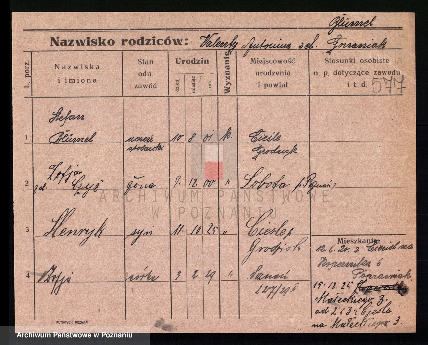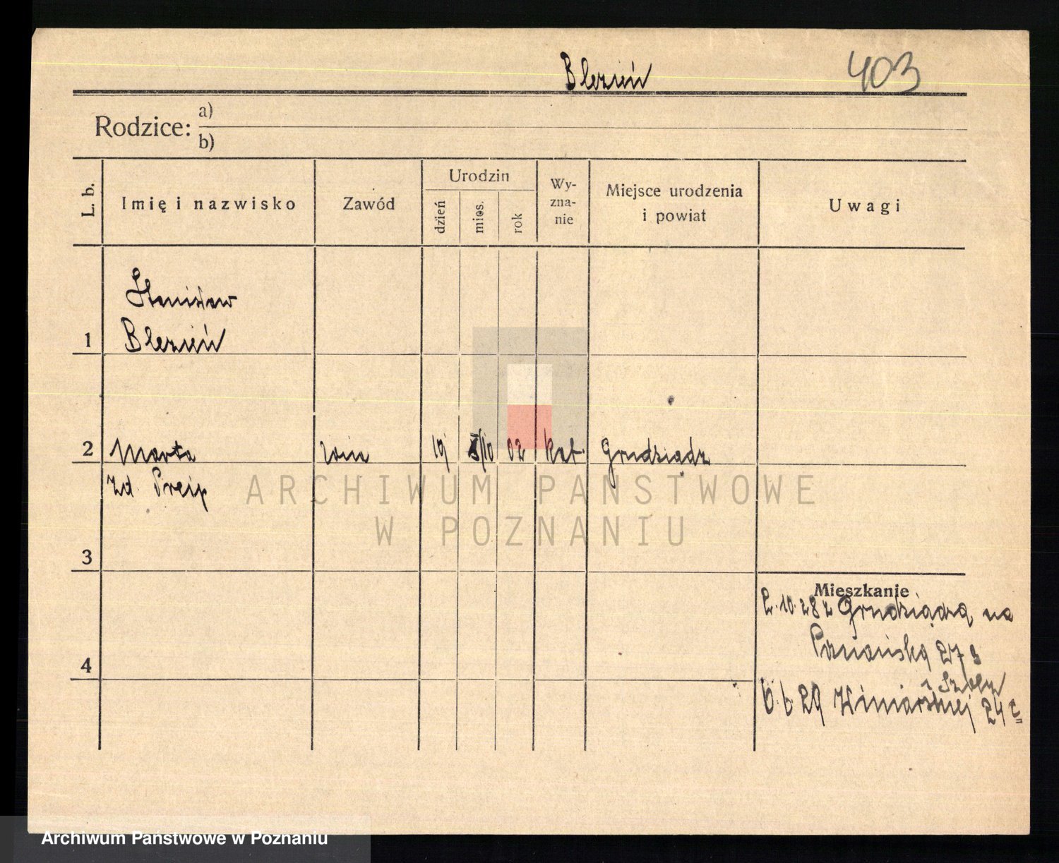 Podgląd karty osobowej dostępny jest po kliknięciu na nazwisko lub ikonkę karty. Można dokonywać powiększenia (ikony na górze) lub przechodzić między kolejnymi skanami (strzałki po bokach).
