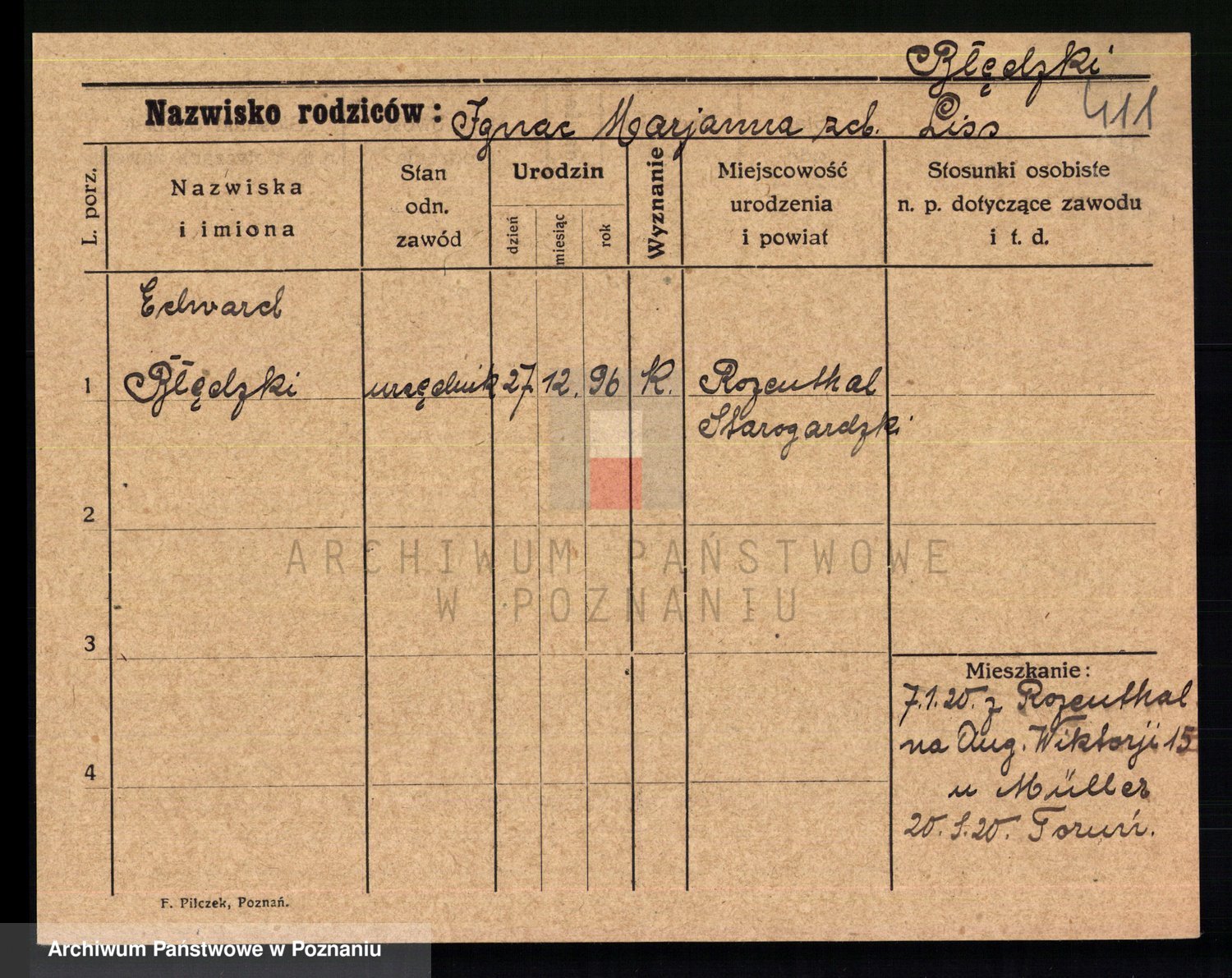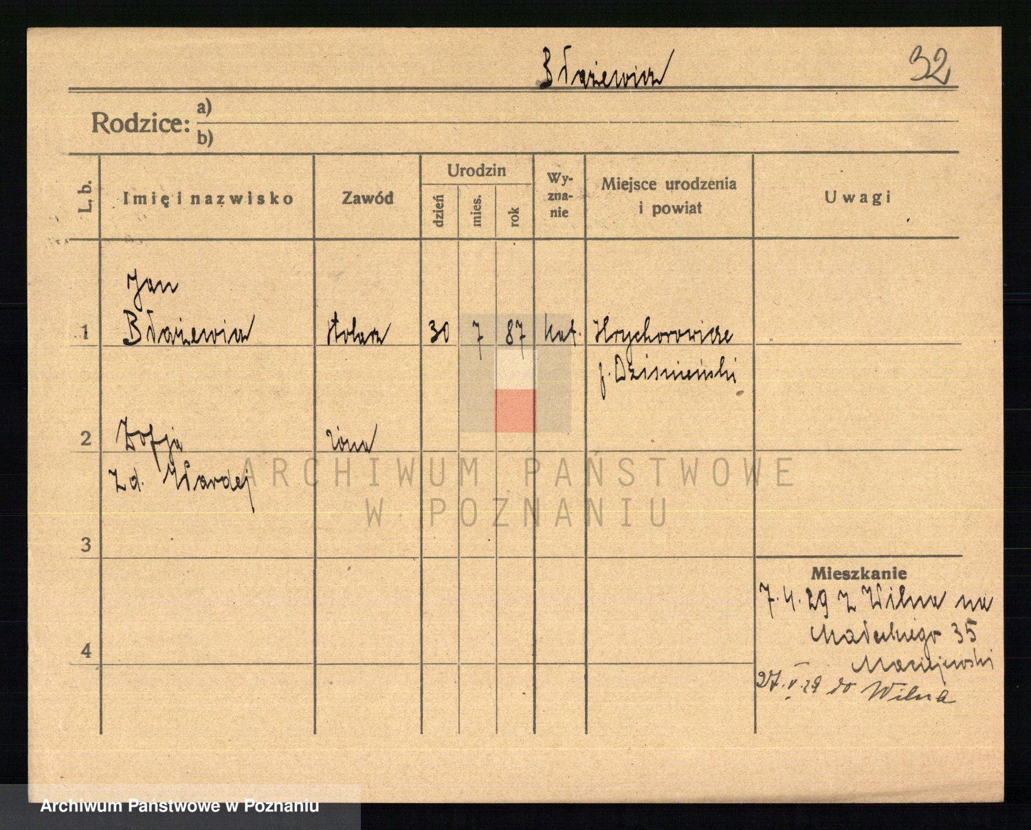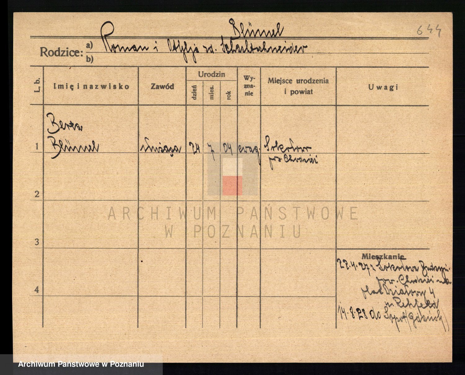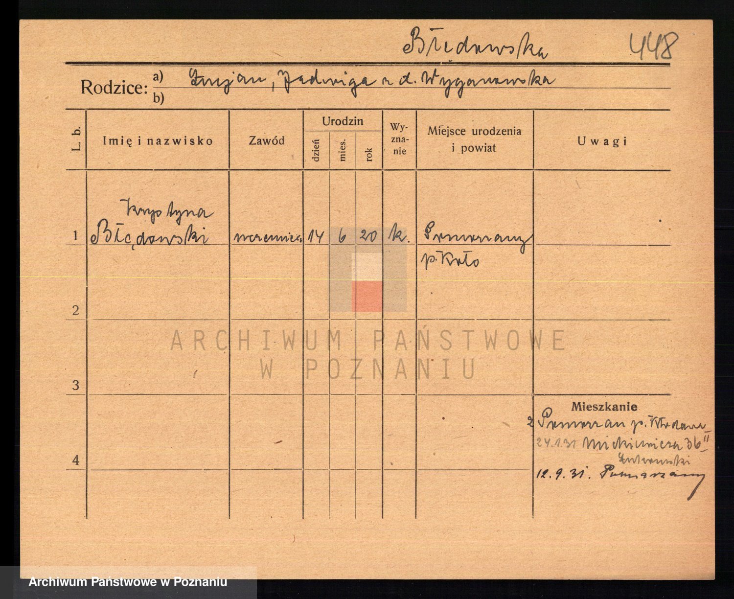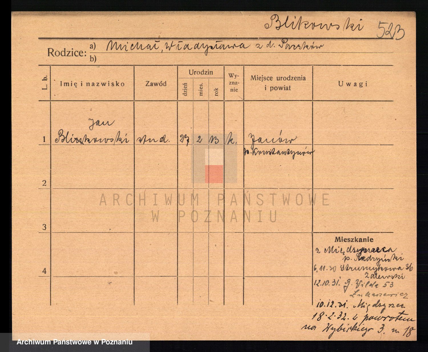 Podgląd karty osobowej dostępny jest po kliknięciu na nazwisko lub ikonkę karty. Można dokonywać powiększenia (ikony na górze) lub przechodzić między kolejnymi skanami (strzałki po bokach).