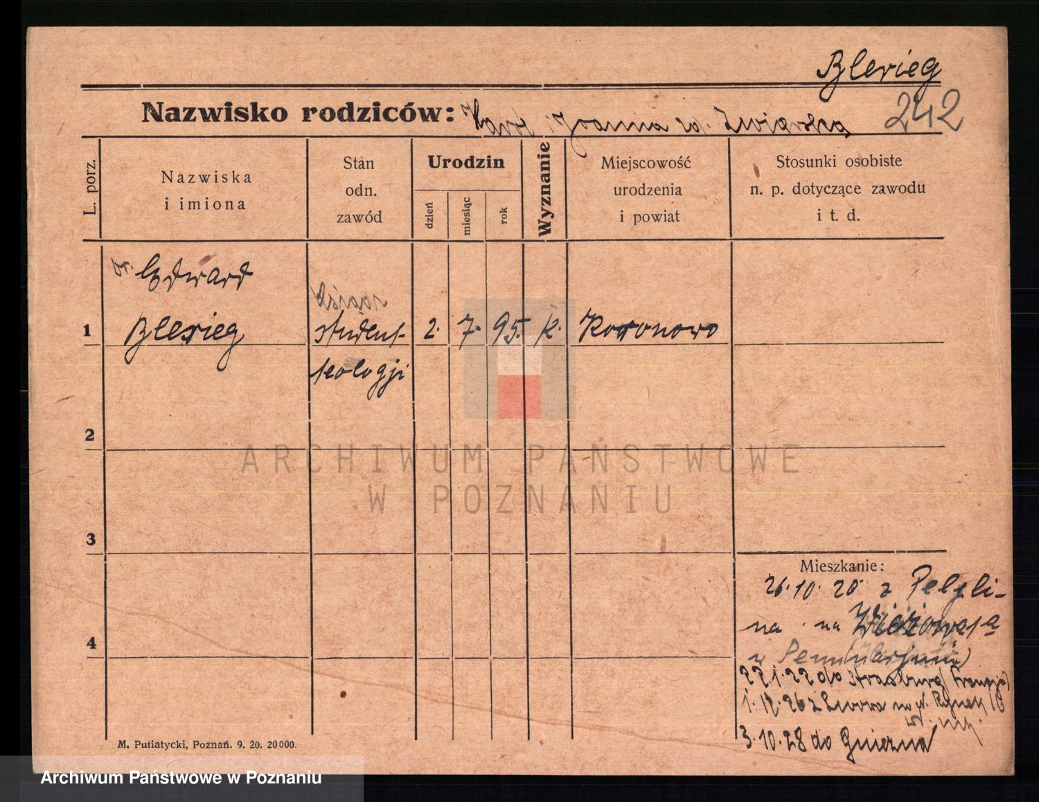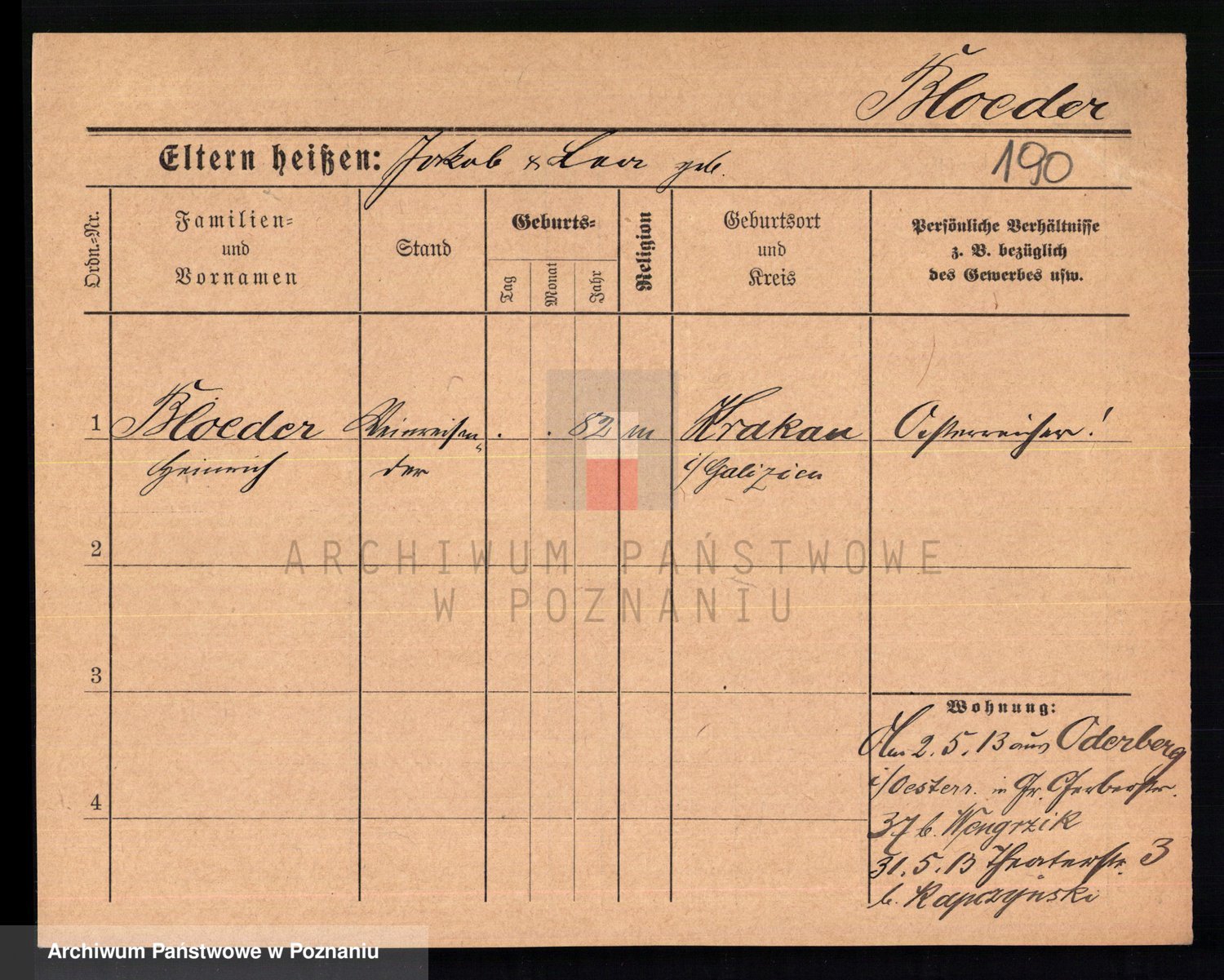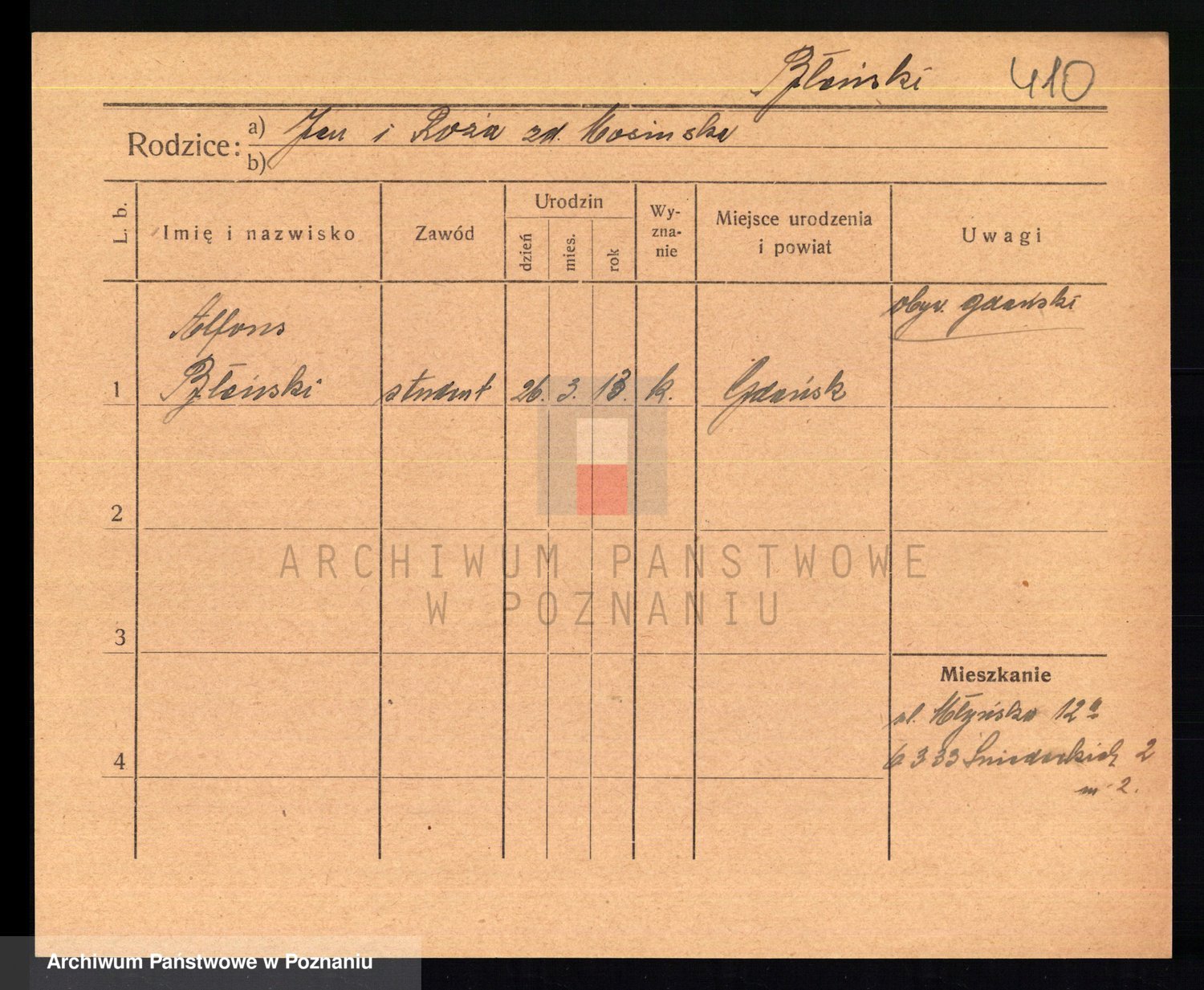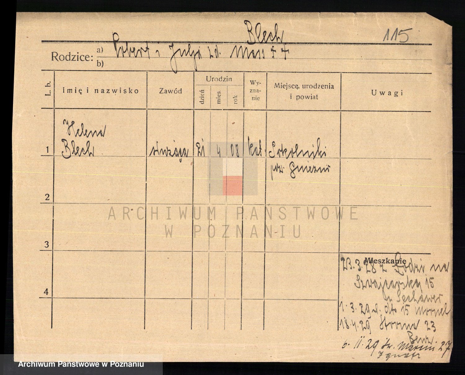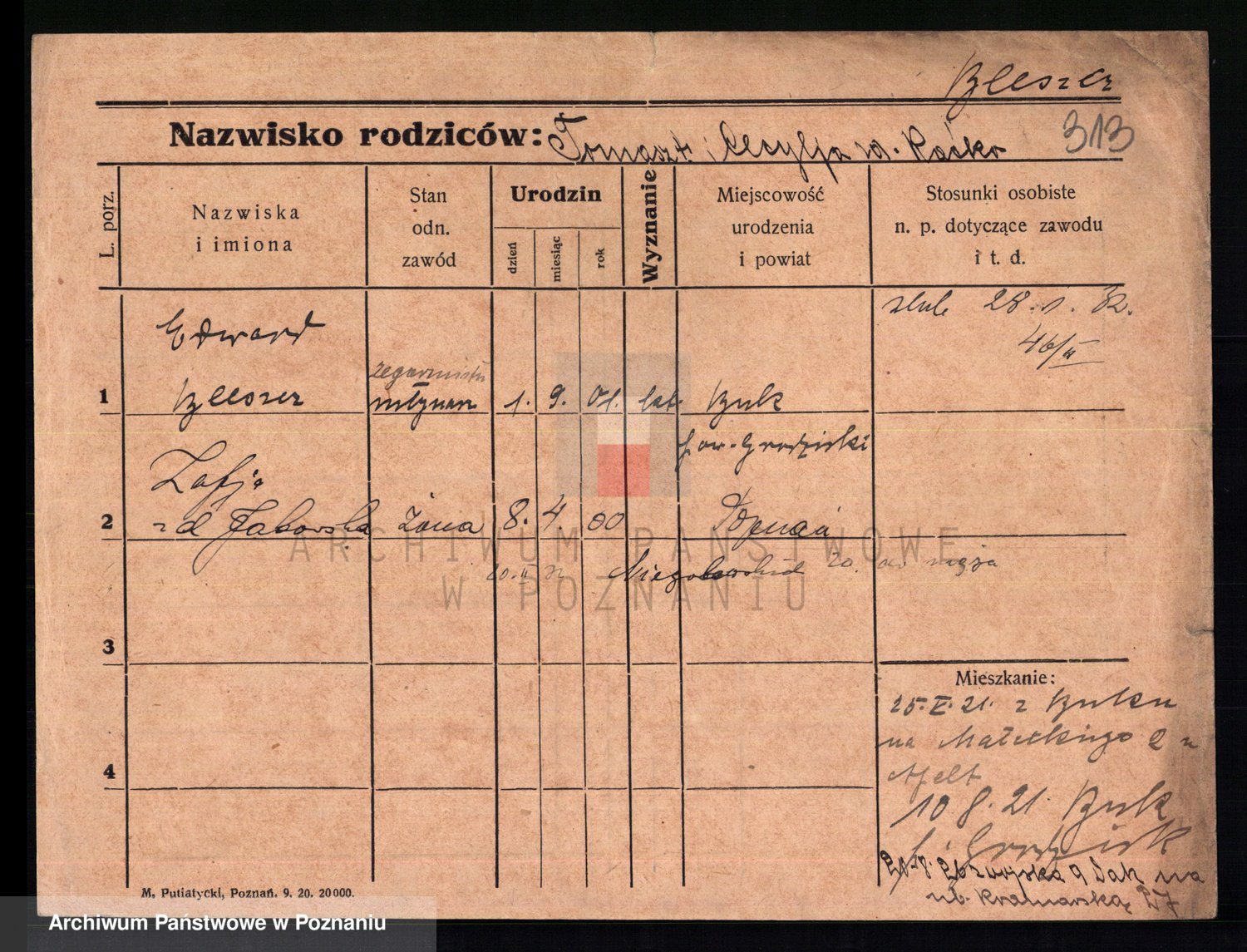 Podgląd karty osobowej dostępny jest po kliknięciu na nazwisko lub ikonkę karty. Można dokonywać powiększenia (ikony na górze) lub przechodzić między kolejnymi skanami (strzałki po bokach).