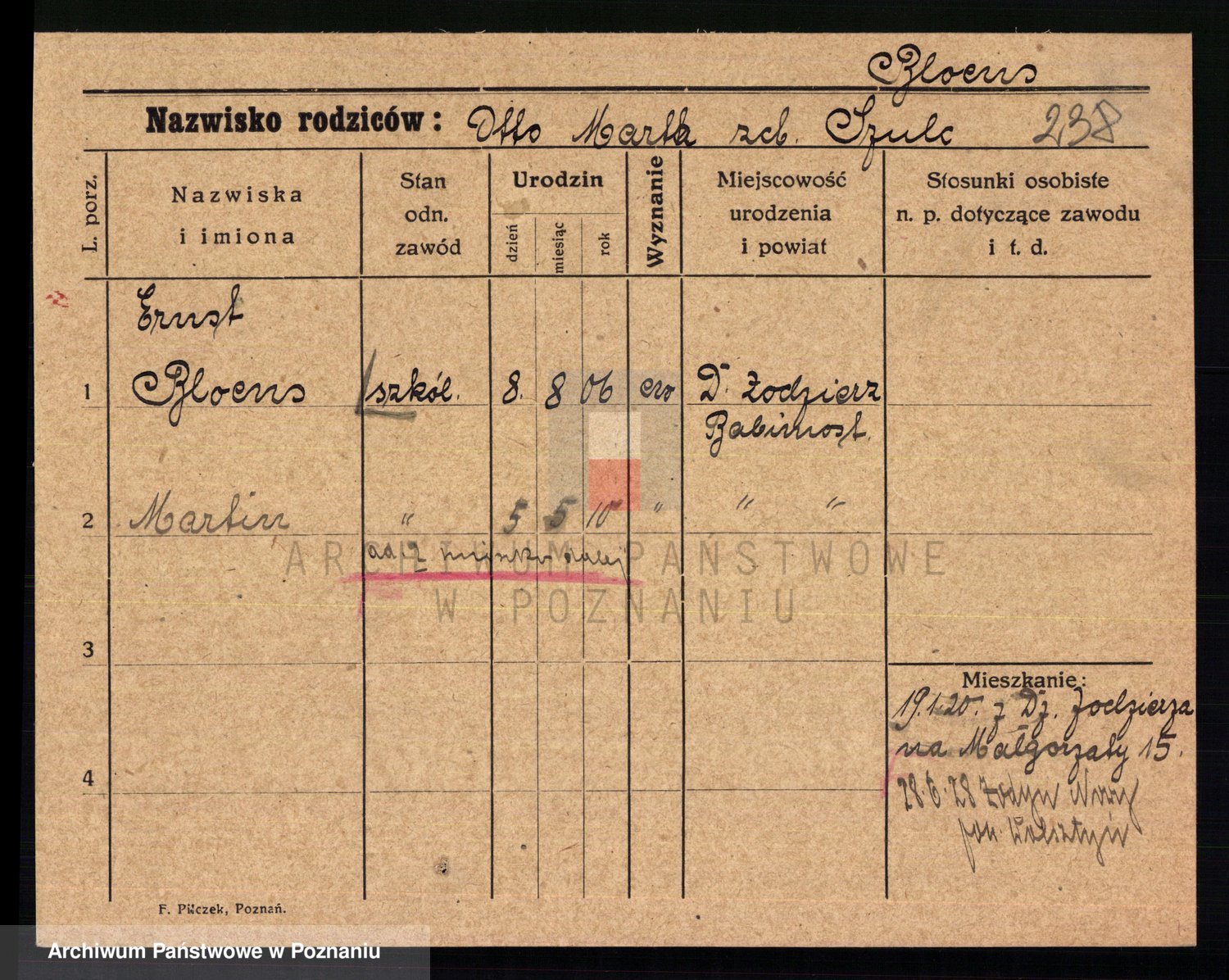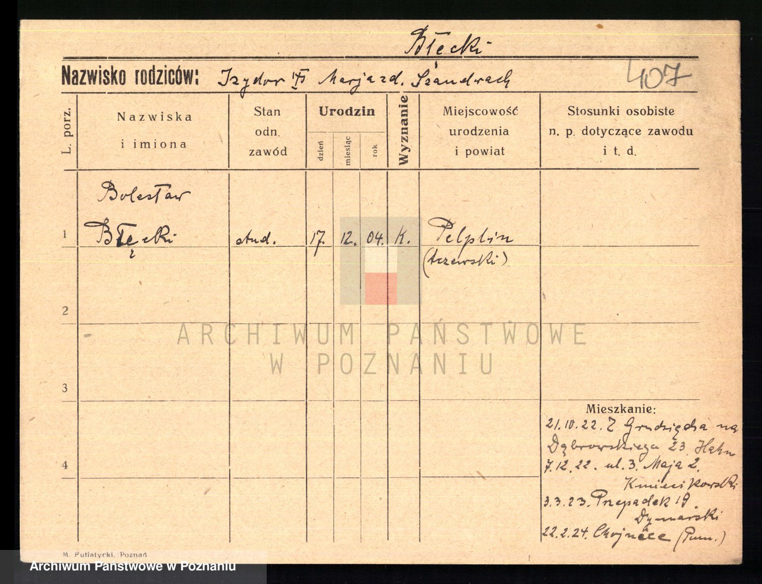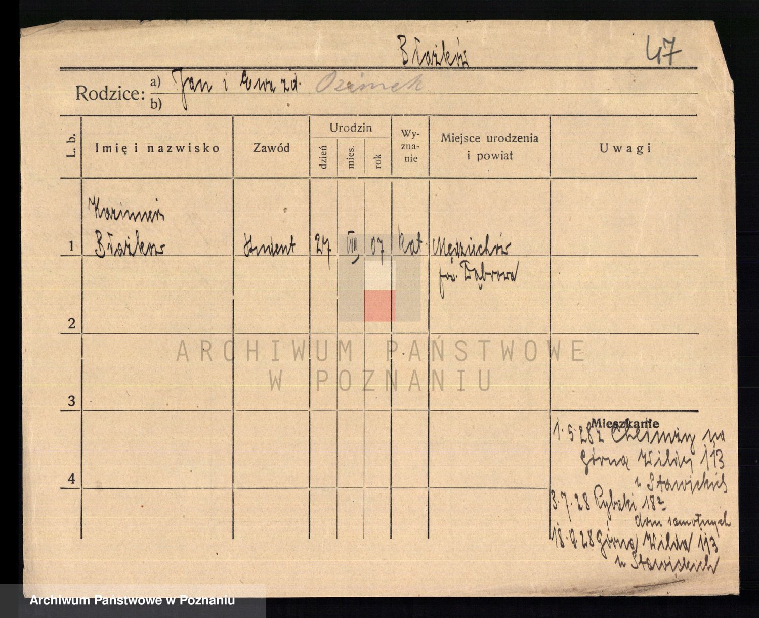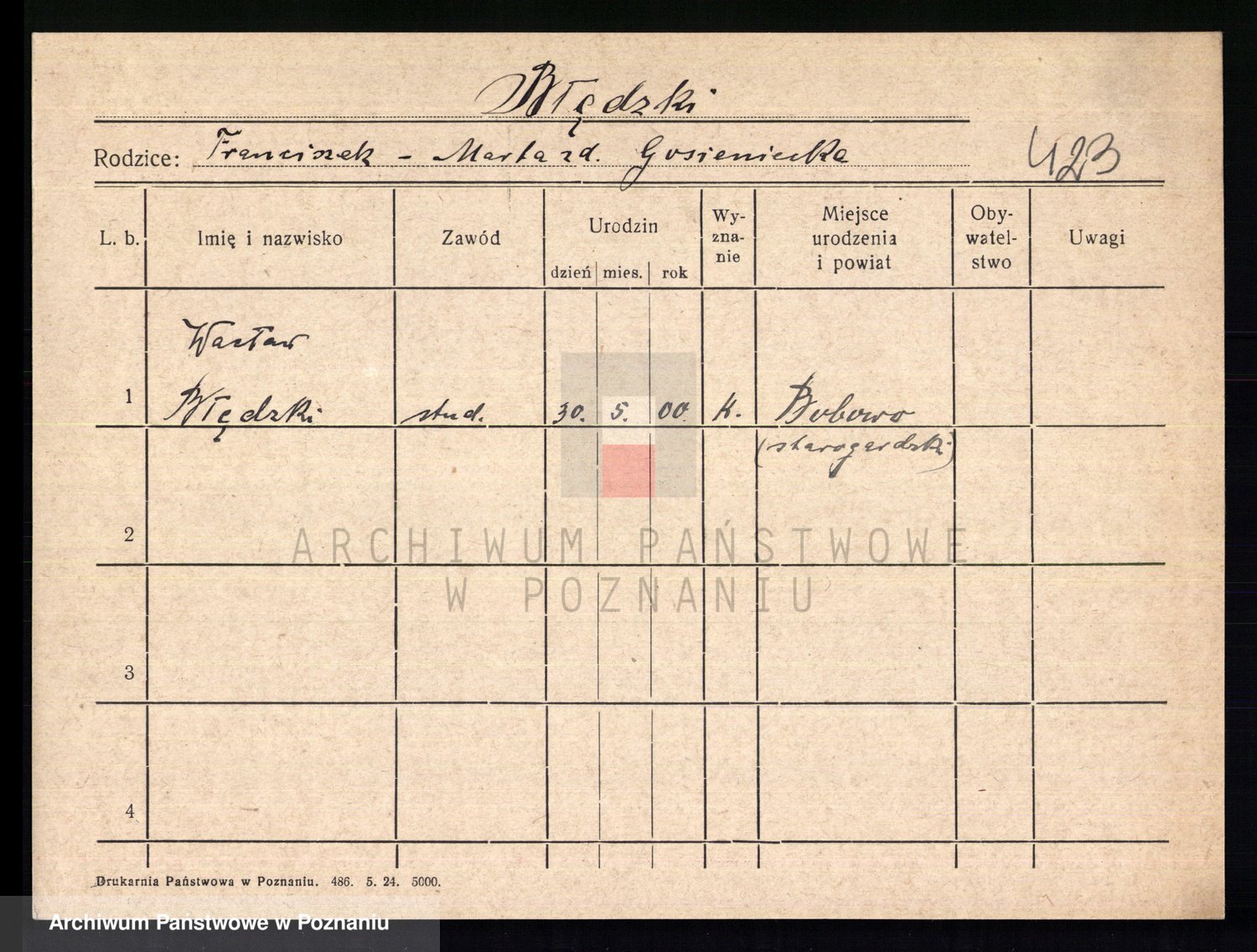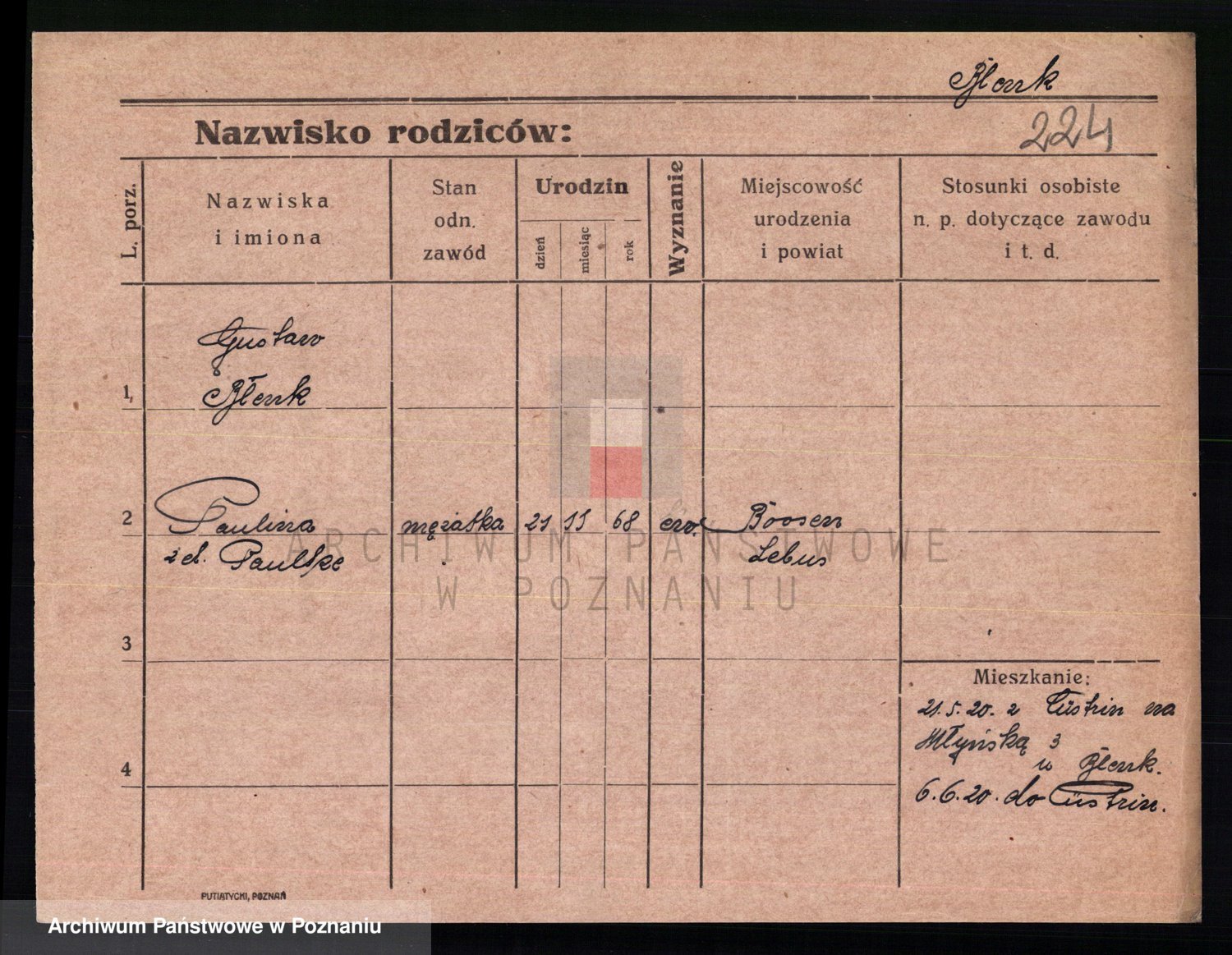 Podgląd karty osobowej dostępny jest po kliknięciu na nazwisko lub ikonkę karty. Można dokonywać powiększenia (ikony na górze) lub przechodzić między kolejnymi skanami (strzałki po bokach).