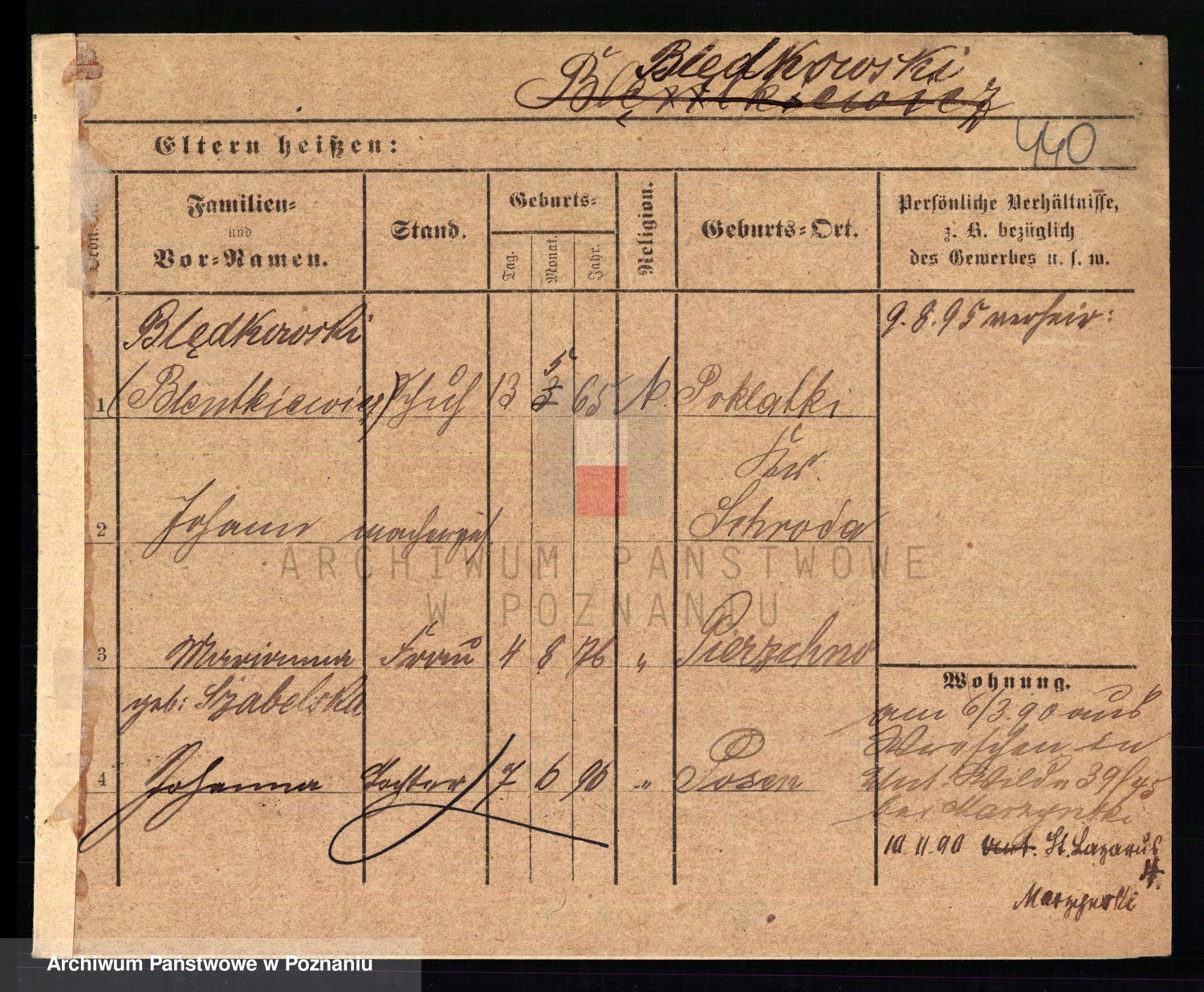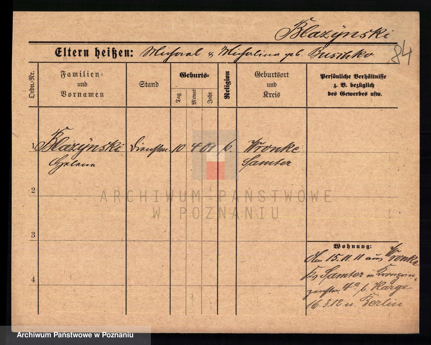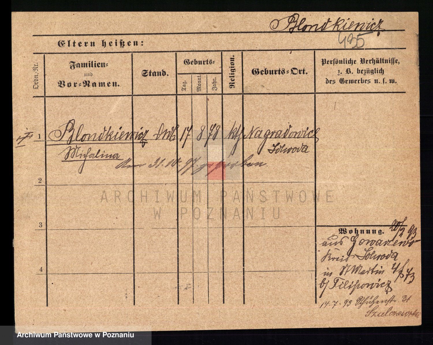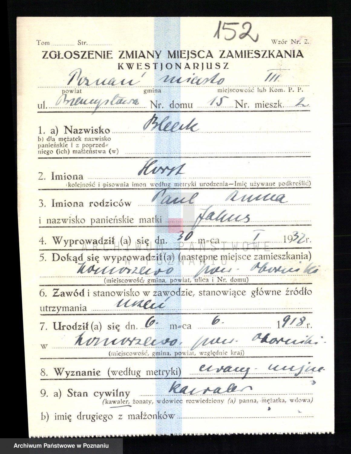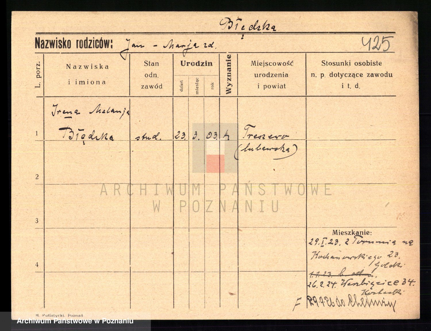 Podgląd karty osobowej dostępny jest po kliknięciu na nazwisko lub ikonkę karty. Można dokonywać powiększenia (ikony na górze) lub przechodzić między kolejnymi skanami (strzałki po bokach).