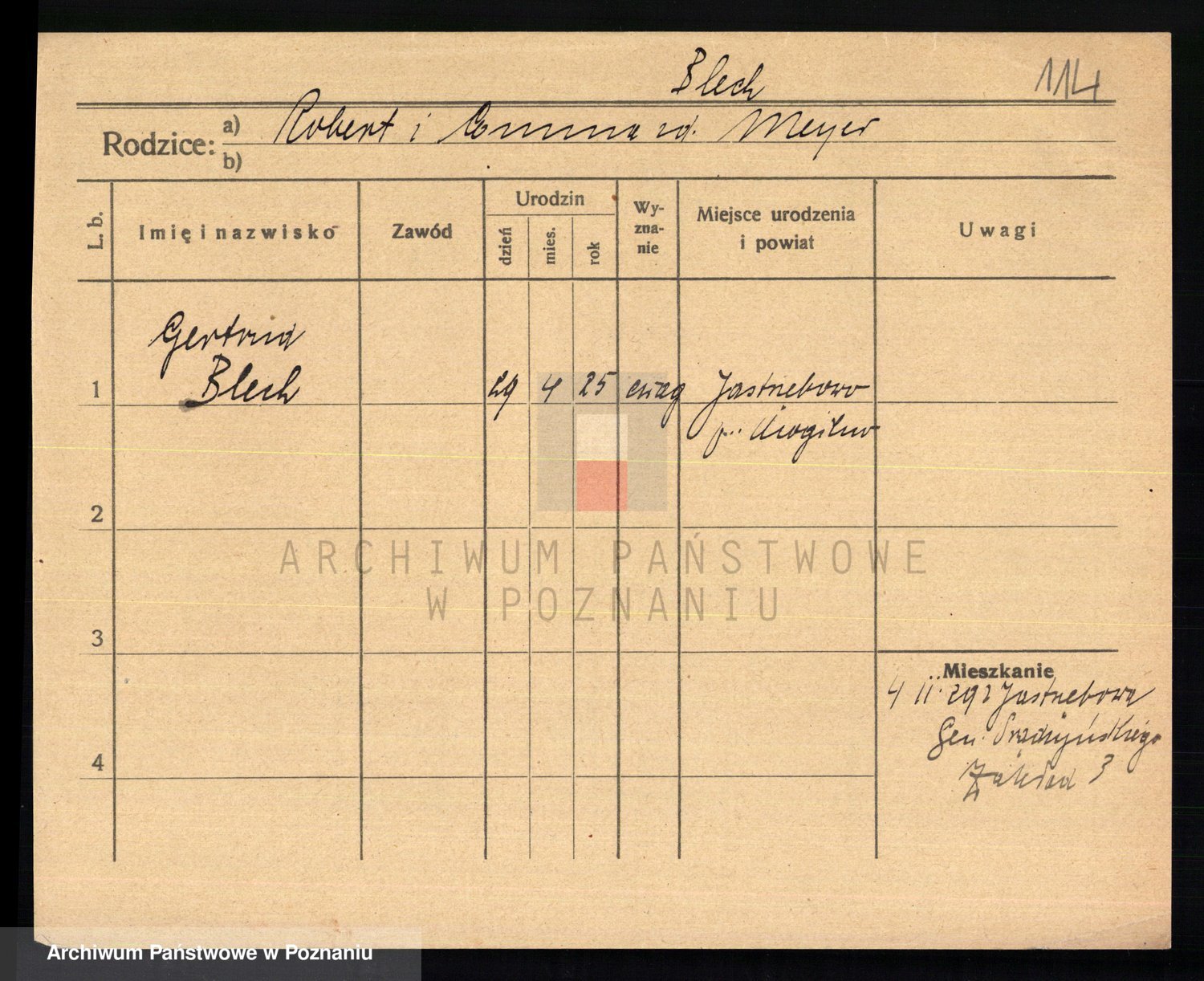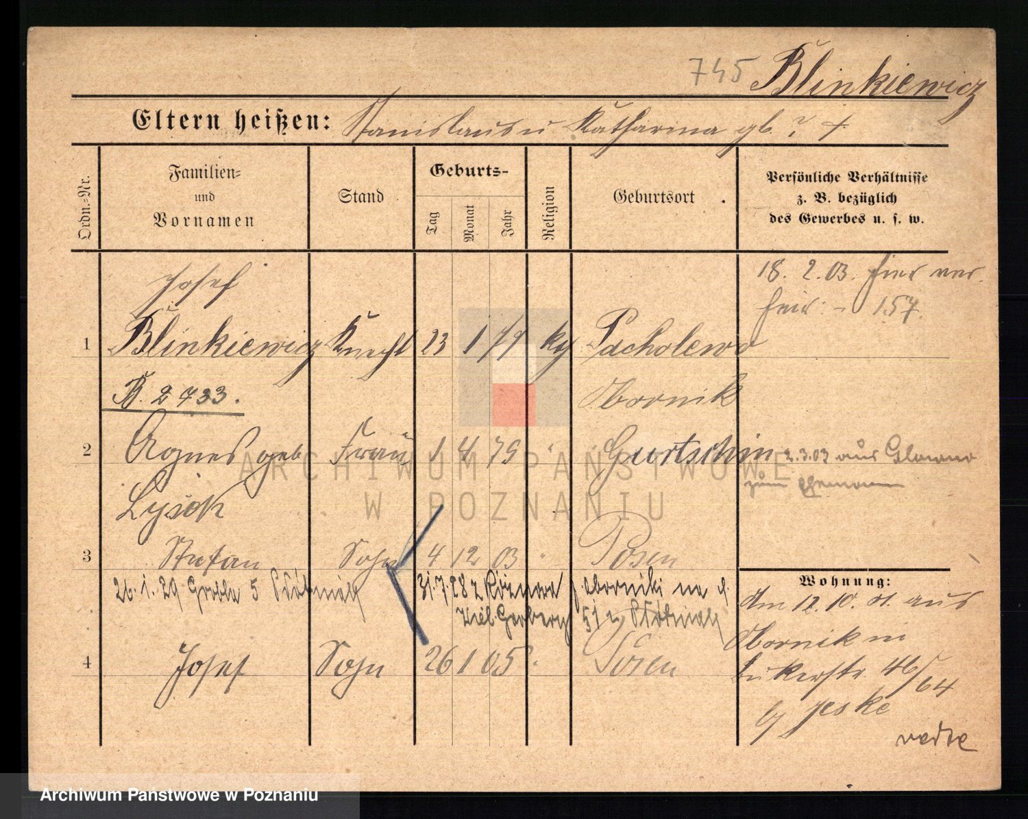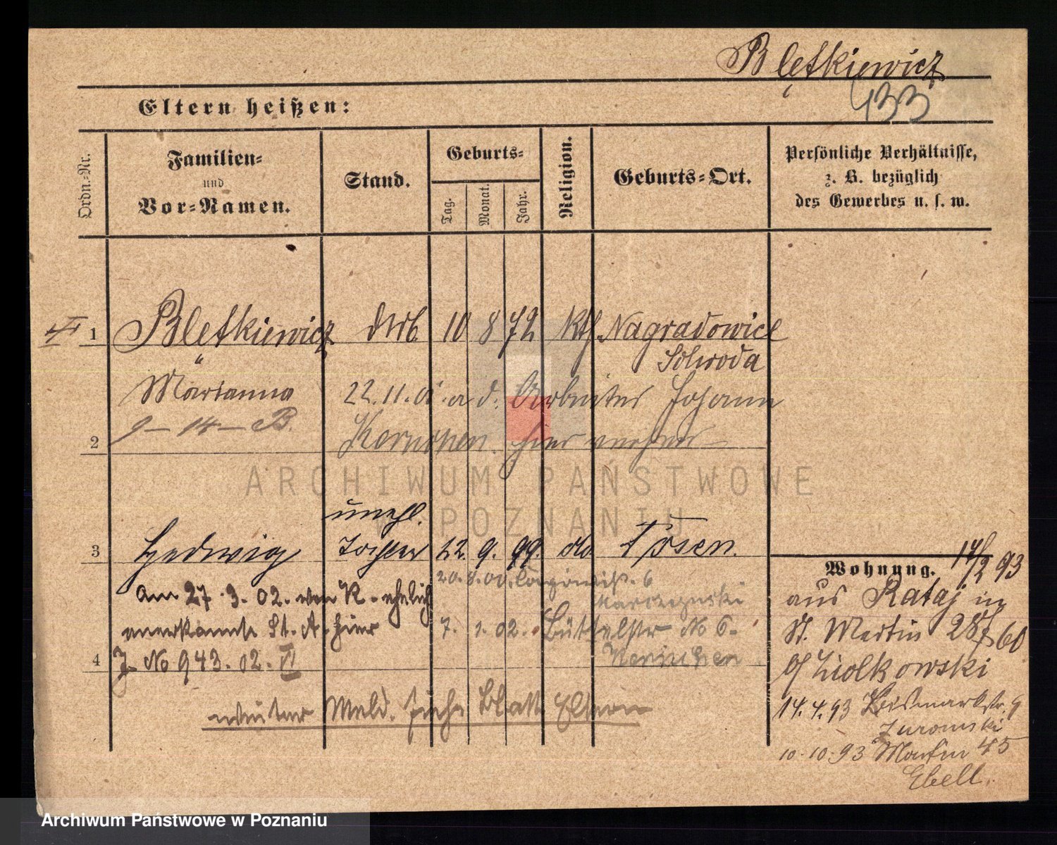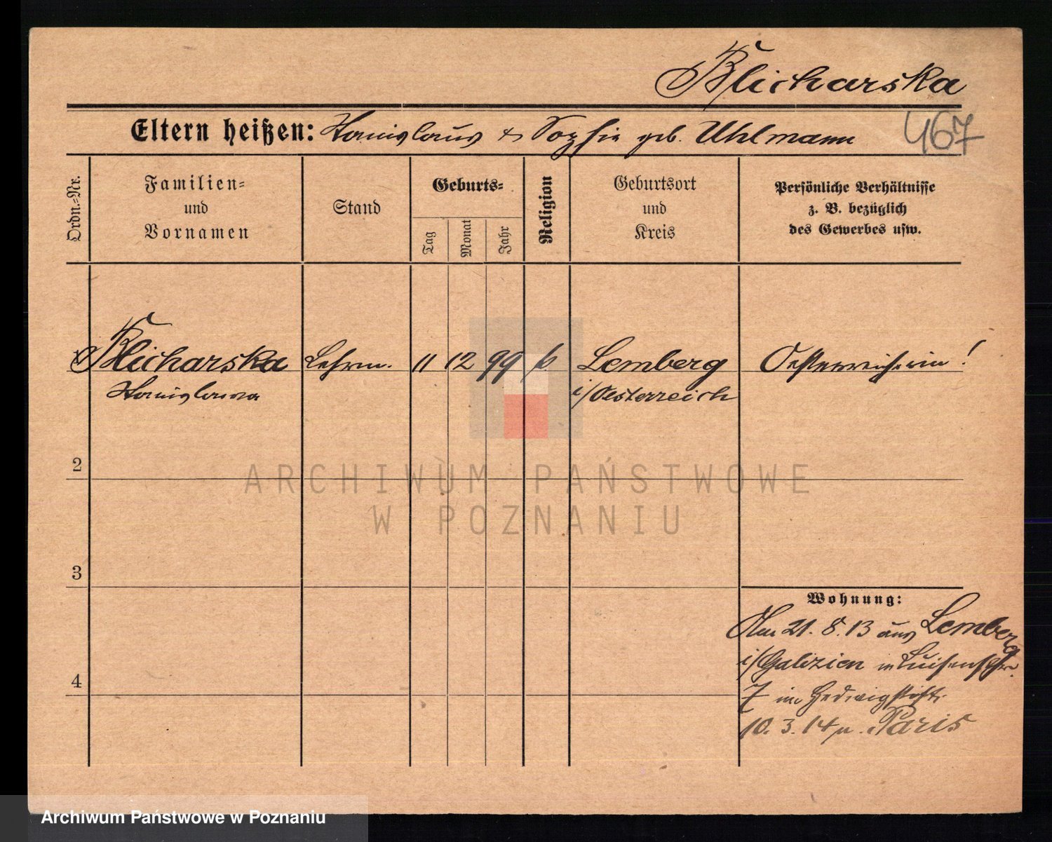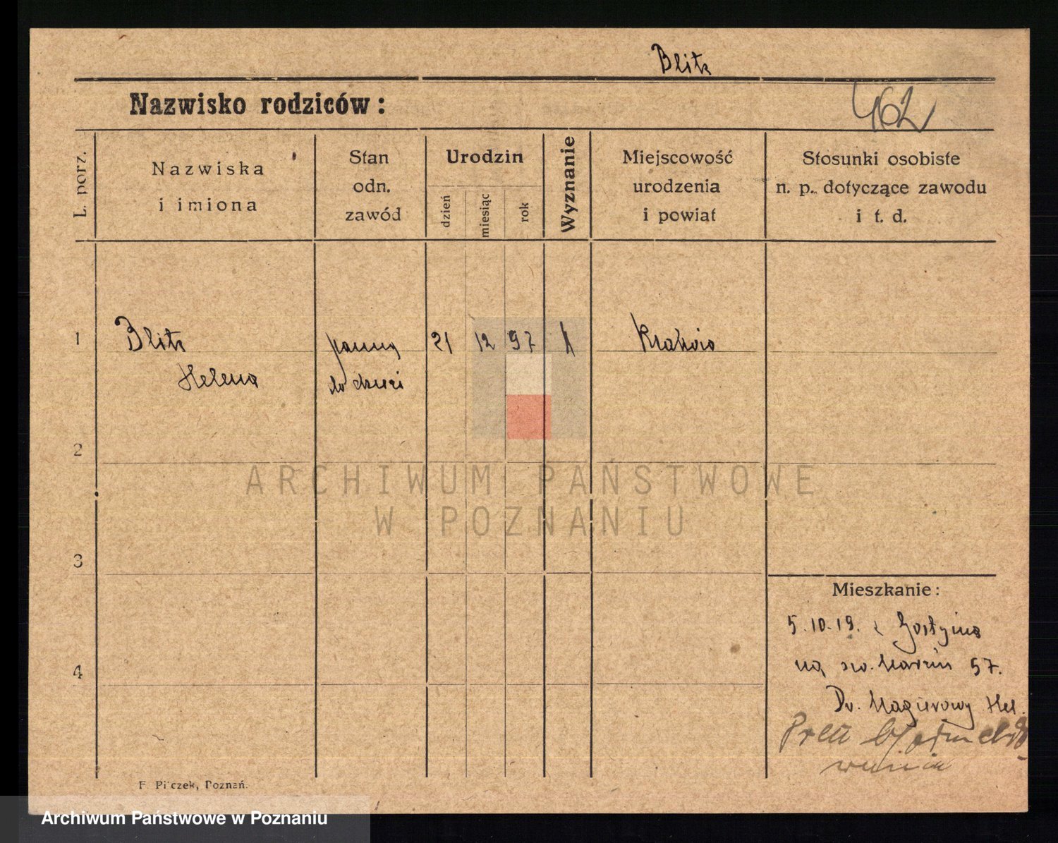 Podgląd karty osobowej dostępny jest po kliknięciu na nazwisko lub ikonkę karty. Można dokonywać powiększenia (ikony na górze) lub przechodzić między kolejnymi skanami (strzałki po bokach).