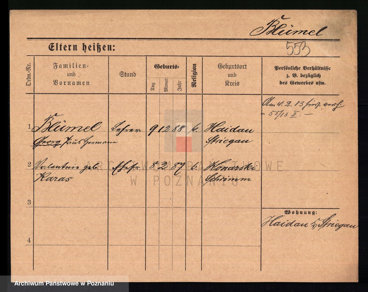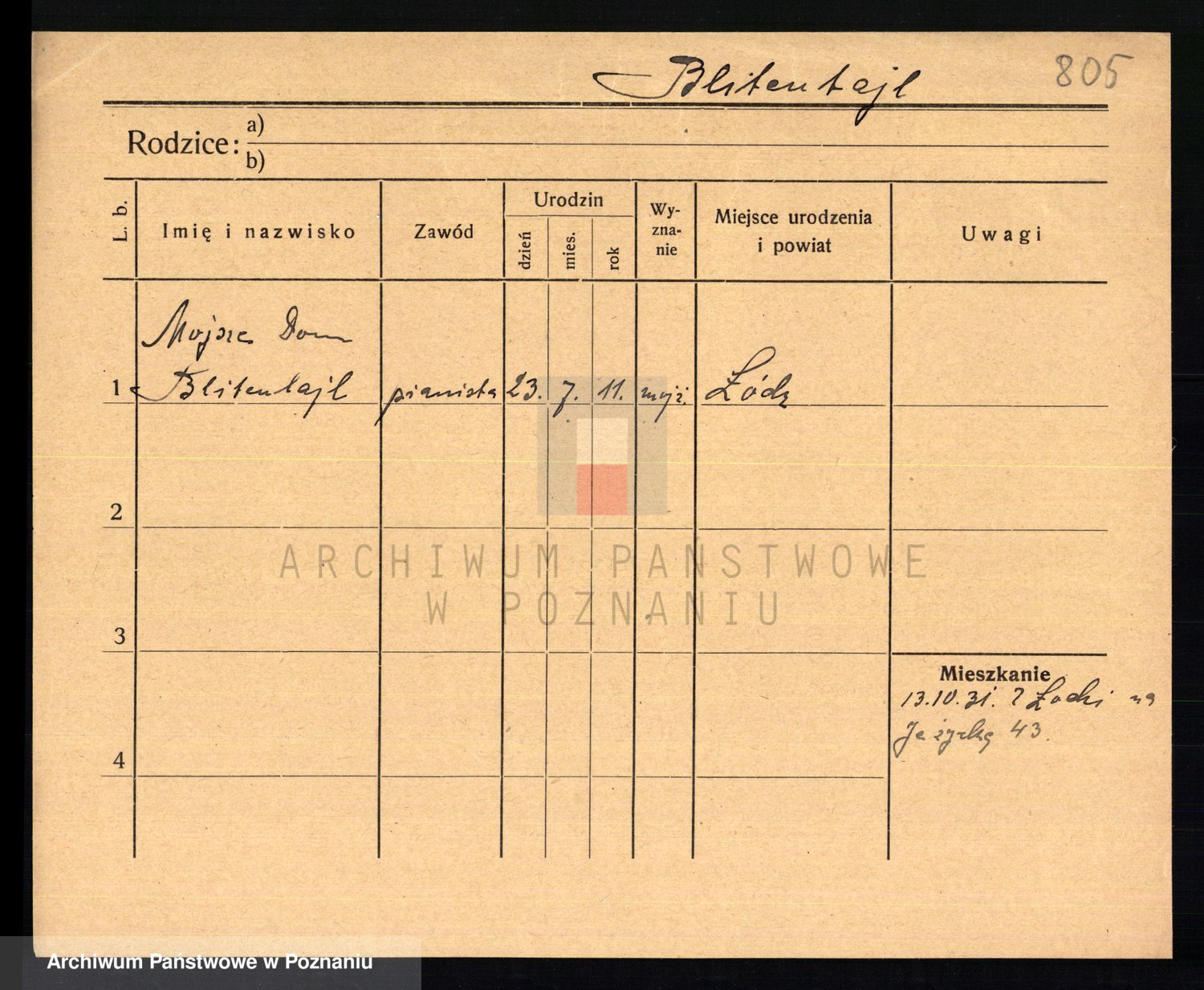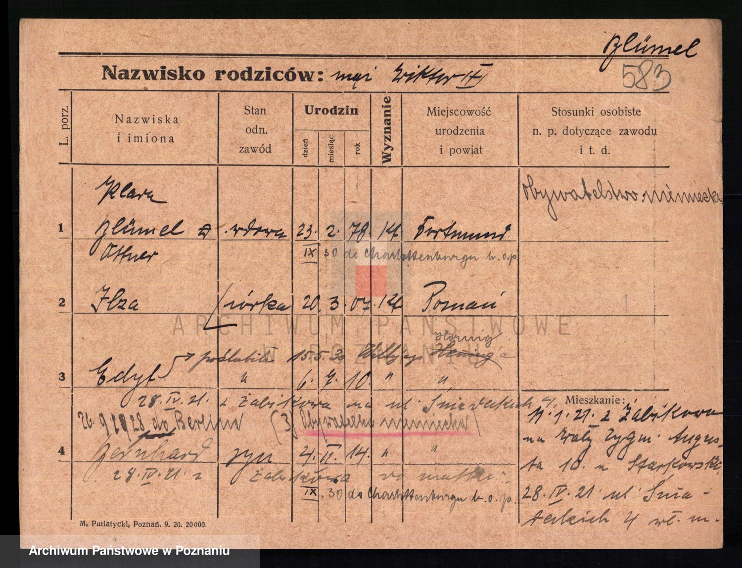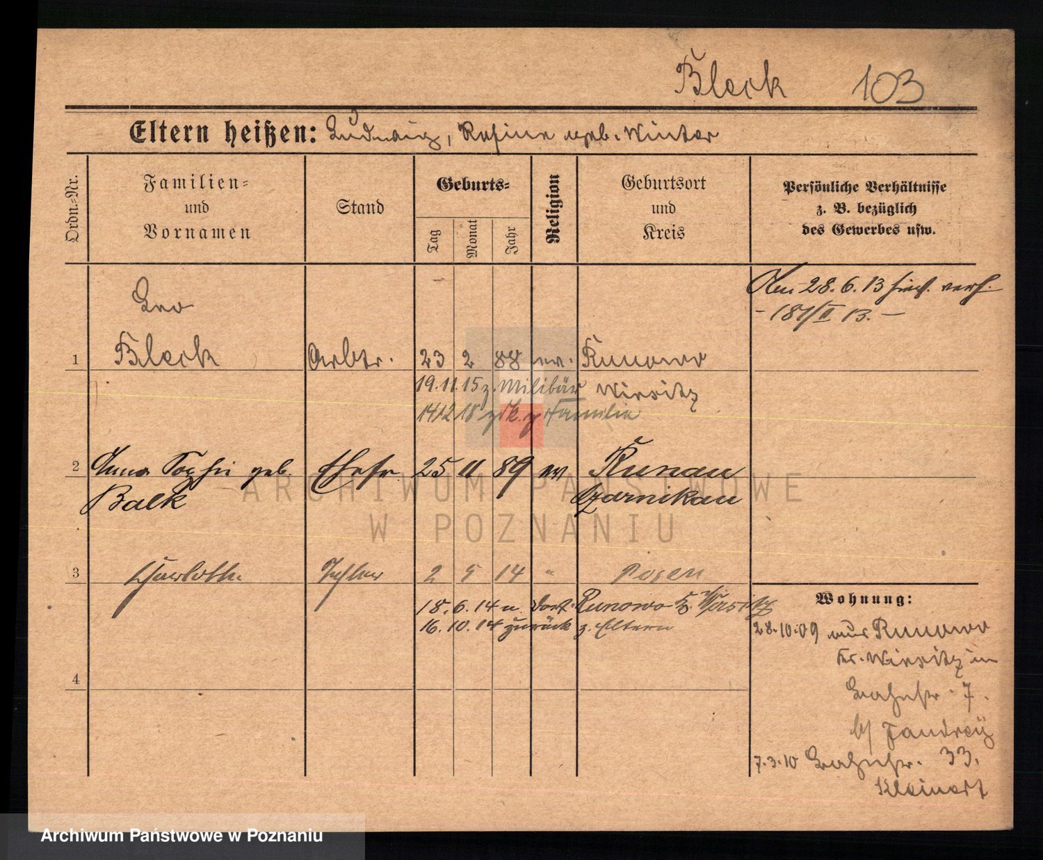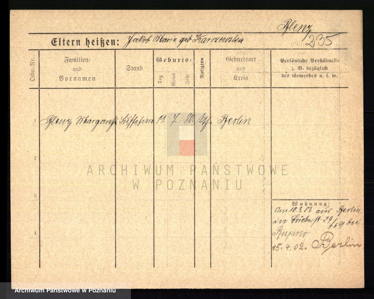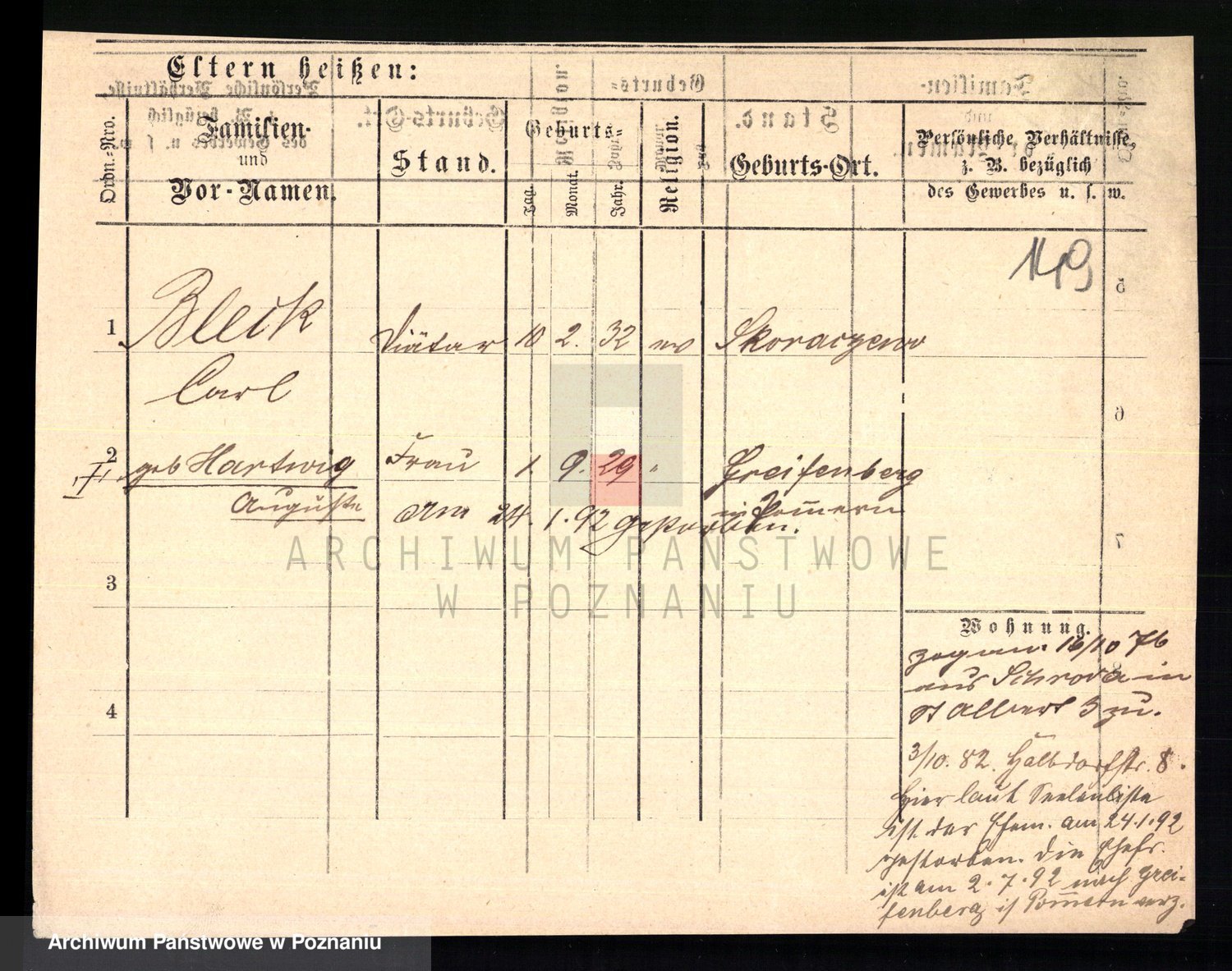 Podgląd karty osobowej dostępny jest po kliknięciu na nazwisko lub ikonkę karty. Można dokonywać powiększenia (ikony na górze) lub przechodzić między kolejnymi skanami (strzałki po bokach).