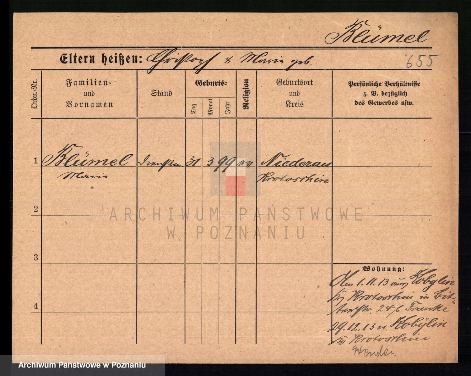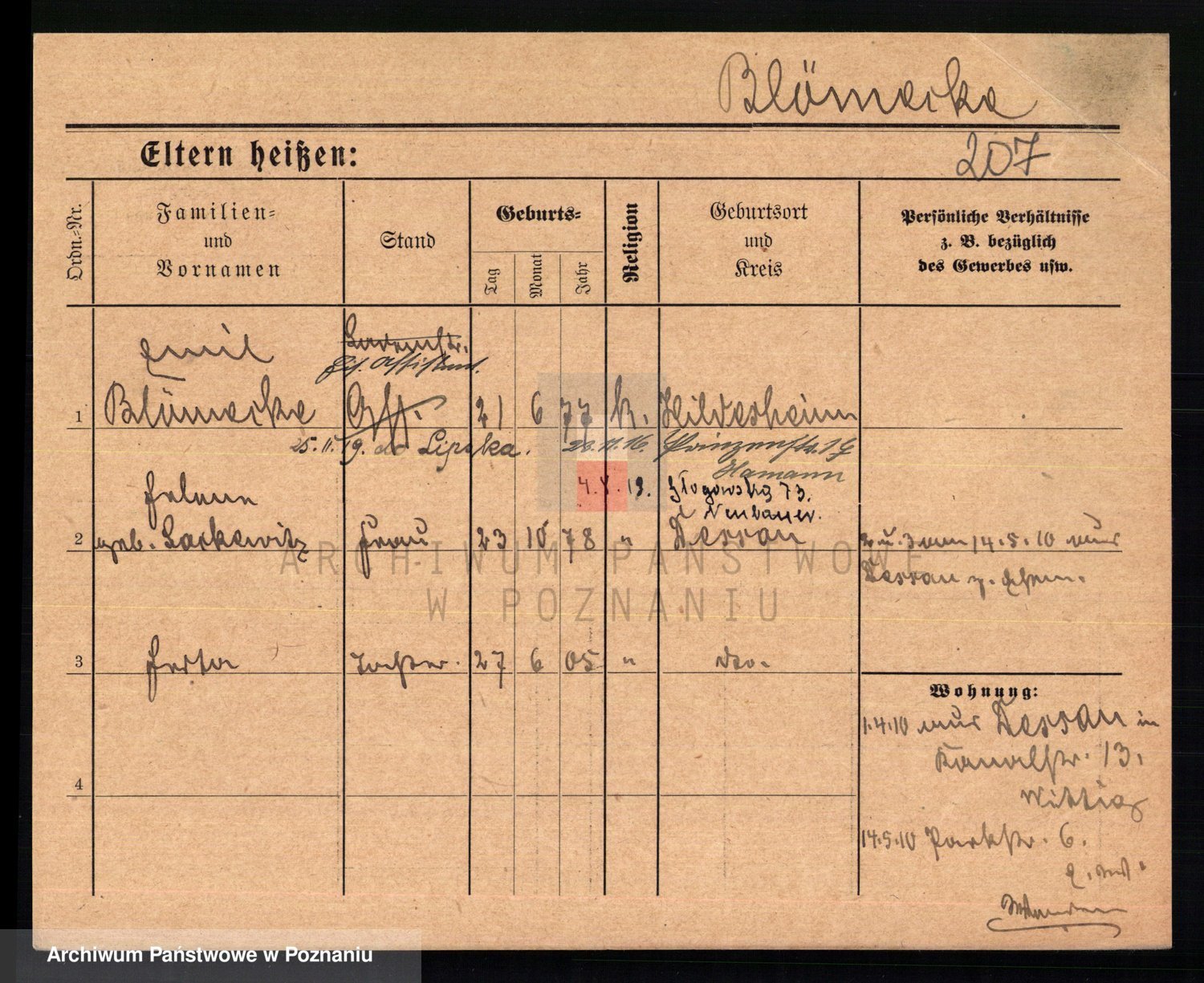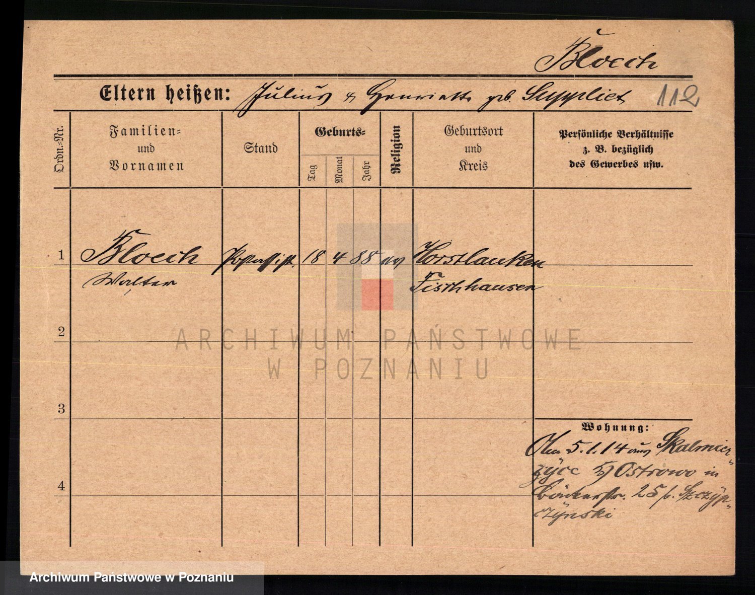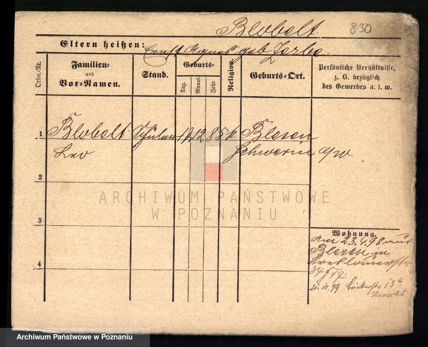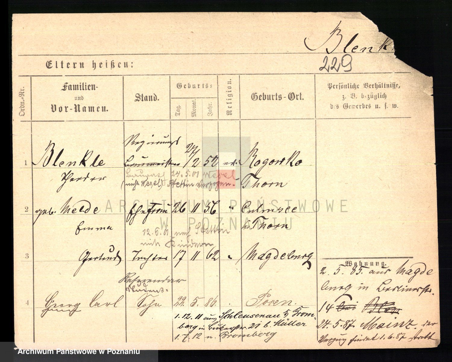 Podgląd karty osobowej dostępny jest po kliknięciu na nazwisko lub ikonkę karty. Można dokonywać powiększenia (ikony na górze) lub przechodzić między kolejnymi skanami (strzałki po bokach).