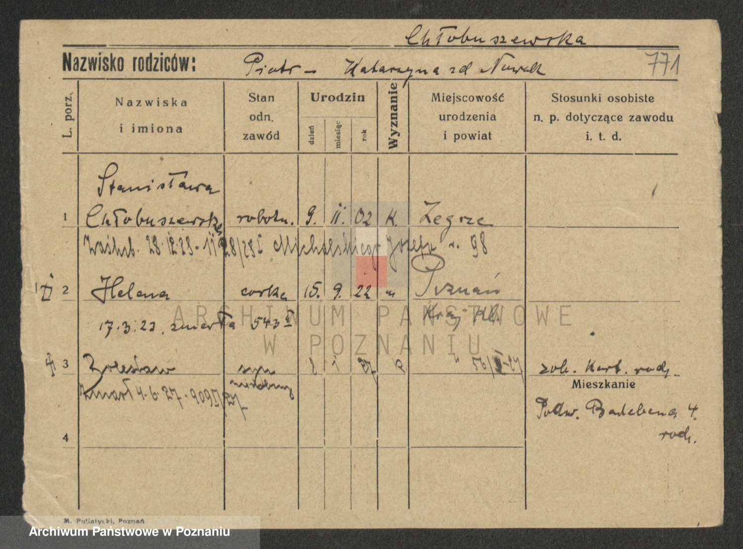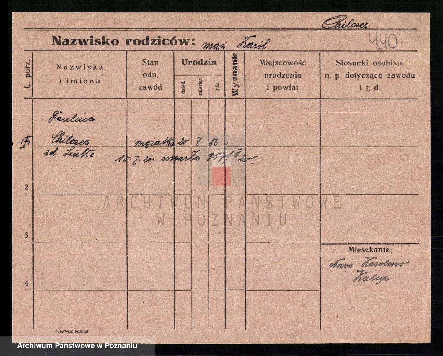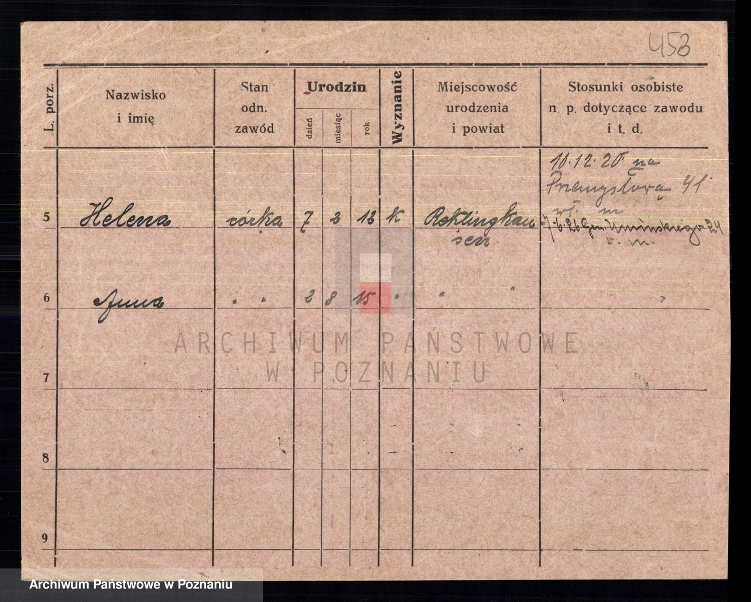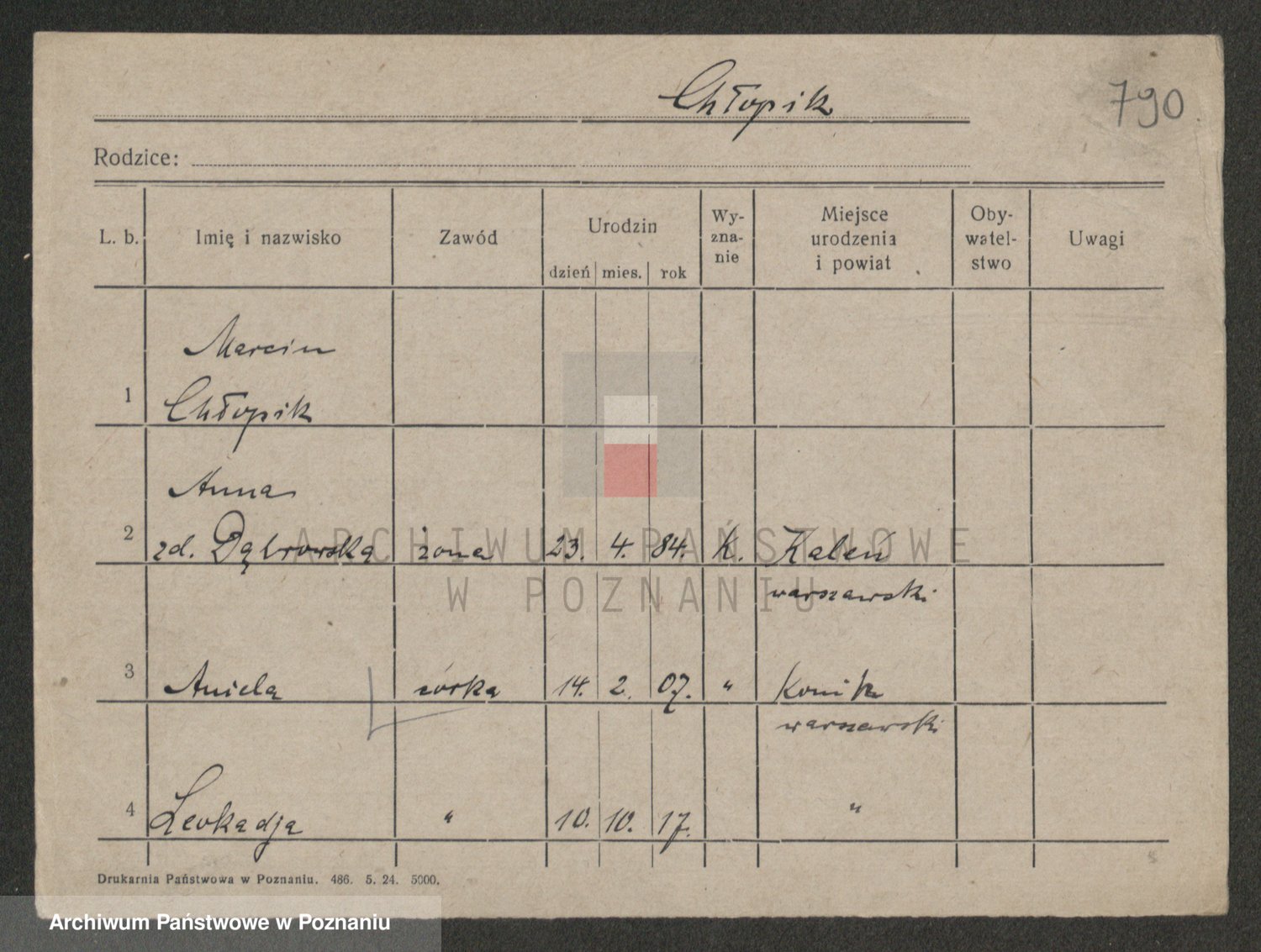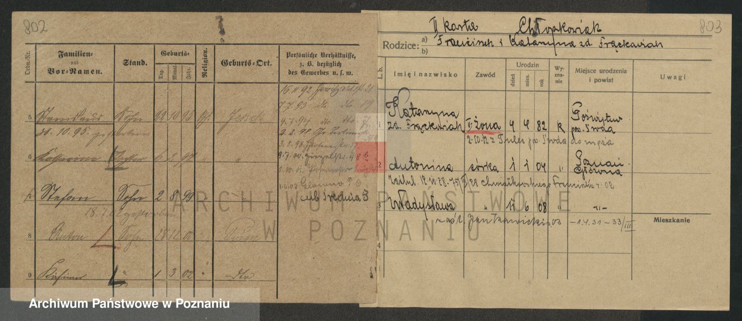 Podgląd karty osobowej dostępny jest po kliknięciu na nazwisko lub ikonkę karty. Można dokonywać powiększenia (ikony na górze) lub przechodzić między kolejnymi skanami (strzałki po bokach).