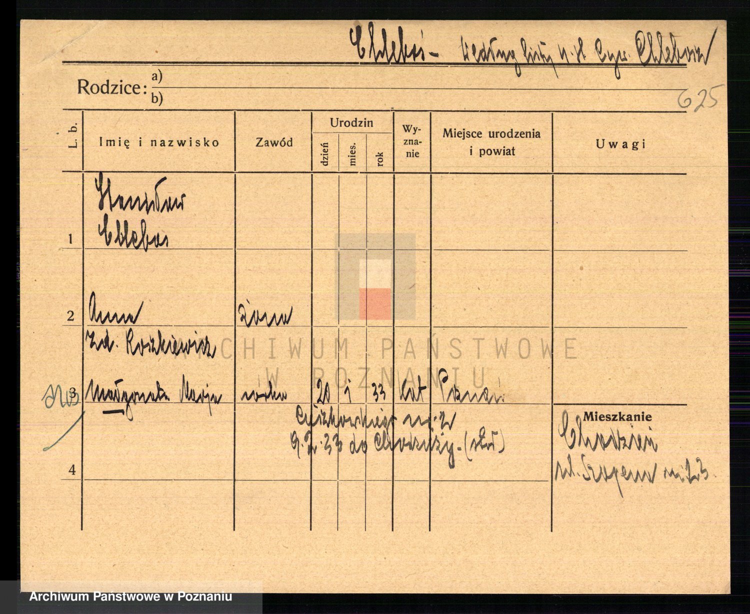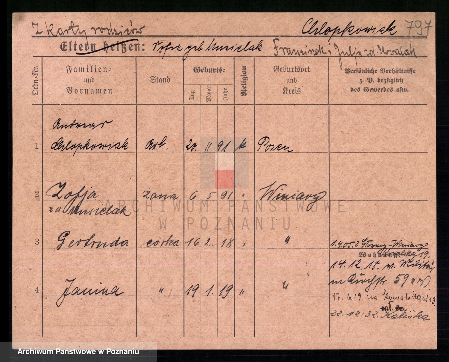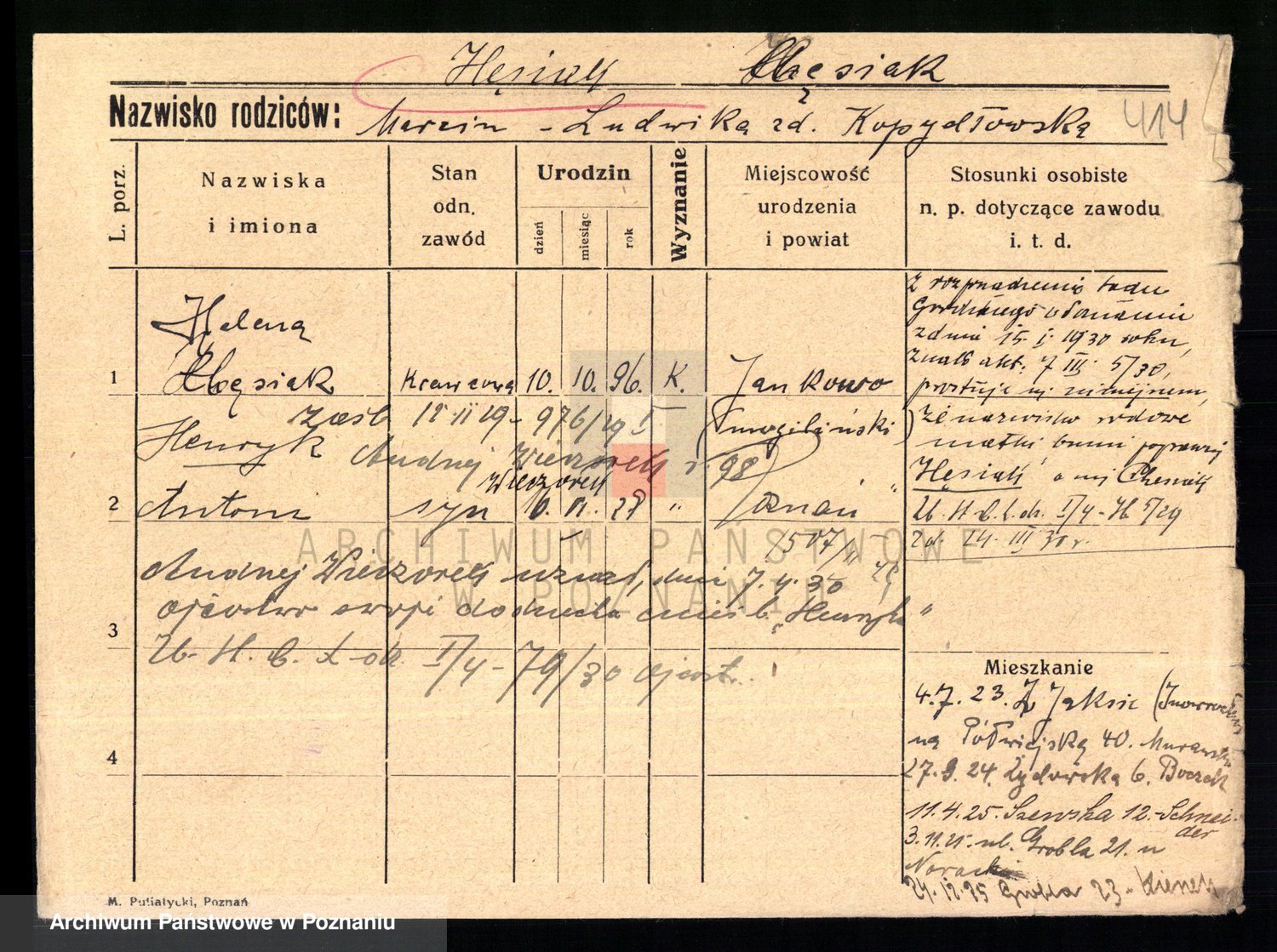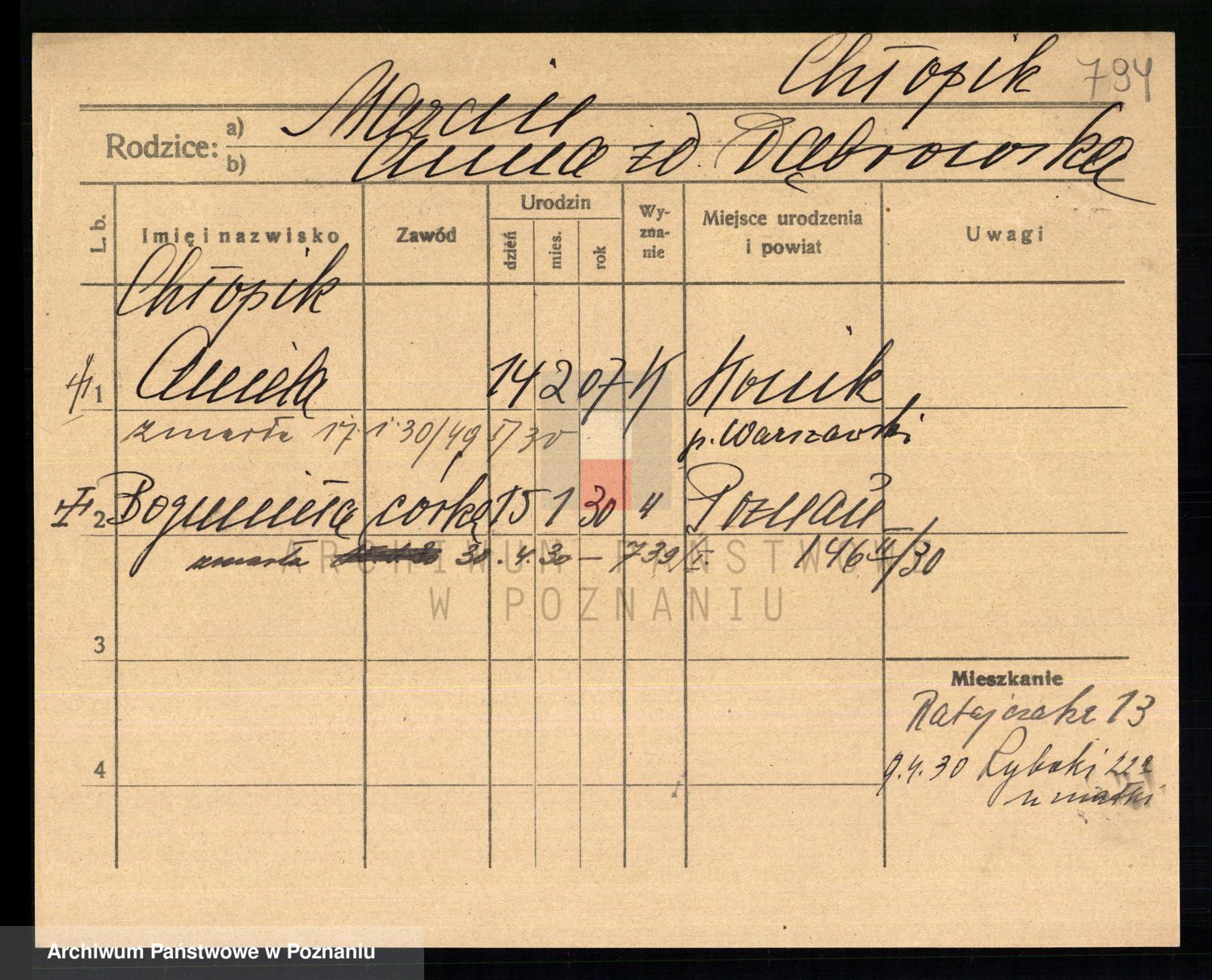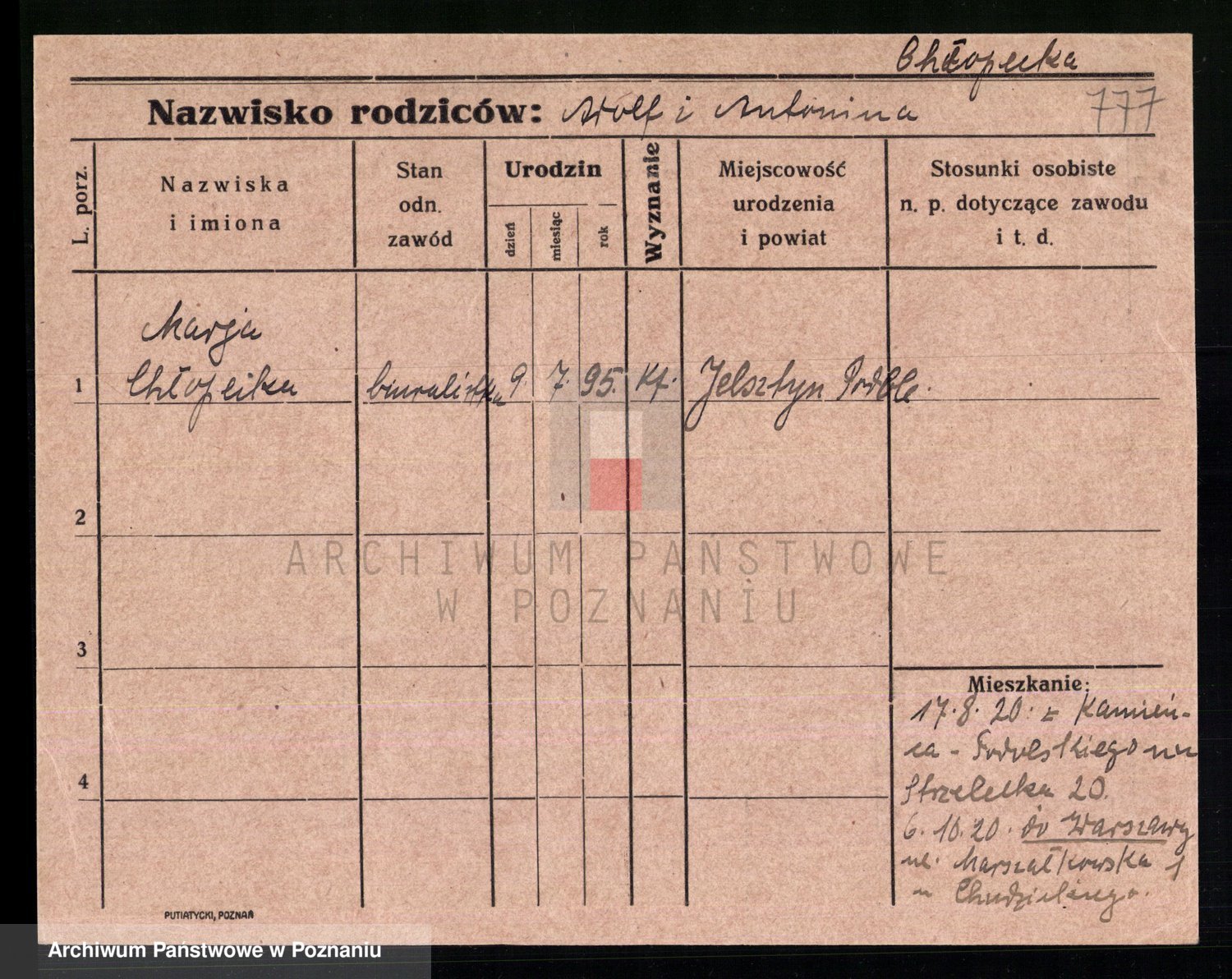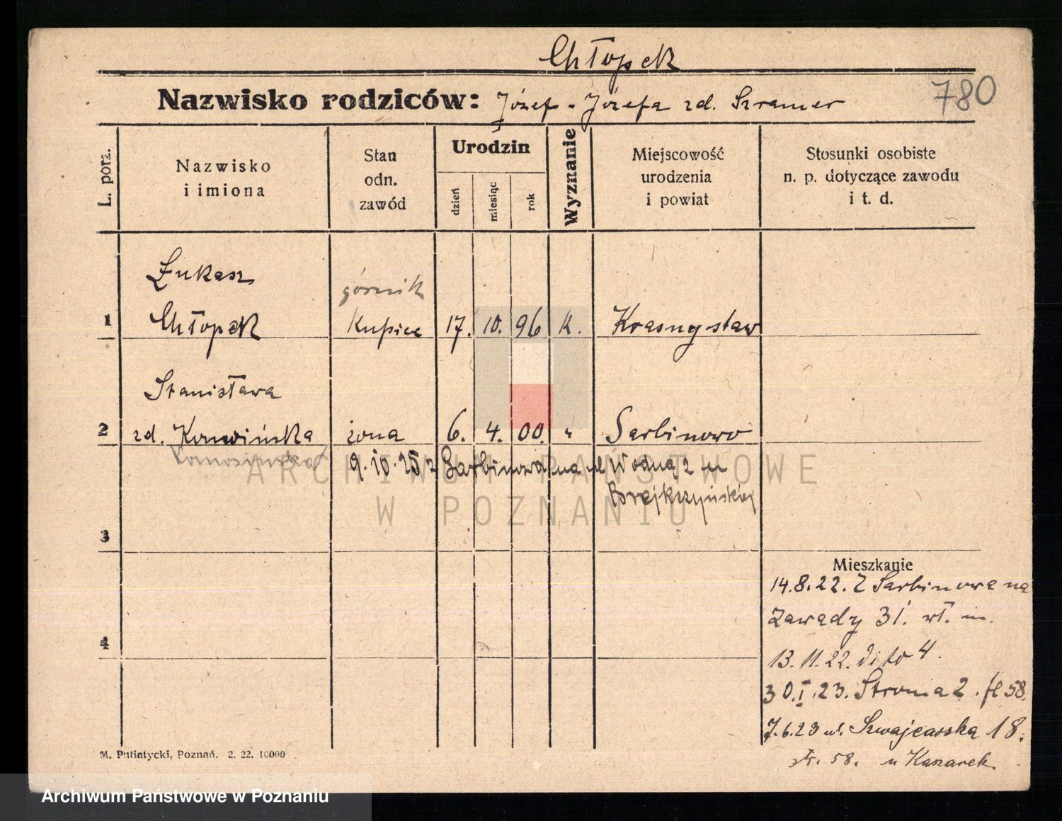 Podgląd karty osobowej dostępny jest po kliknięciu na nazwisko lub ikonkę karty. Można dokonywać powiększenia (ikony na górze) lub przechodzić między kolejnymi skanami (strzałki po bokach).