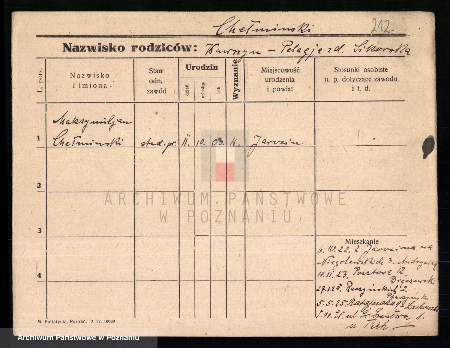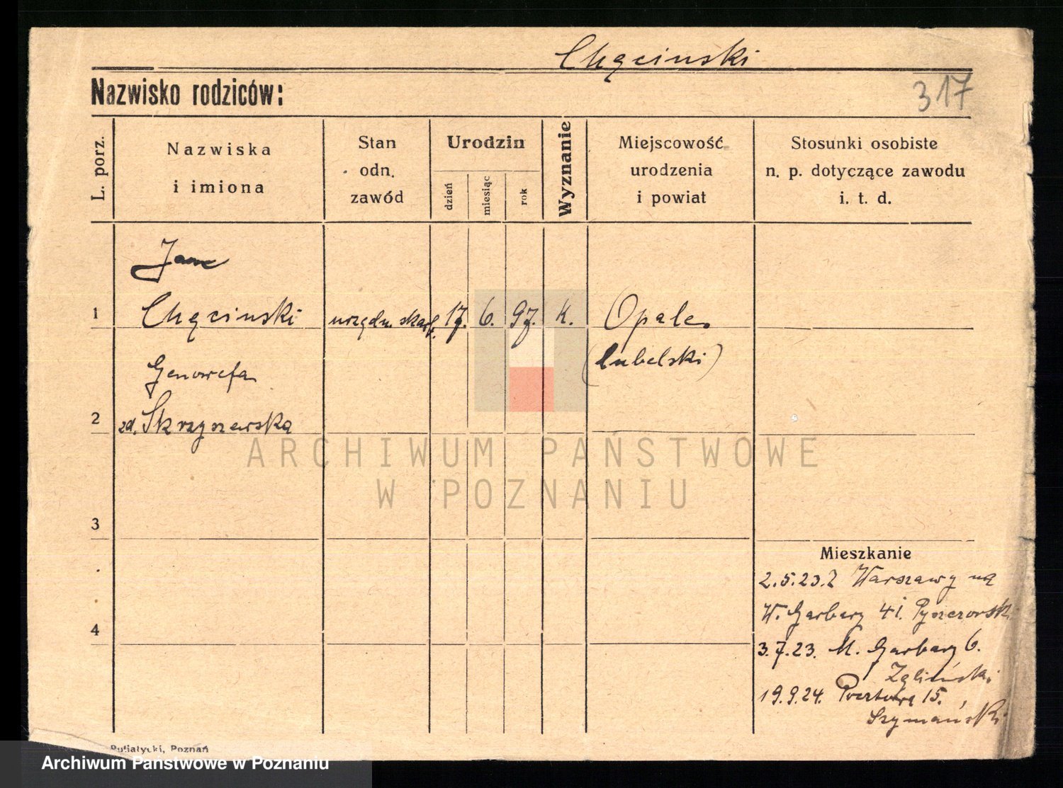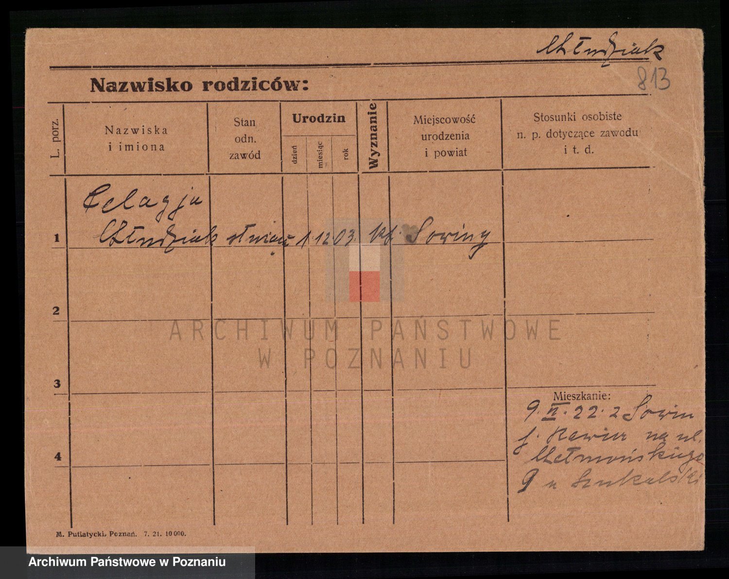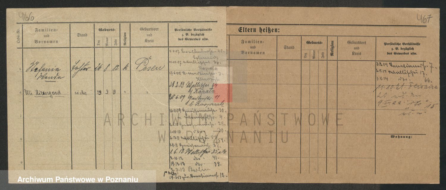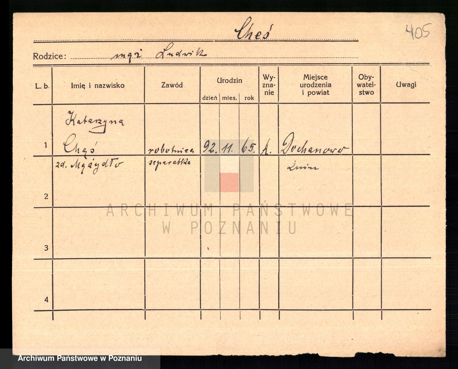 Podgląd karty osobowej dostępny jest po kliknięciu na nazwisko lub ikonkę karty. Można dokonywać powiększenia (ikony na górze) lub przechodzić między kolejnymi skanami (strzałki po bokach).