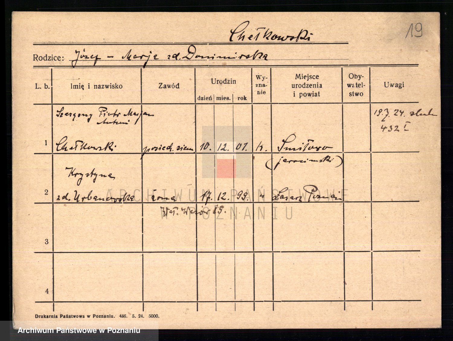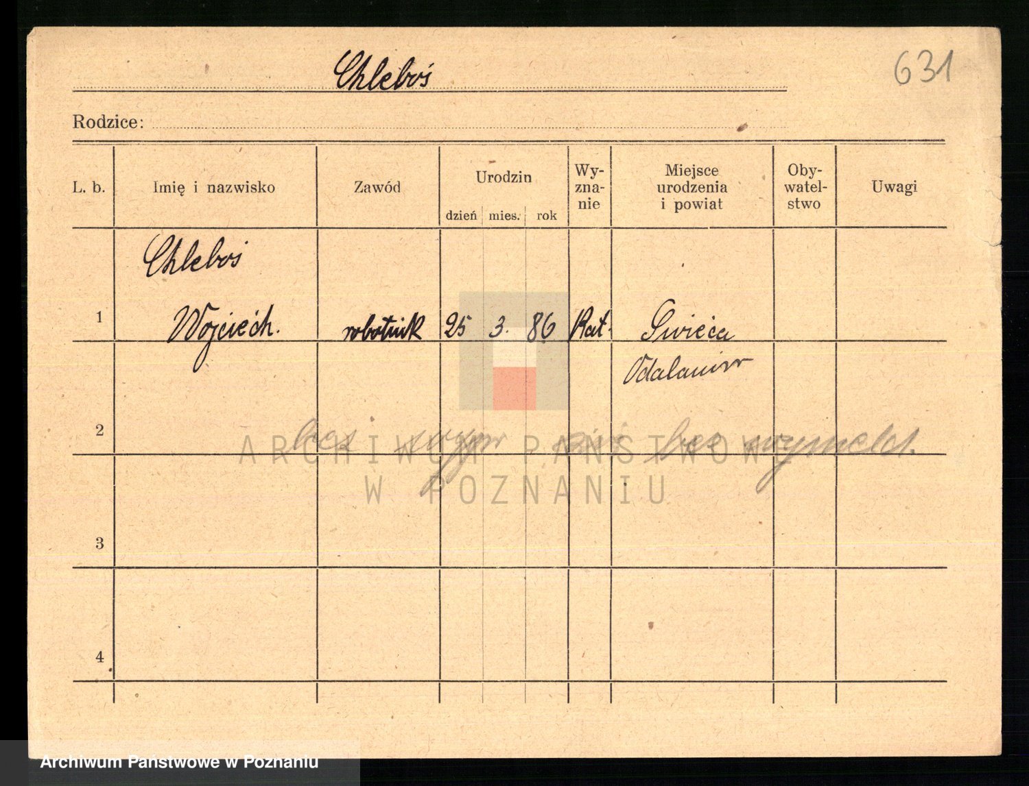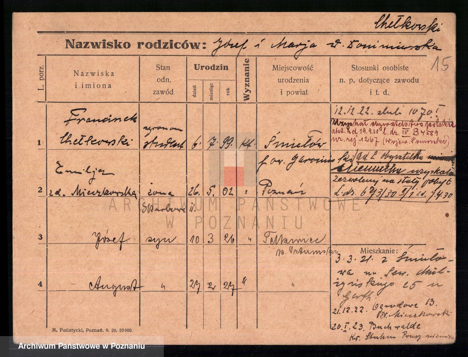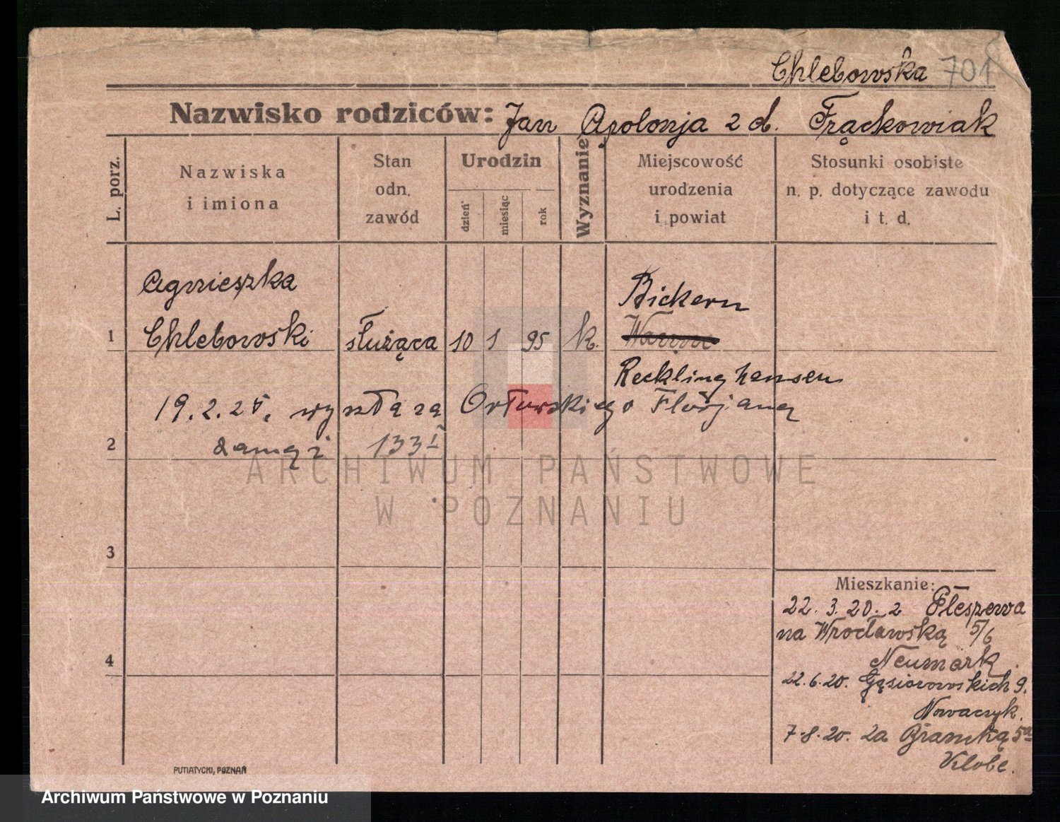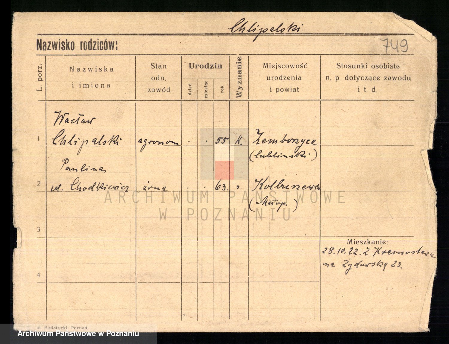 Podgląd karty osobowej dostępny jest po kliknięciu na nazwisko lub ikonkę karty. Można dokonywać powiększenia (ikony na górze) lub przechodzić między kolejnymi skanami (strzałki po bokach).