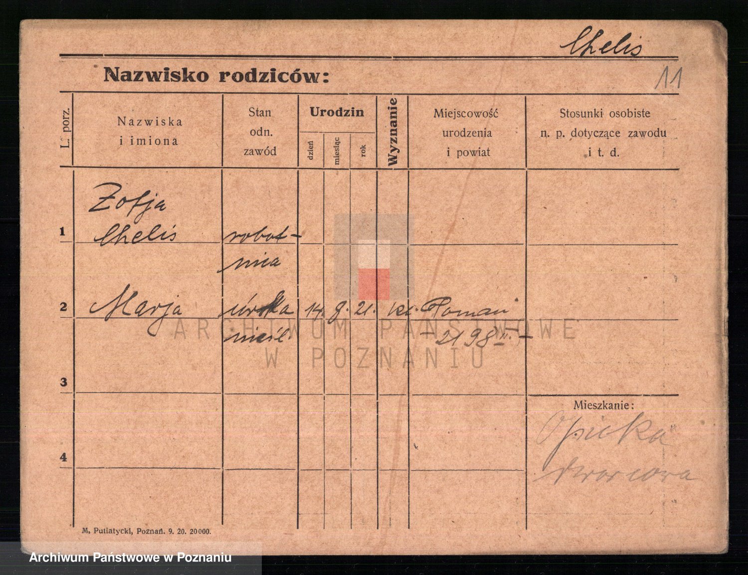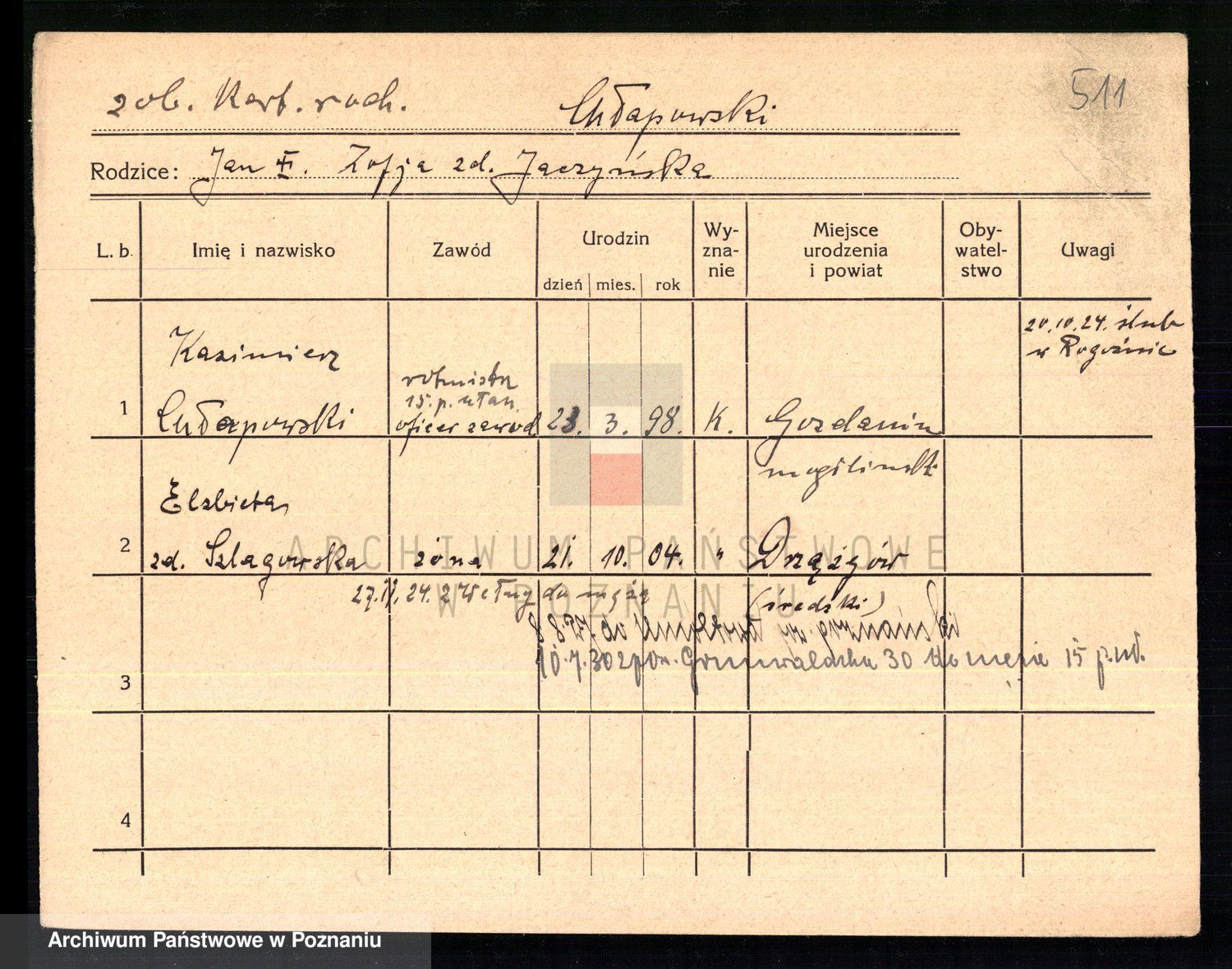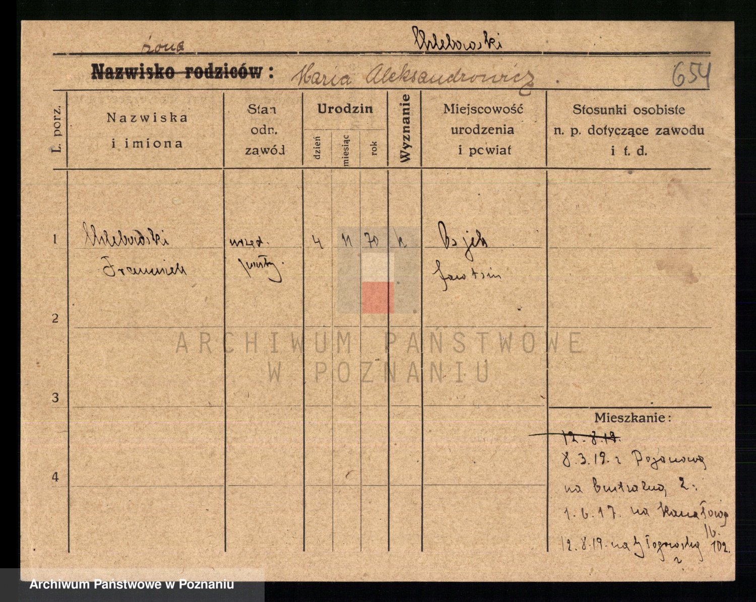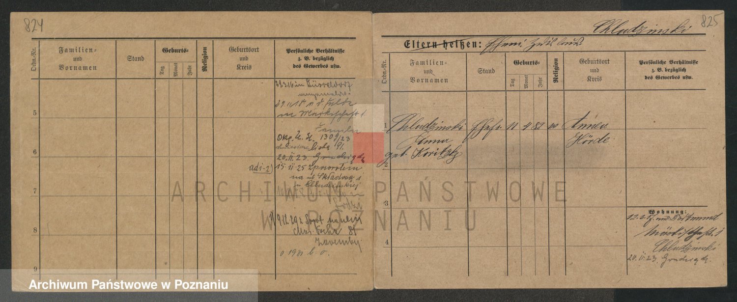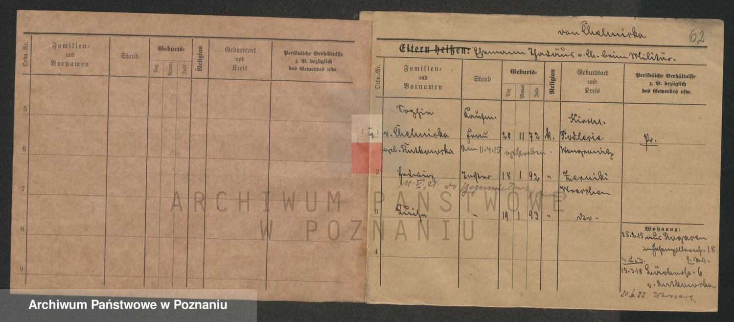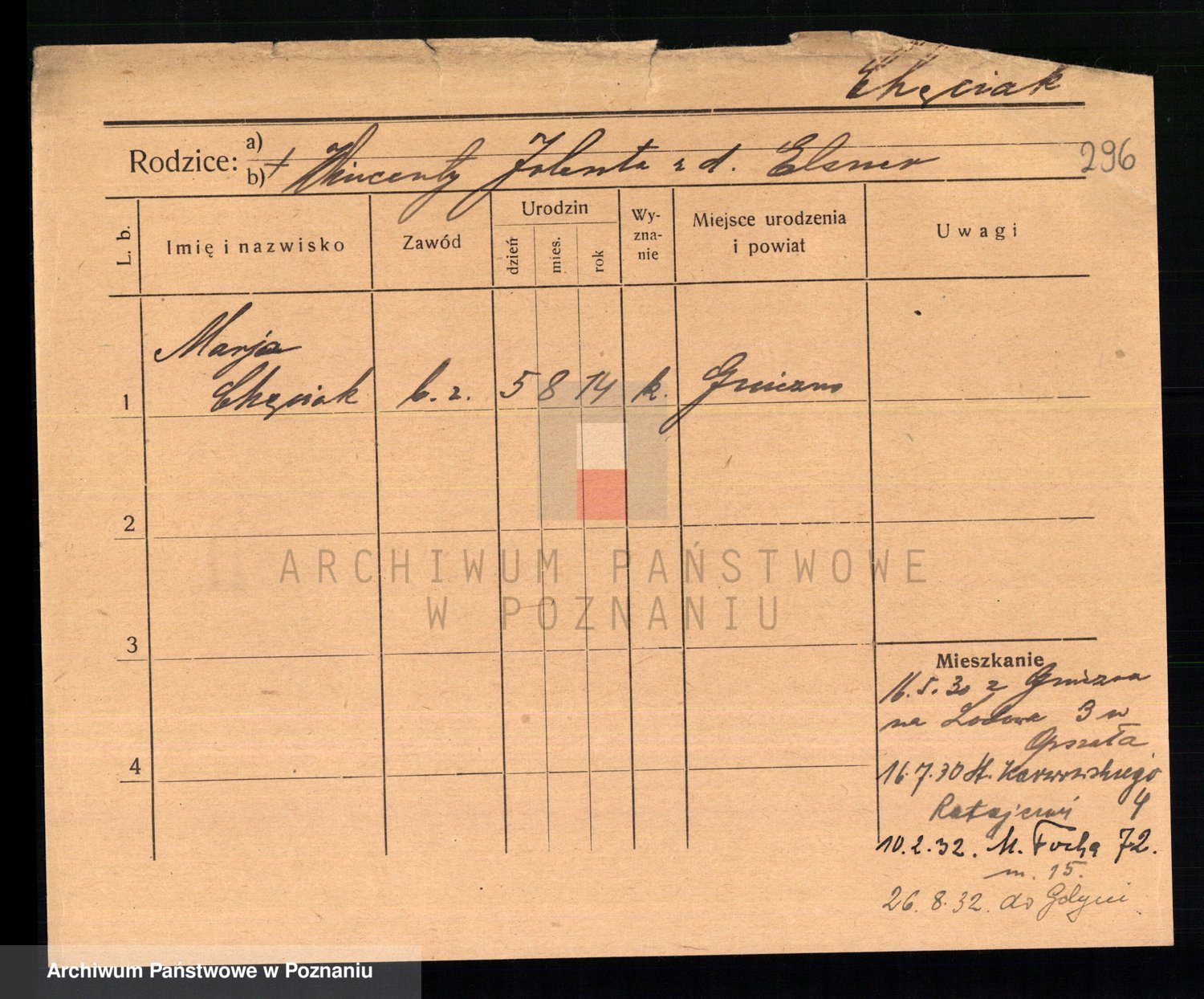 Podgląd karty osobowej dostępny jest po kliknięciu na nazwisko lub ikonkę karty. Można dokonywać powiększenia (ikony na górze) lub przechodzić między kolejnymi skanami (strzałki po bokach).