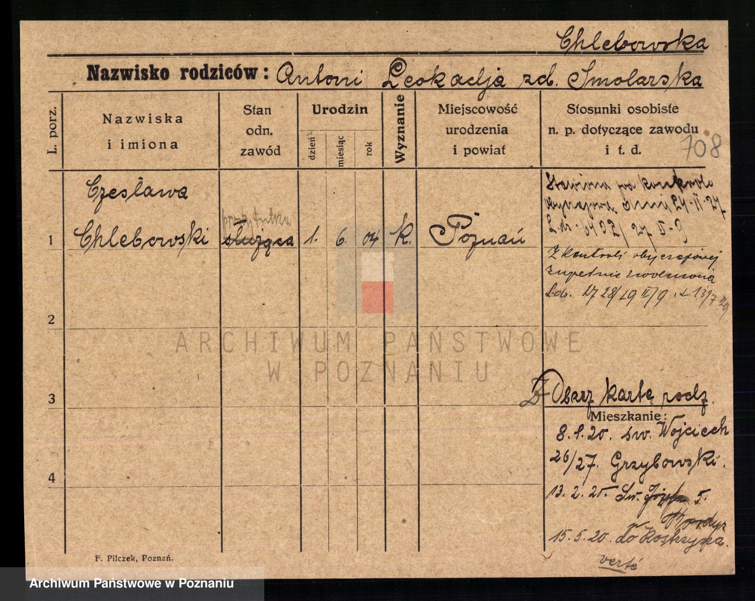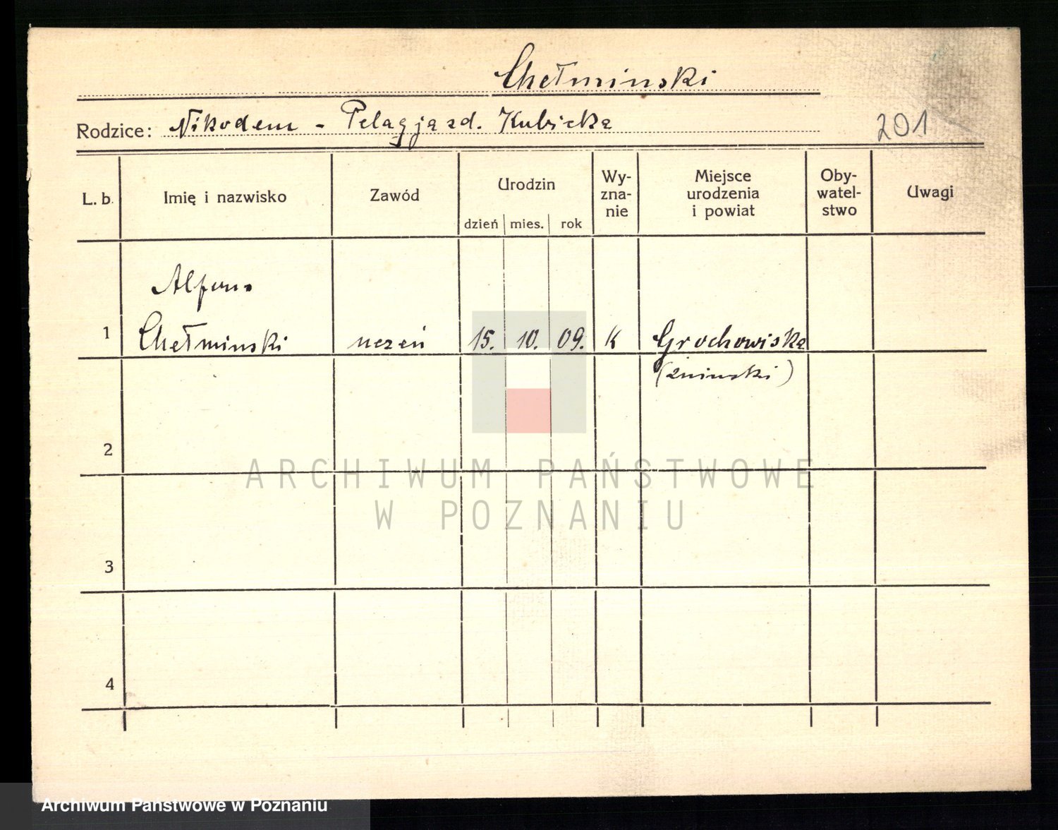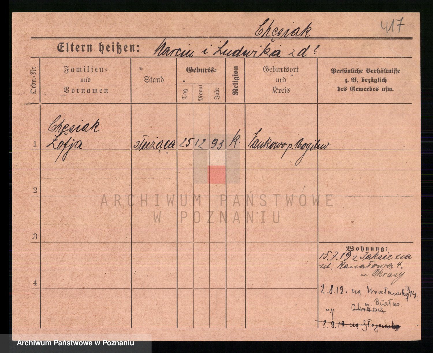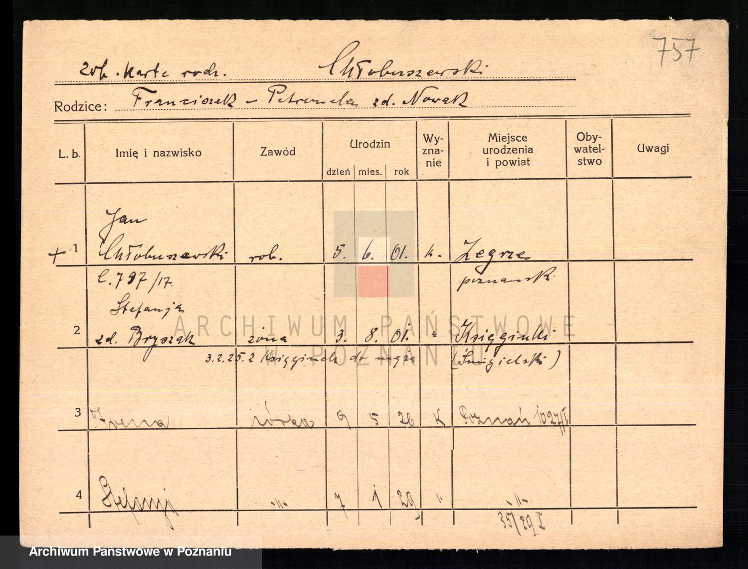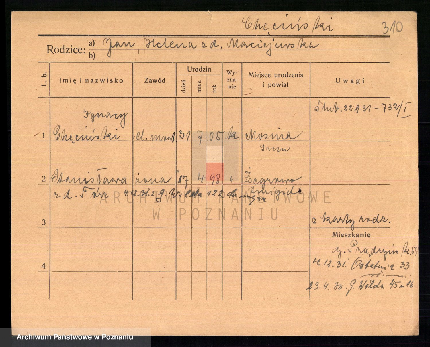 Podgląd karty osobowej dostępny jest po kliknięciu na nazwisko lub ikonkę karty. Można dokonywać powiększenia (ikony na górze) lub przechodzić między kolejnymi skanami (strzałki po bokach).