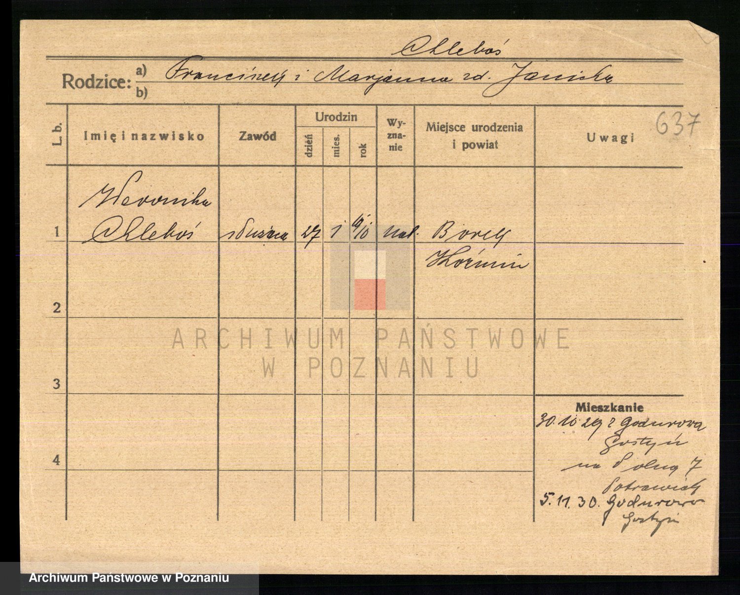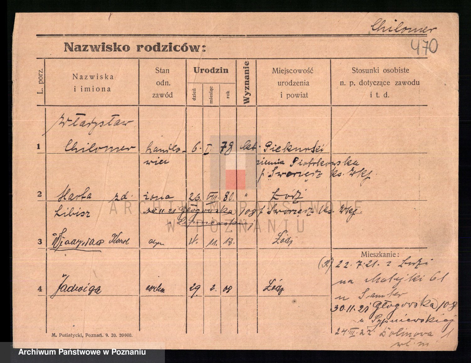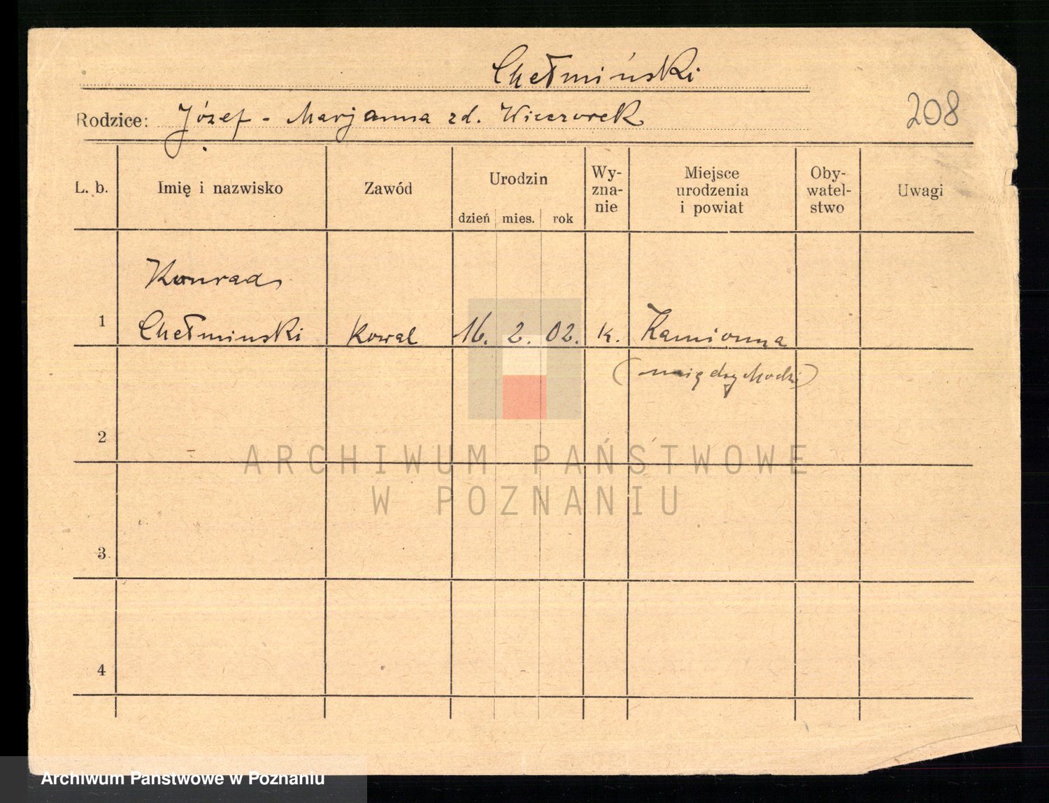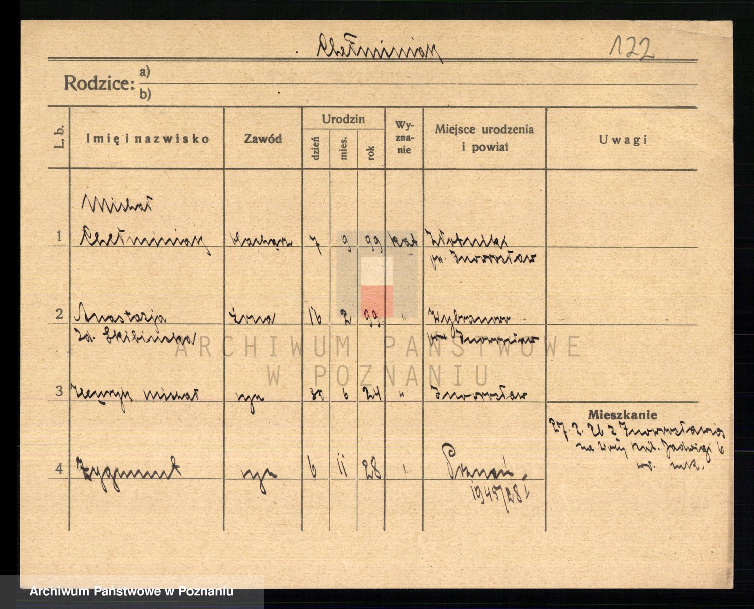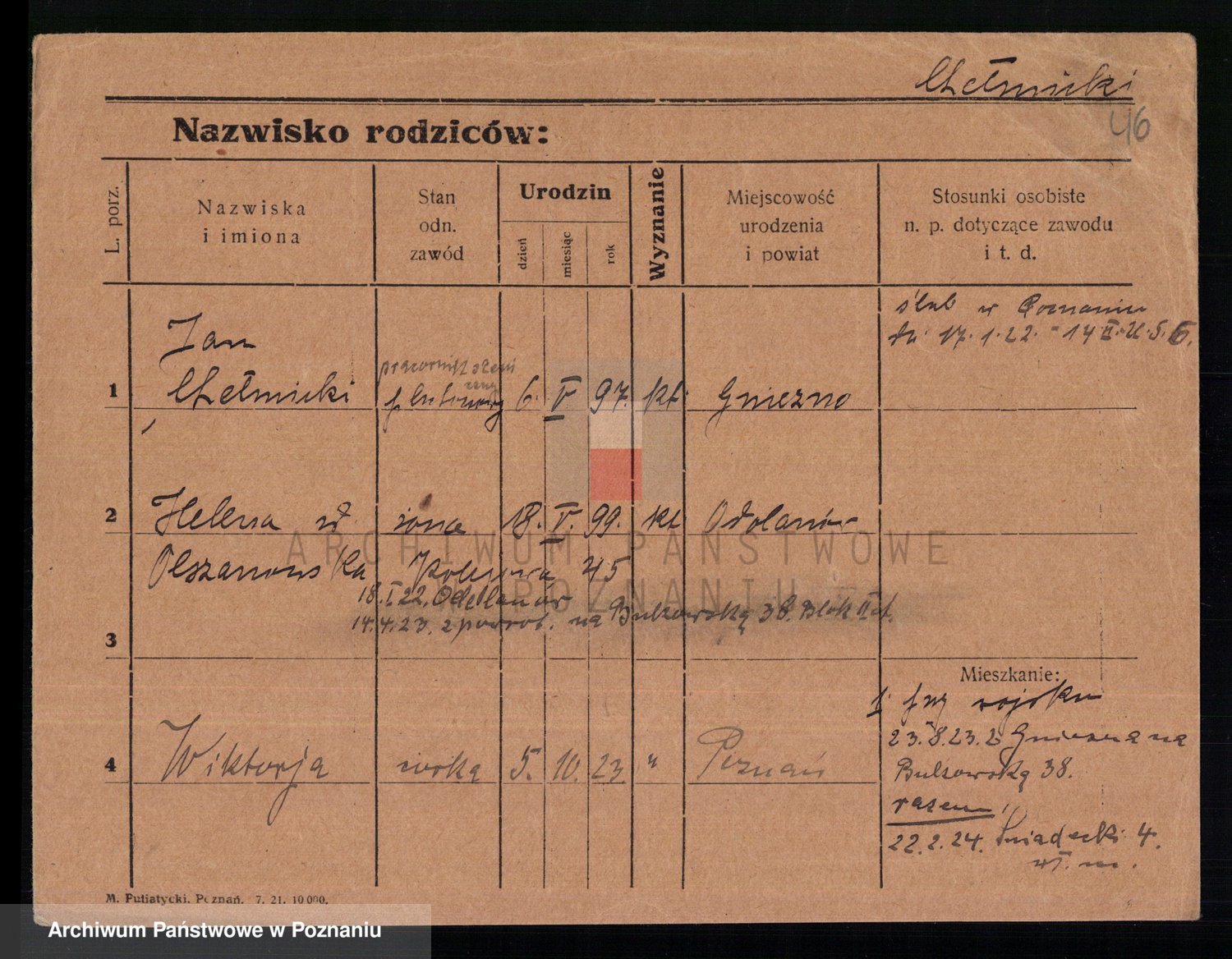 Podgląd karty osobowej dostępny jest po kliknięciu na nazwisko lub ikonkę karty. Można dokonywać powiększenia (ikony na górze) lub przechodzić między kolejnymi skanami (strzałki po bokach).