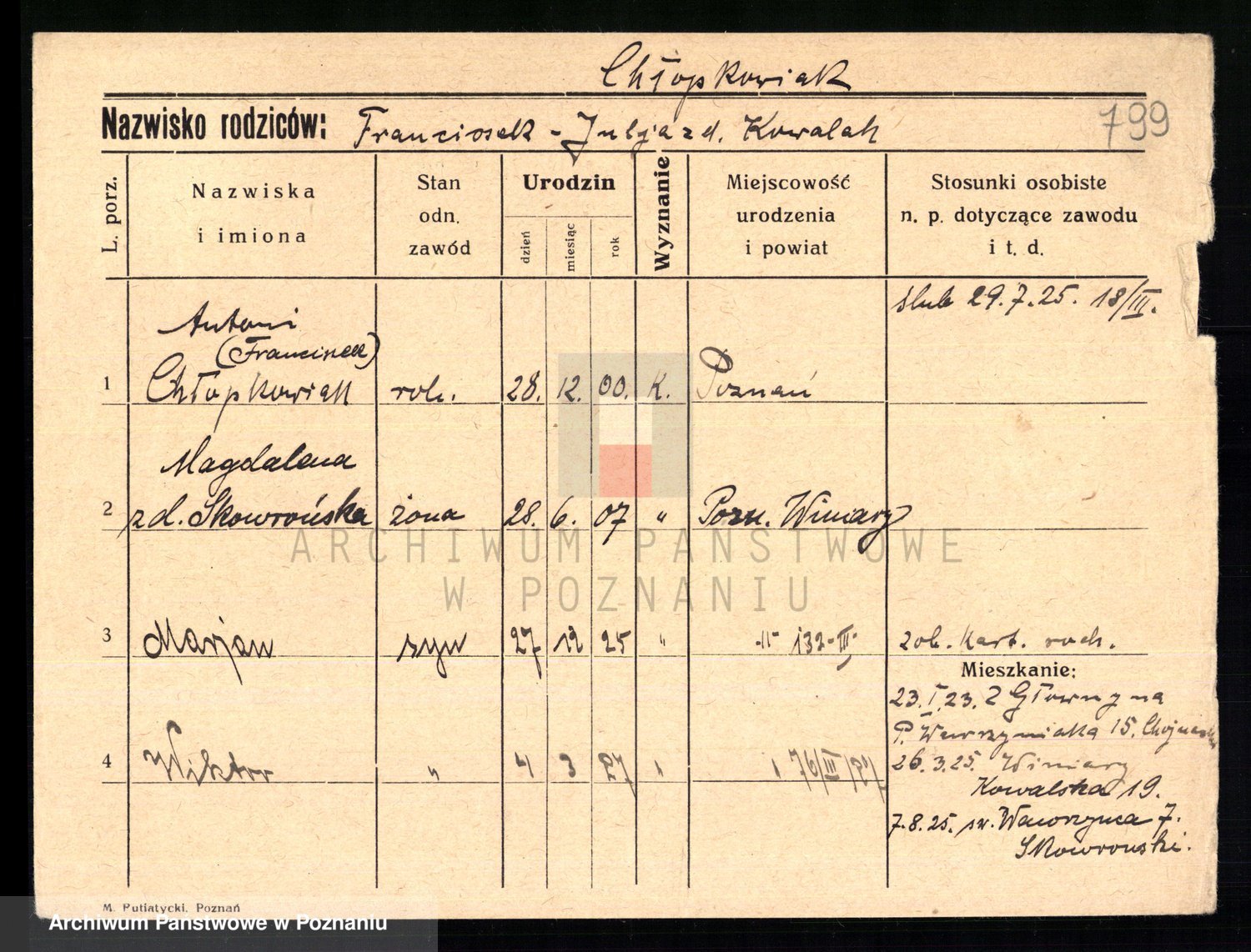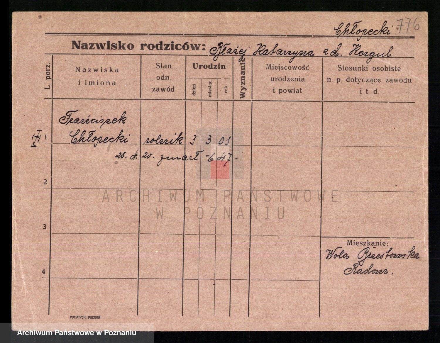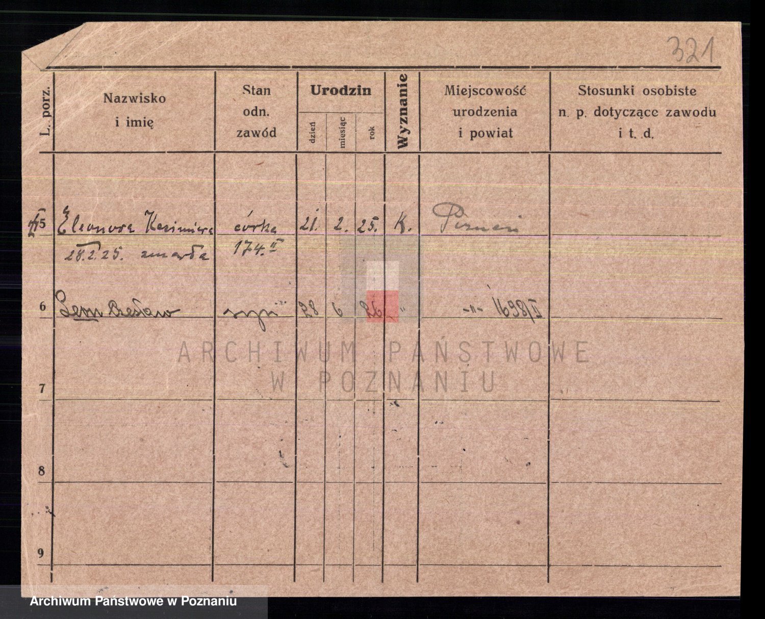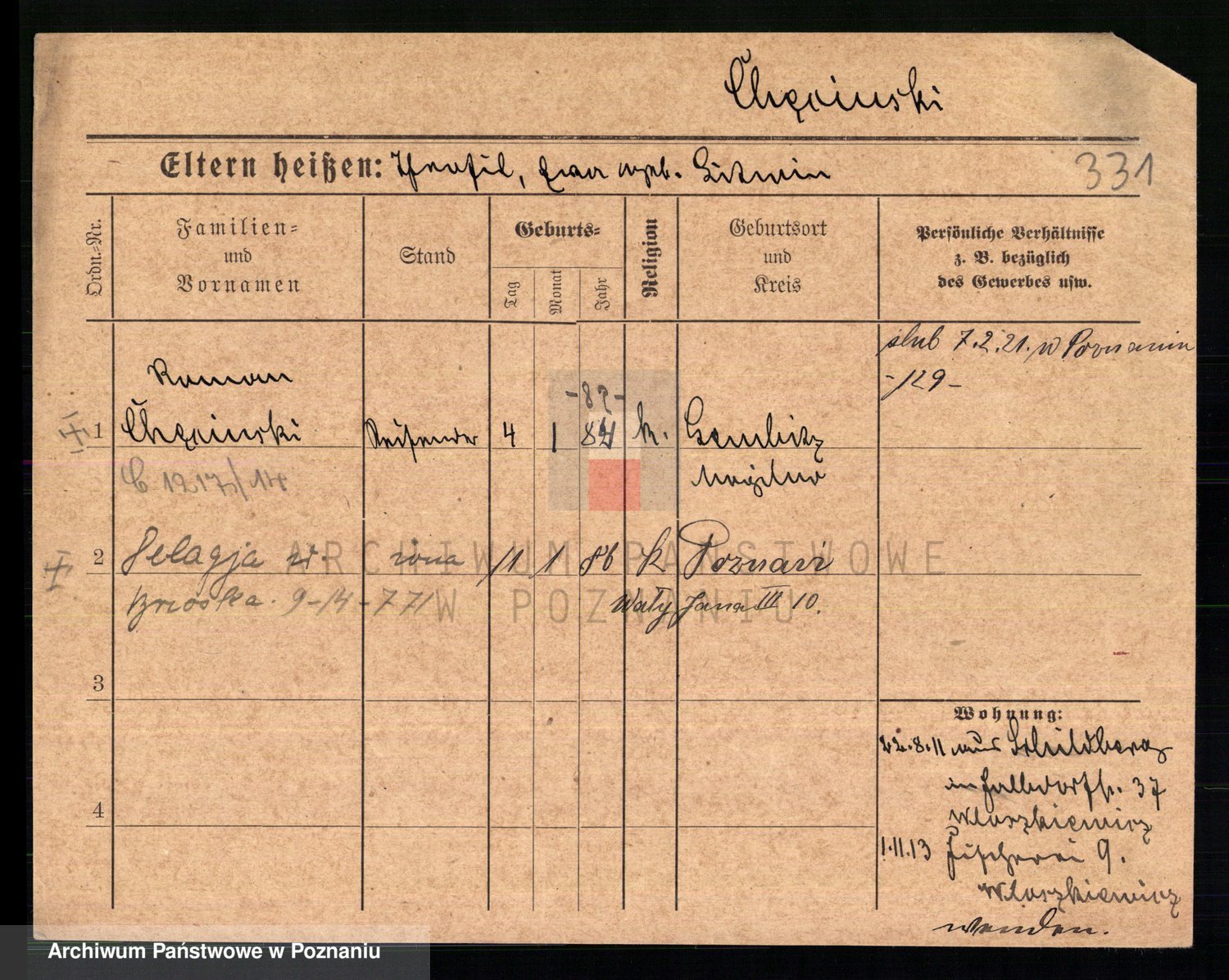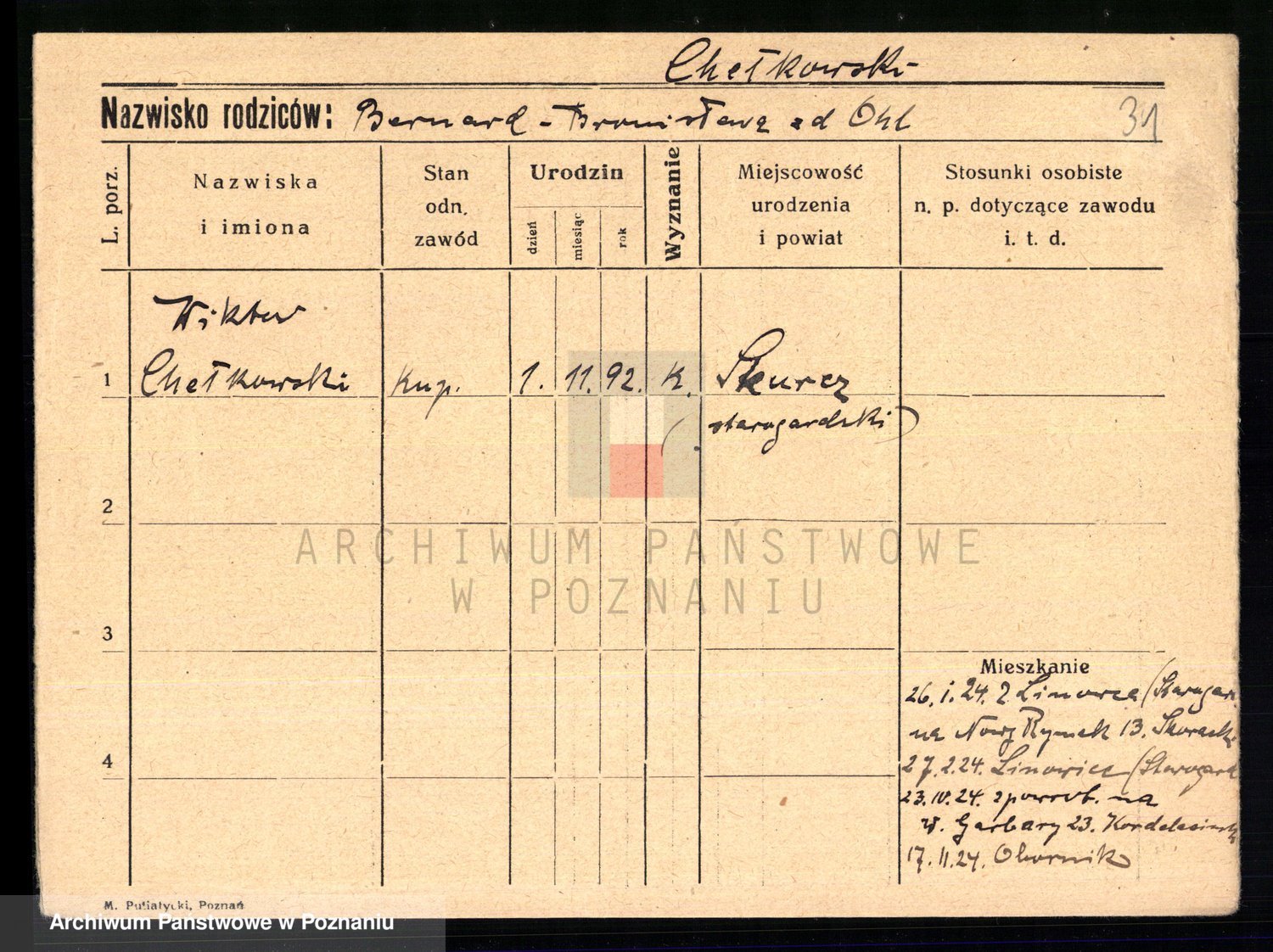 Podgląd karty osobowej dostępny jest po kliknięciu na nazwisko lub ikonkę karty. Można dokonywać powiększenia (ikony na górze) lub przechodzić między kolejnymi skanami (strzałki po bokach).
