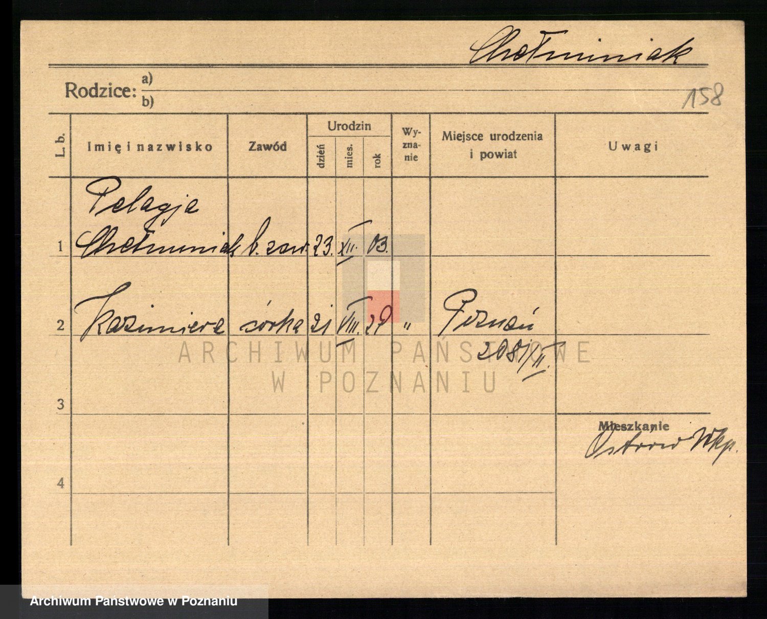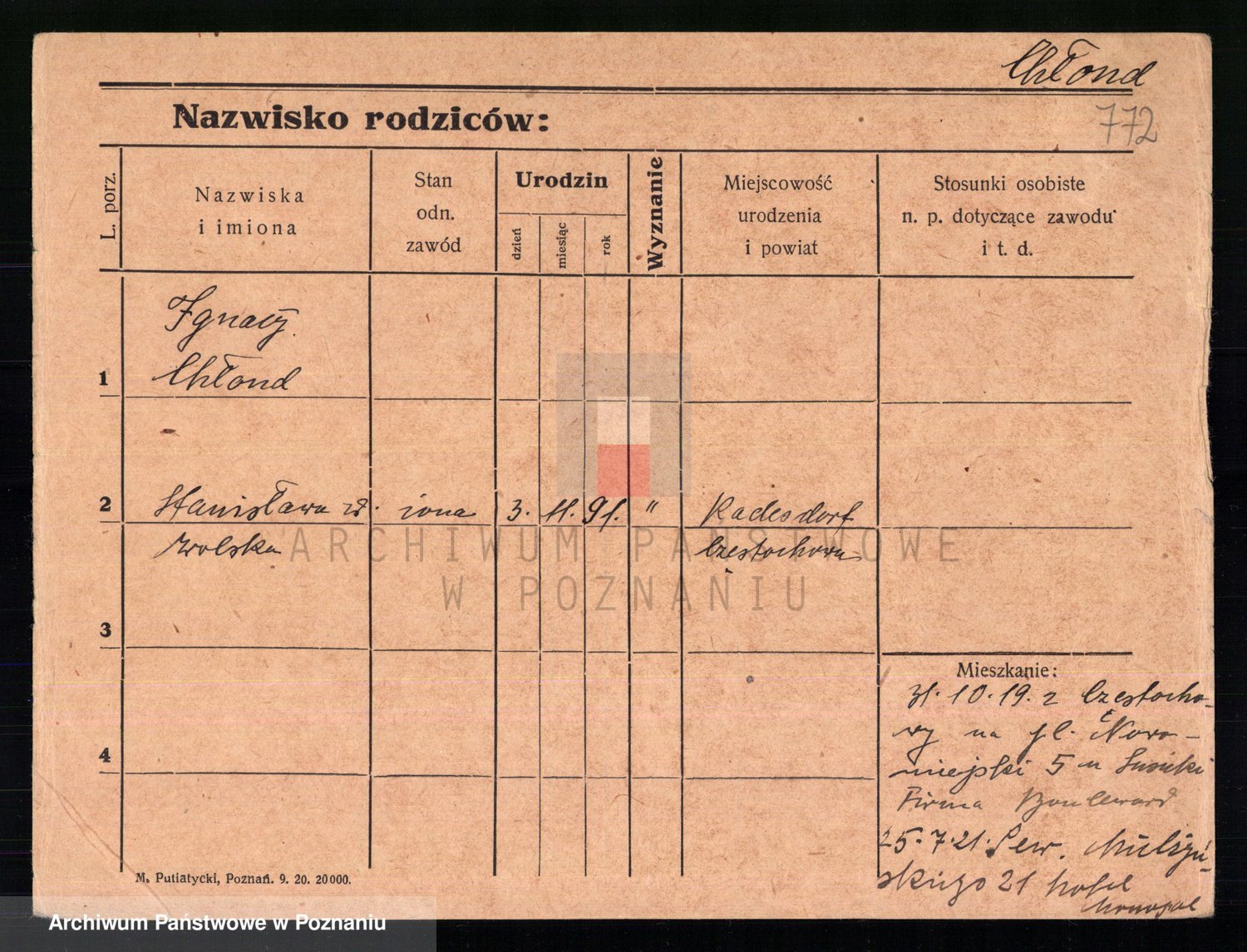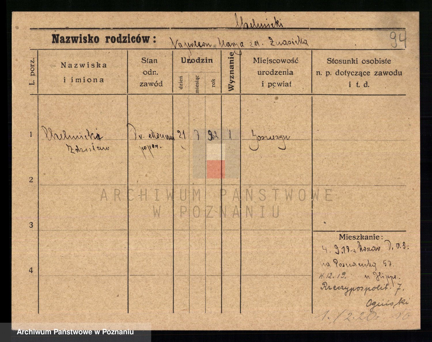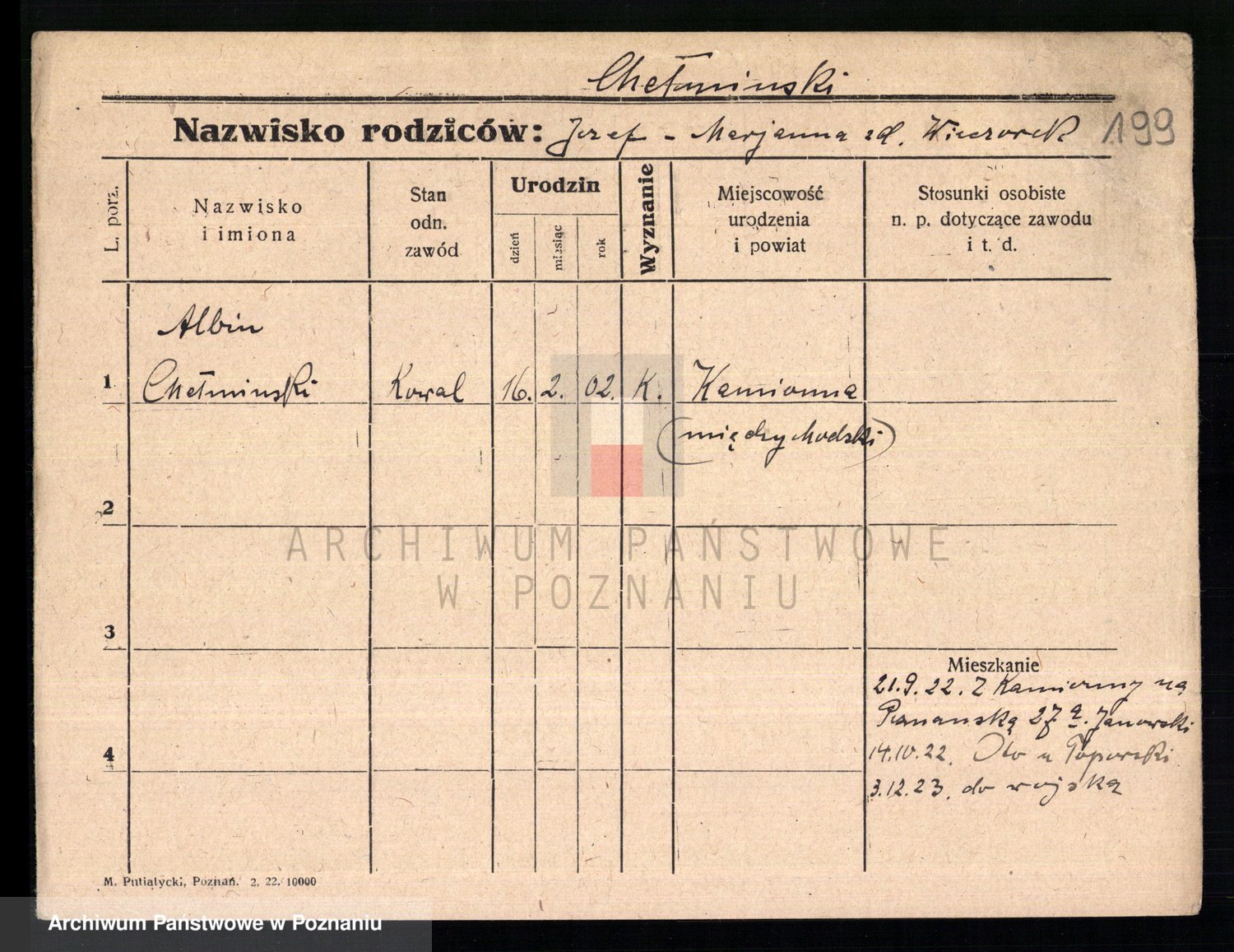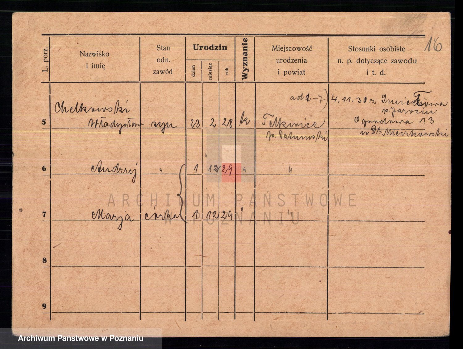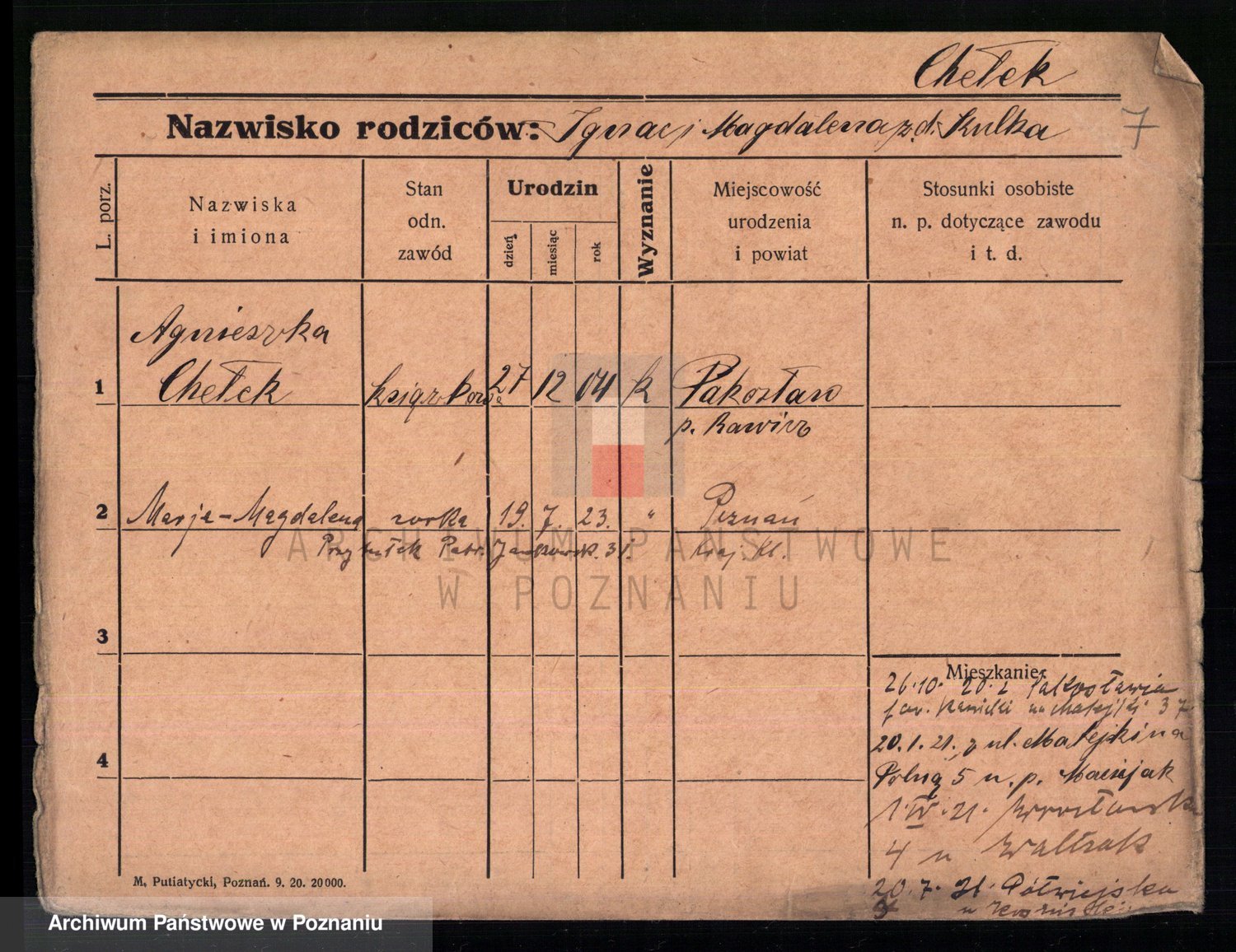 Podgląd karty osobowej dostępny jest po kliknięciu na nazwisko lub ikonkę karty. Można dokonywać powiększenia (ikony na górze) lub przechodzić między kolejnymi skanami (strzałki po bokach).