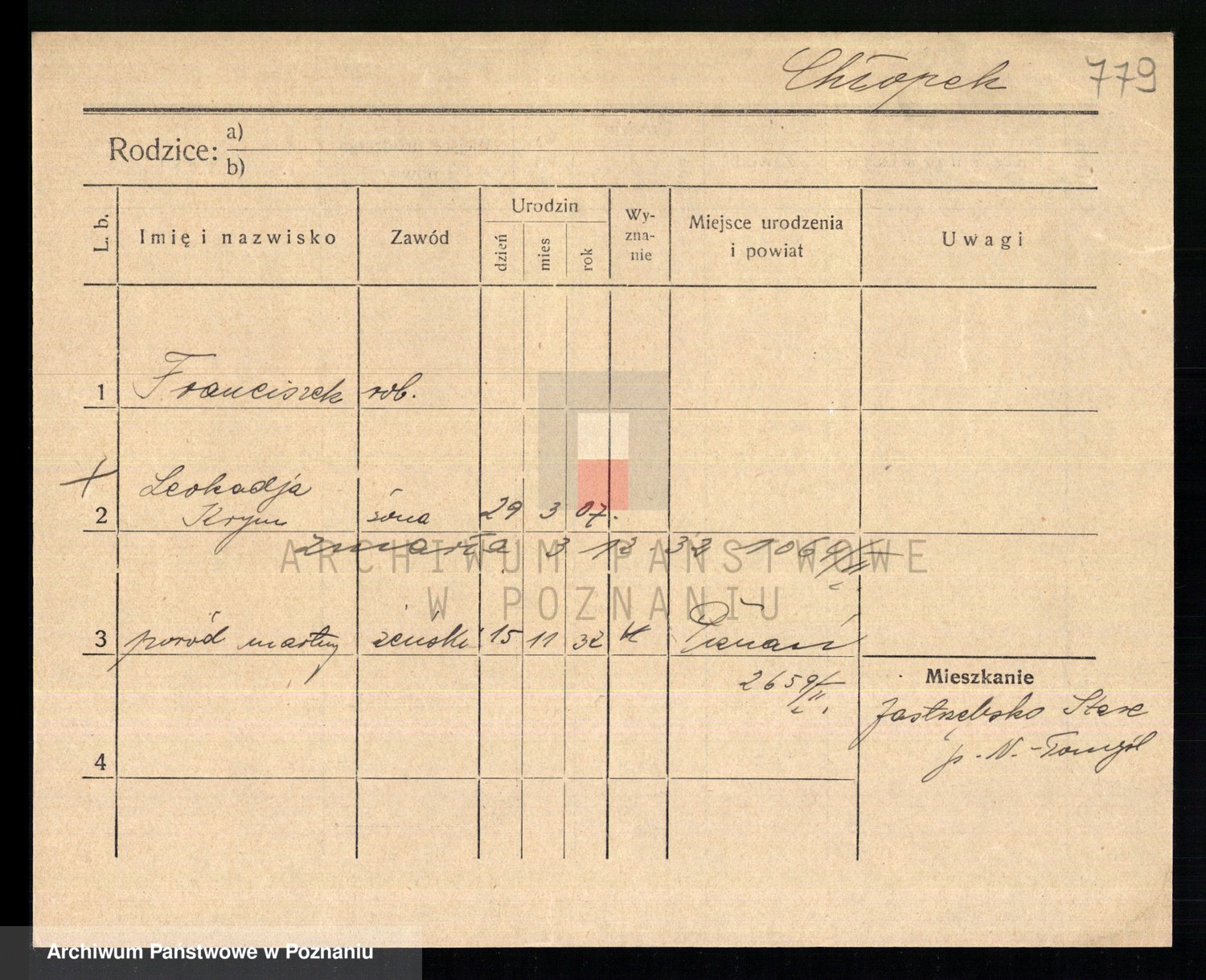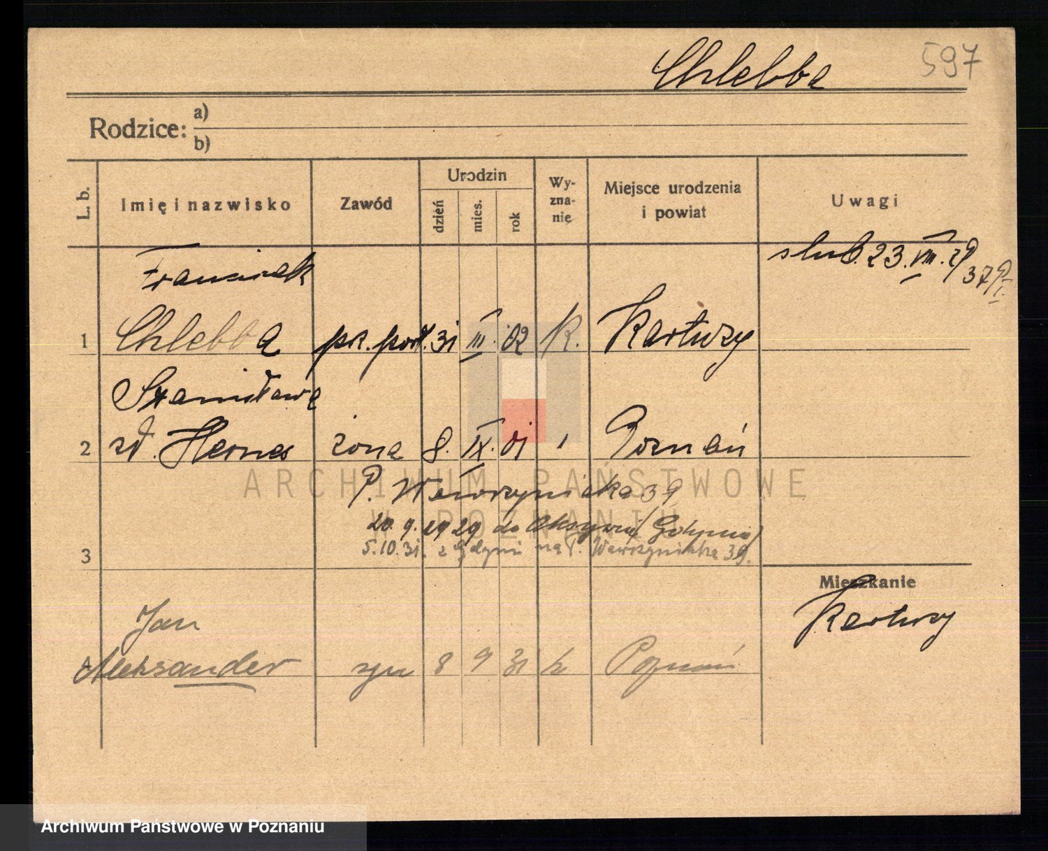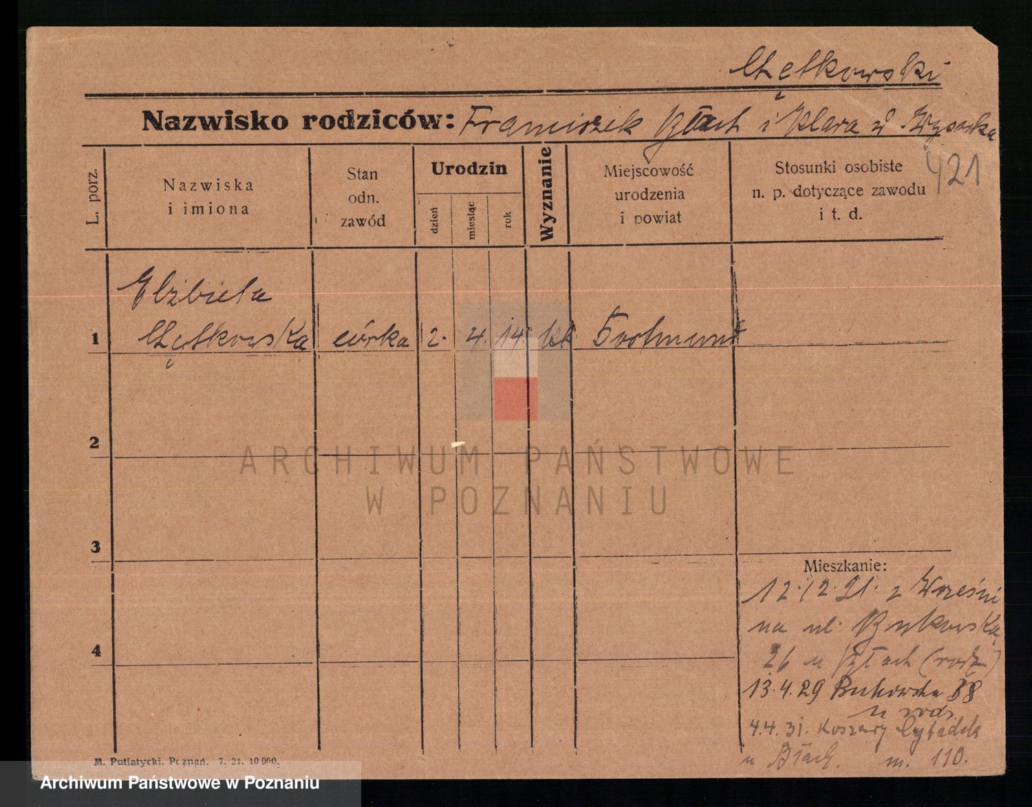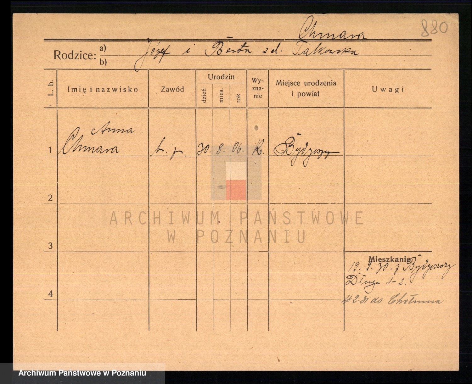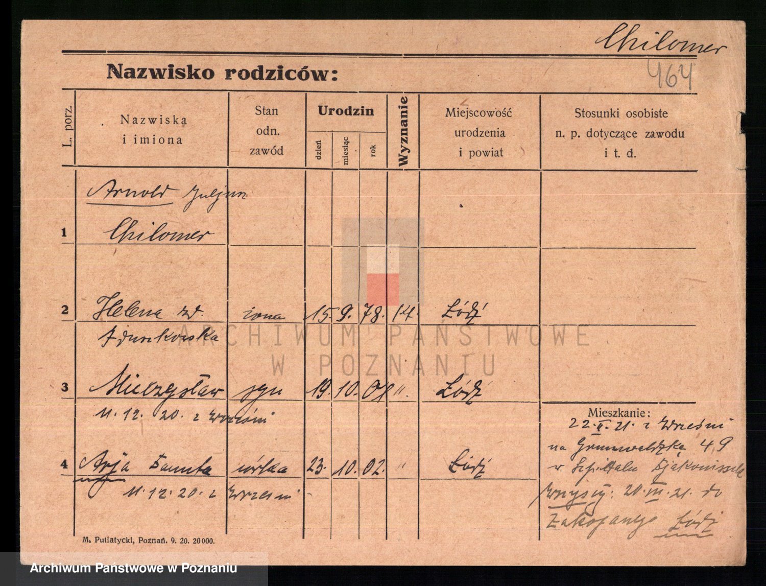 Podgląd karty osobowej dostępny jest po kliknięciu na nazwisko lub ikonkę karty. Można dokonywać powiększenia (ikony na górze) lub przechodzić między kolejnymi skanami (strzałki po bokach).