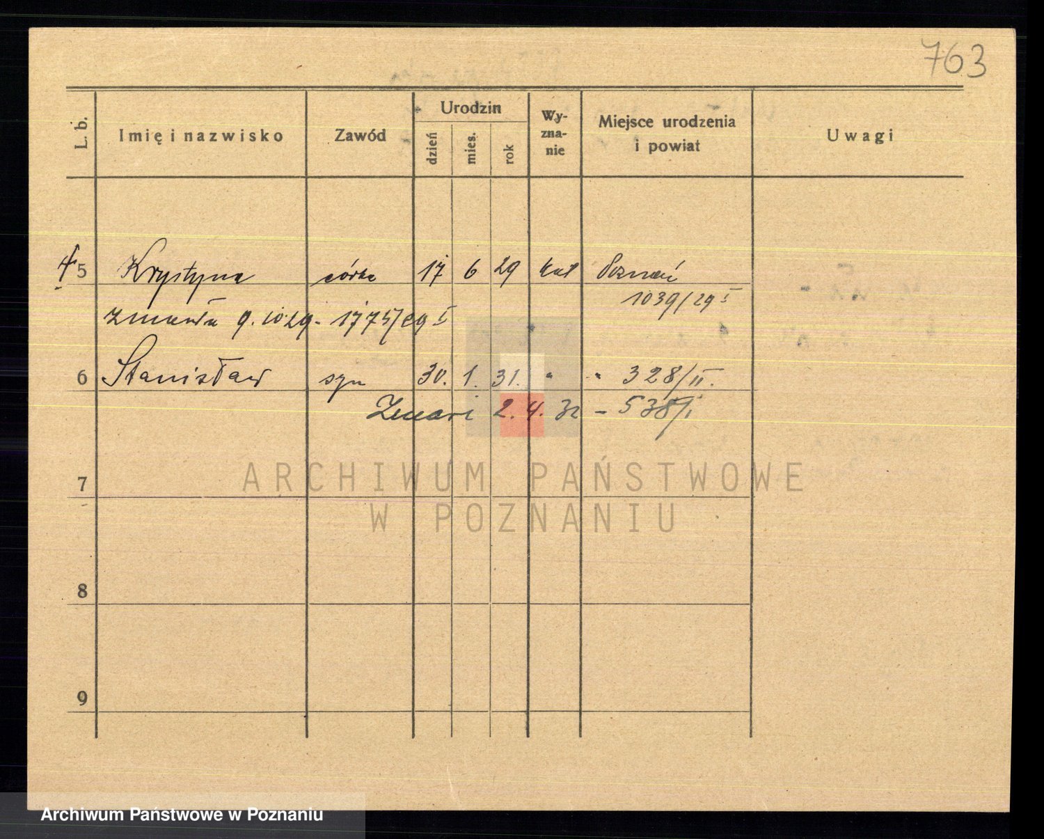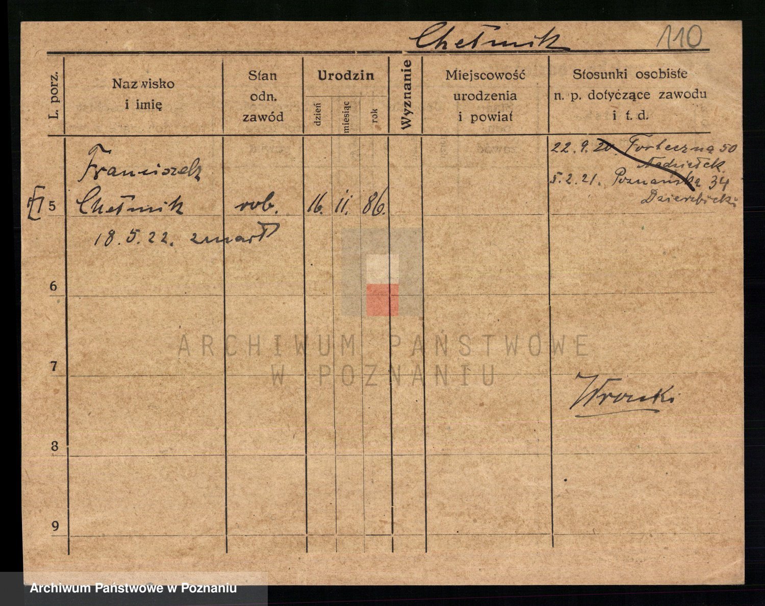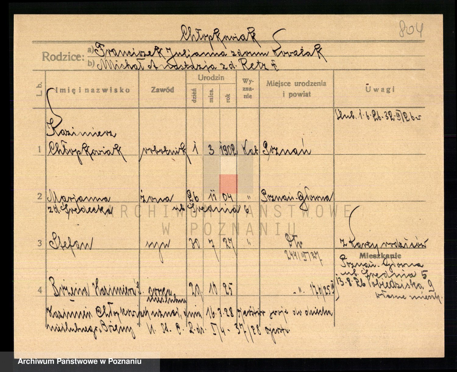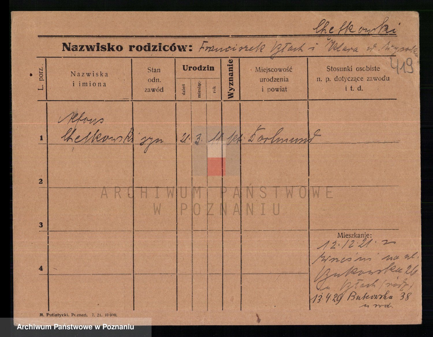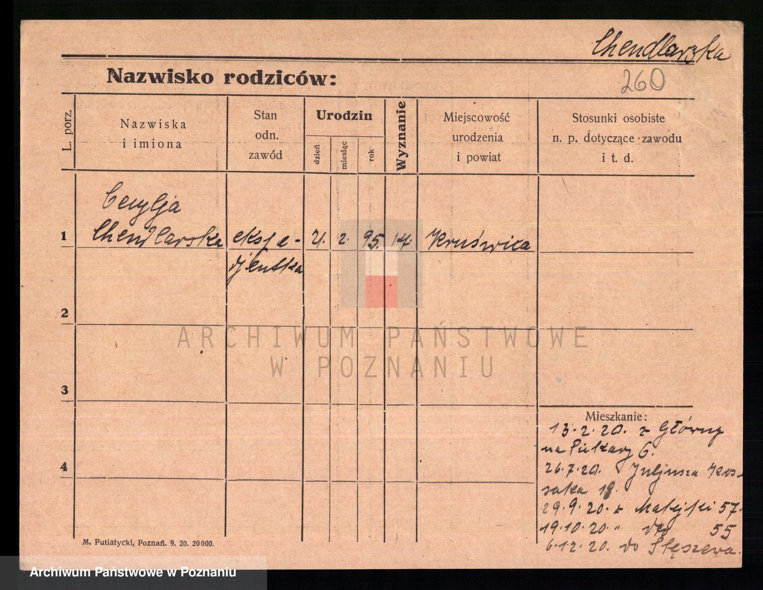 Podgląd karty osobowej dostępny jest po kliknięciu na nazwisko lub ikonkę karty. Można dokonywać powiększenia (ikony na górze) lub przechodzić między kolejnymi skanami (strzałki po bokach).