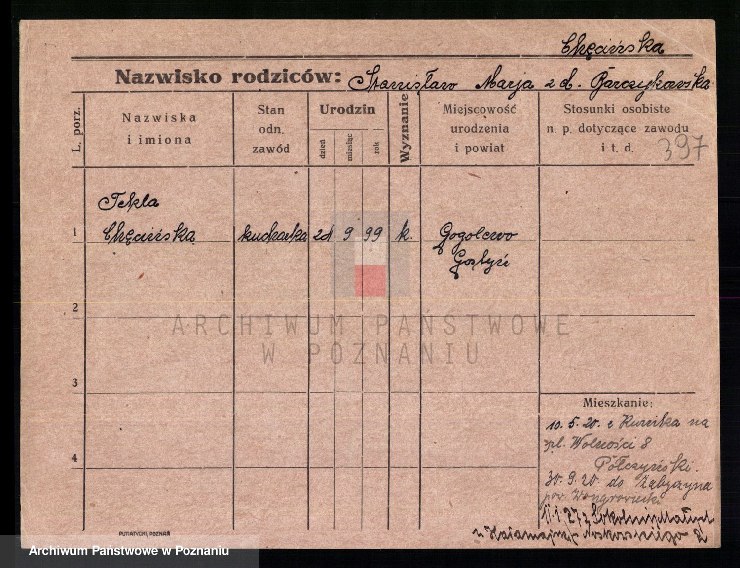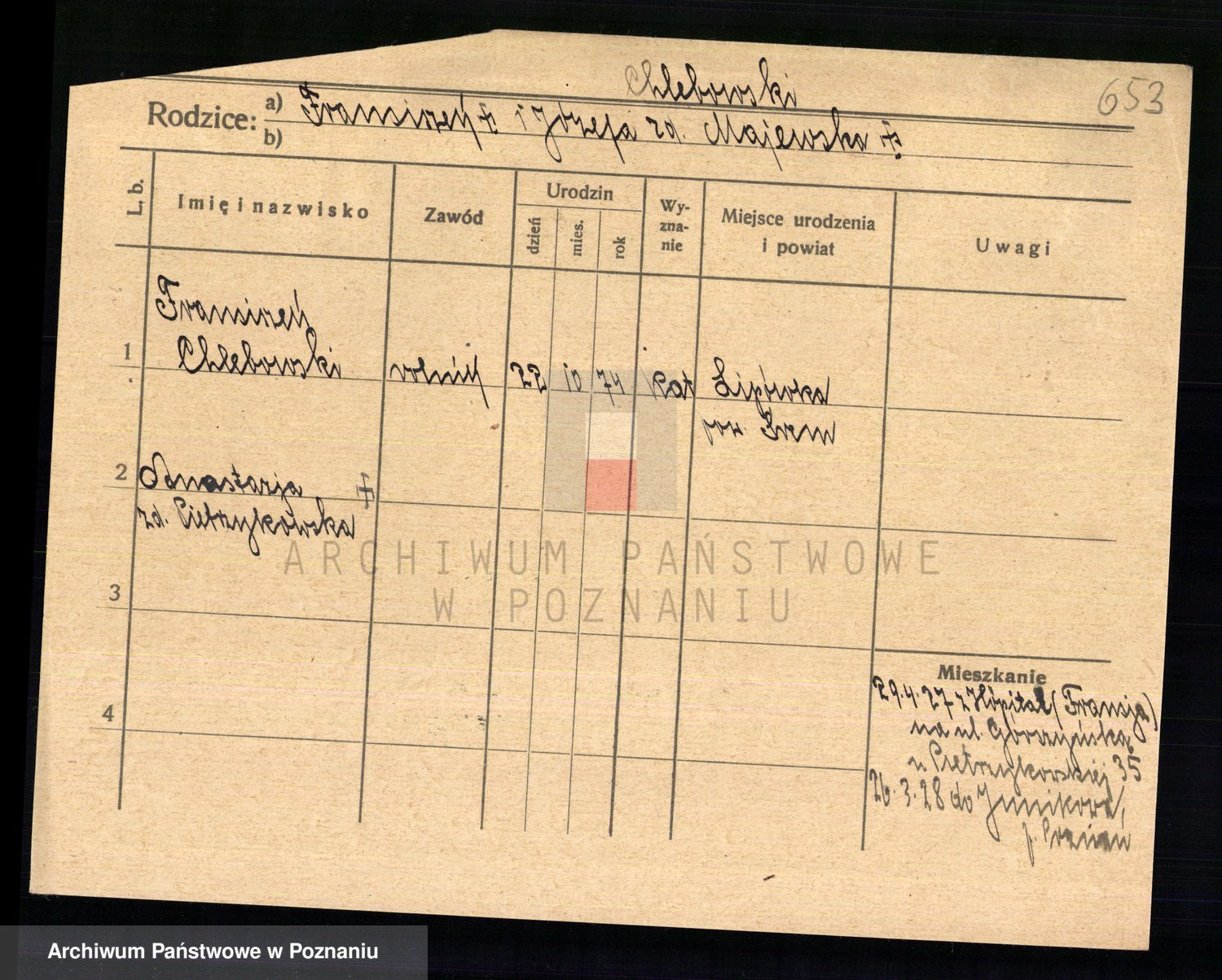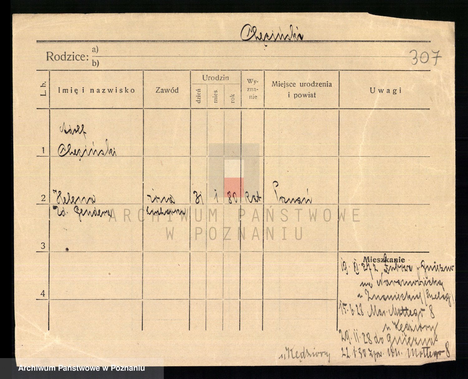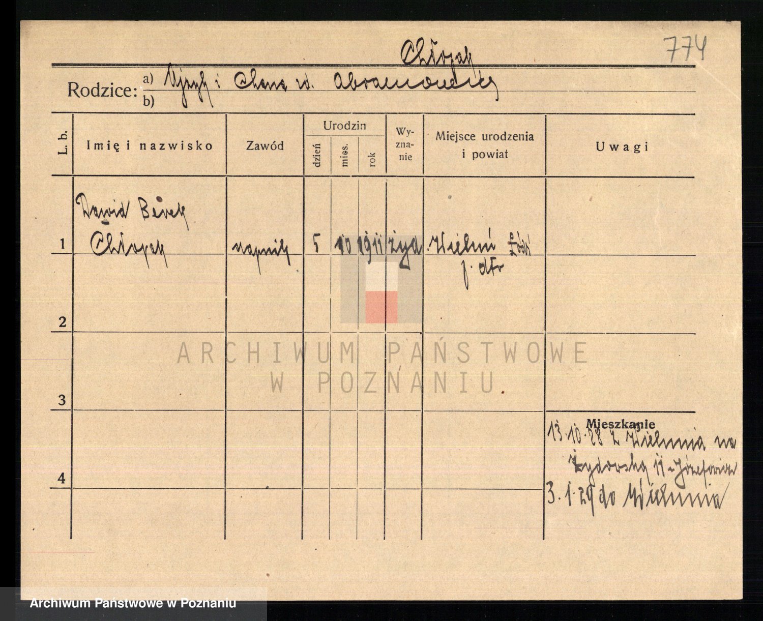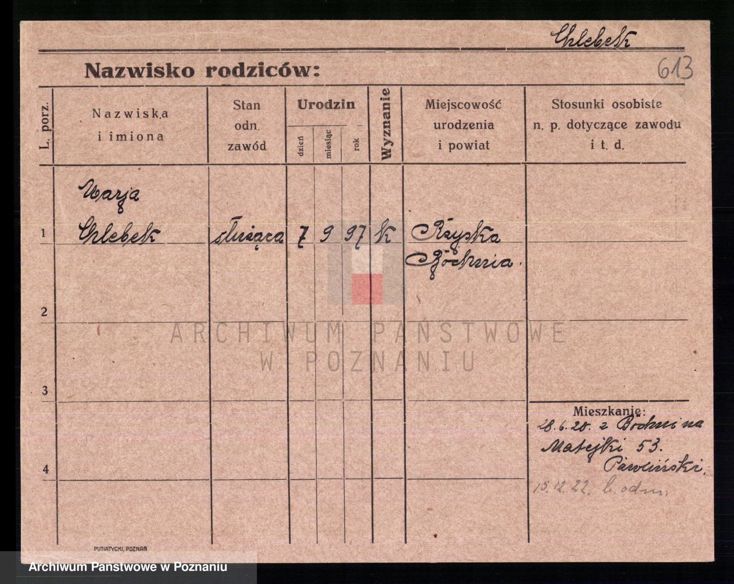 Podgląd karty osobowej dostępny jest po kliknięciu na nazwisko lub ikonkę karty. Można dokonywać powiększenia (ikony na górze) lub przechodzić między kolejnymi skanami (strzałki po bokach).