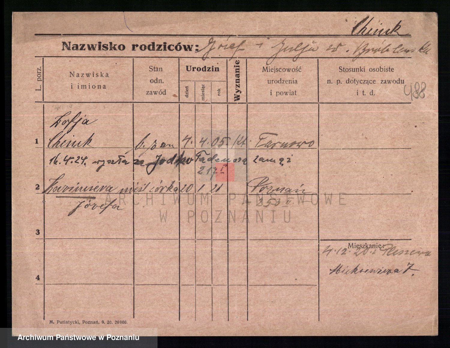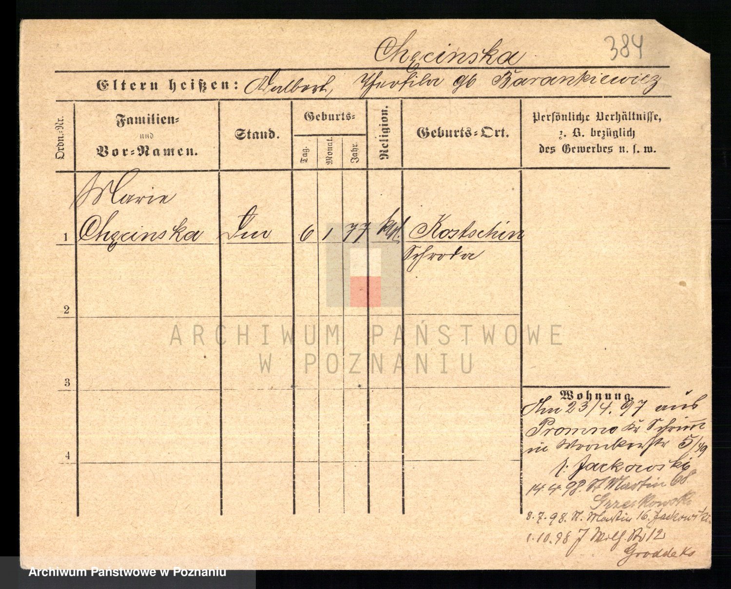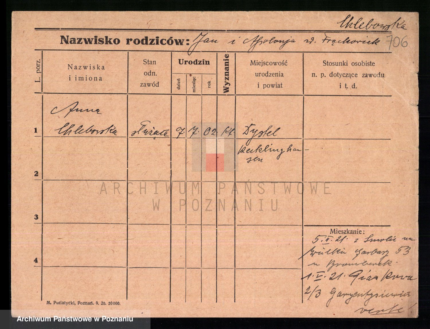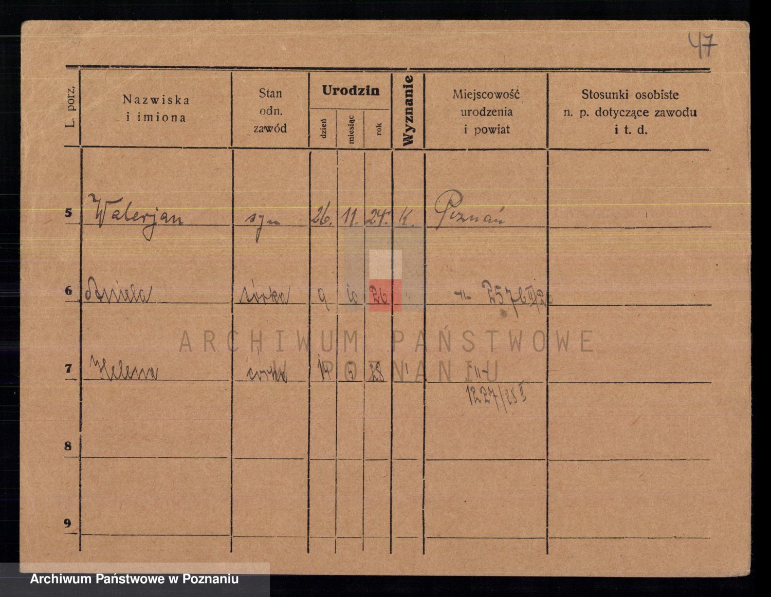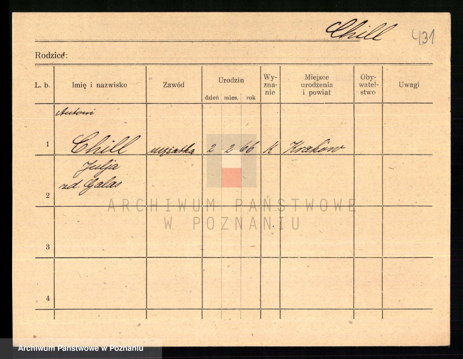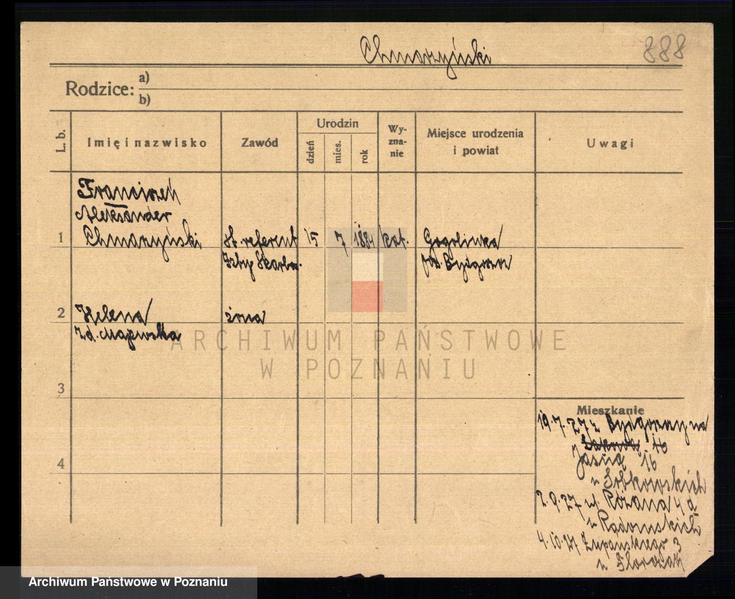 Podgląd karty osobowej dostępny jest po kliknięciu na nazwisko lub ikonkę karty. Można dokonywać powiększenia (ikony na górze) lub przechodzić między kolejnymi skanami (strzałki po bokach).