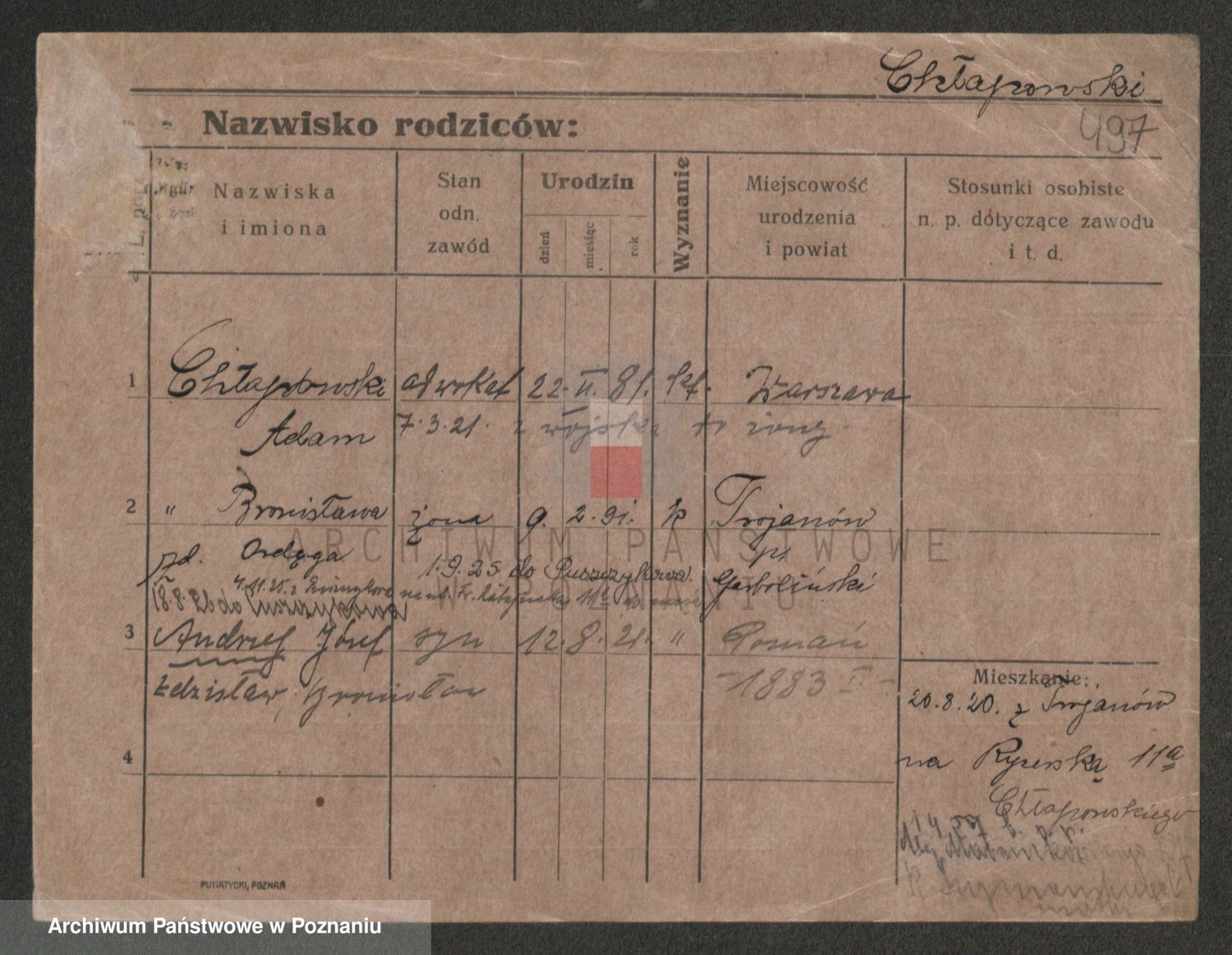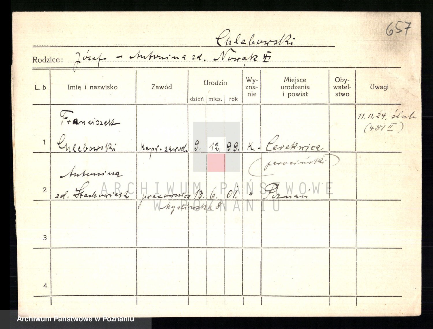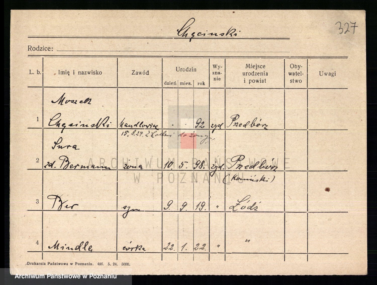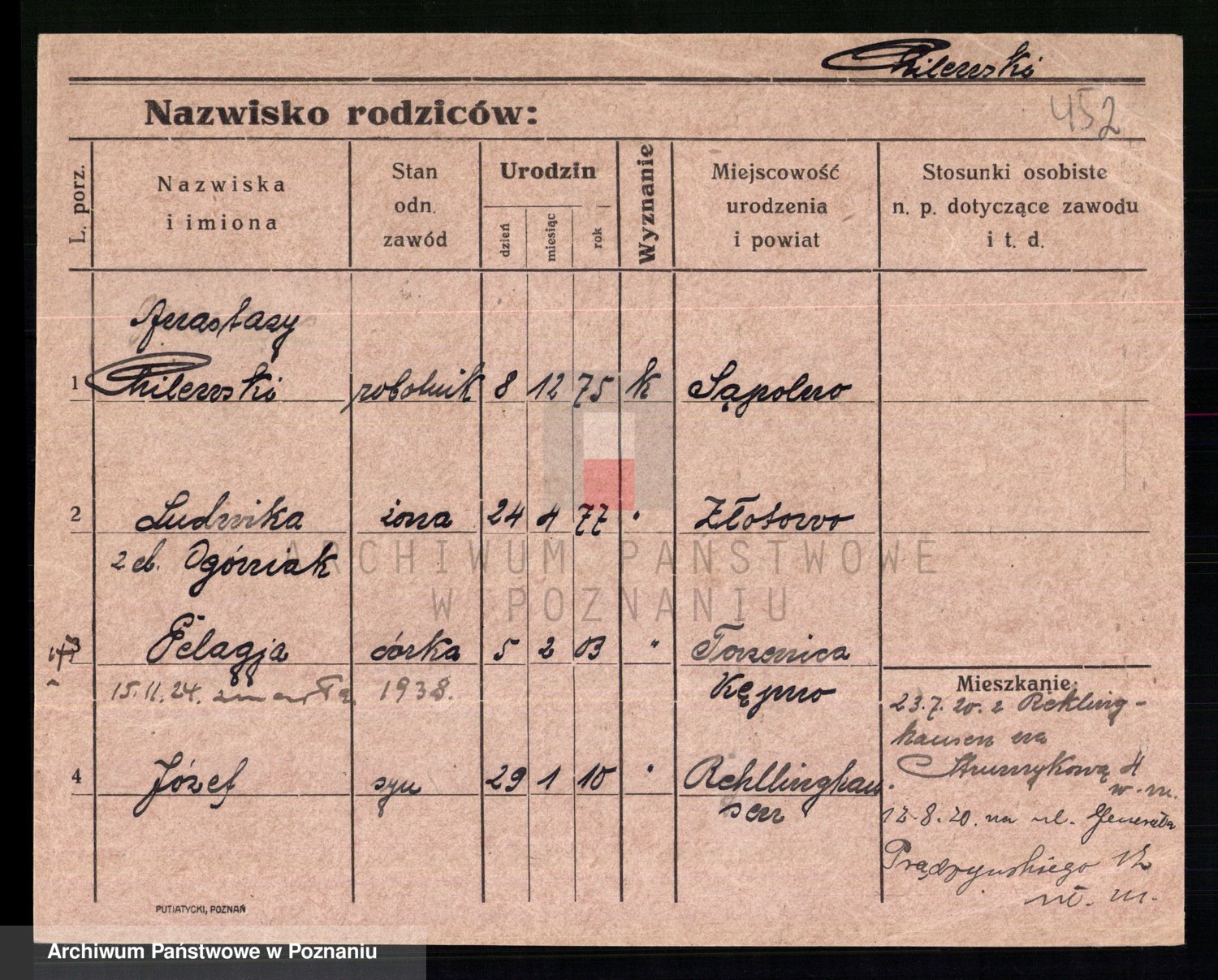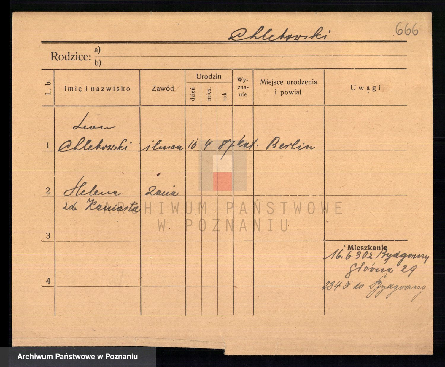 Podgląd karty osobowej dostępny jest po kliknięciu na nazwisko lub ikonkę karty. Można dokonywać powiększenia (ikony na górze) lub przechodzić między kolejnymi skanami (strzałki po bokach).