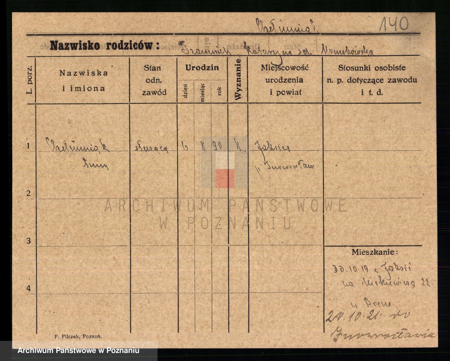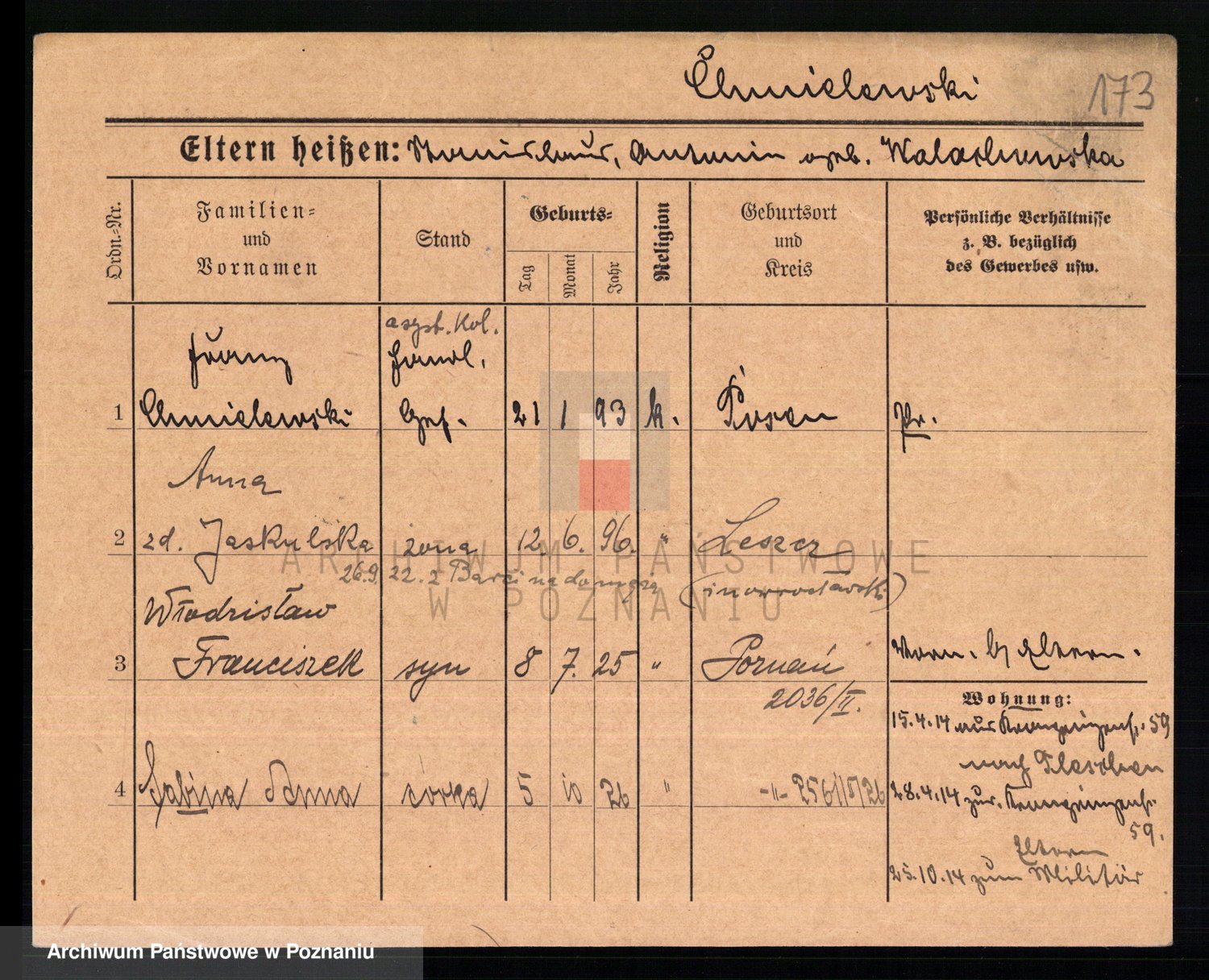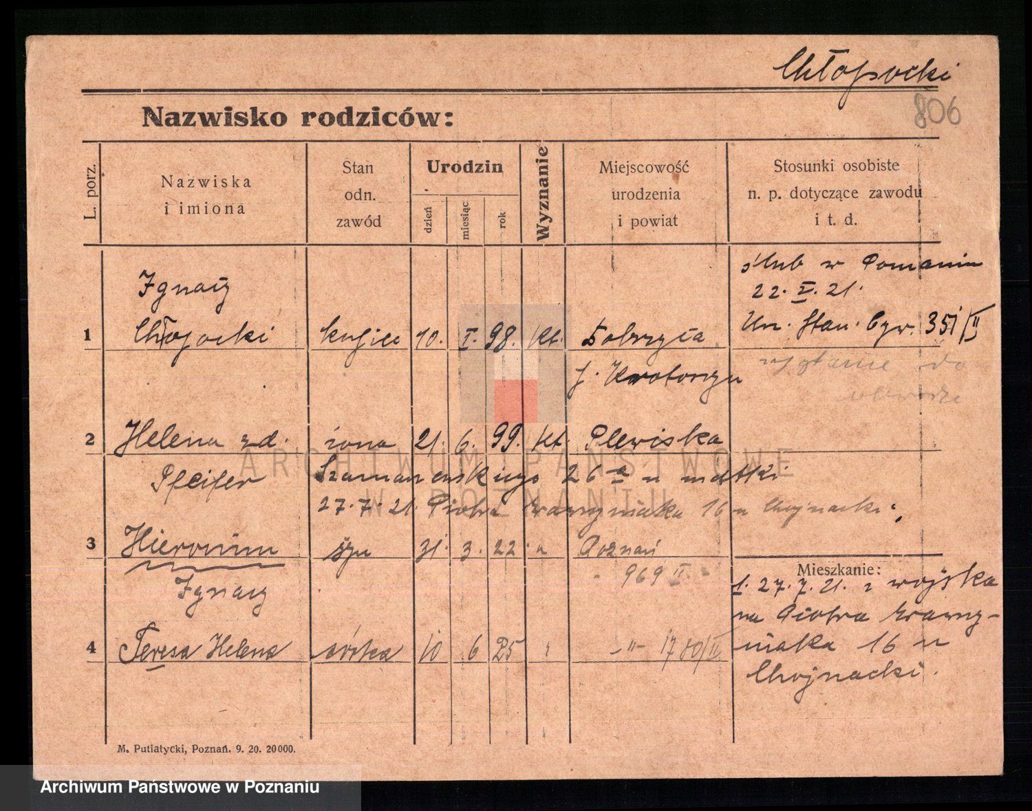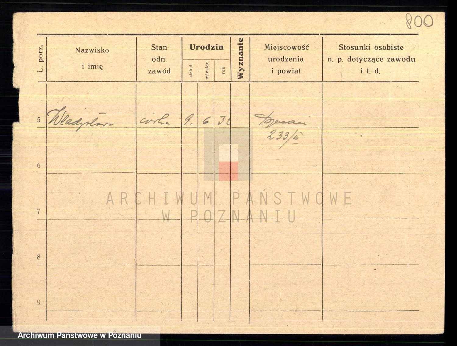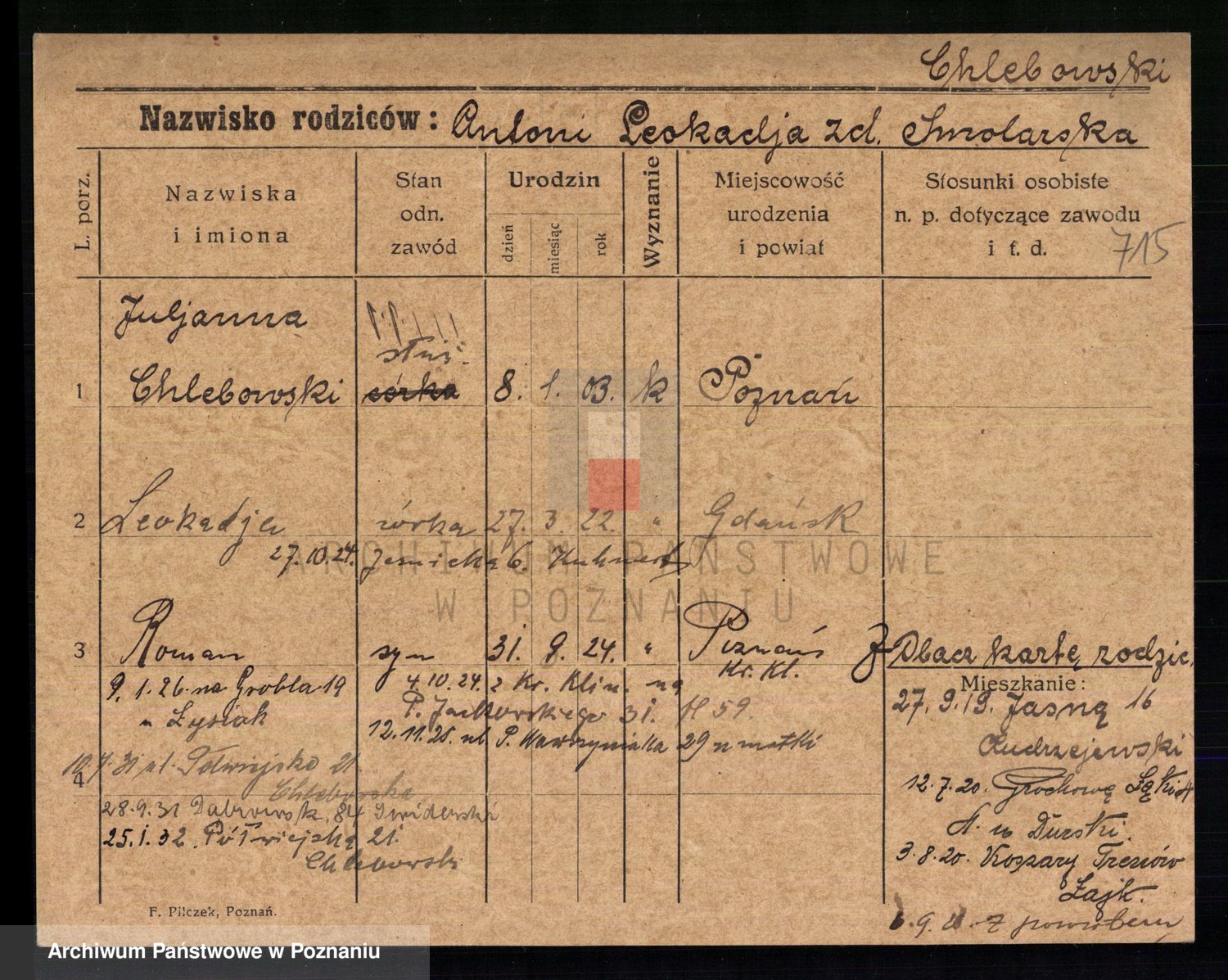 Podgląd karty osobowej dostępny jest po kliknięciu na nazwisko lub ikonkę karty. Można dokonywać powiększenia (ikony na górze) lub przechodzić między kolejnymi skanami (strzałki po bokach).