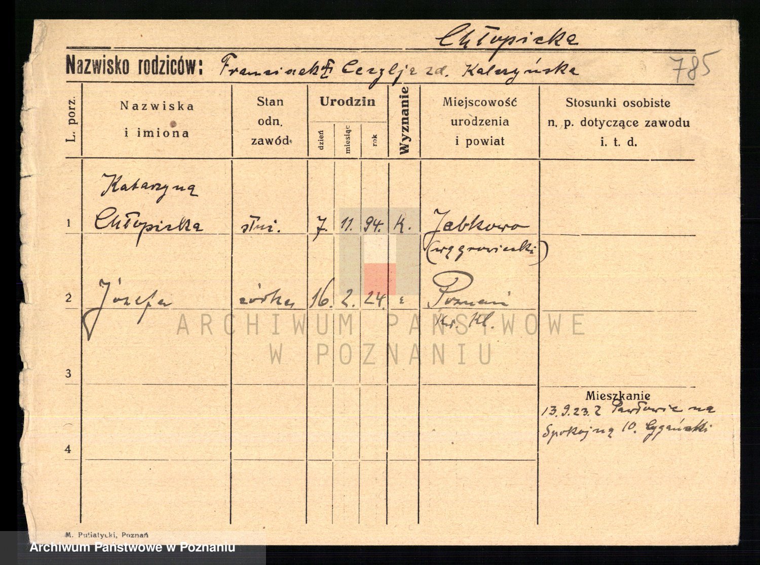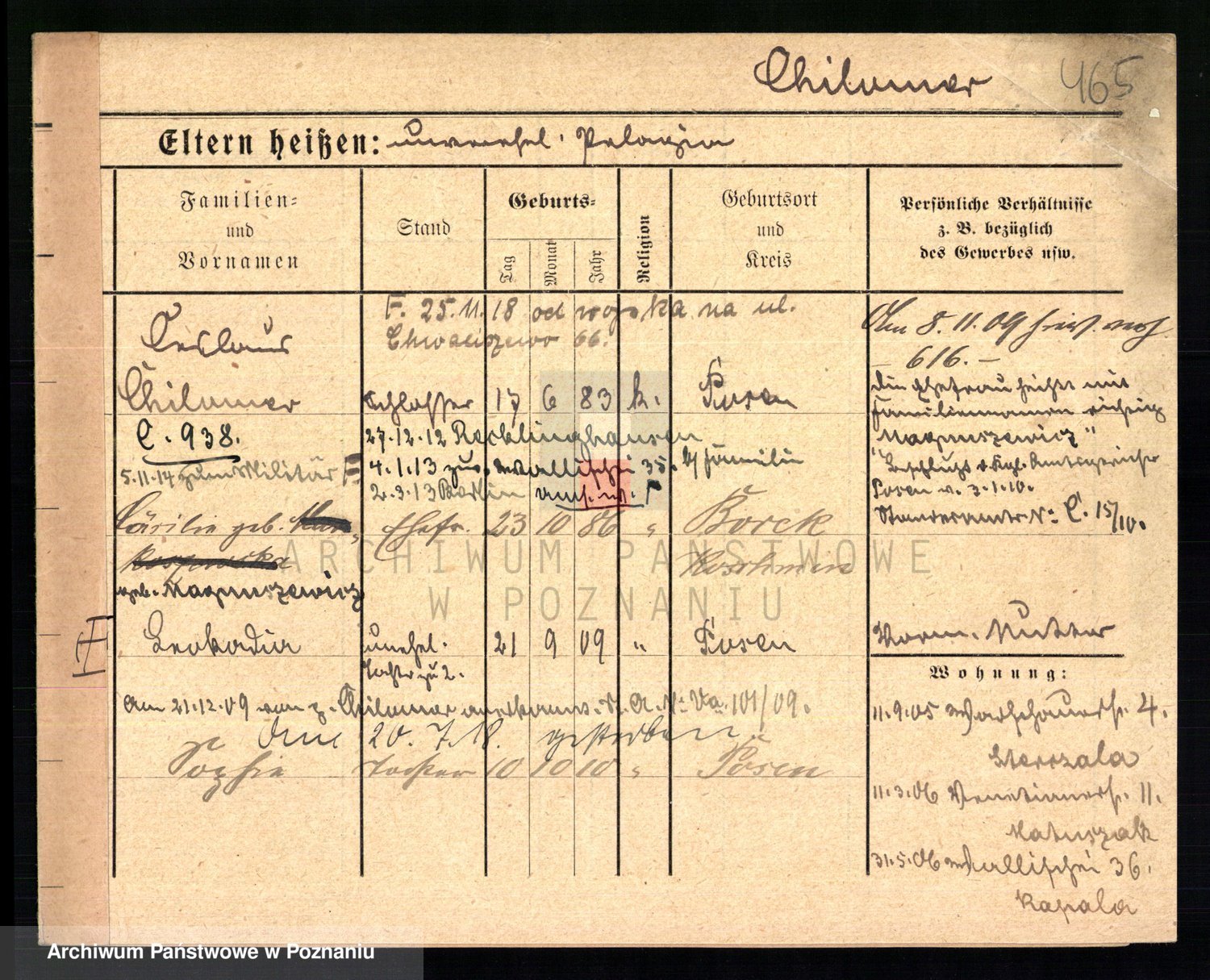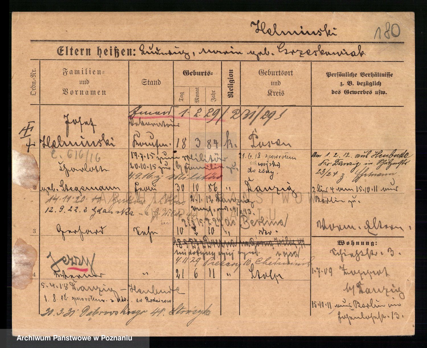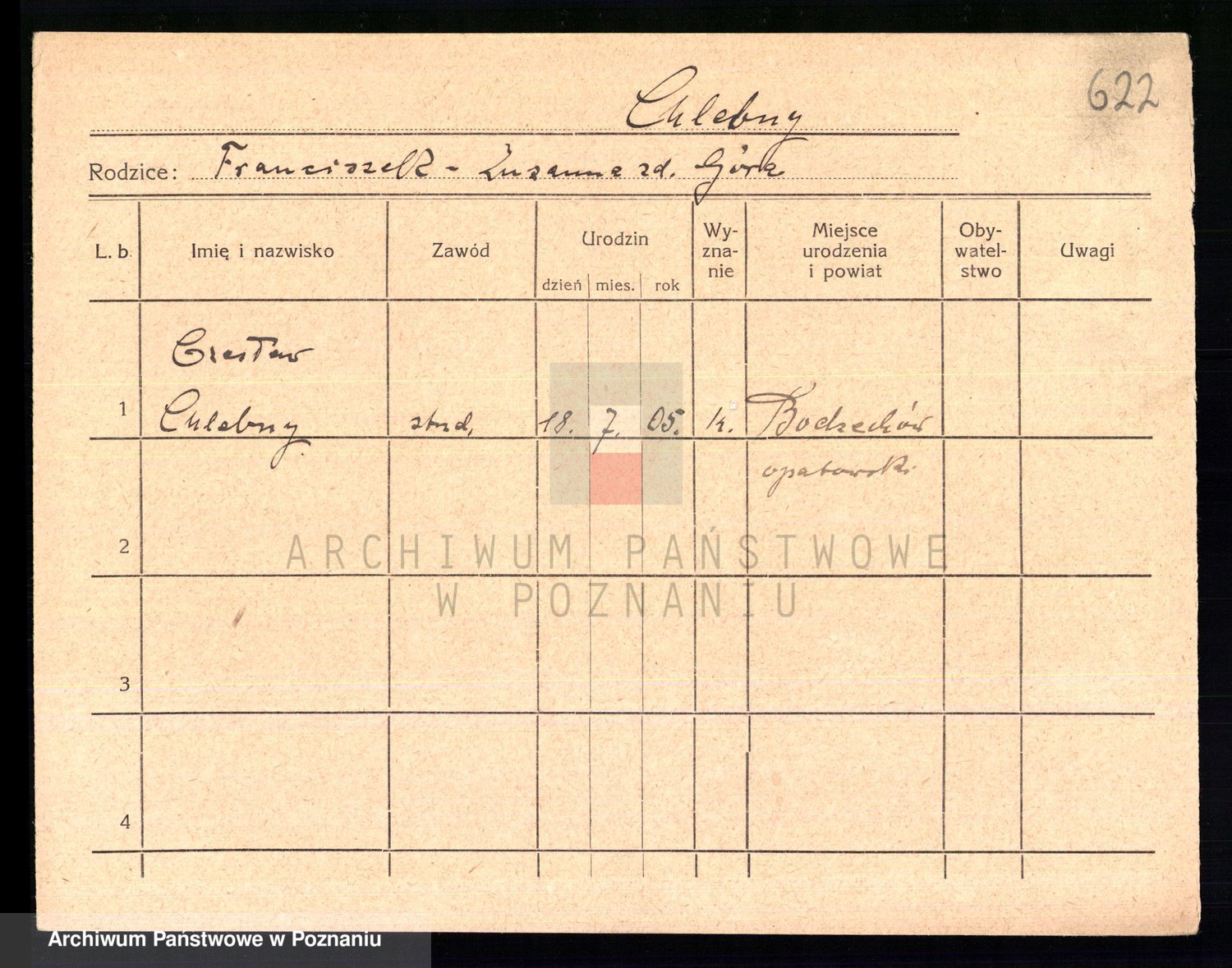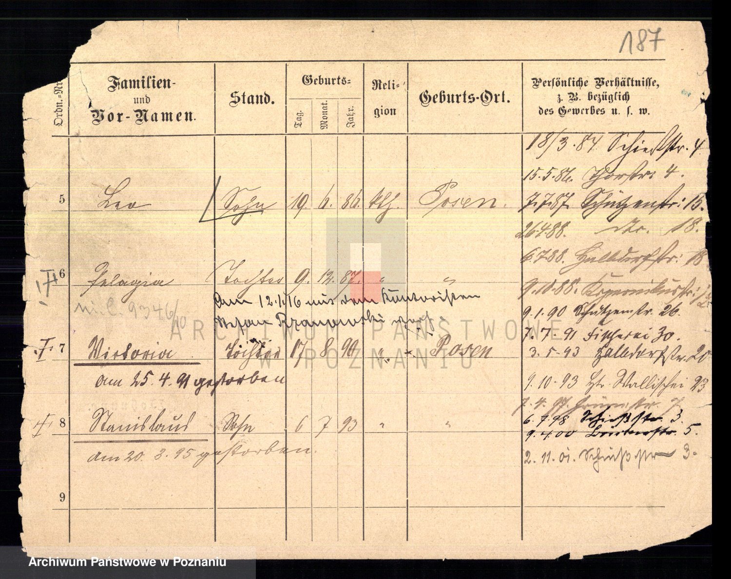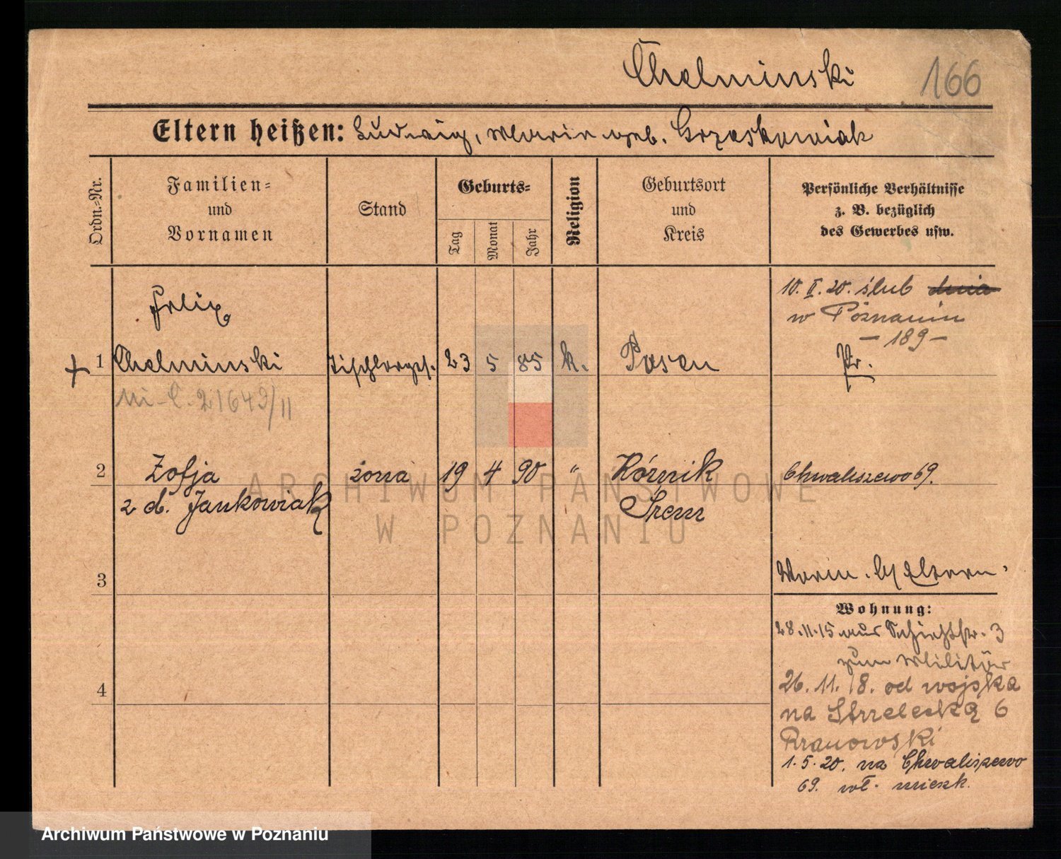 Podgląd karty osobowej dostępny jest po kliknięciu na nazwisko lub ikonkę karty. Można dokonywać powiększenia (ikony na górze) lub przechodzić między kolejnymi skanami (strzałki po bokach).