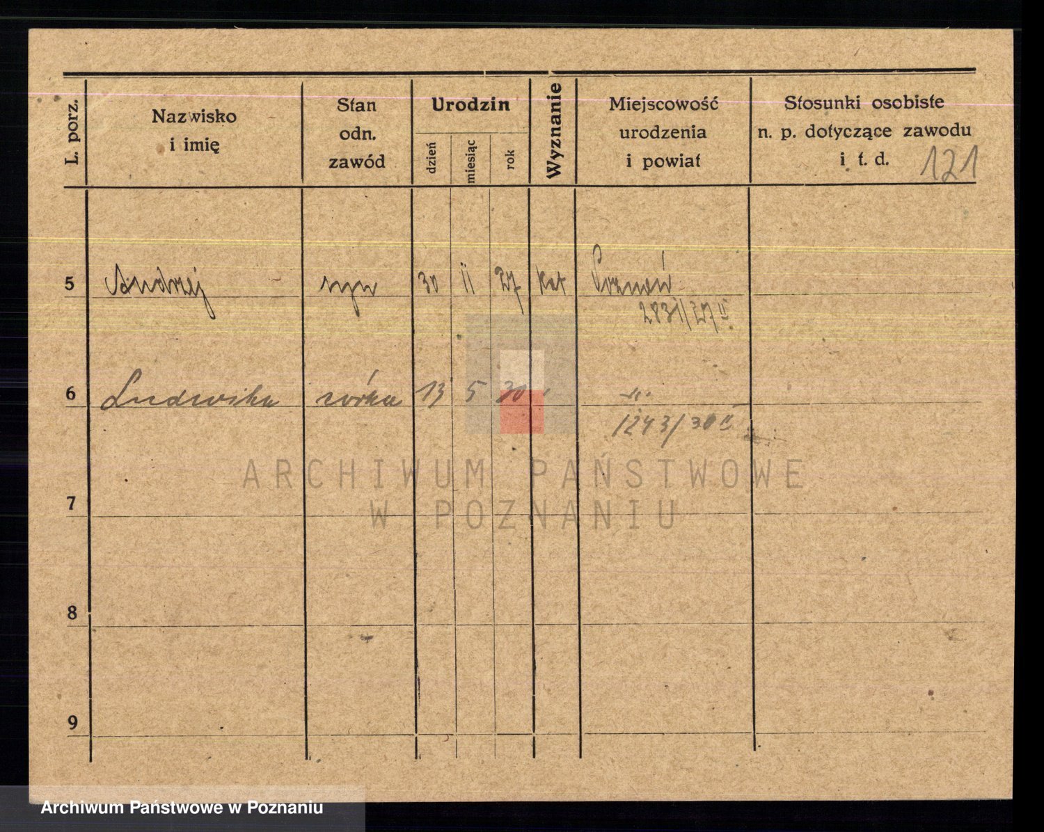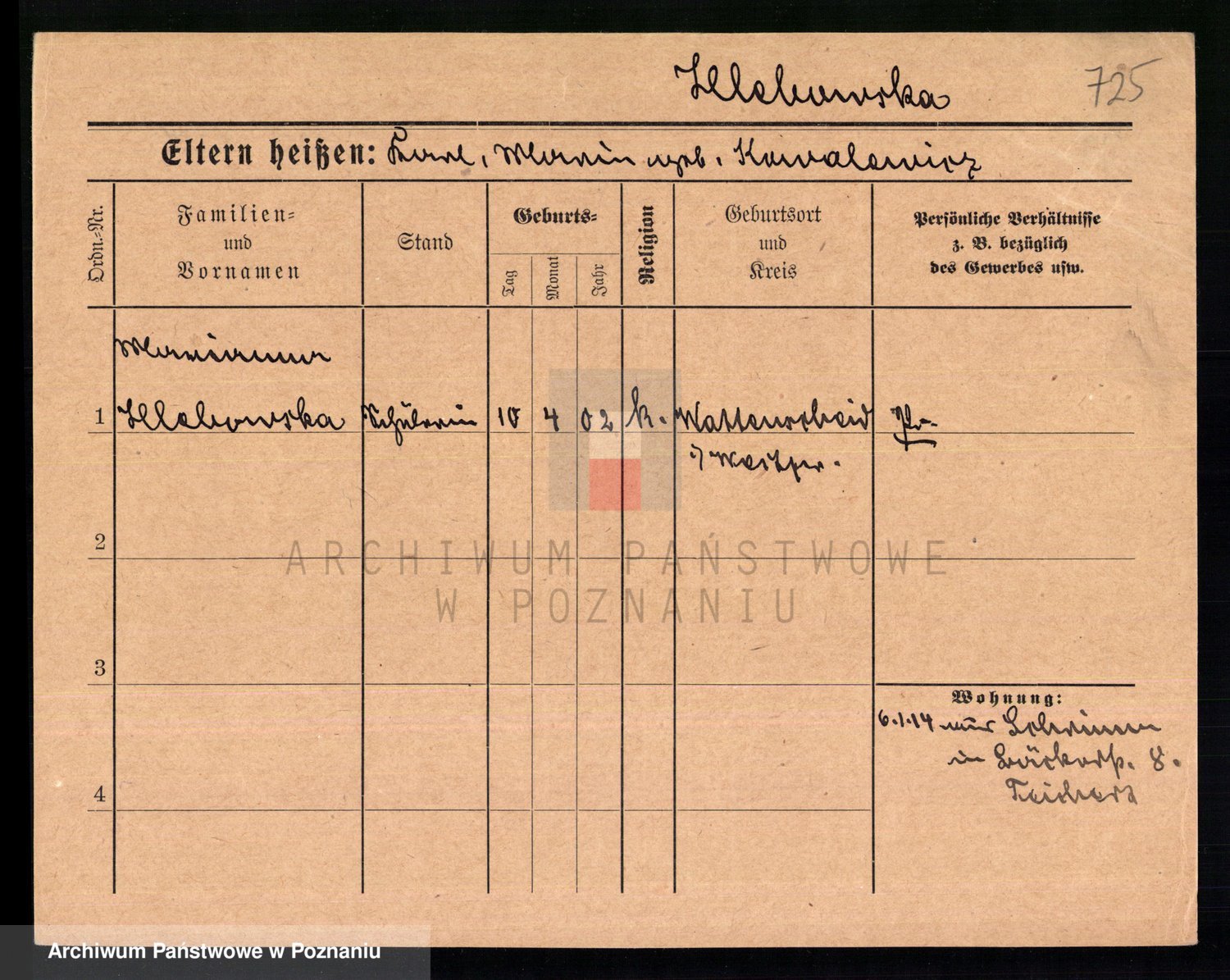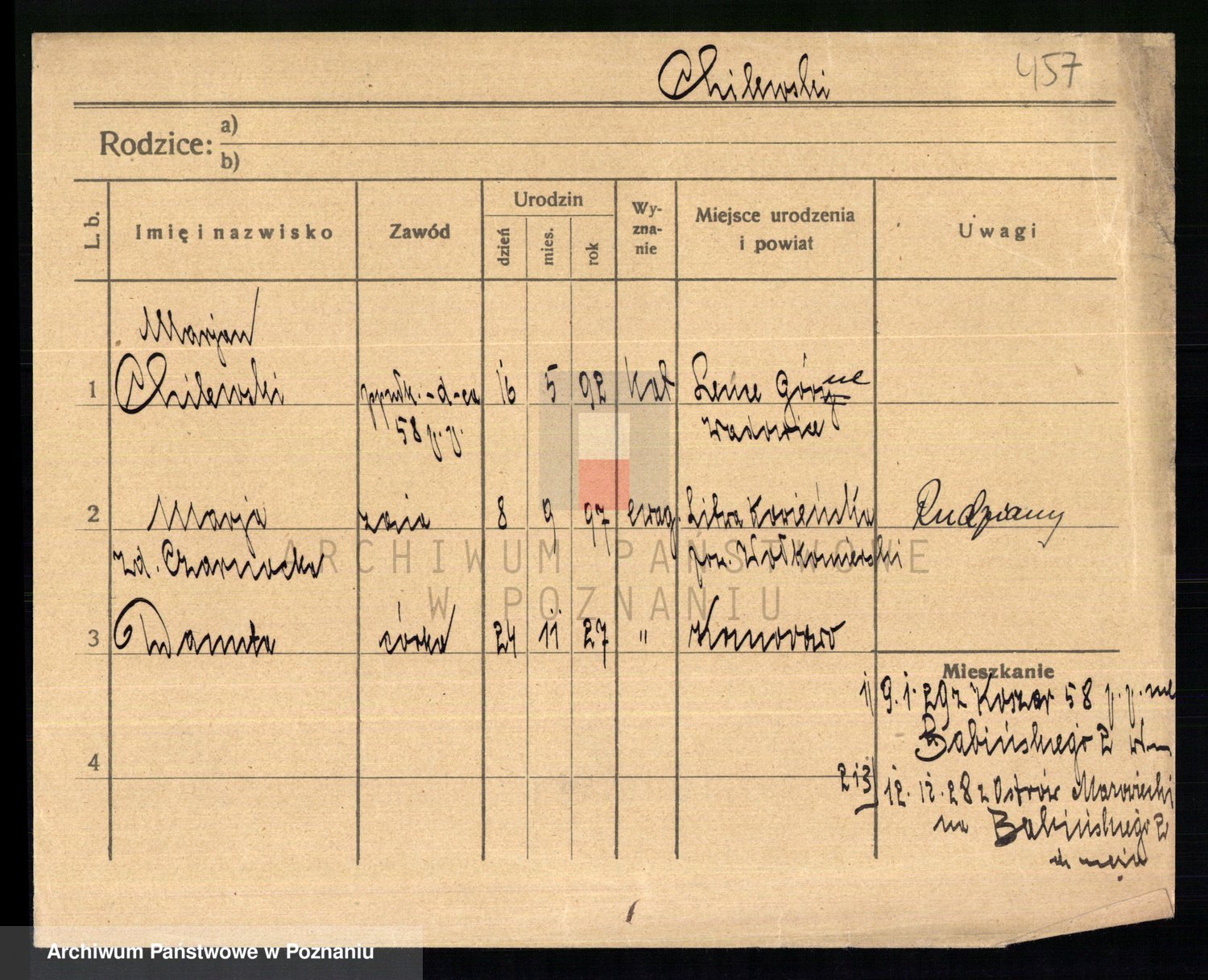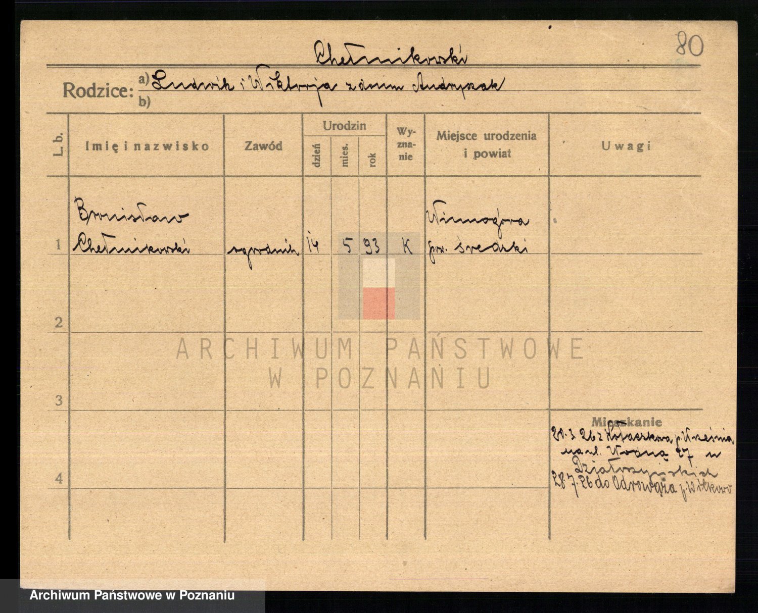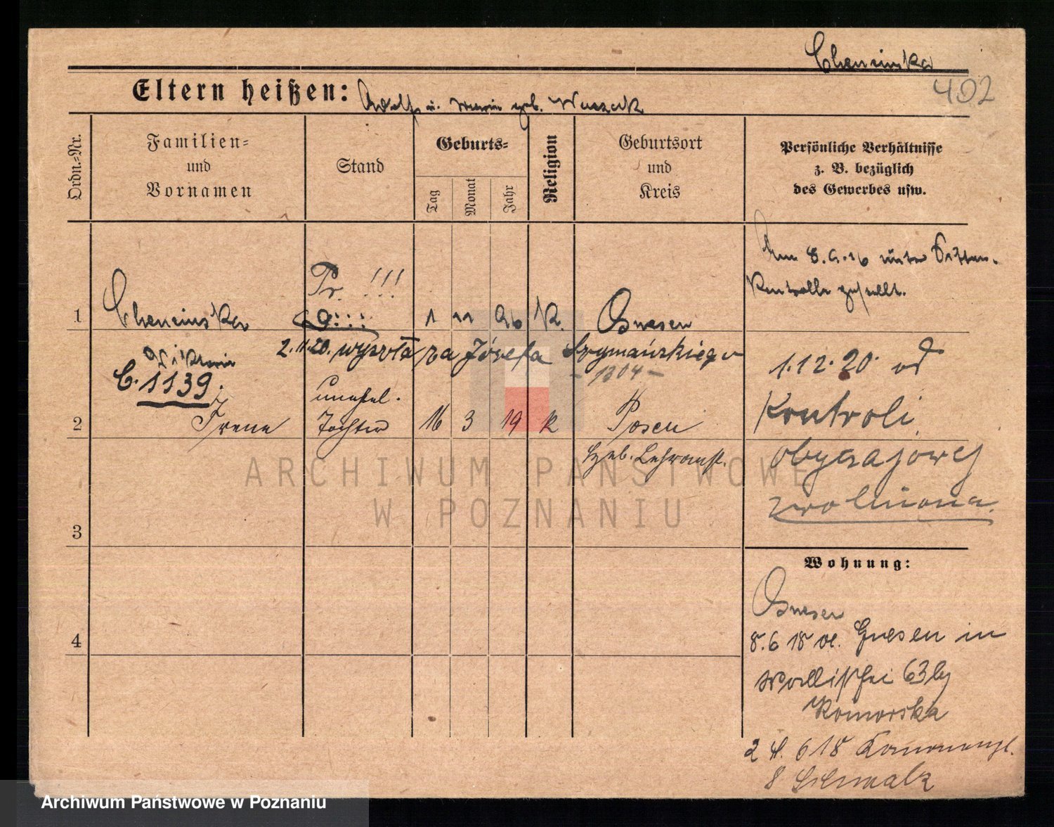 Podgląd karty osobowej dostępny jest po kliknięciu na nazwisko lub ikonkę karty. Można dokonywać powiększenia (ikony na górze) lub przechodzić między kolejnymi skanami (strzałki po bokach).