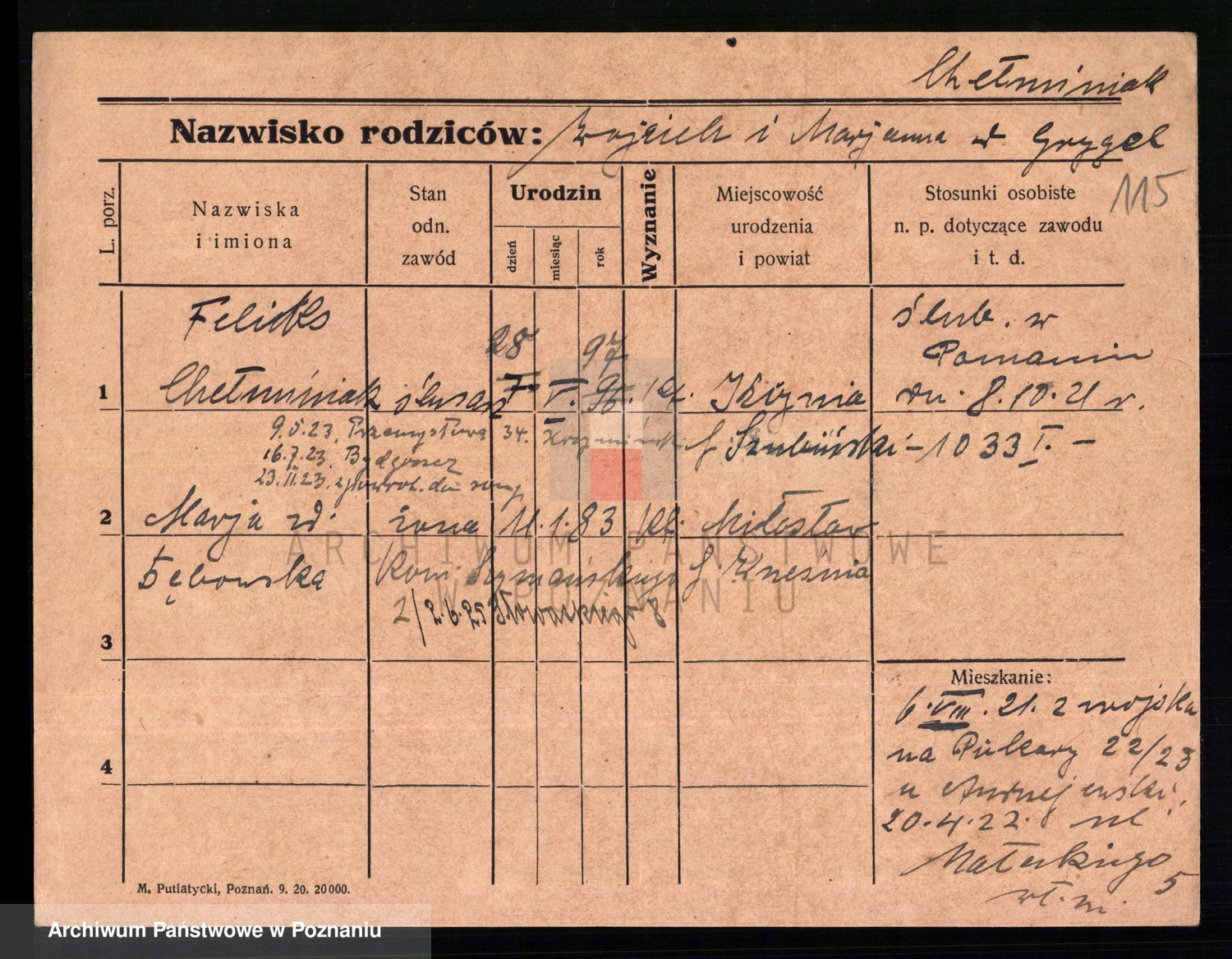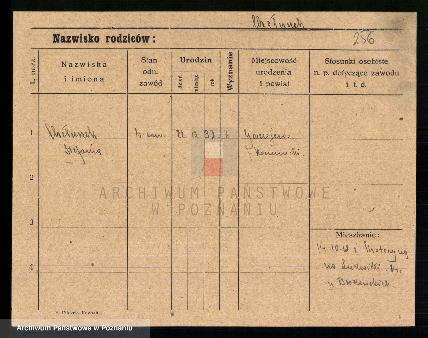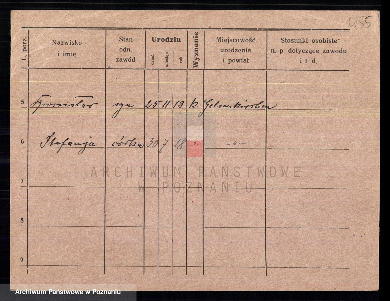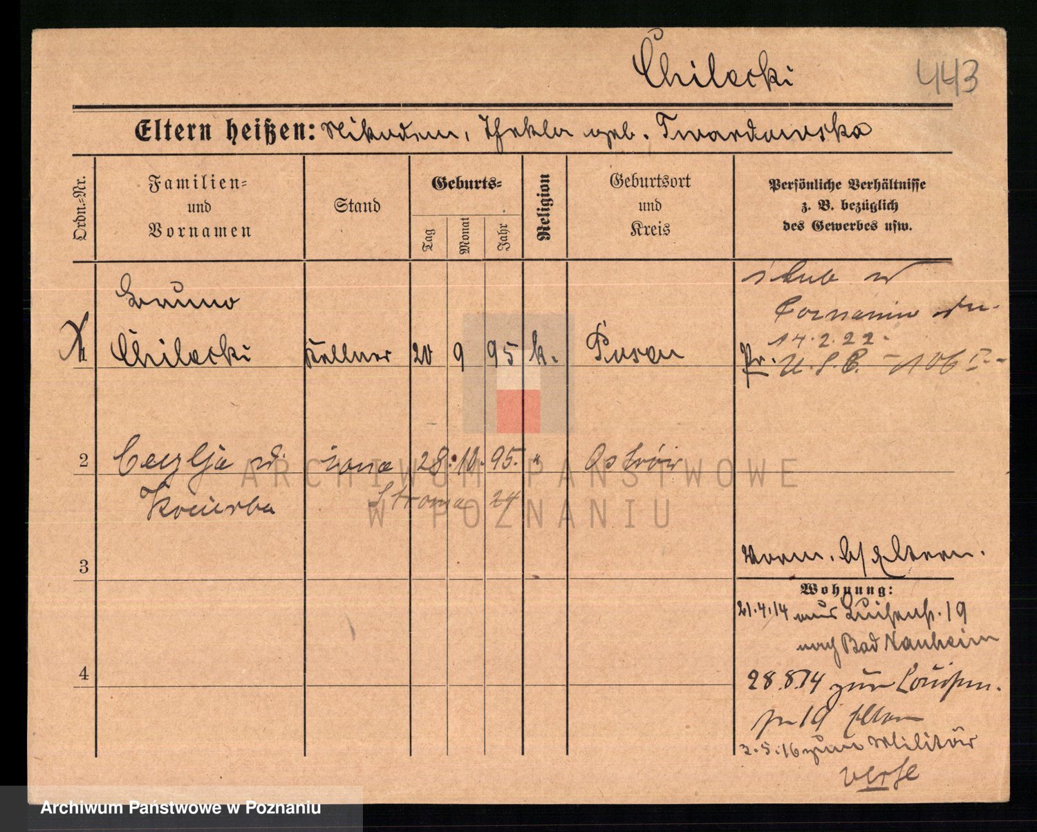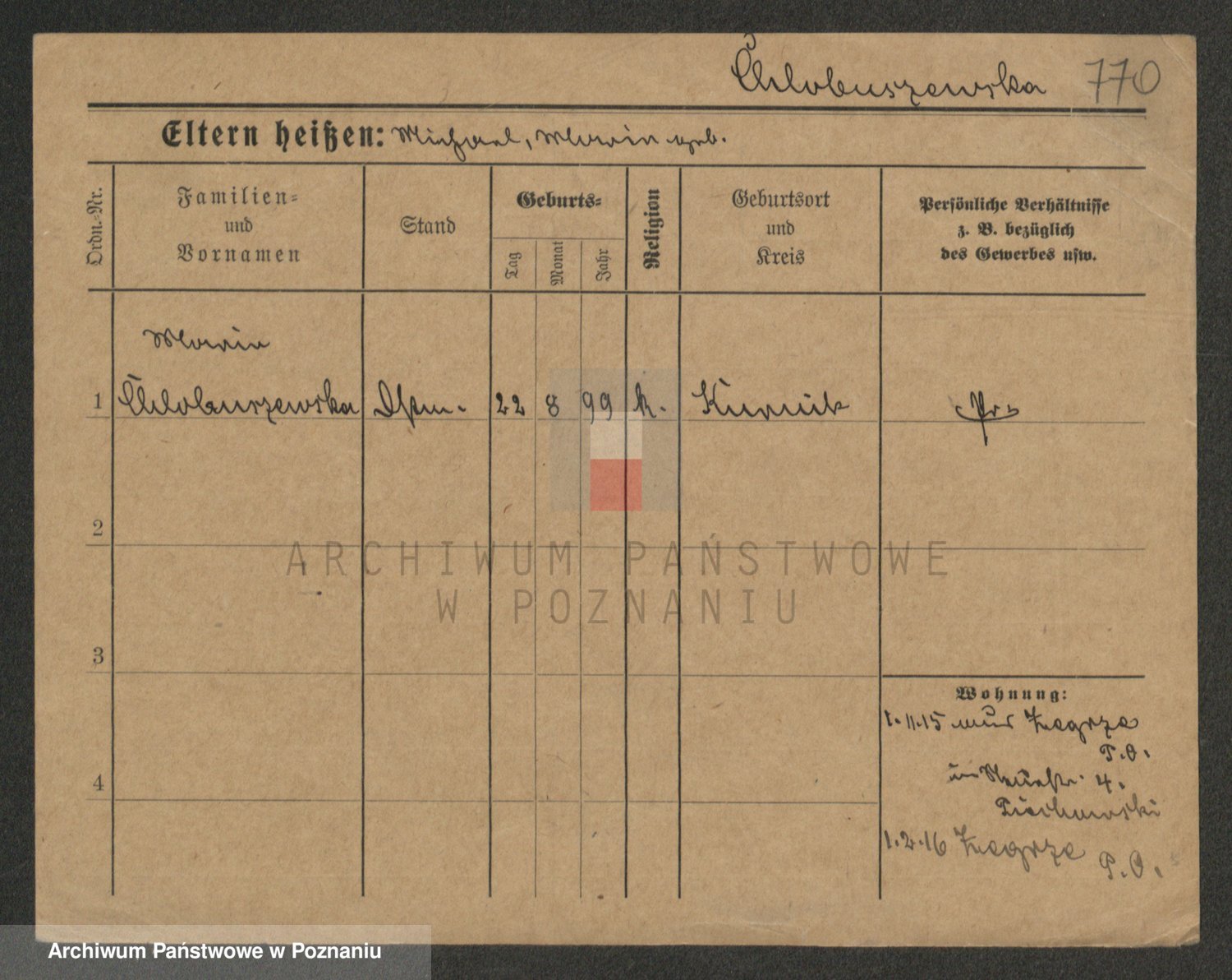 Podgląd karty osobowej dostępny jest po kliknięciu na nazwisko lub ikonkę karty. Można dokonywać powiększenia (ikony na górze) lub przechodzić między kolejnymi skanami (strzałki po bokach).