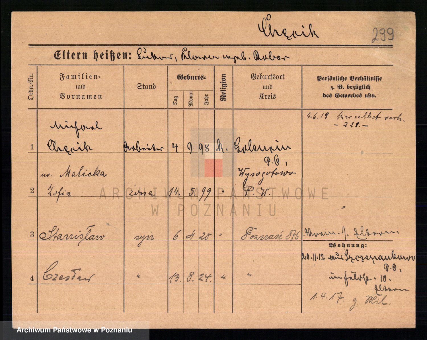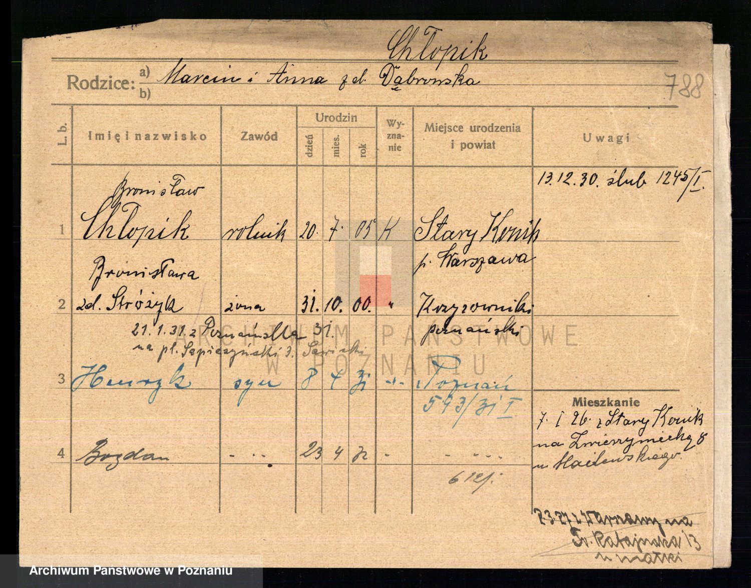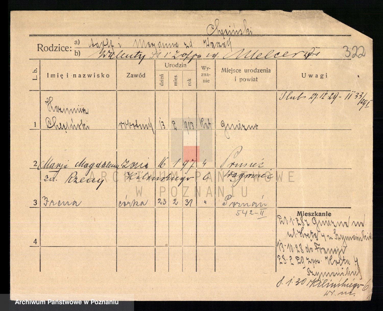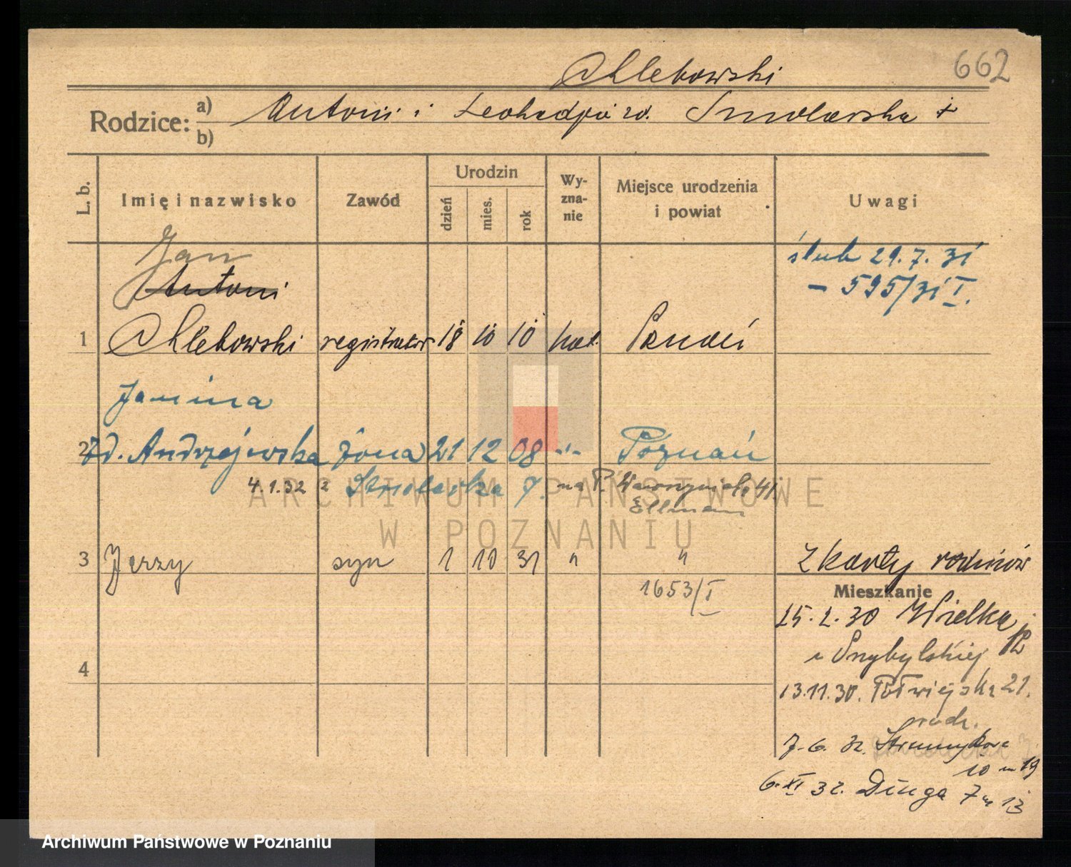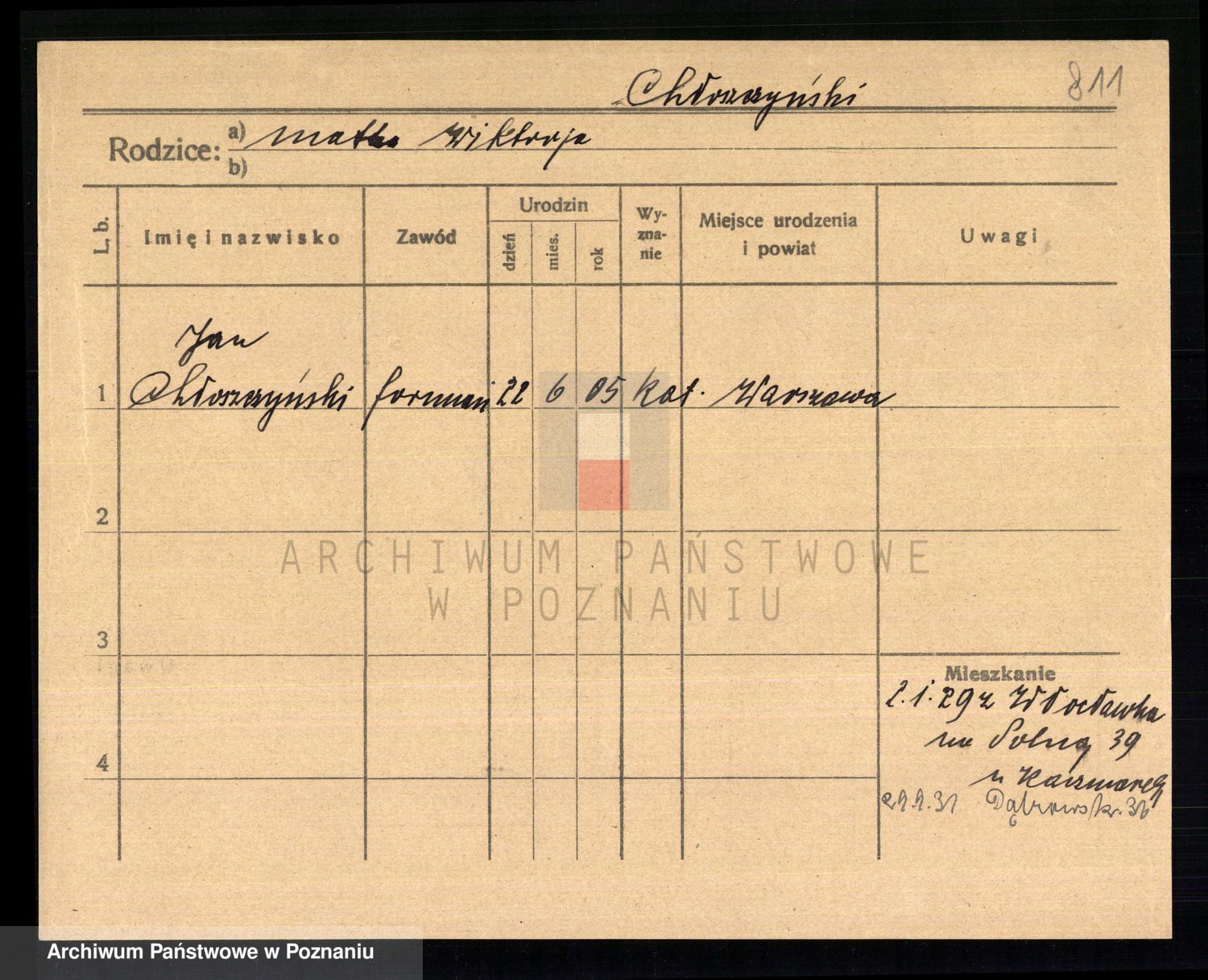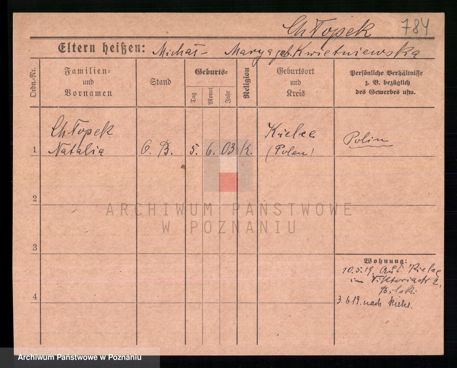 Podgląd karty osobowej dostępny jest po kliknięciu na nazwisko lub ikonkę karty. Można dokonywać powiększenia (ikony na górze) lub przechodzić między kolejnymi skanami (strzałki po bokach).