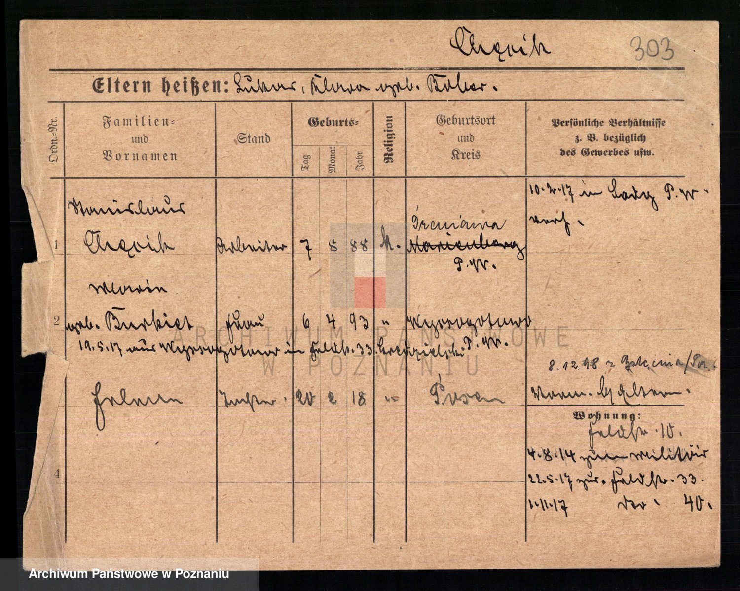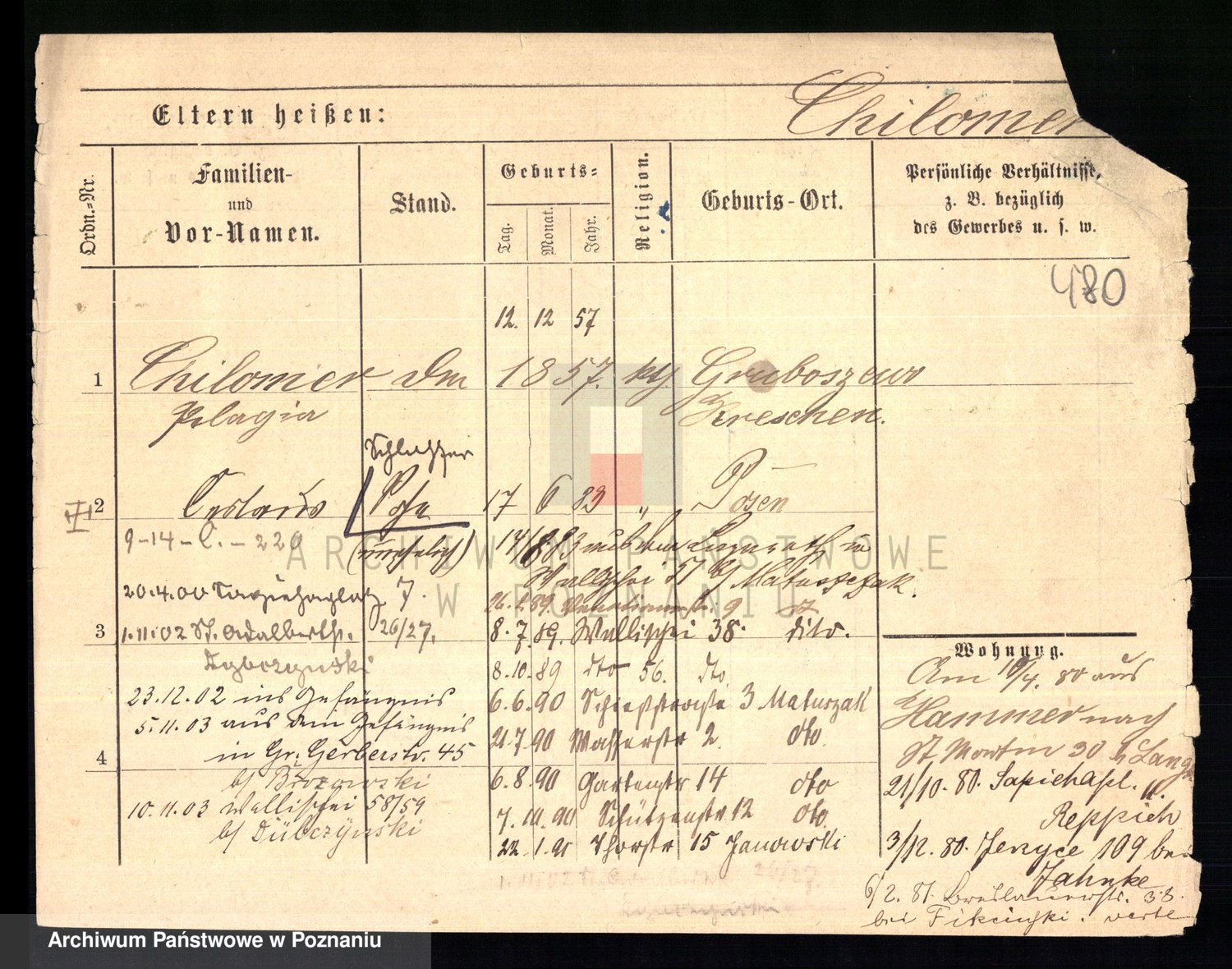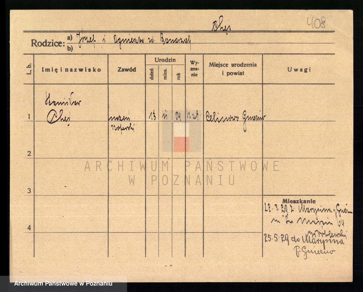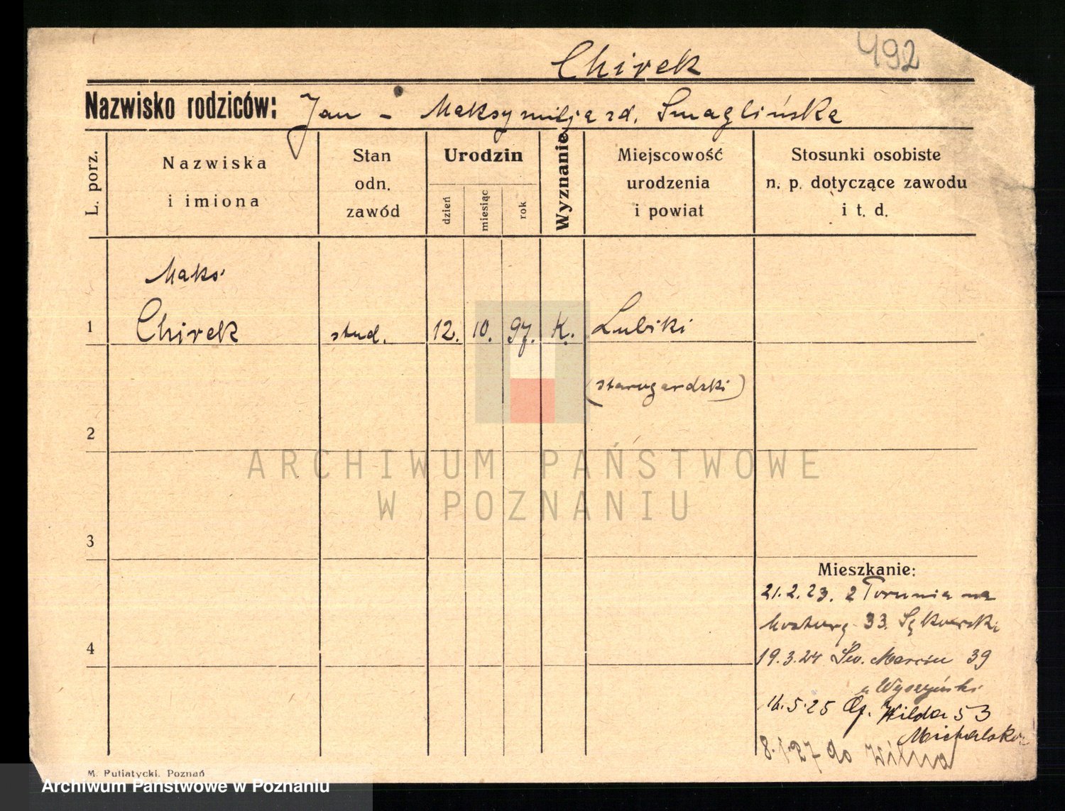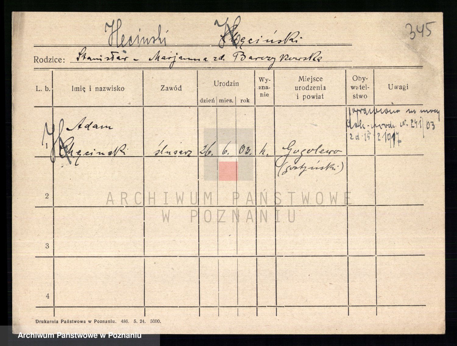 Podgląd karty osobowej dostępny jest po kliknięciu na nazwisko lub ikonkę karty. Można dokonywać powiększenia (ikony na górze) lub przechodzić między kolejnymi skanami (strzałki po bokach).