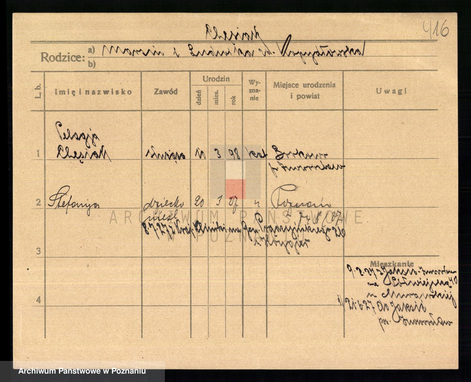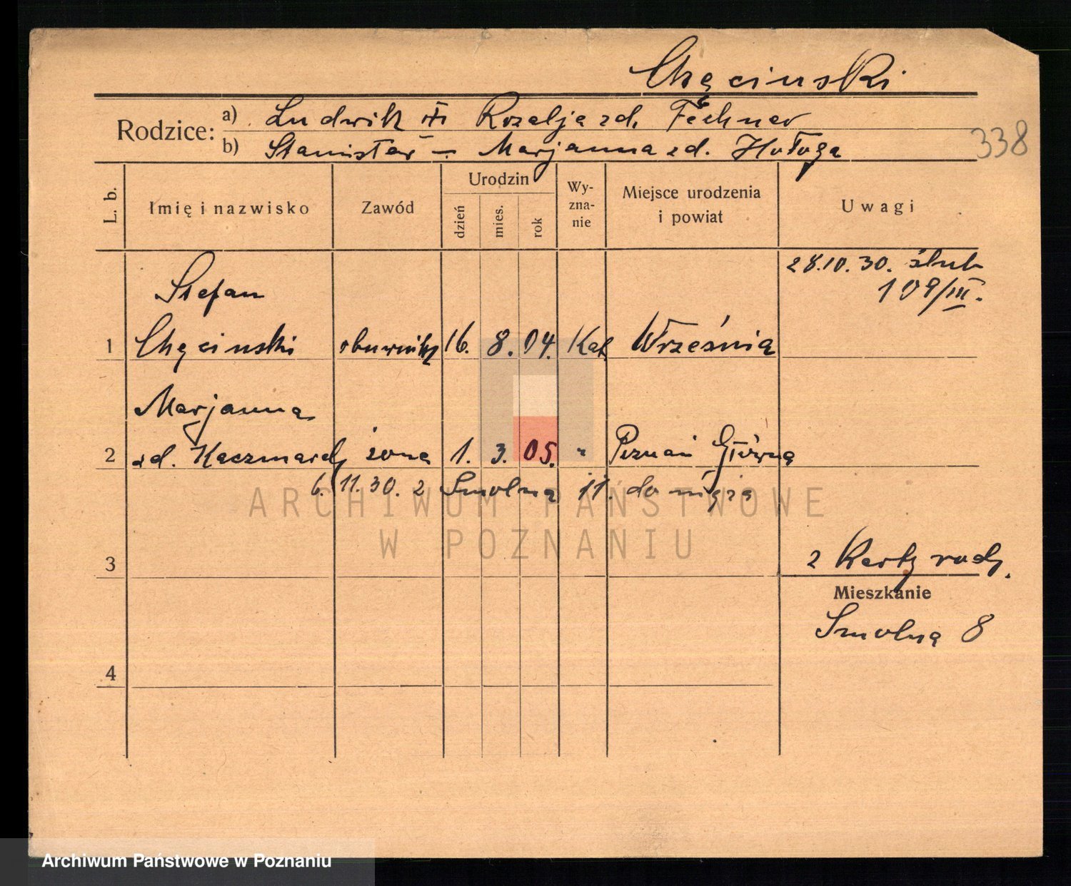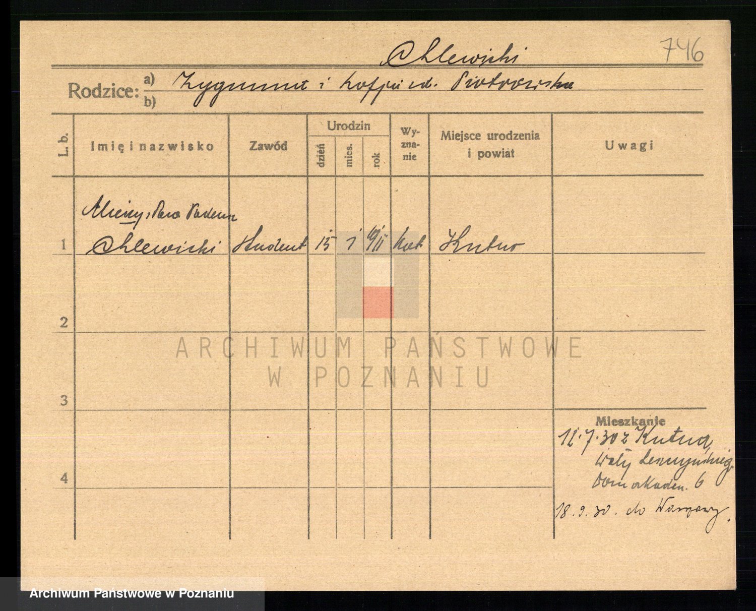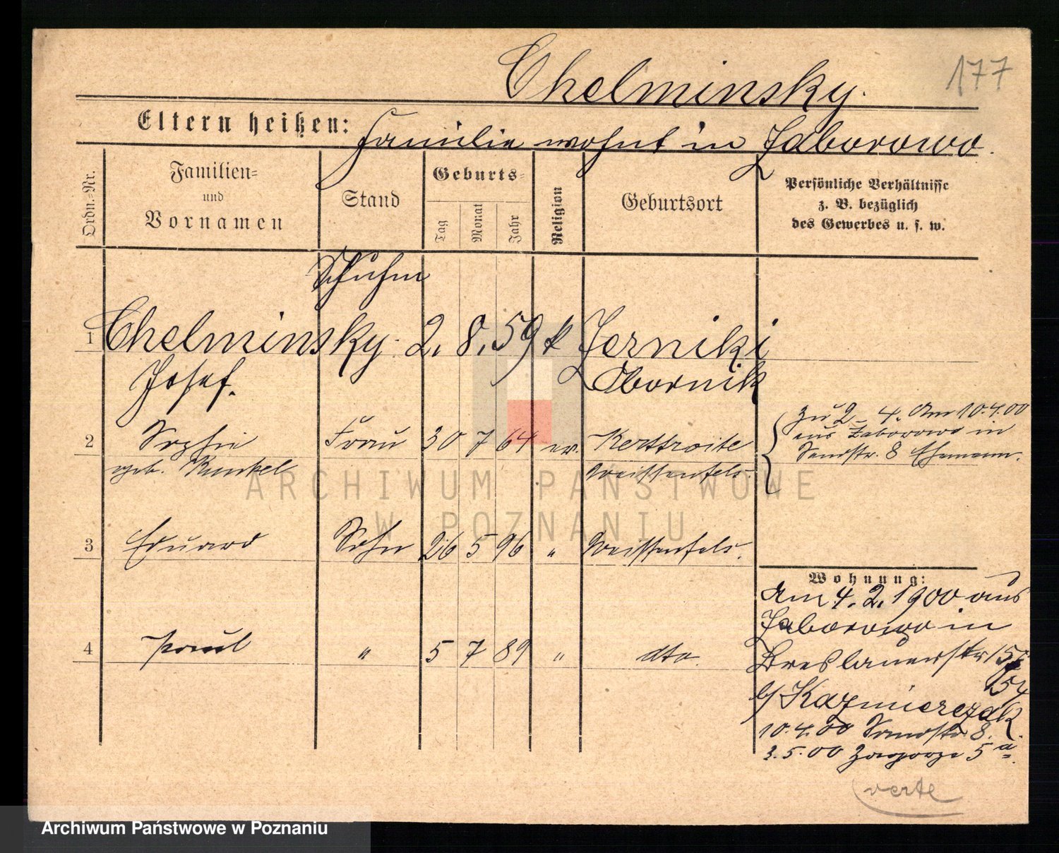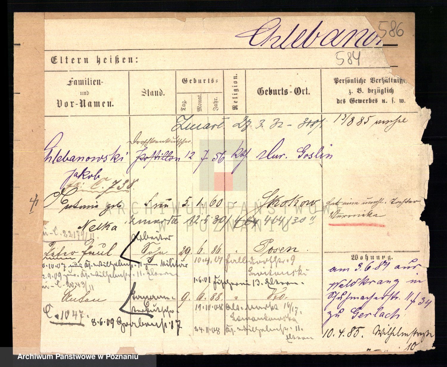 Podgląd karty osobowej dostępny jest po kliknięciu na nazwisko lub ikonkę karty. Można dokonywać powiększenia (ikony na górze) lub przechodzić między kolejnymi skanami (strzałki po bokach).