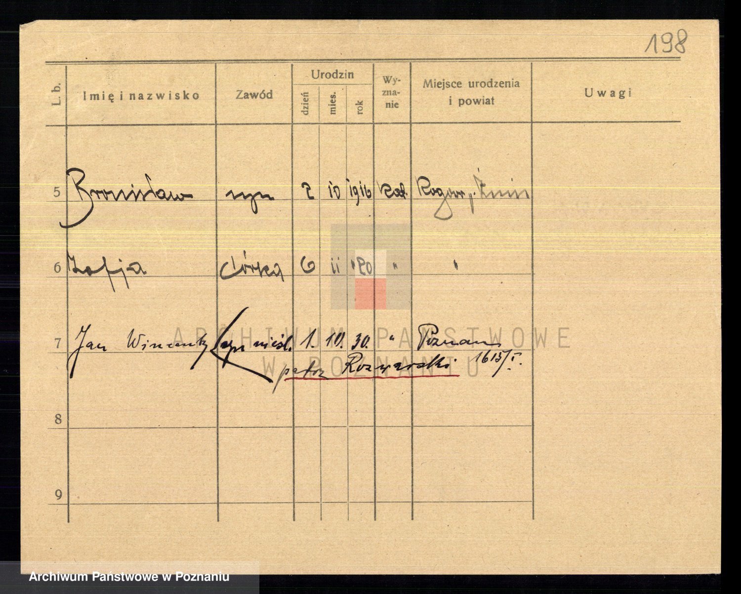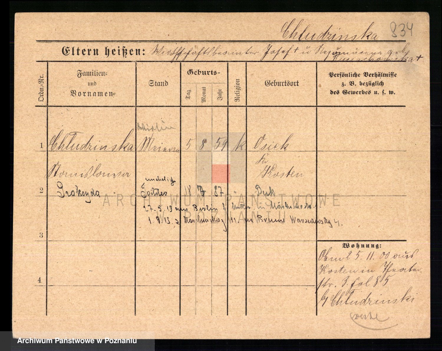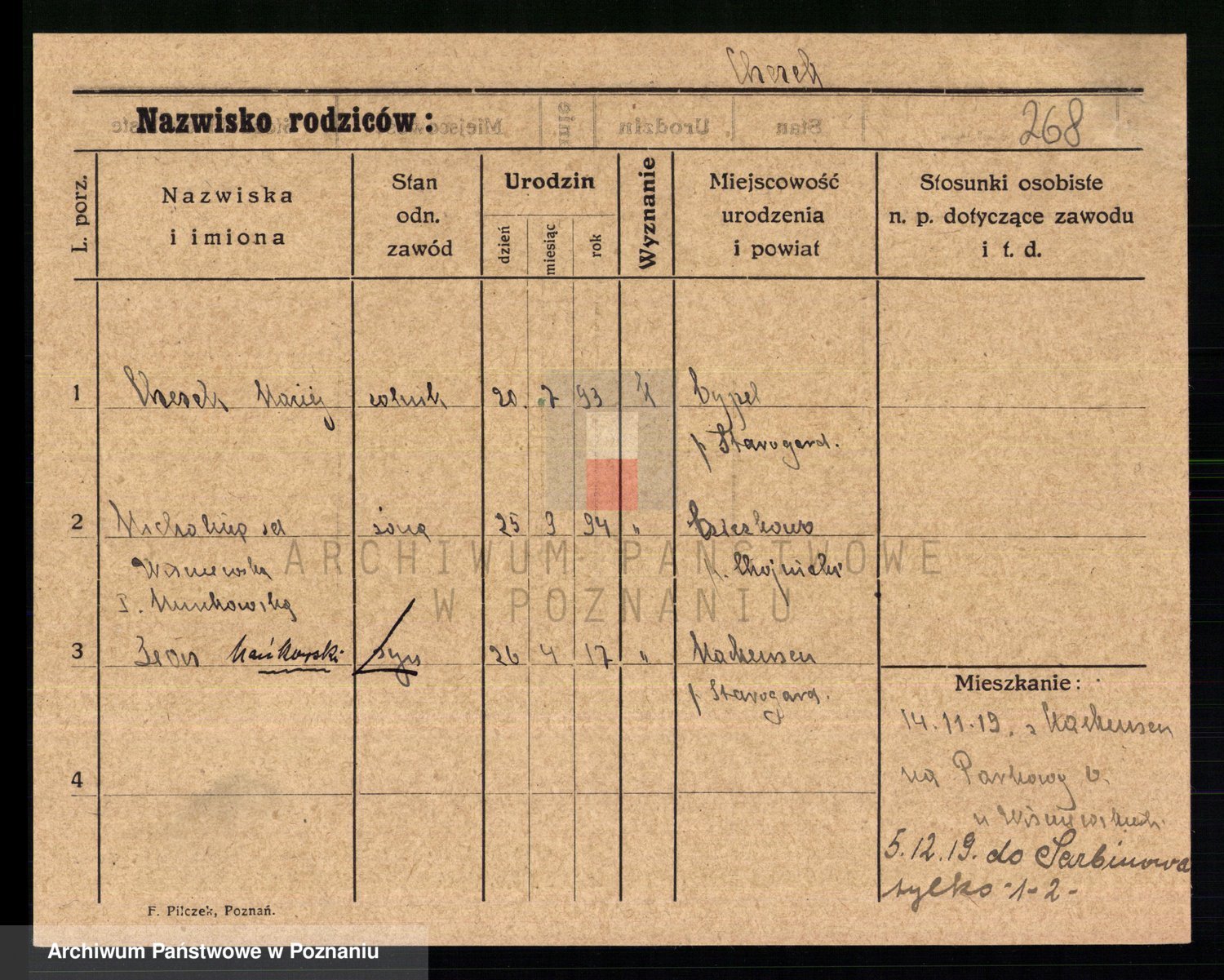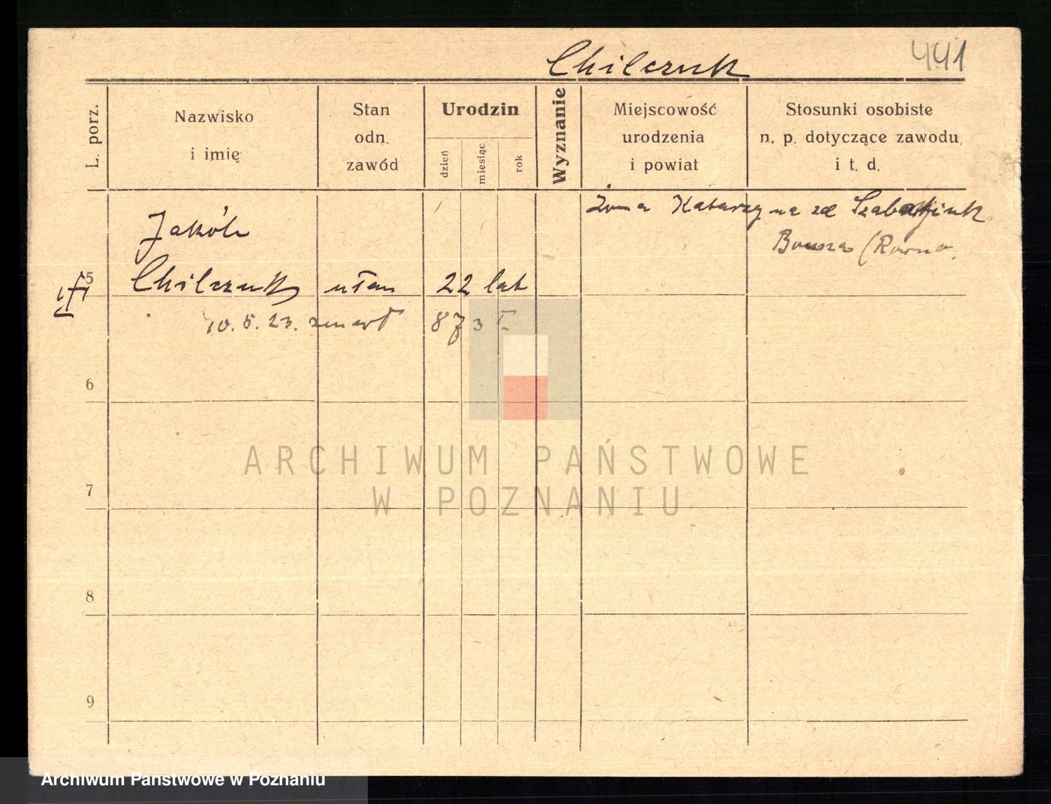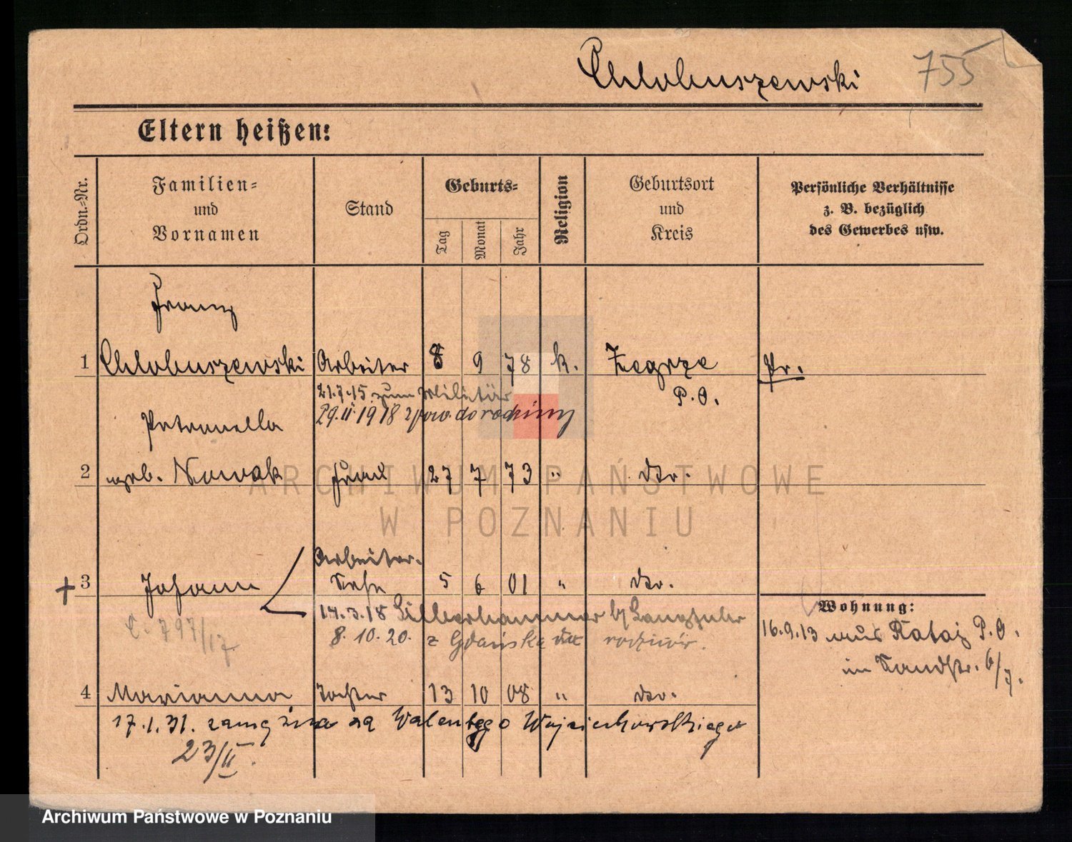 Podgląd karty osobowej dostępny jest po kliknięciu na nazwisko lub ikonkę karty. Można dokonywać powiększenia (ikony na górze) lub przechodzić między kolejnymi skanami (strzałki po bokach).