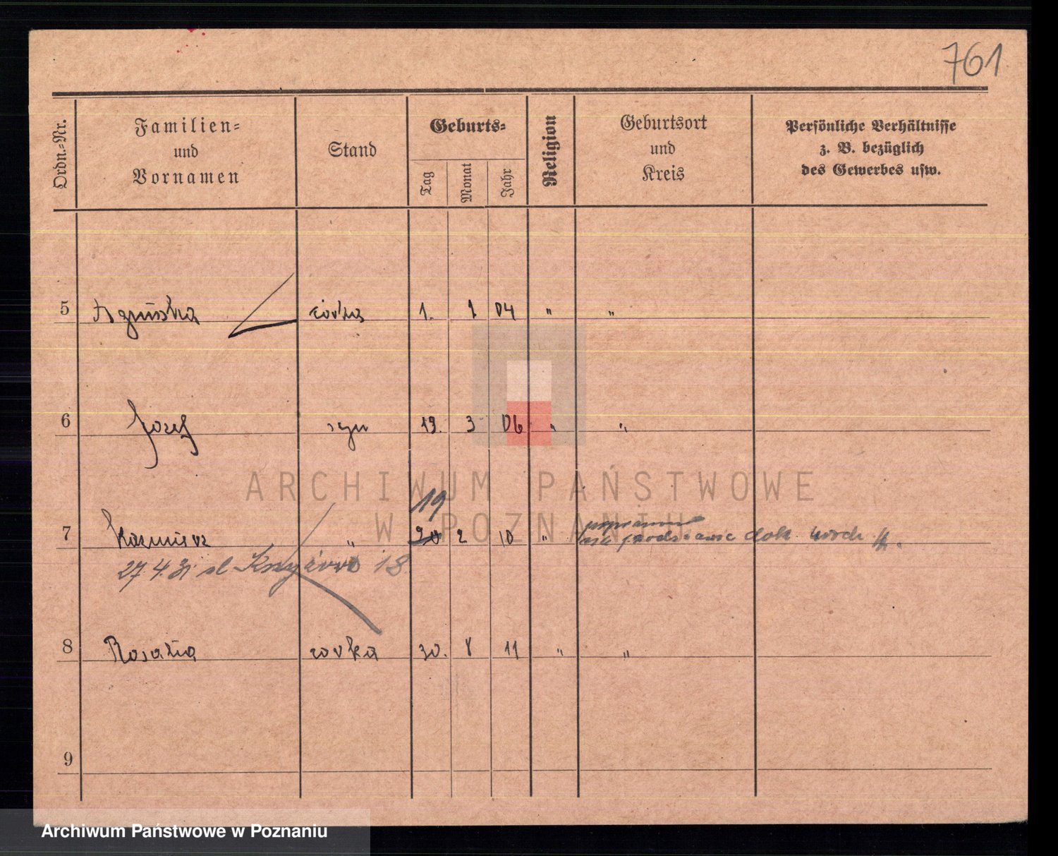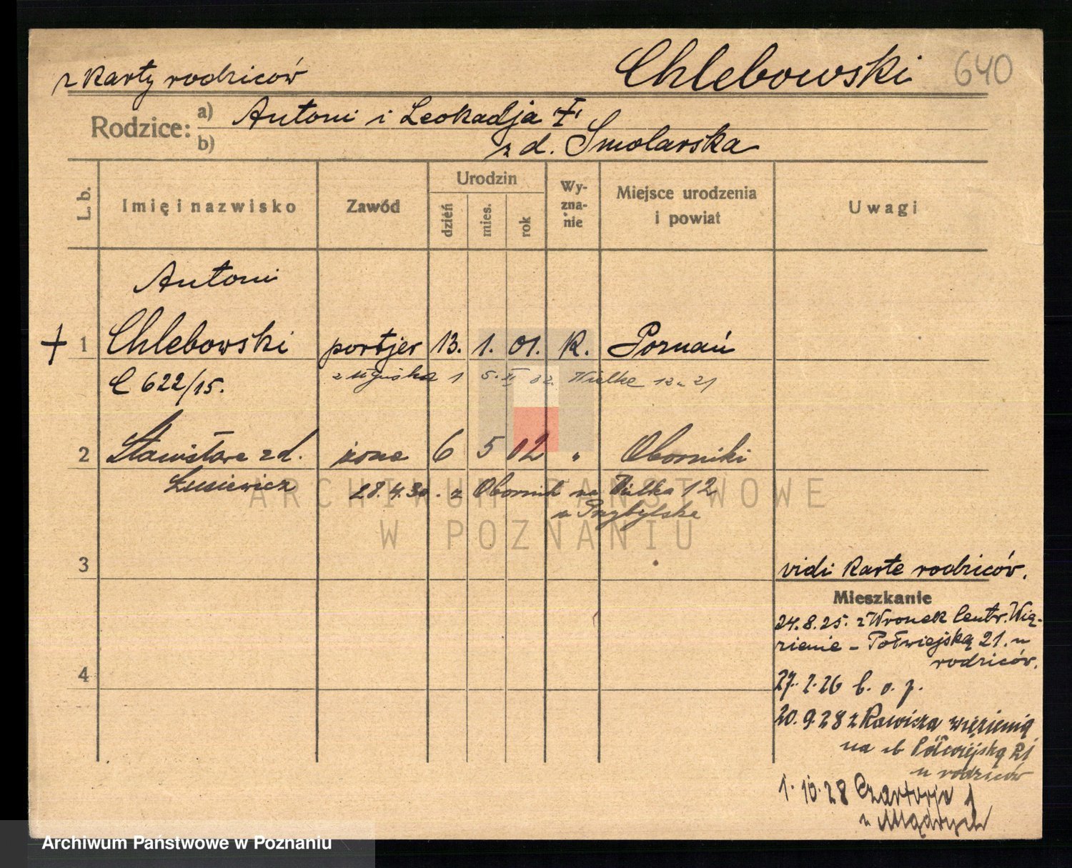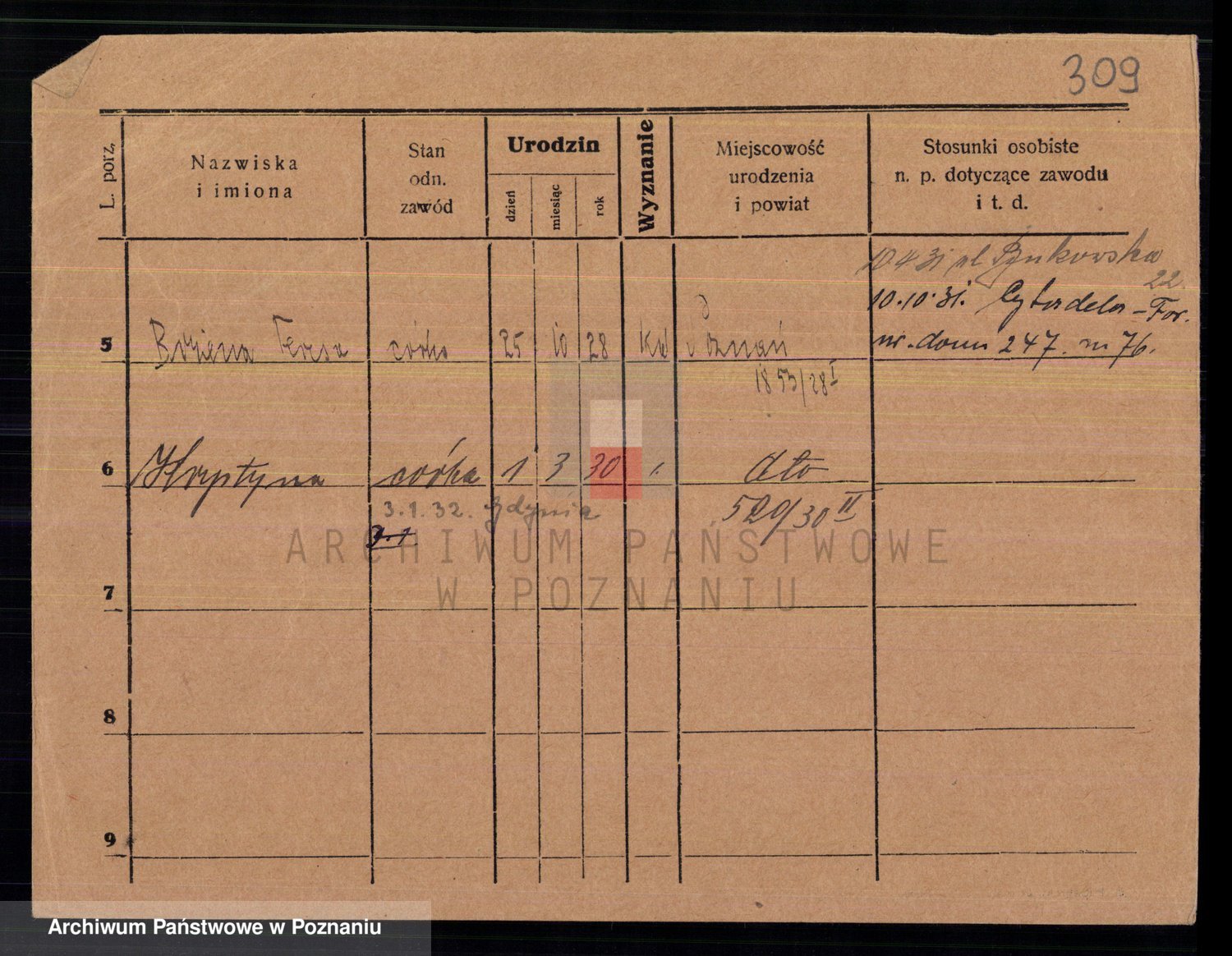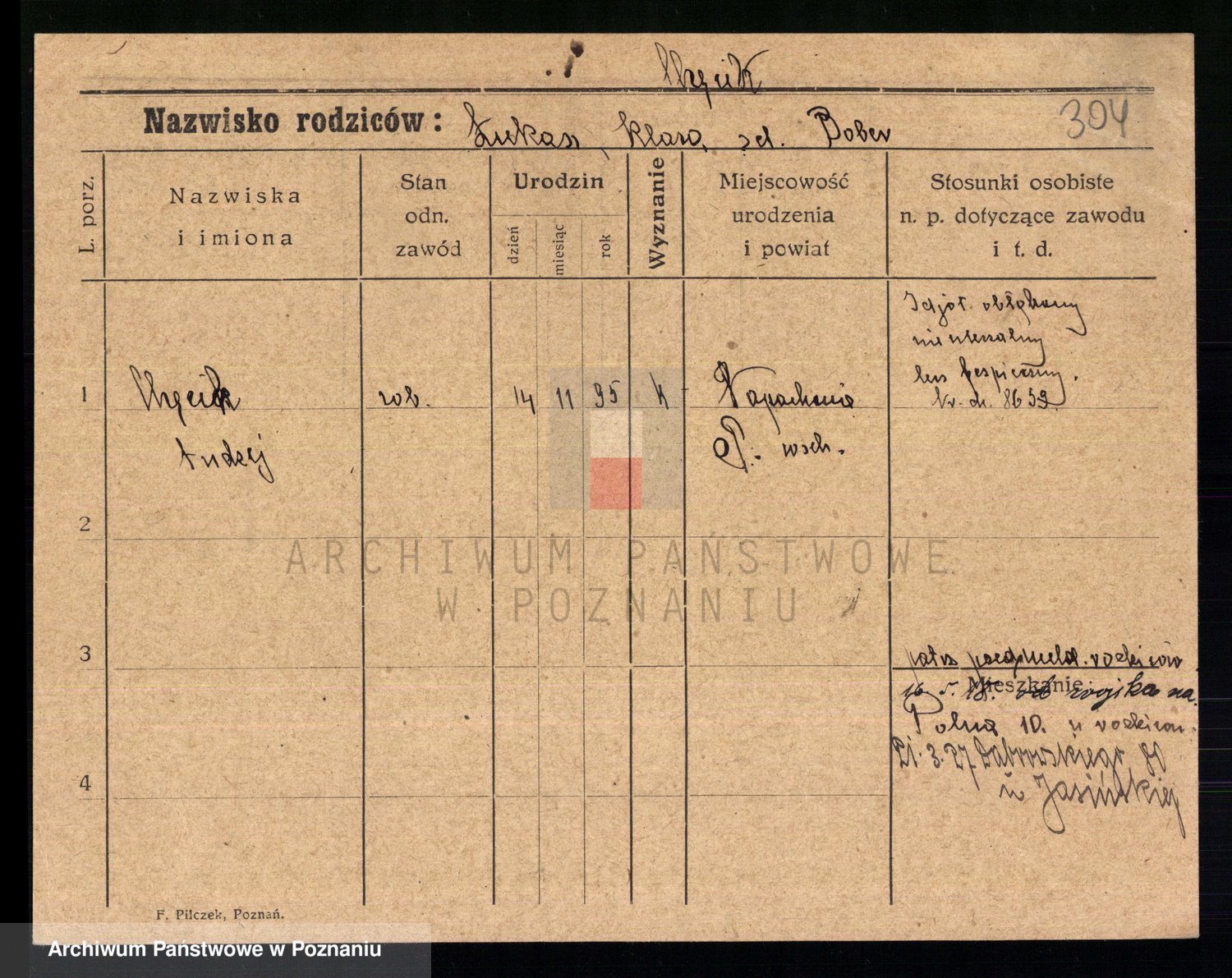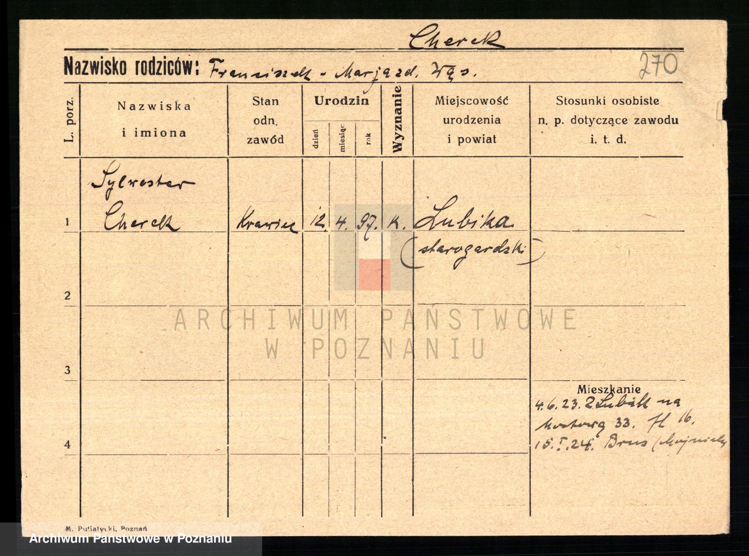 Podgląd karty osobowej dostępny jest po kliknięciu na nazwisko lub ikonkę karty. Można dokonywać powiększenia (ikony na górze) lub przechodzić między kolejnymi skanami (strzałki po bokach).