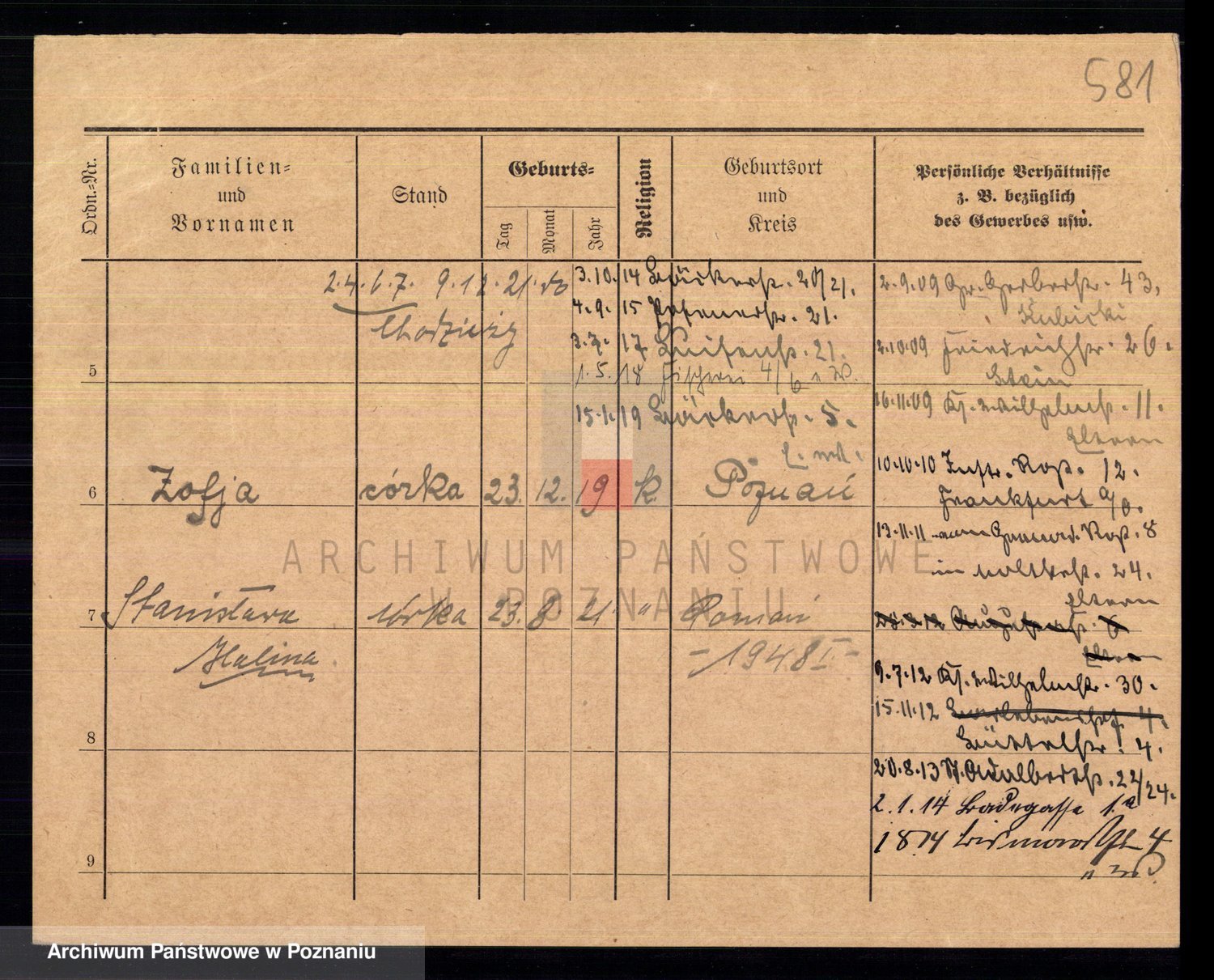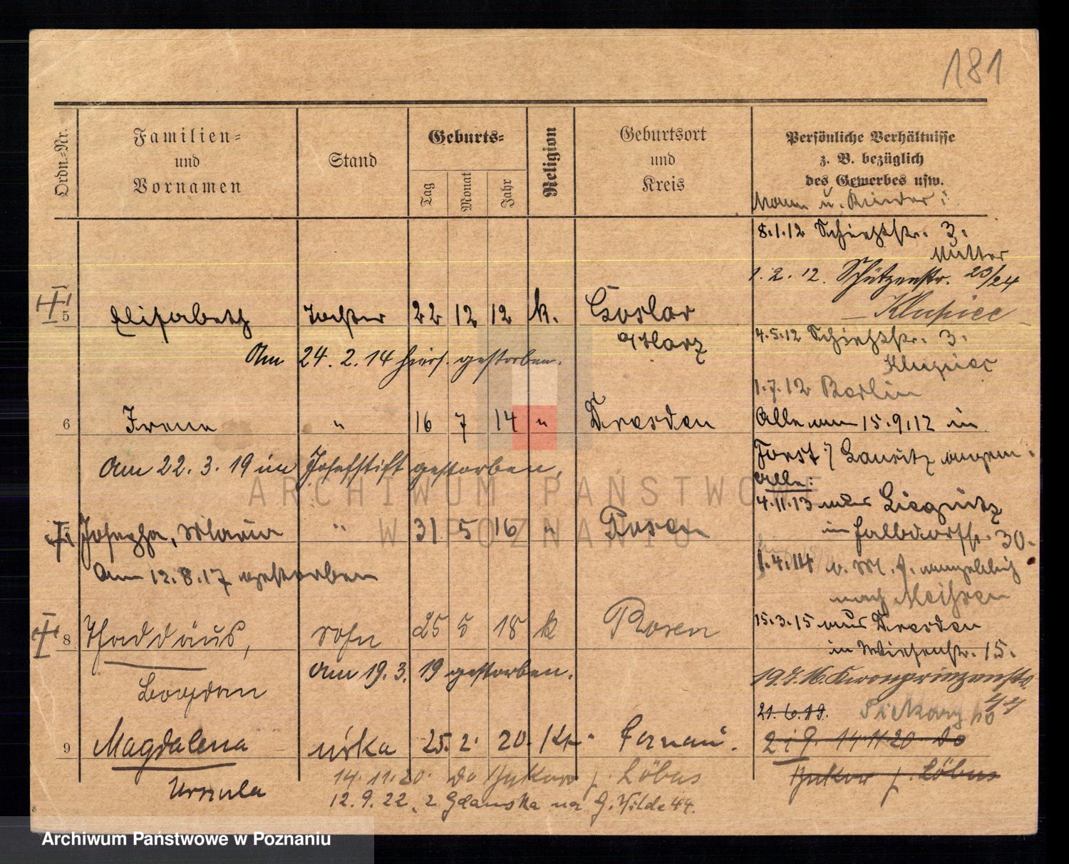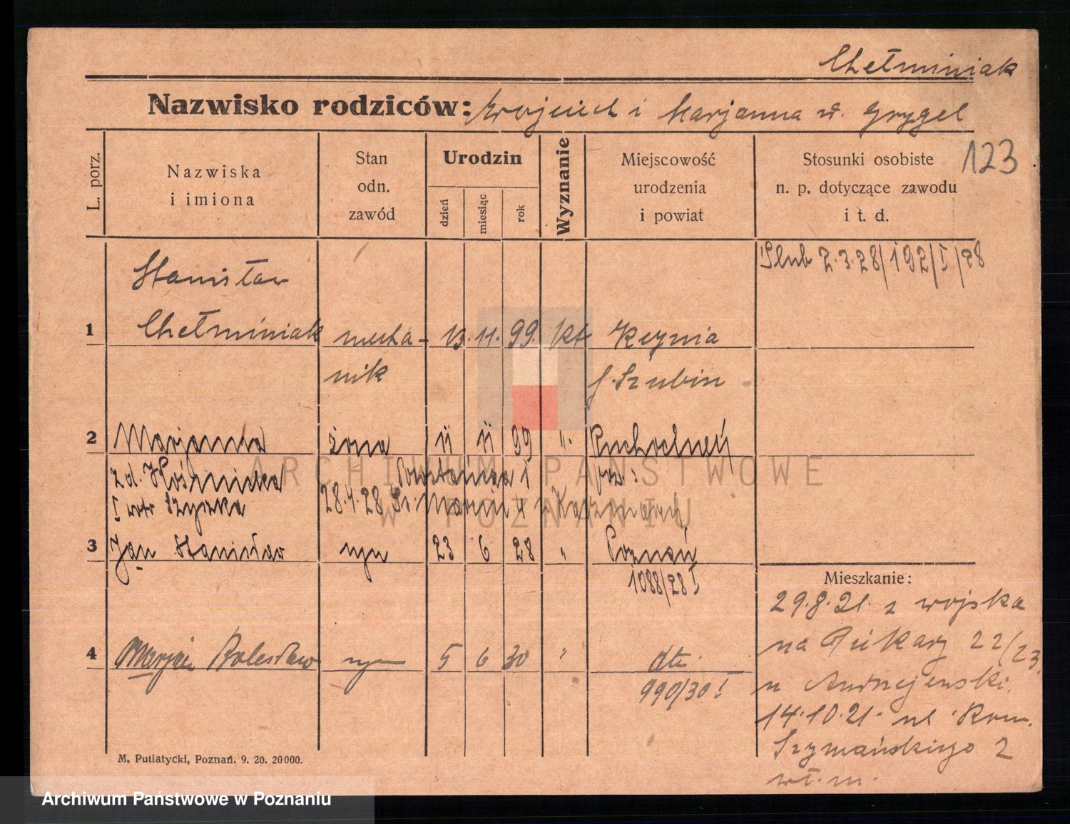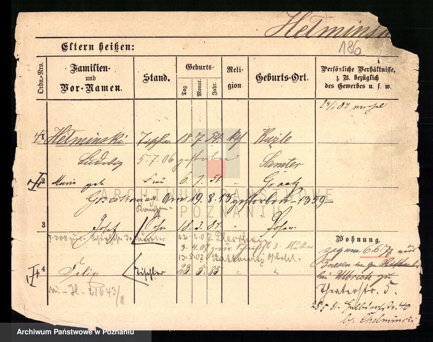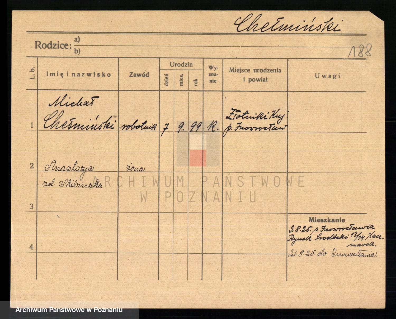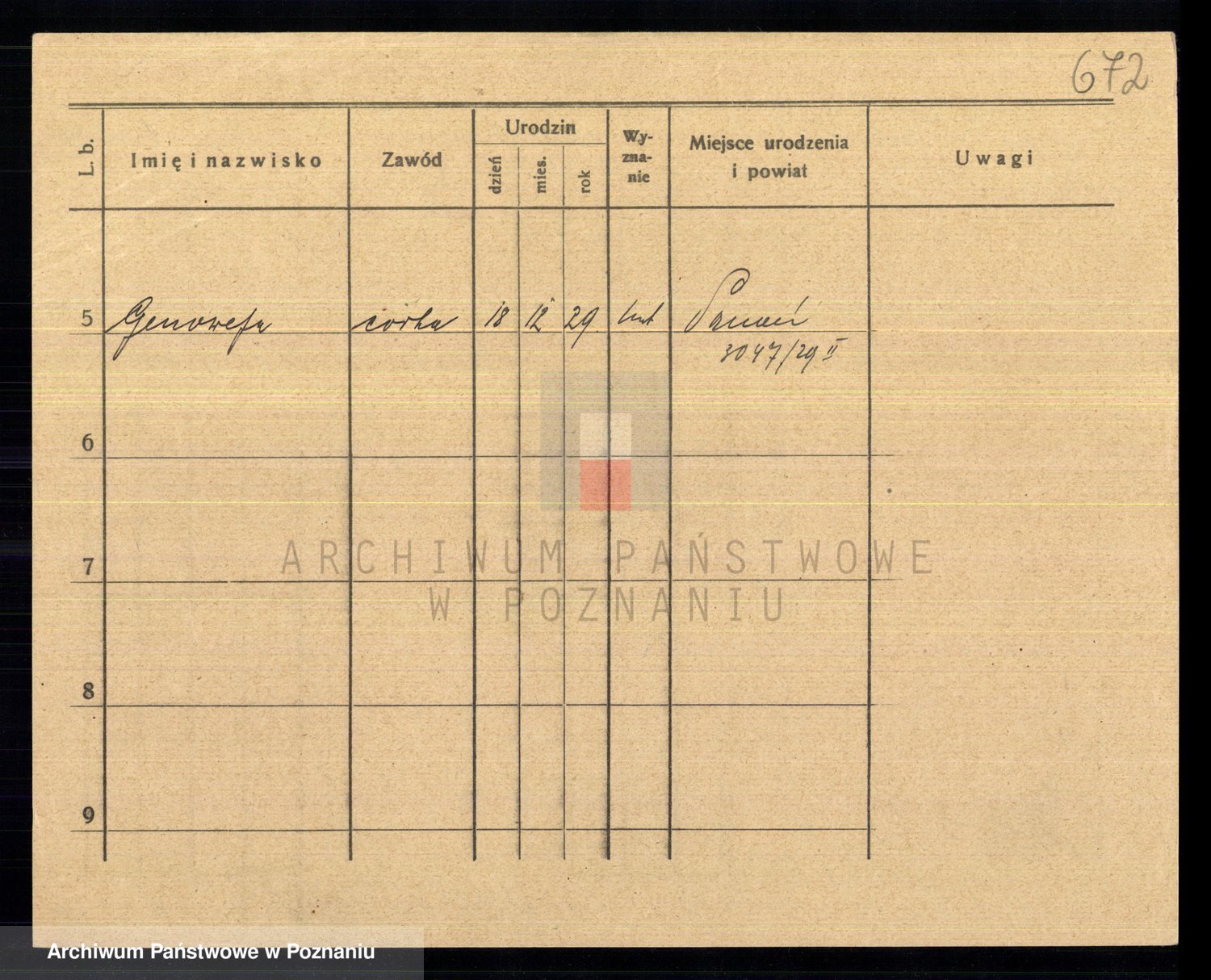 Podgląd karty osobowej dostępny jest po kliknięciu na nazwisko lub ikonkę karty. Można dokonywać powiększenia (ikony na górze) lub przechodzić między kolejnymi skanami (strzałki po bokach).