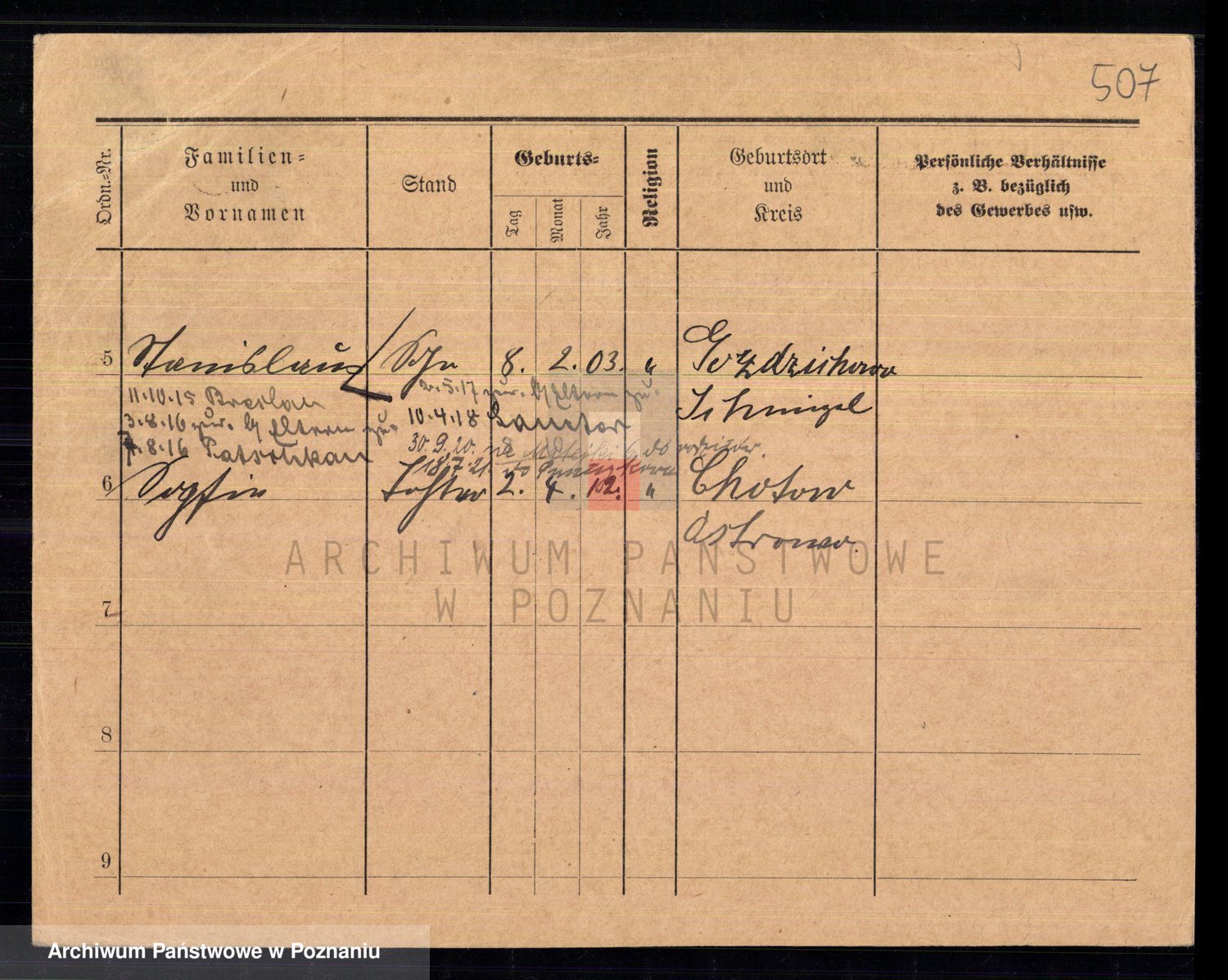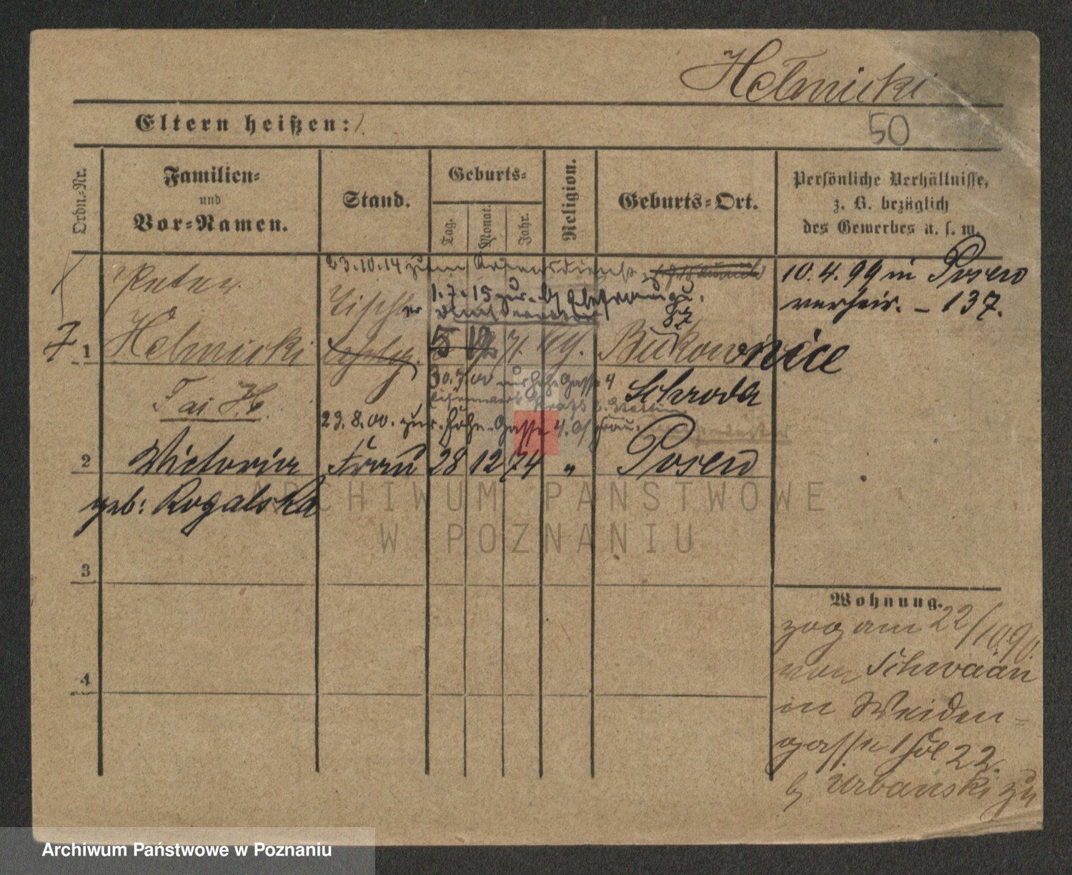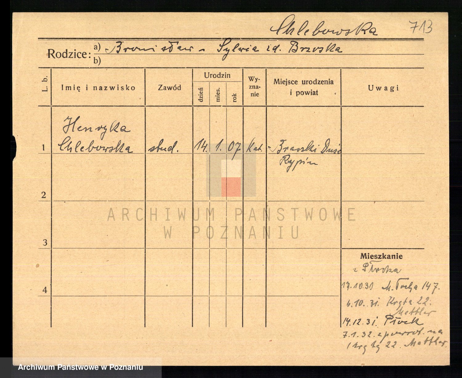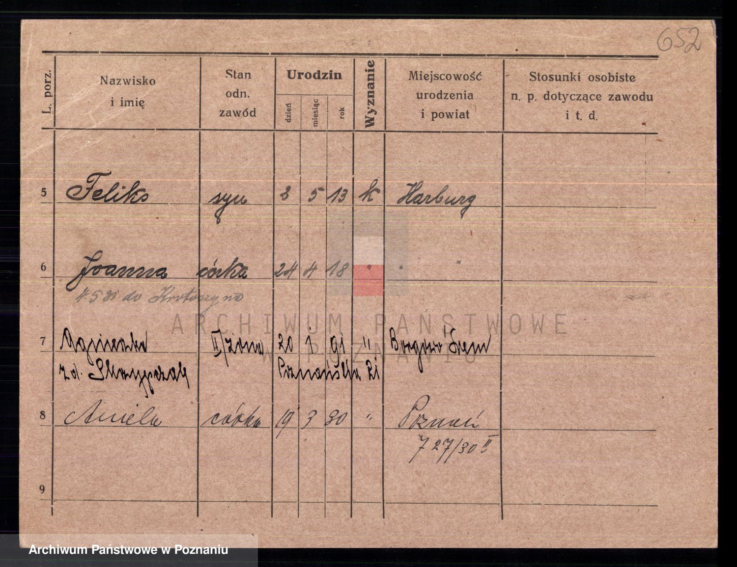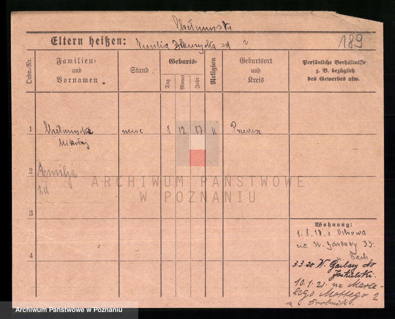 Podgląd karty osobowej dostępny jest po kliknięciu na nazwisko lub ikonkę karty. Można dokonywać powiększenia (ikony na górze) lub przechodzić między kolejnymi skanami (strzałki po bokach).