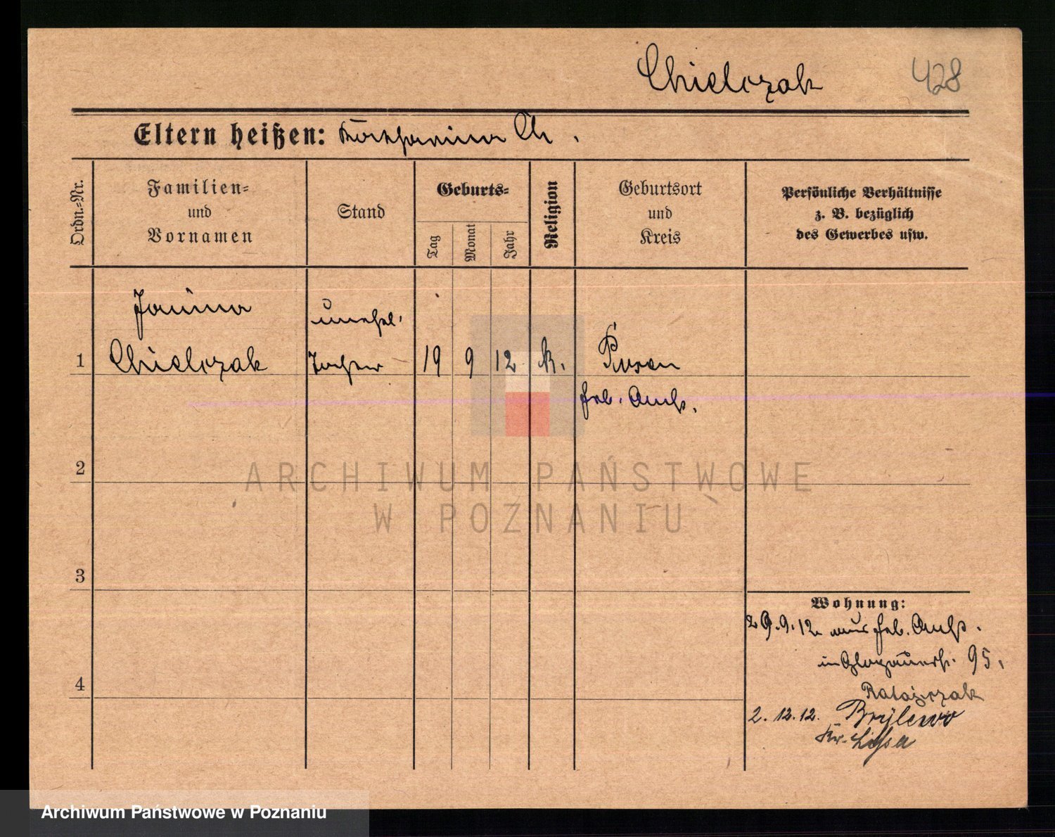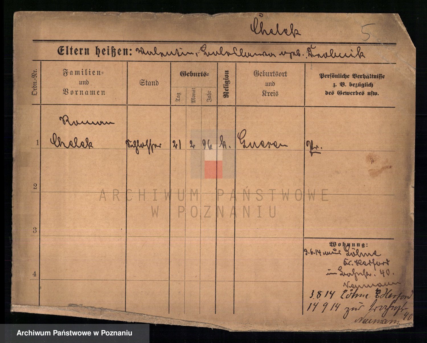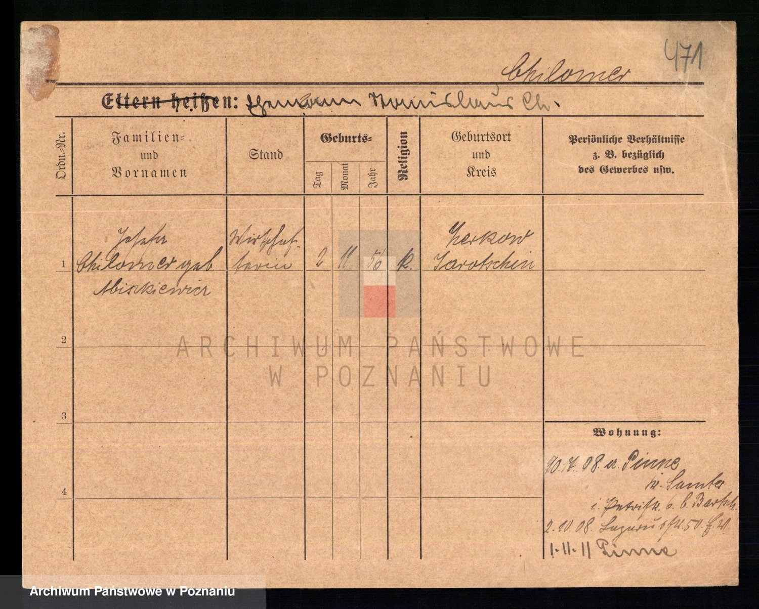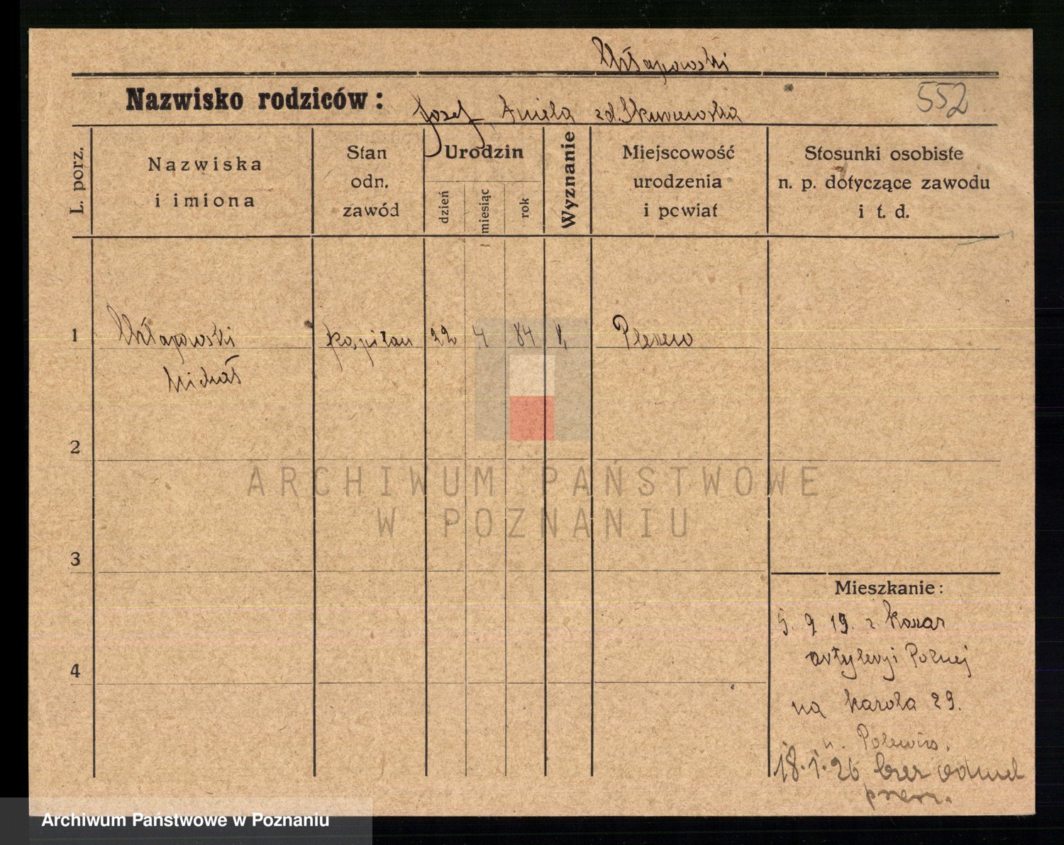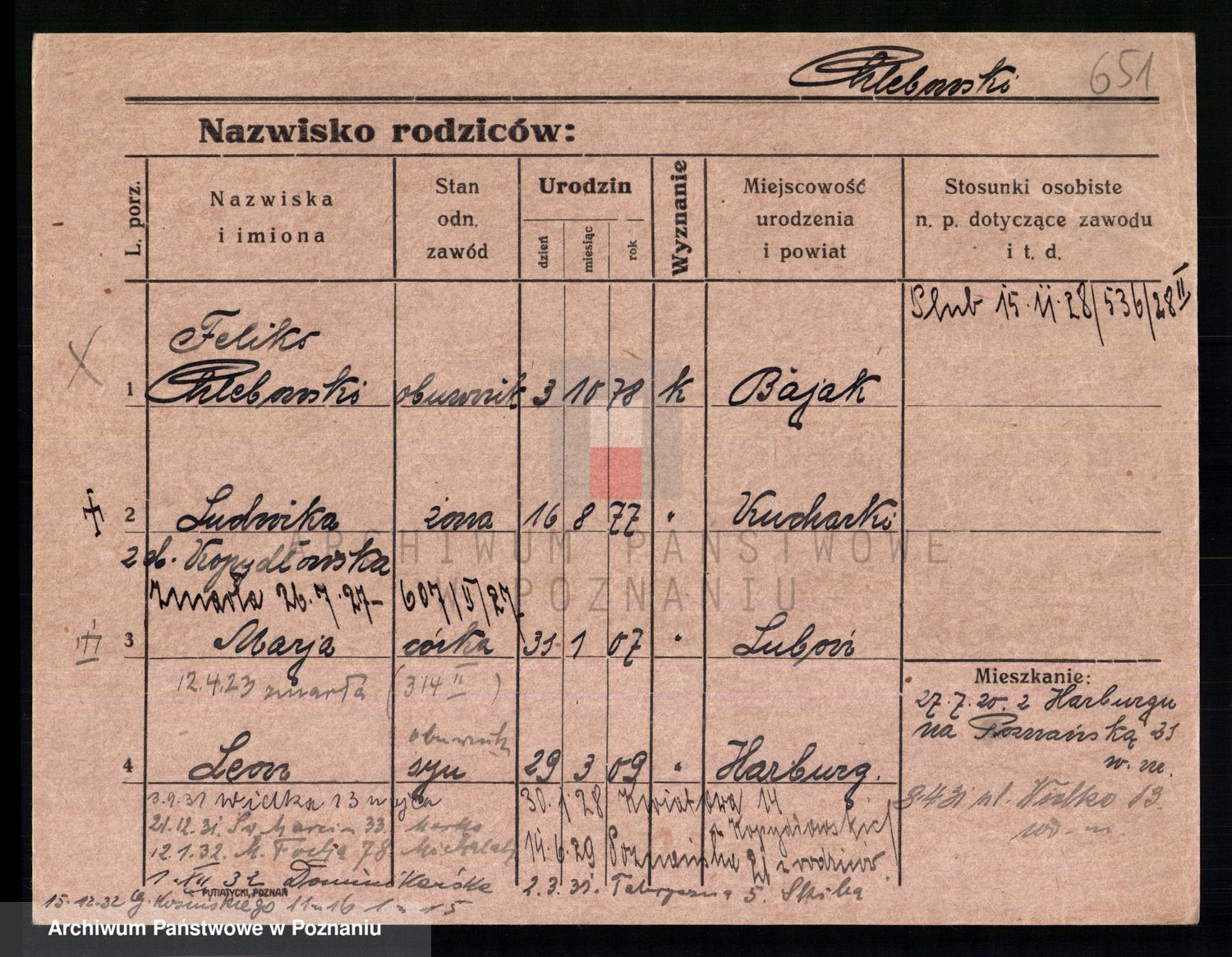 Podgląd karty osobowej dostępny jest po kliknięciu na nazwisko lub ikonkę karty. Można dokonywać powiększenia (ikony na górze) lub przechodzić między kolejnymi skanami (strzałki po bokach).