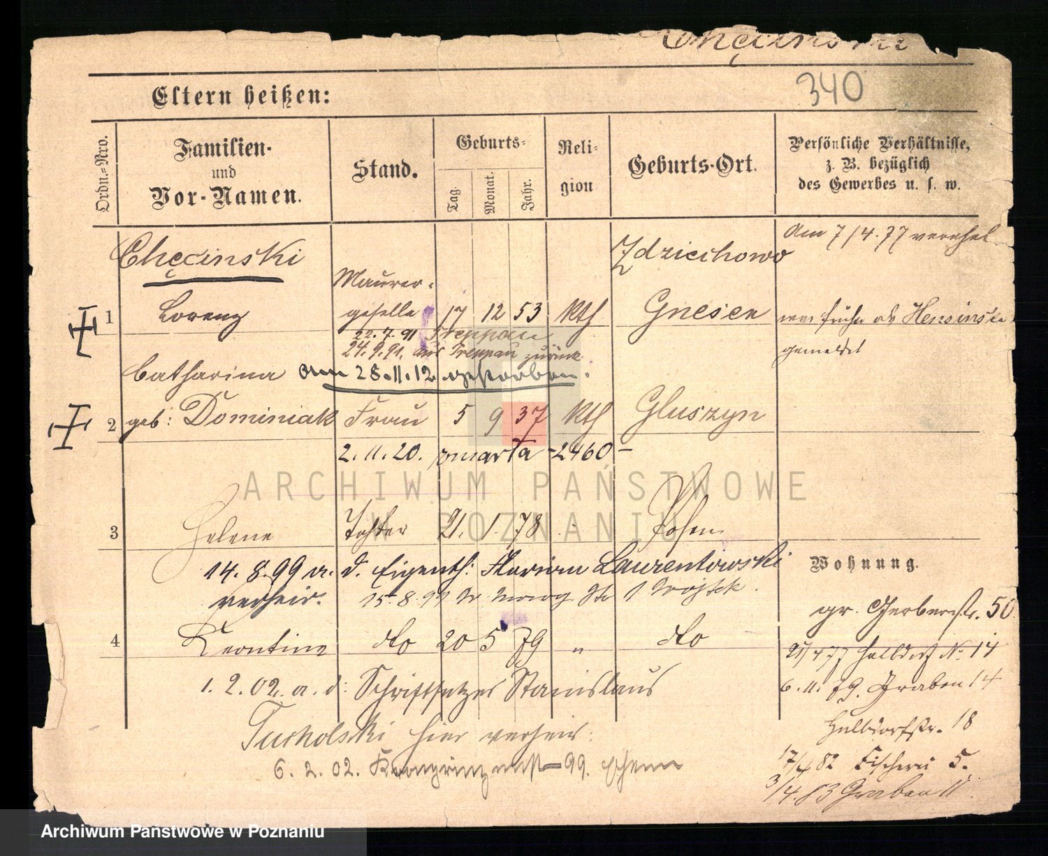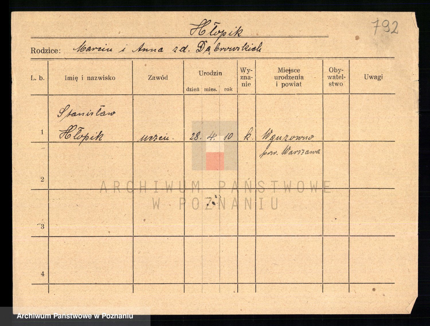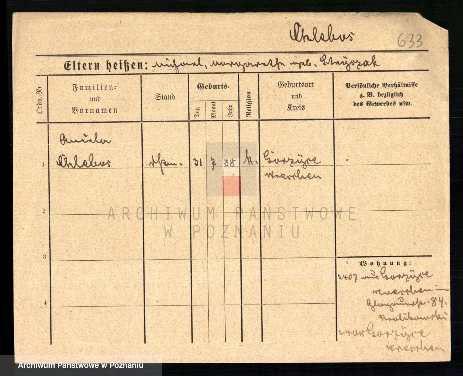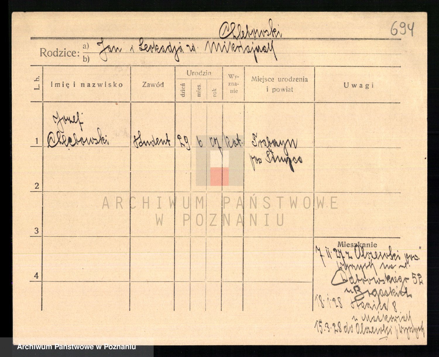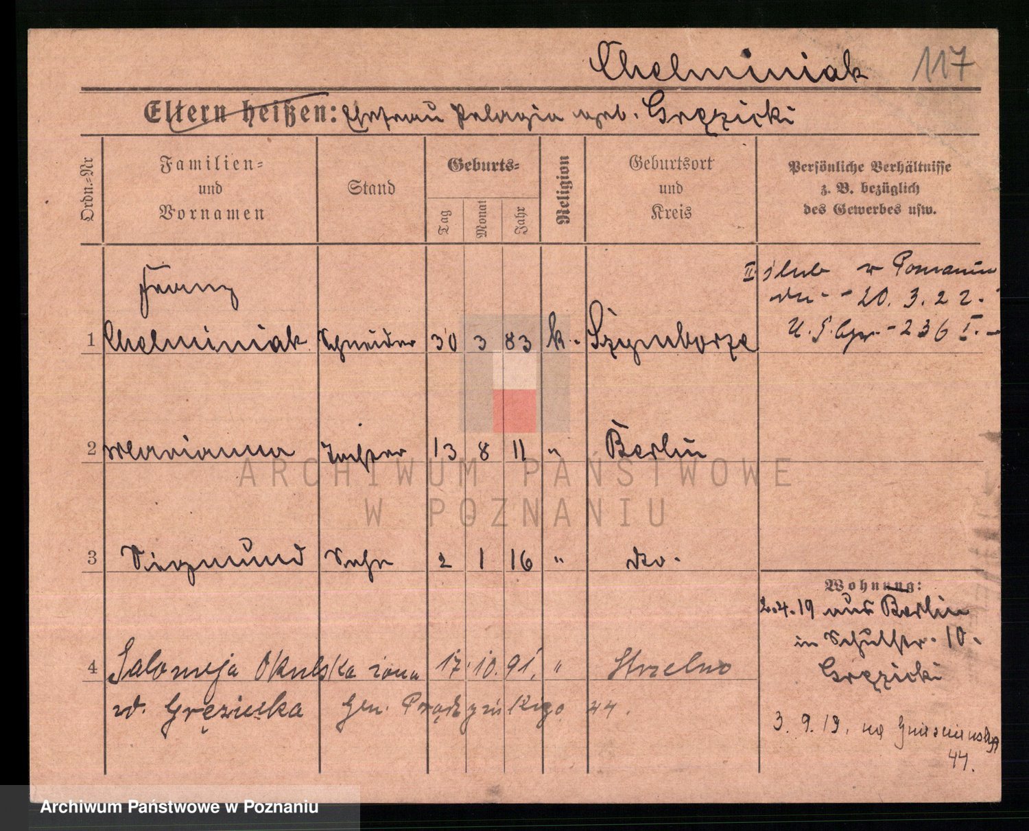 Podgląd karty osobowej dostępny jest po kliknięciu na nazwisko lub ikonkę karty. Można dokonywać powiększenia (ikony na górze) lub przechodzić między kolejnymi skanami (strzałki po bokach).