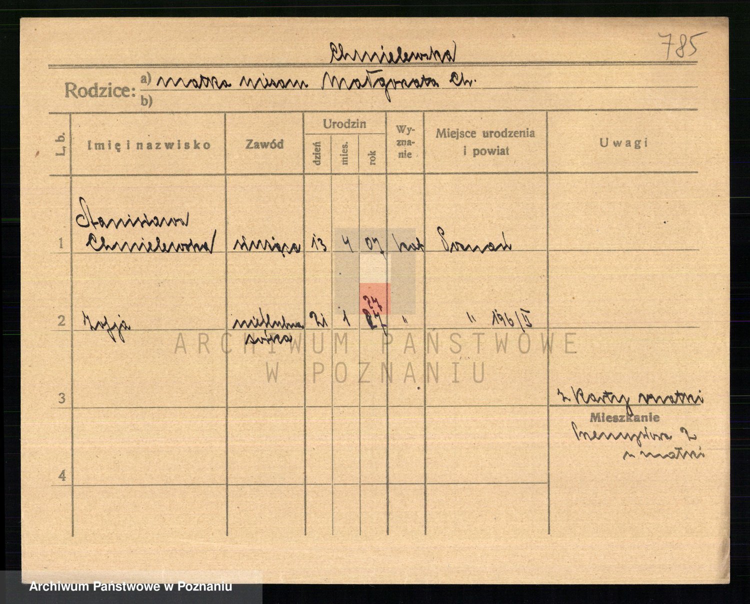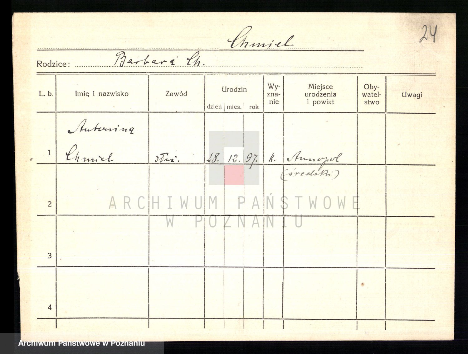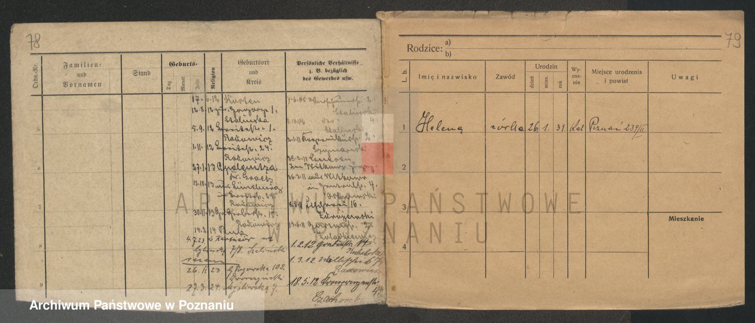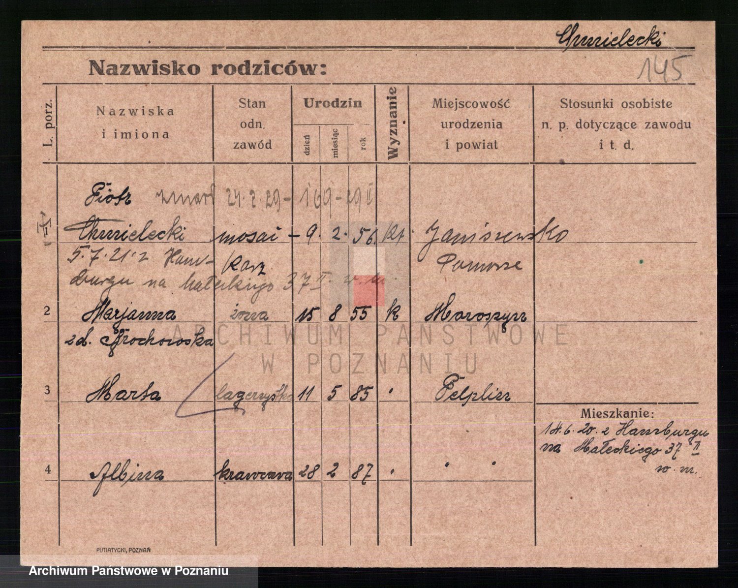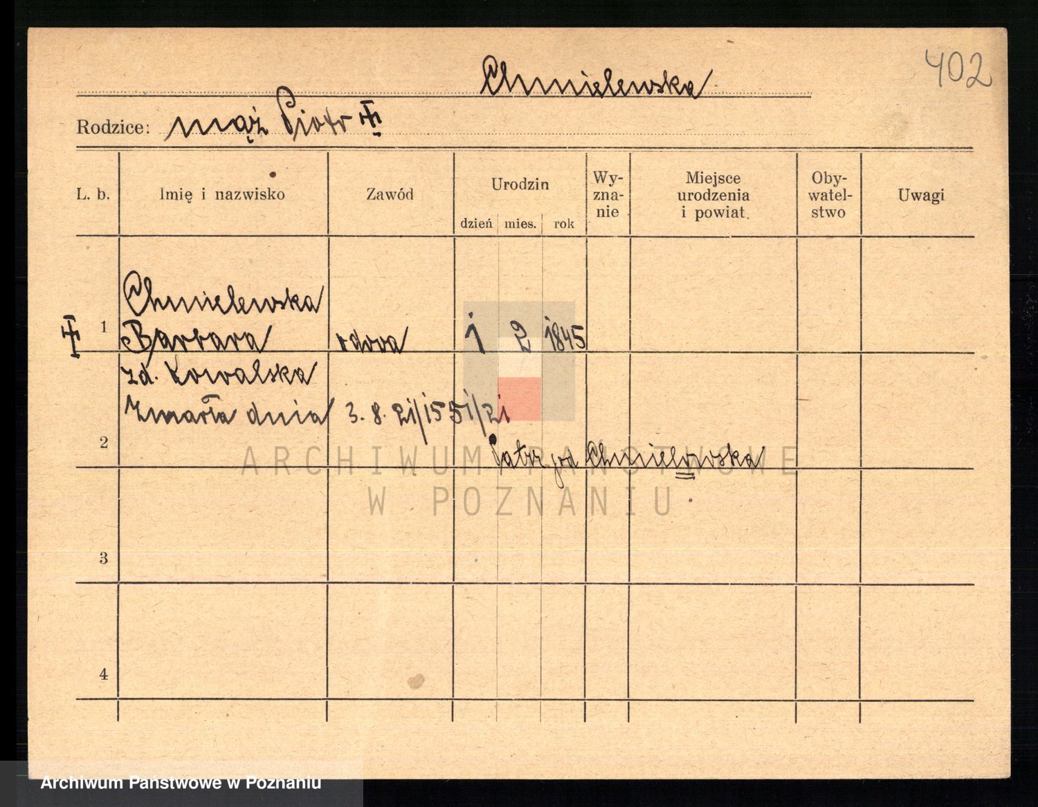 Podgląd karty osobowej dostępny jest po kliknięciu na nazwisko lub ikonkę karty. Można dokonywać powiększenia (ikony na górze) lub przechodzić między kolejnymi skanami (strzałki po bokach).