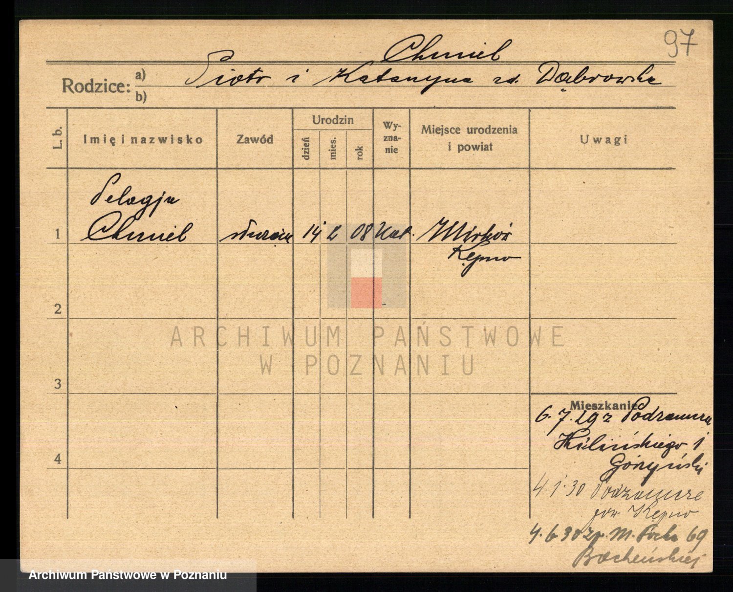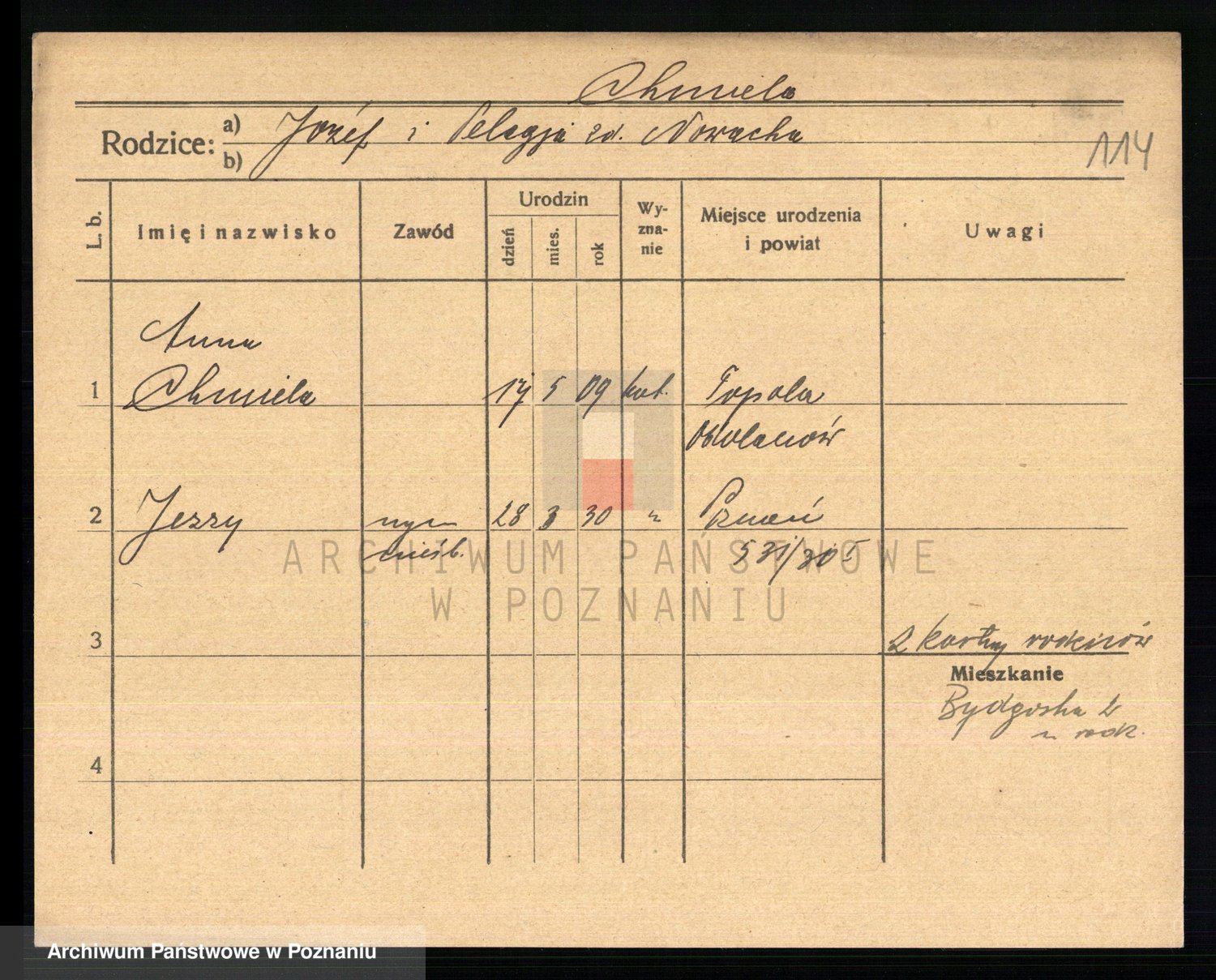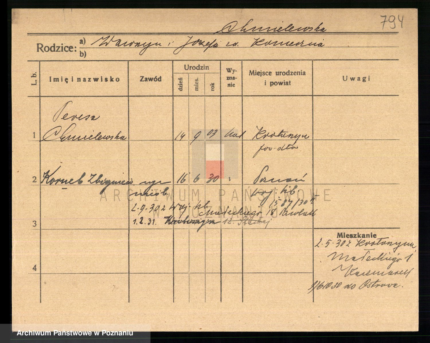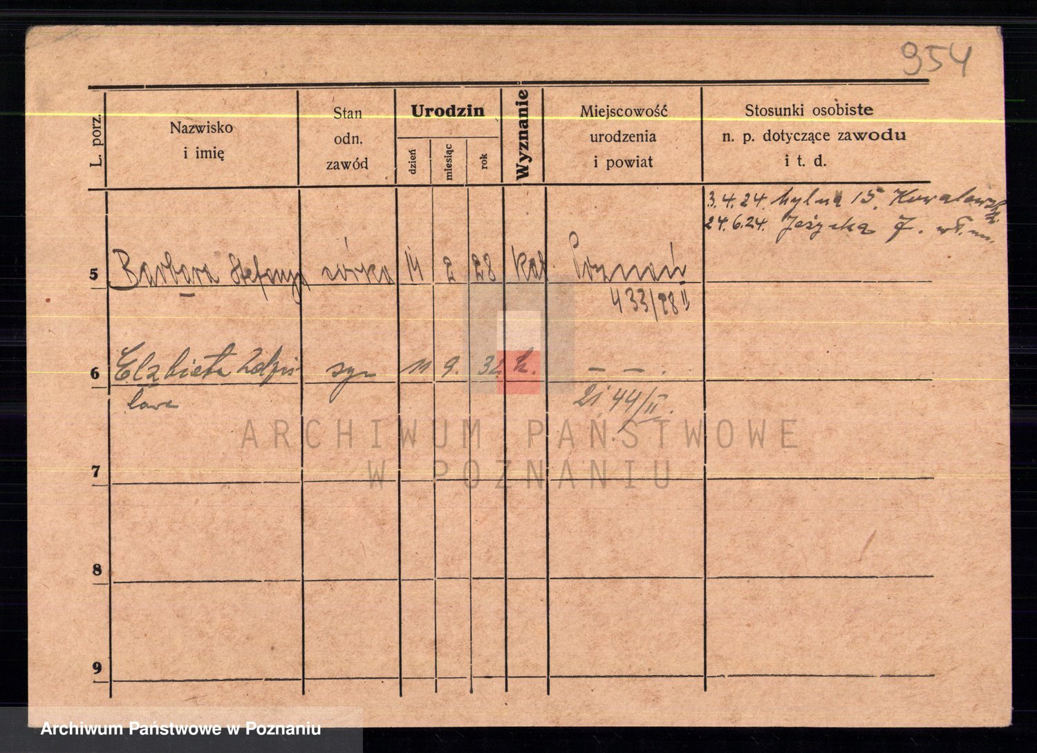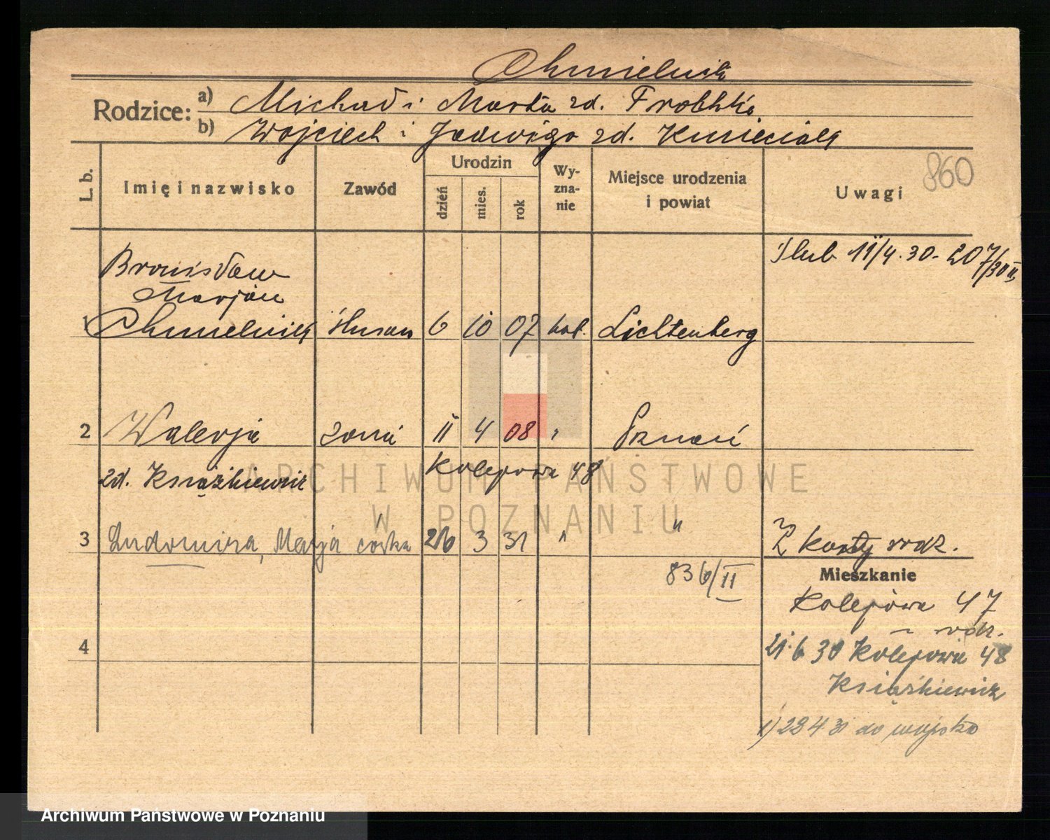 Podgląd karty osobowej dostępny jest po kliknięciu na nazwisko lub ikonkę karty. Można dokonywać powiększenia (ikony na górze) lub przechodzić między kolejnymi skanami (strzałki po bokach).