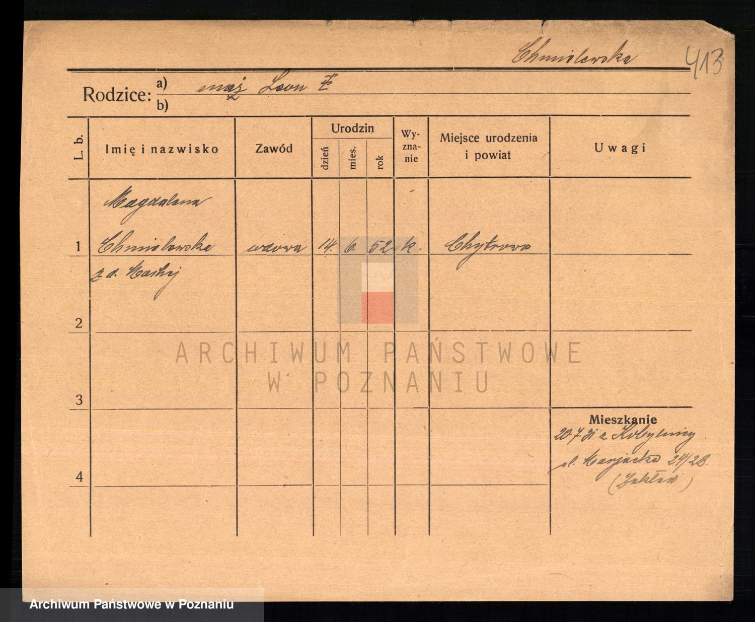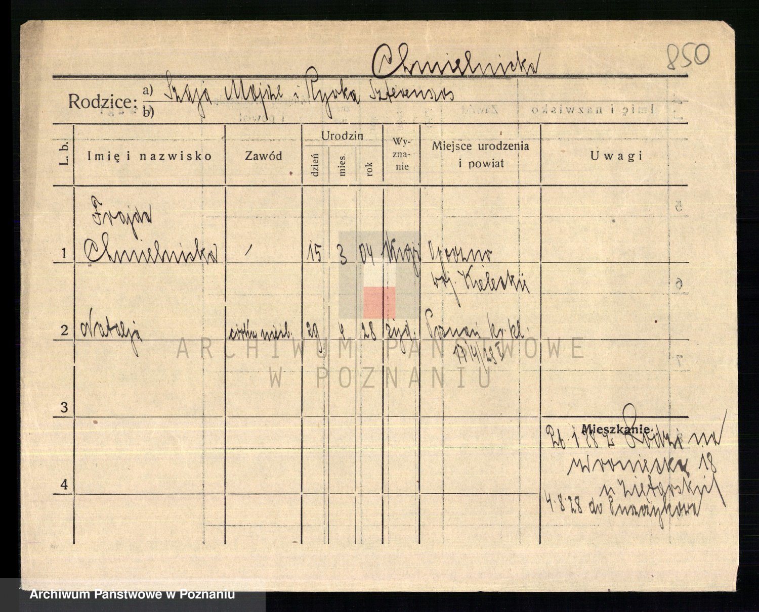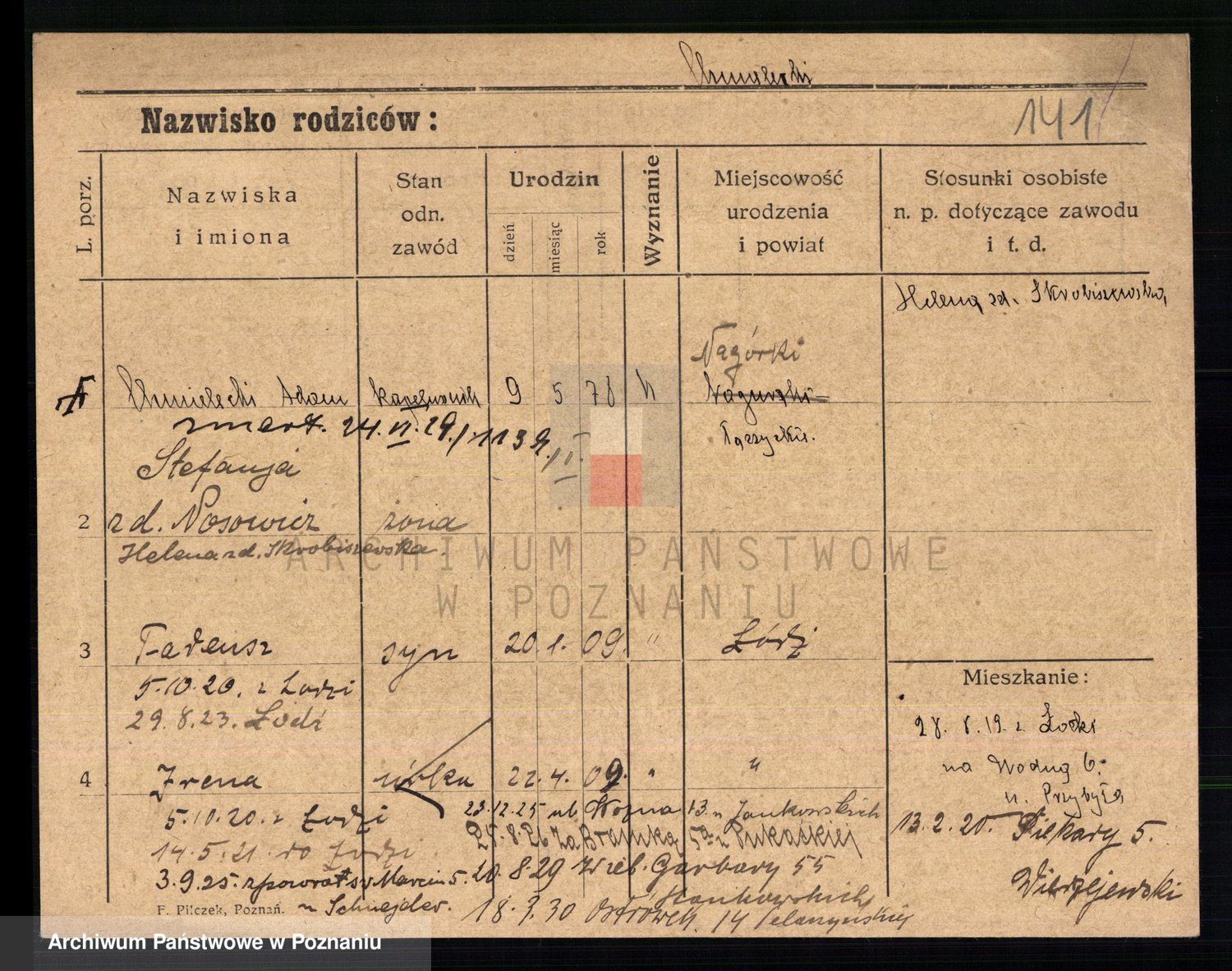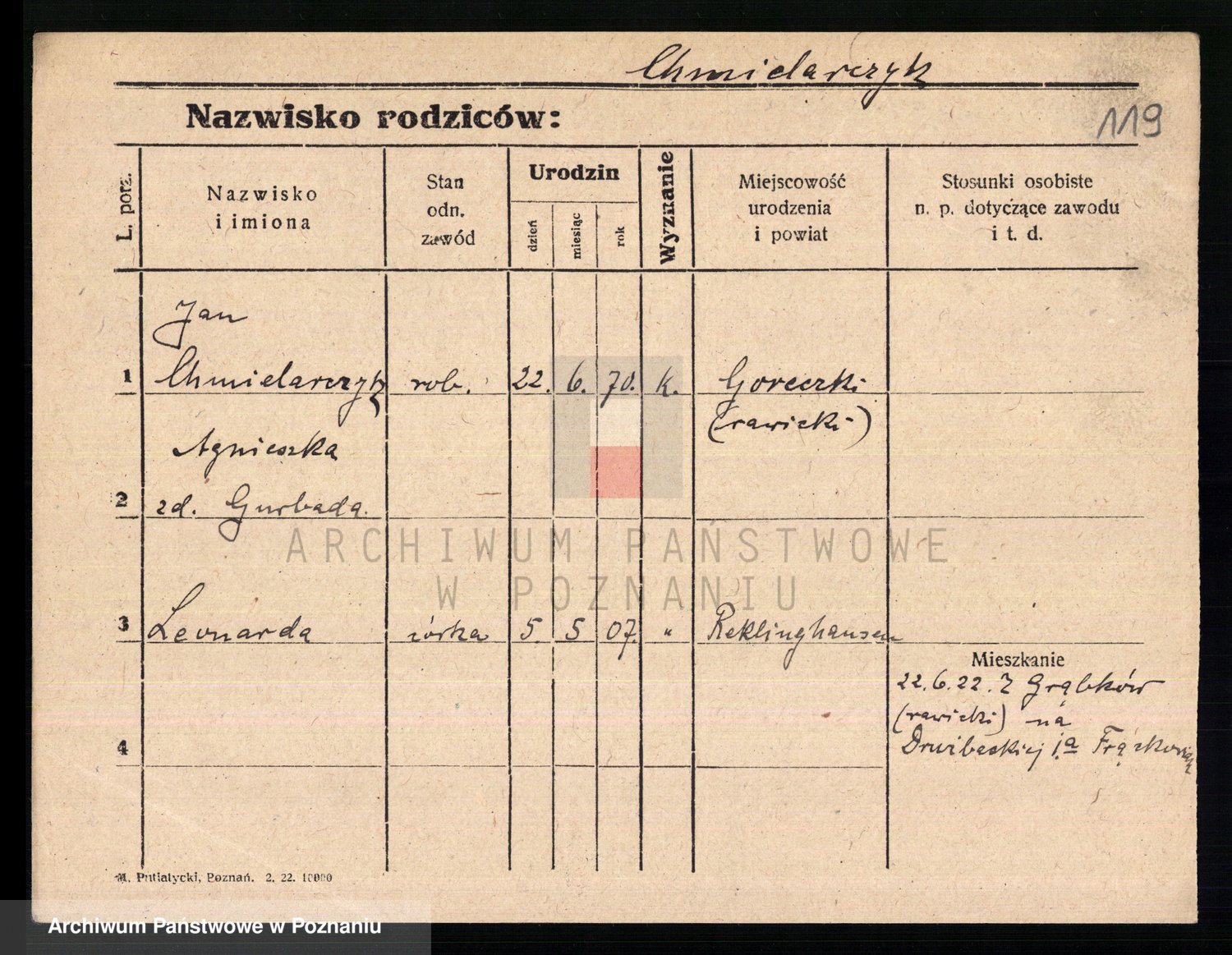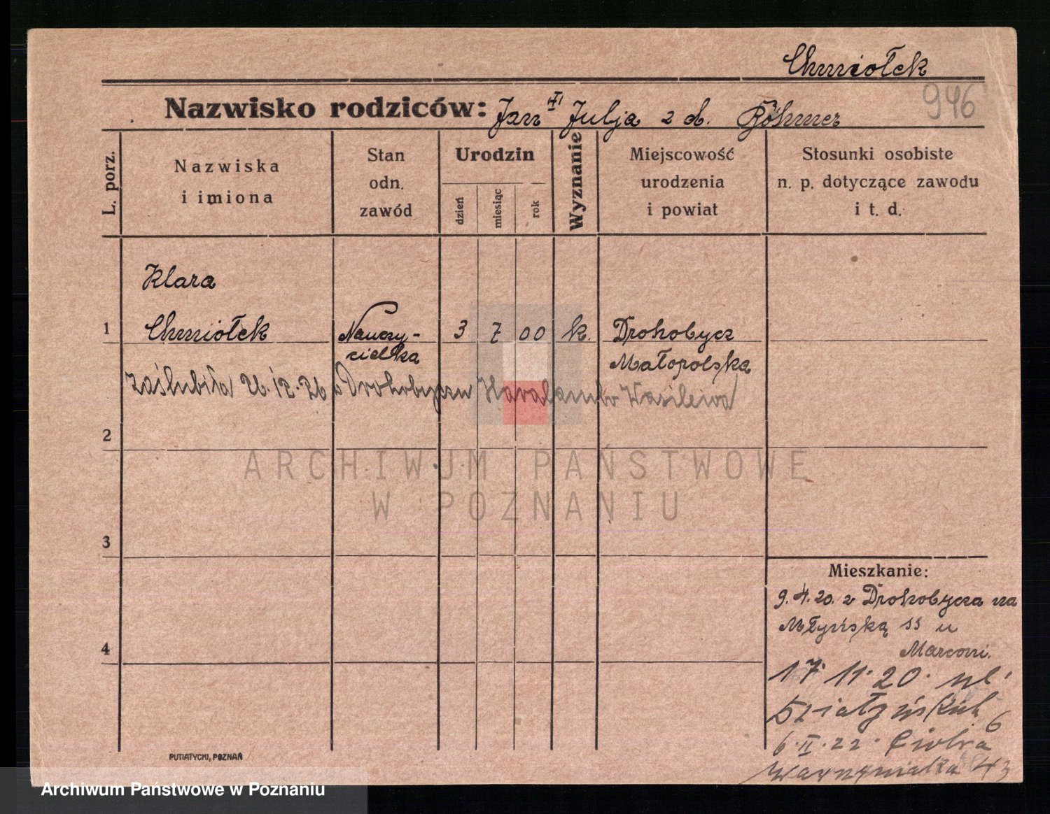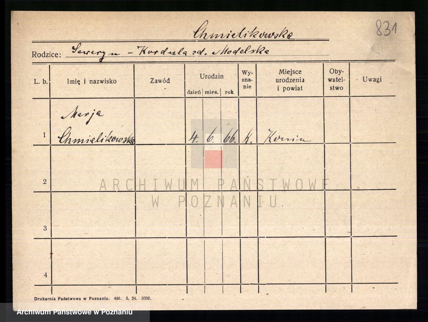 Podgląd karty osobowej dostępny jest po kliknięciu na nazwisko lub ikonkę karty. Można dokonywać powiększenia (ikony na górze) lub przechodzić między kolejnymi skanami (strzałki po bokach).