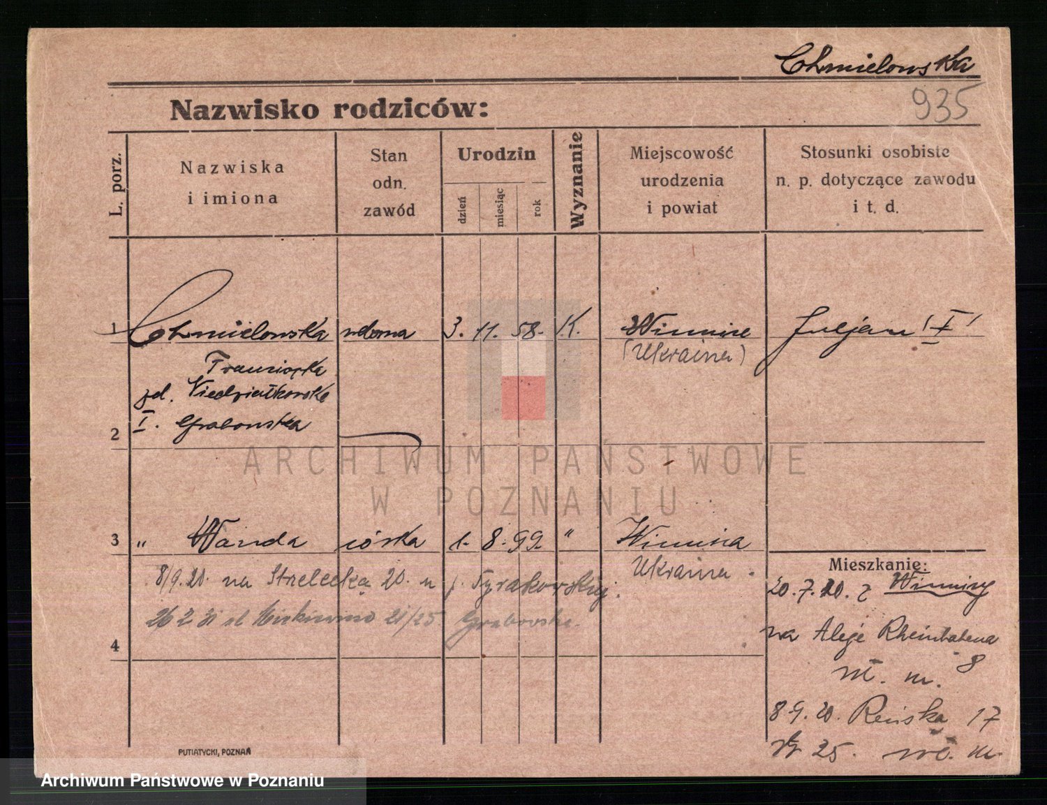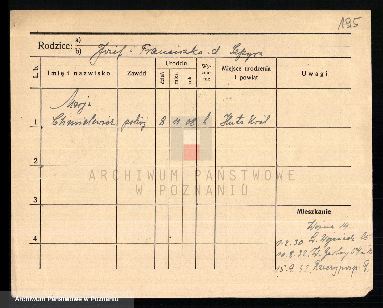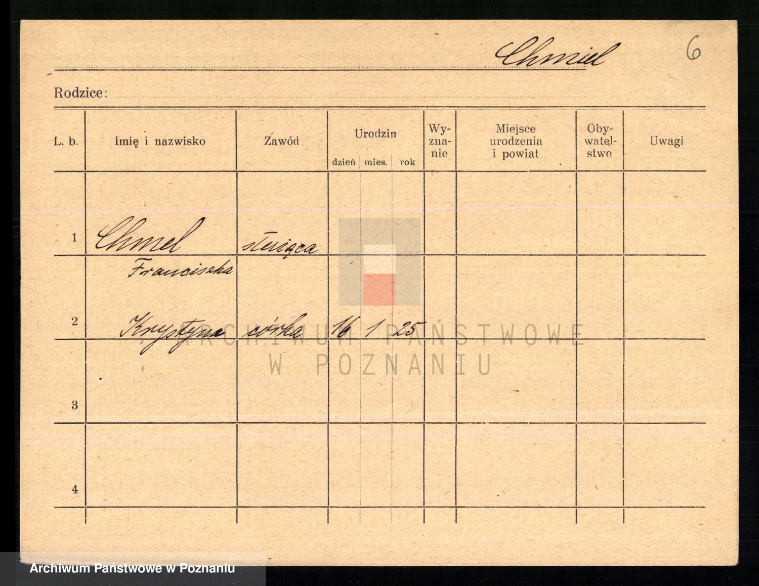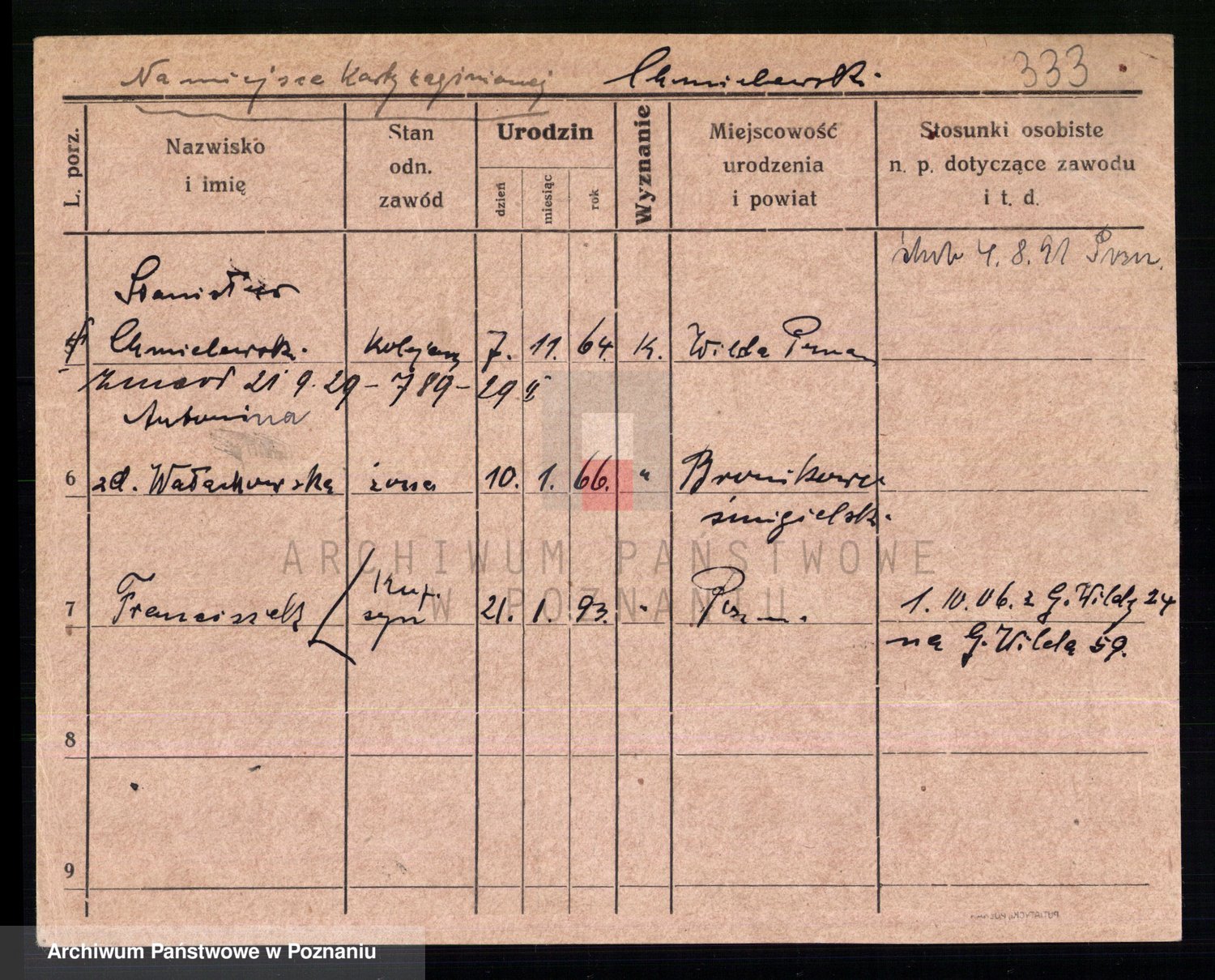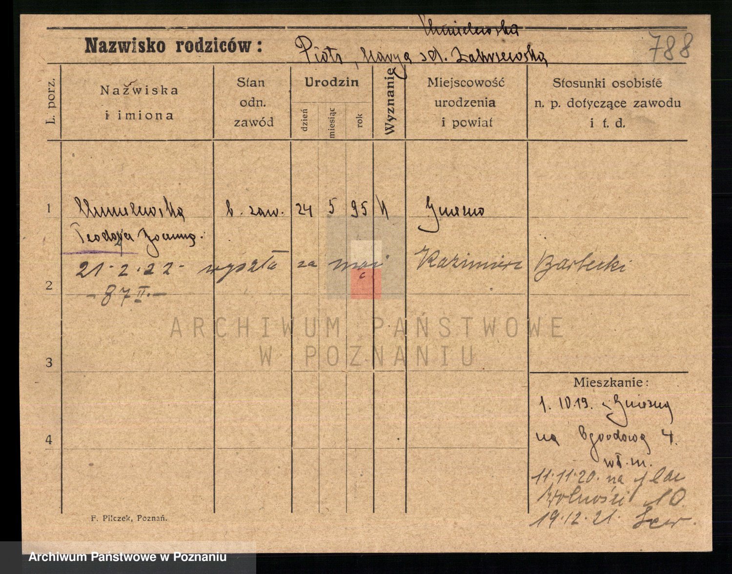 Podgląd karty osobowej dostępny jest po kliknięciu na nazwisko lub ikonkę karty. Można dokonywać powiększenia (ikony na górze) lub przechodzić między kolejnymi skanami (strzałki po bokach).